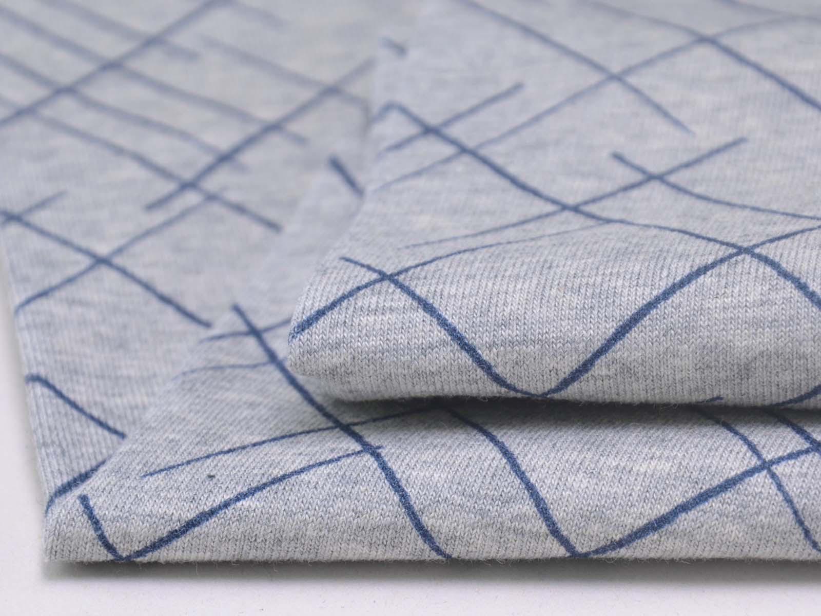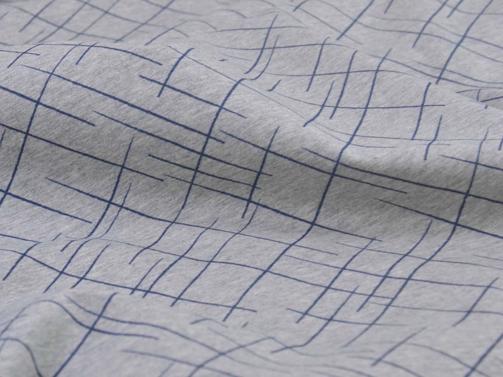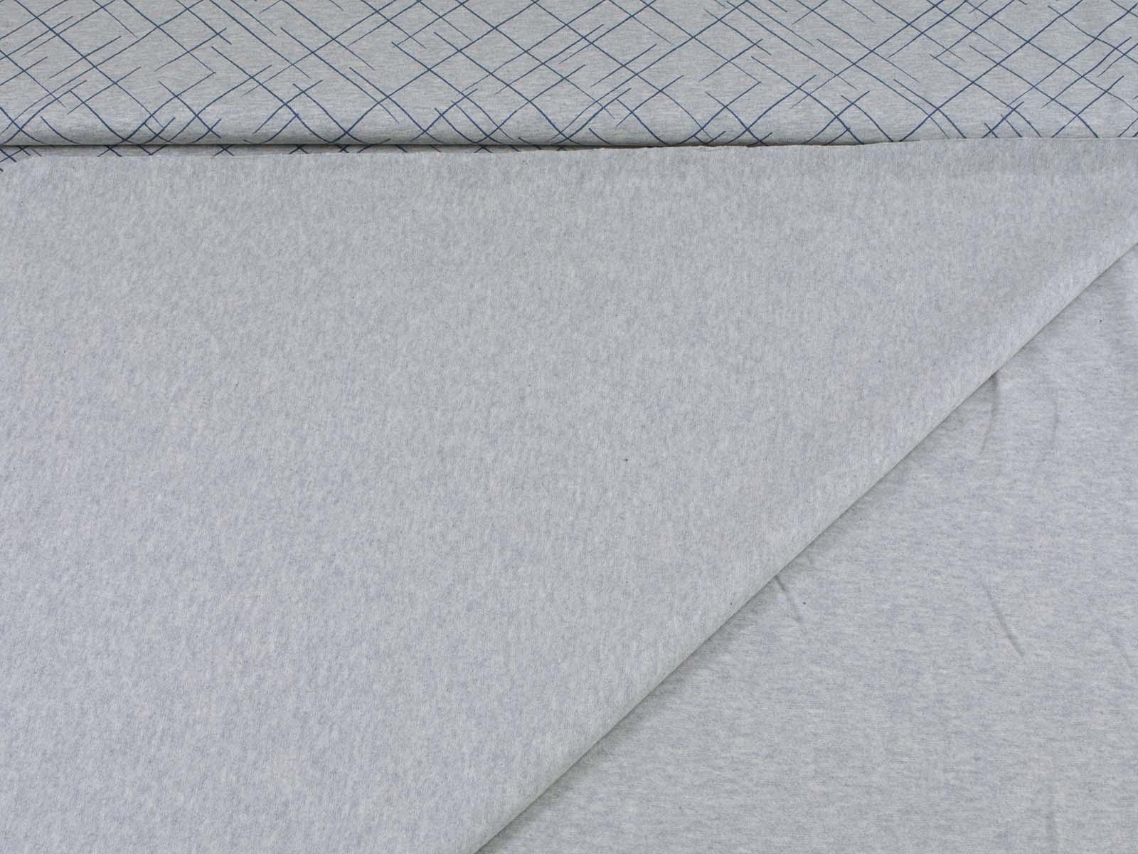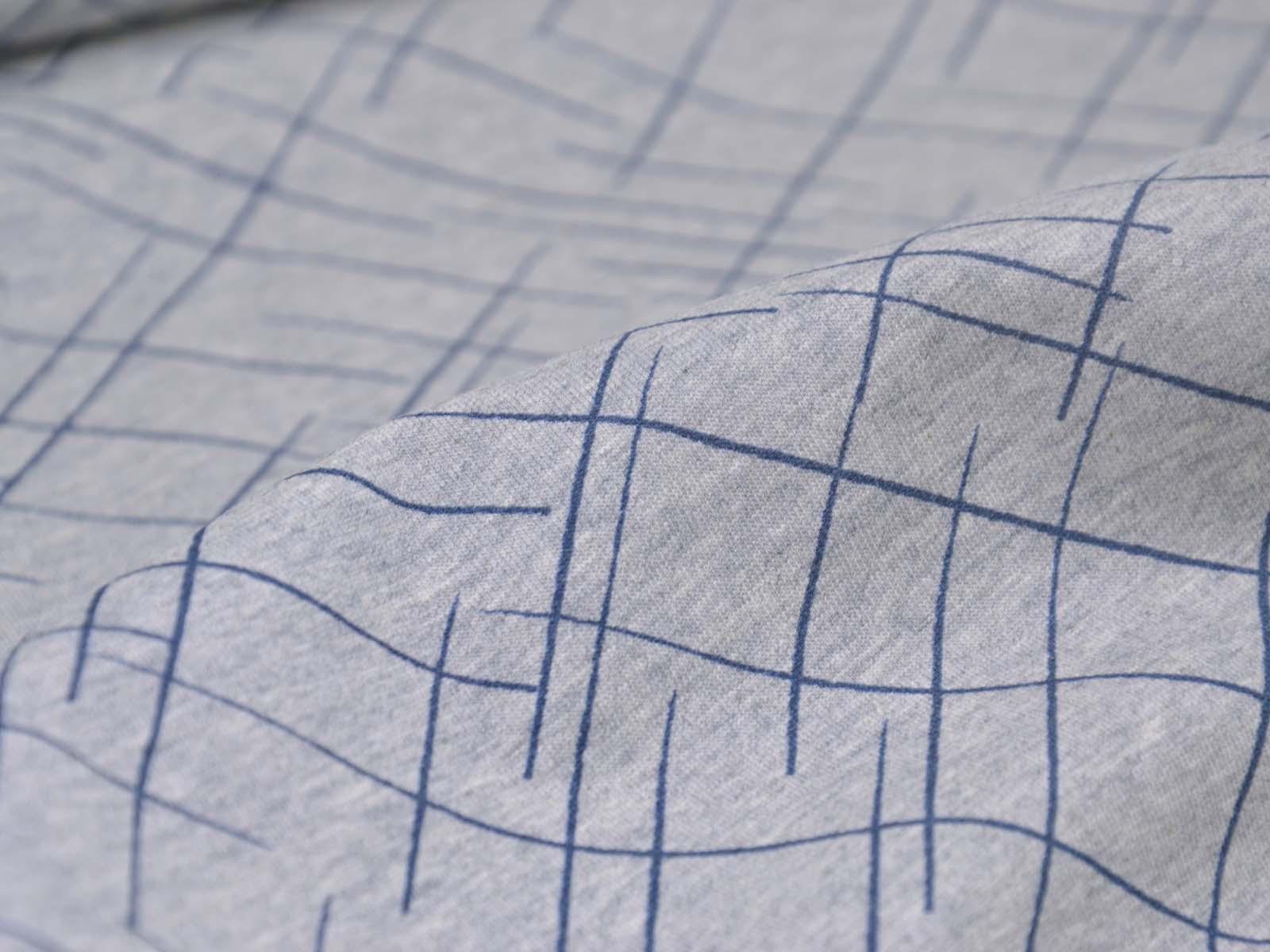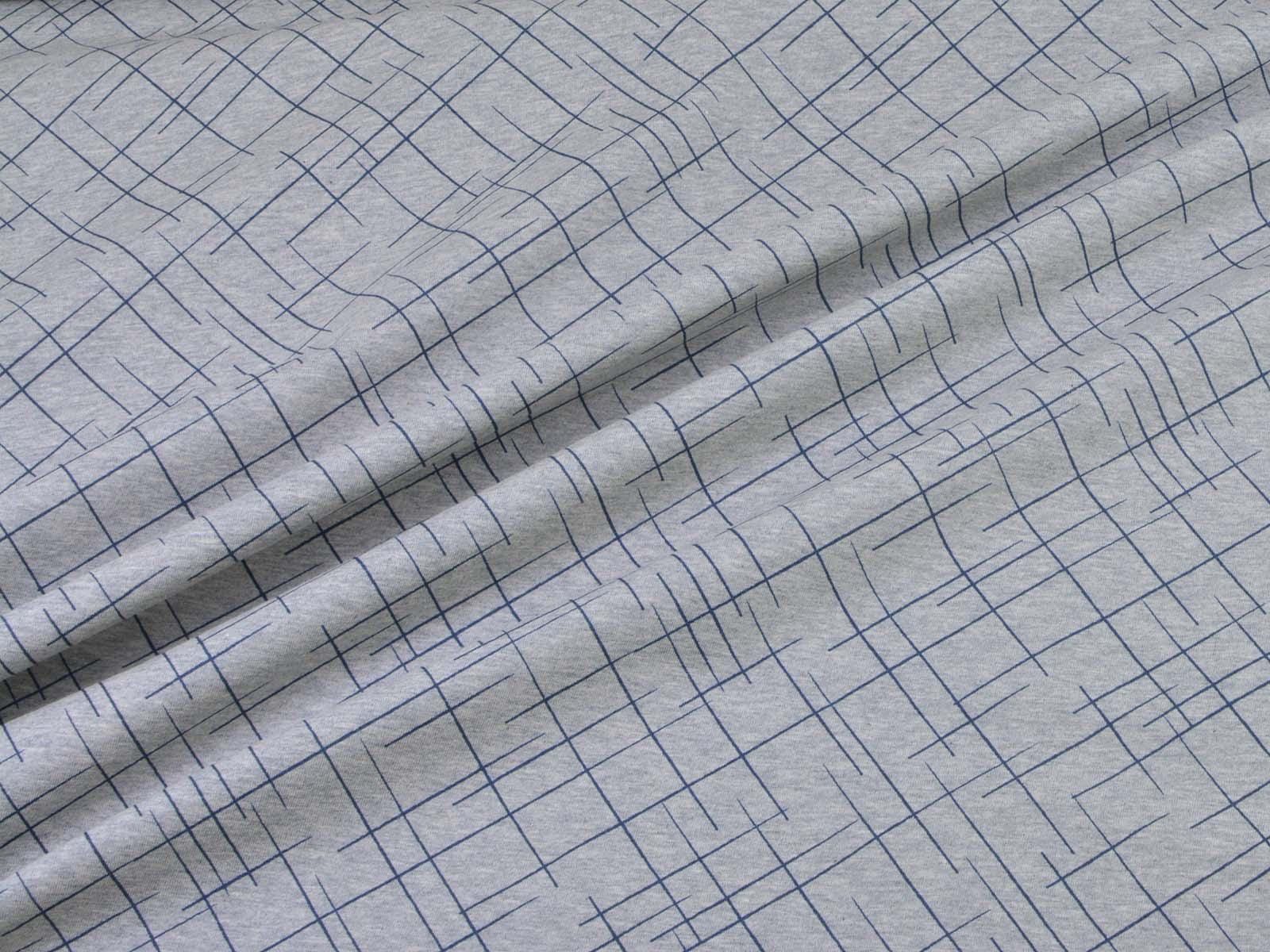 Grauer Baumwolljersey mit dunkelblauen dünnen gekreuzten Strichen. Der Stoff ist glatt und dünn. Er eignet sich wunderbar zum Nähen von T-Shirts, Shorts, Kleidern, Pumphosen und vielem mehr.