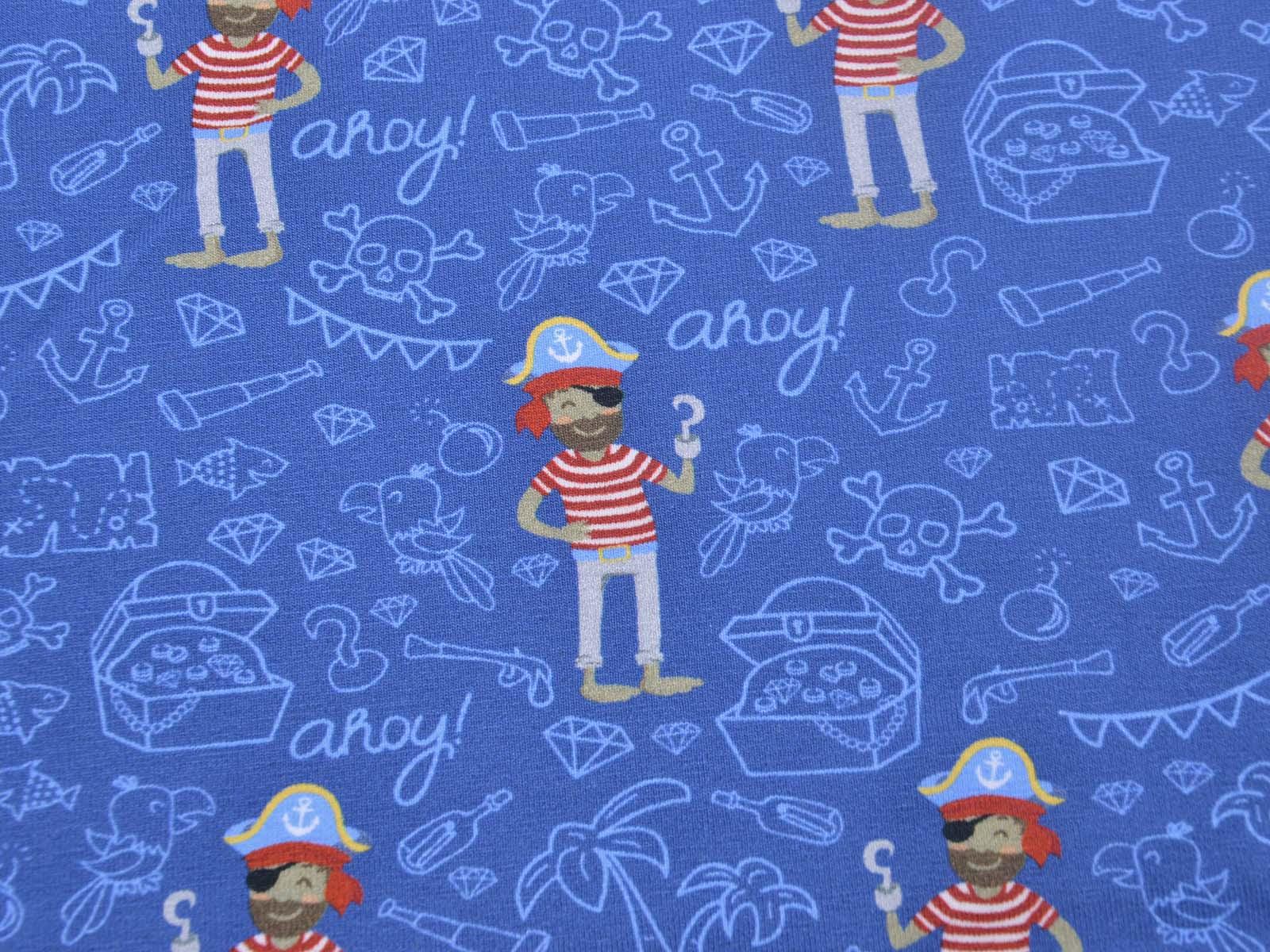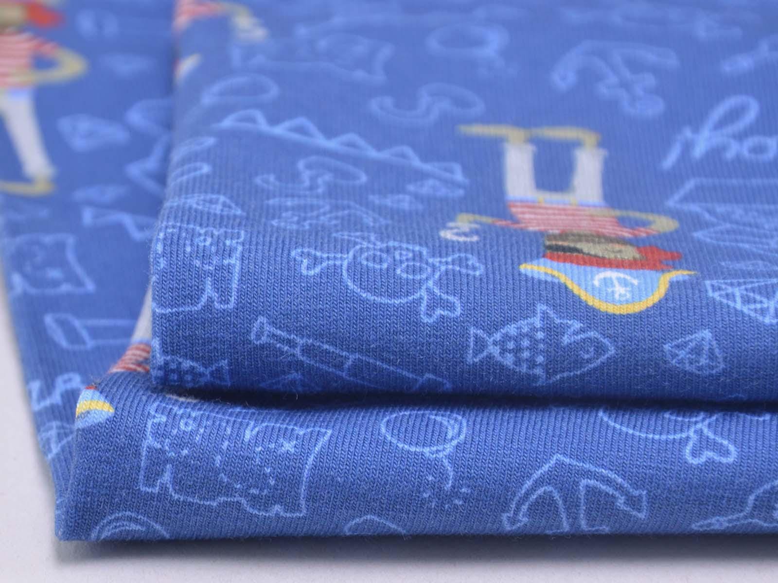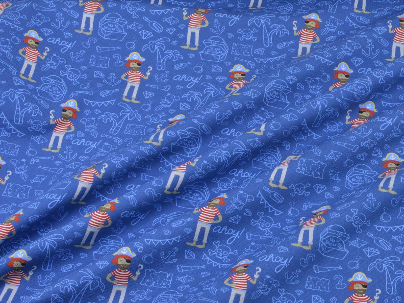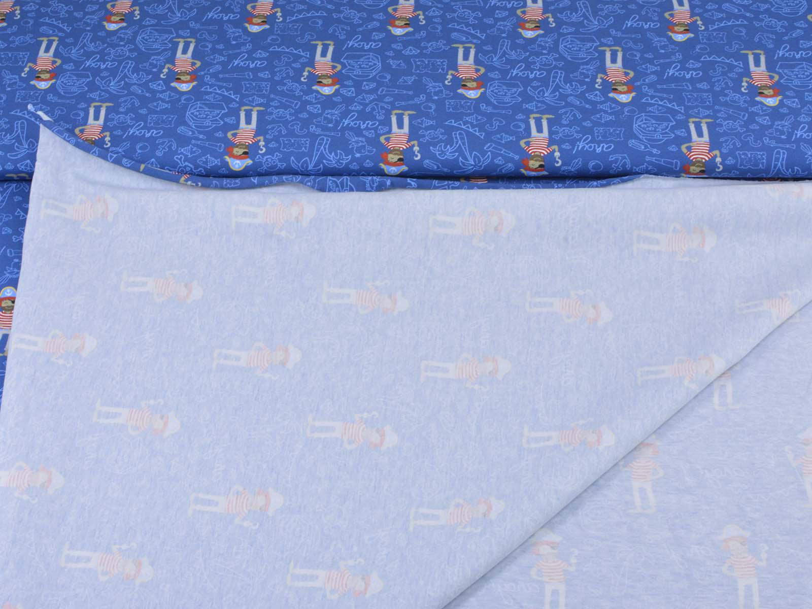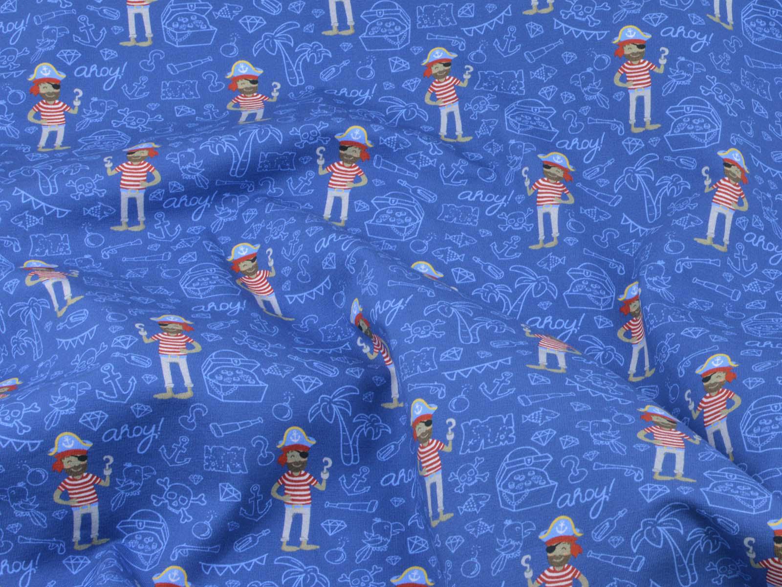 Blue cotton jersey with a nautical pattern in the background and pirates in red and white T-shirts. Each pirate is approximately 5.5 cm tall. The fabric is thin and smooth. It's perfect for sewing bloomers, T-shirts, shorts, bodysuits, and much more.