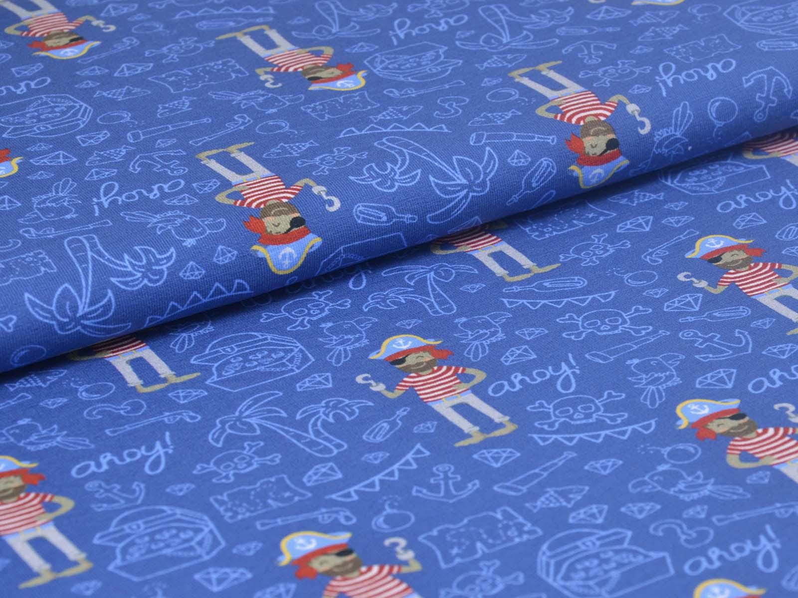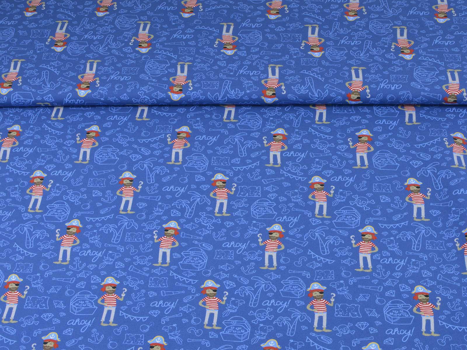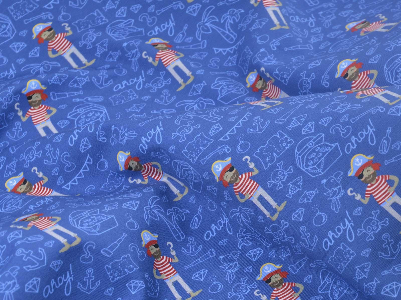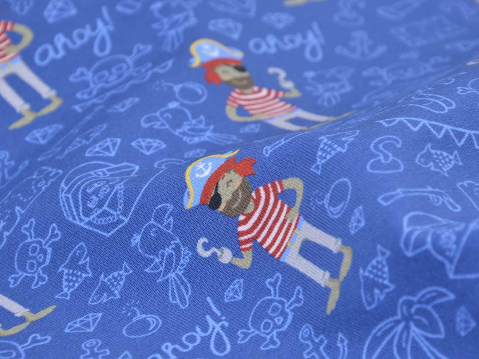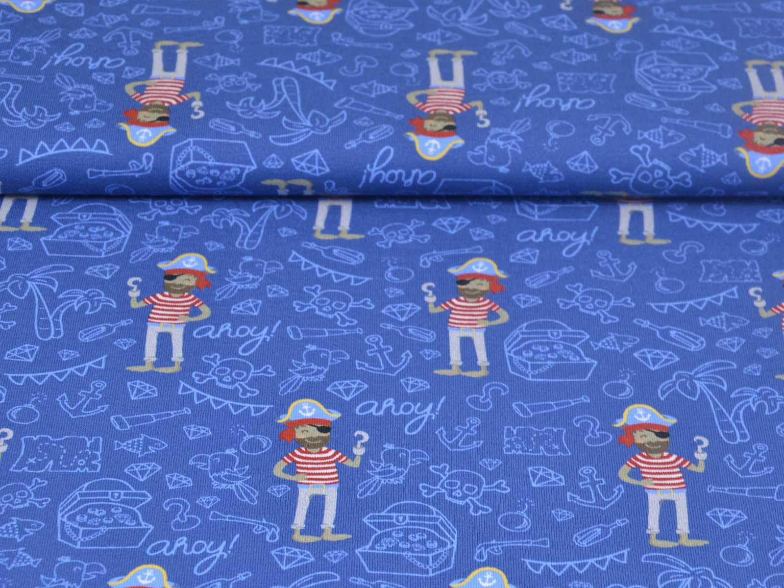 Blue cotton jersey with a nautical pattern in the background and pirates in red and white T-shirts. Each pirate is approximately 5.5 cm tall. The fabric is thin and smooth. It's perfect for sewing bloomers, T-shirts, shorts, bodysuits, and much more.