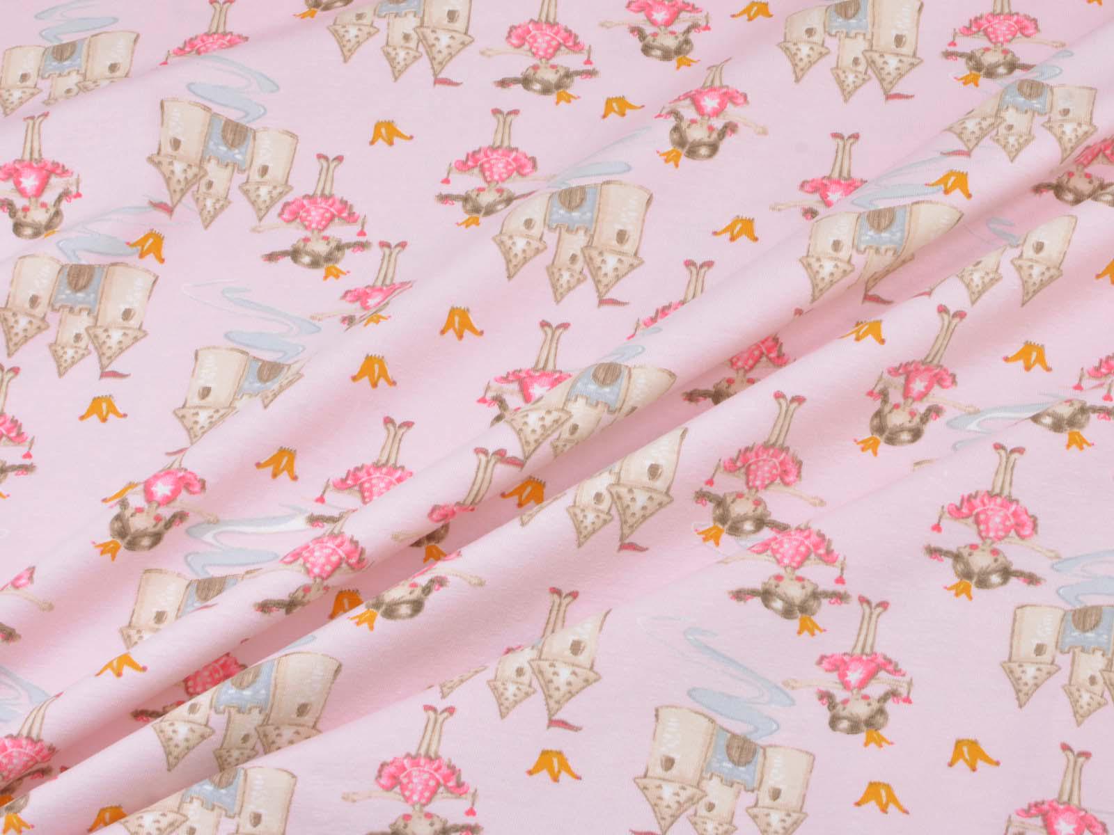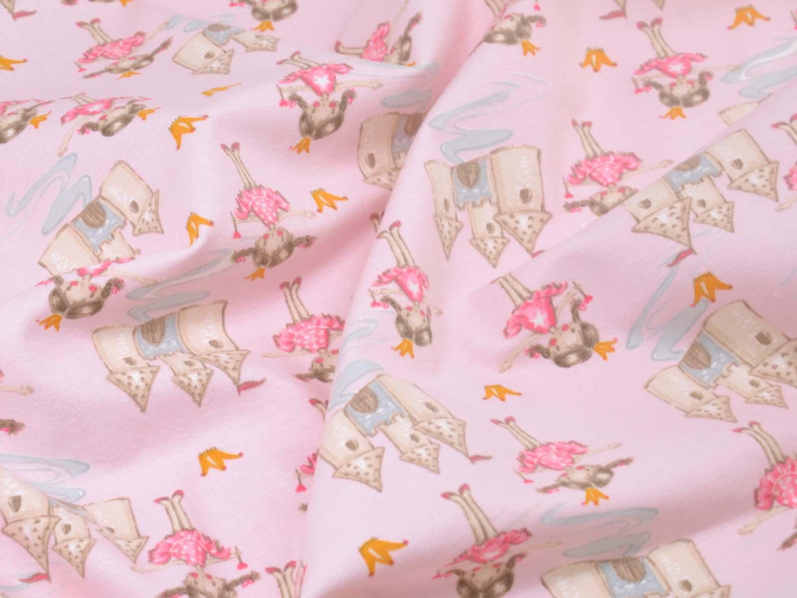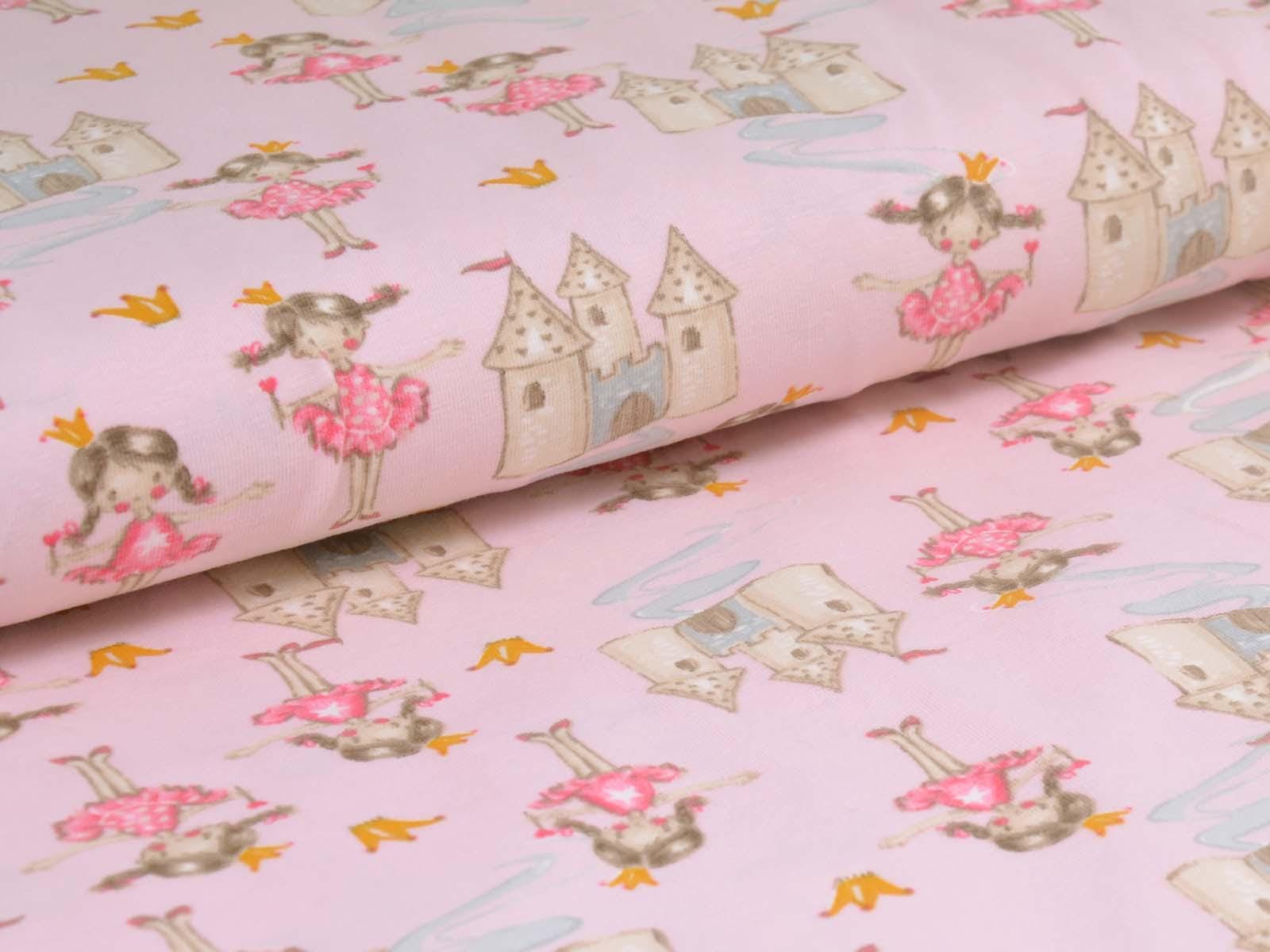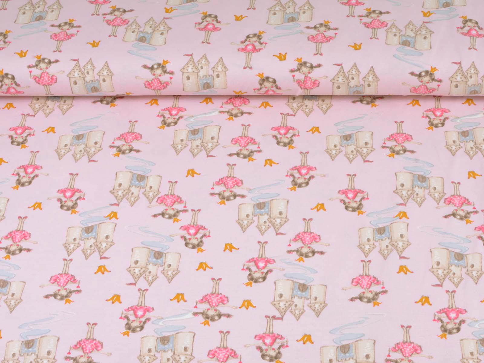 Baumwolljersey in rosa mit Prinzessinnen und Schlössern. Eine Prinzessin ist ca 5 cm groß. Der Stoff ist glatt und dünn. Er eignet sich wunderbar zum Nähen von T-Shirts, Kleidern, Röcken, Shorts und vielem mehr.