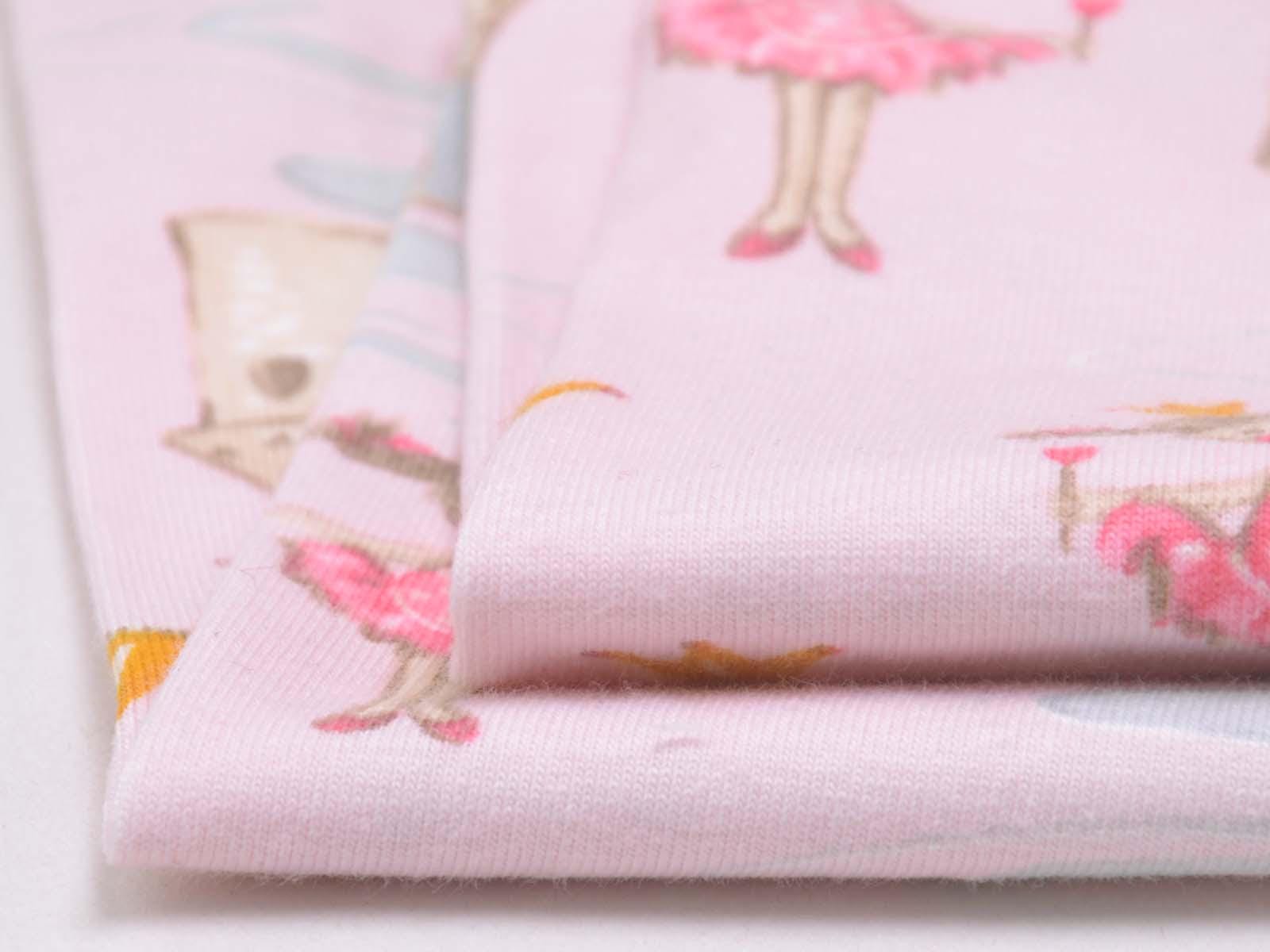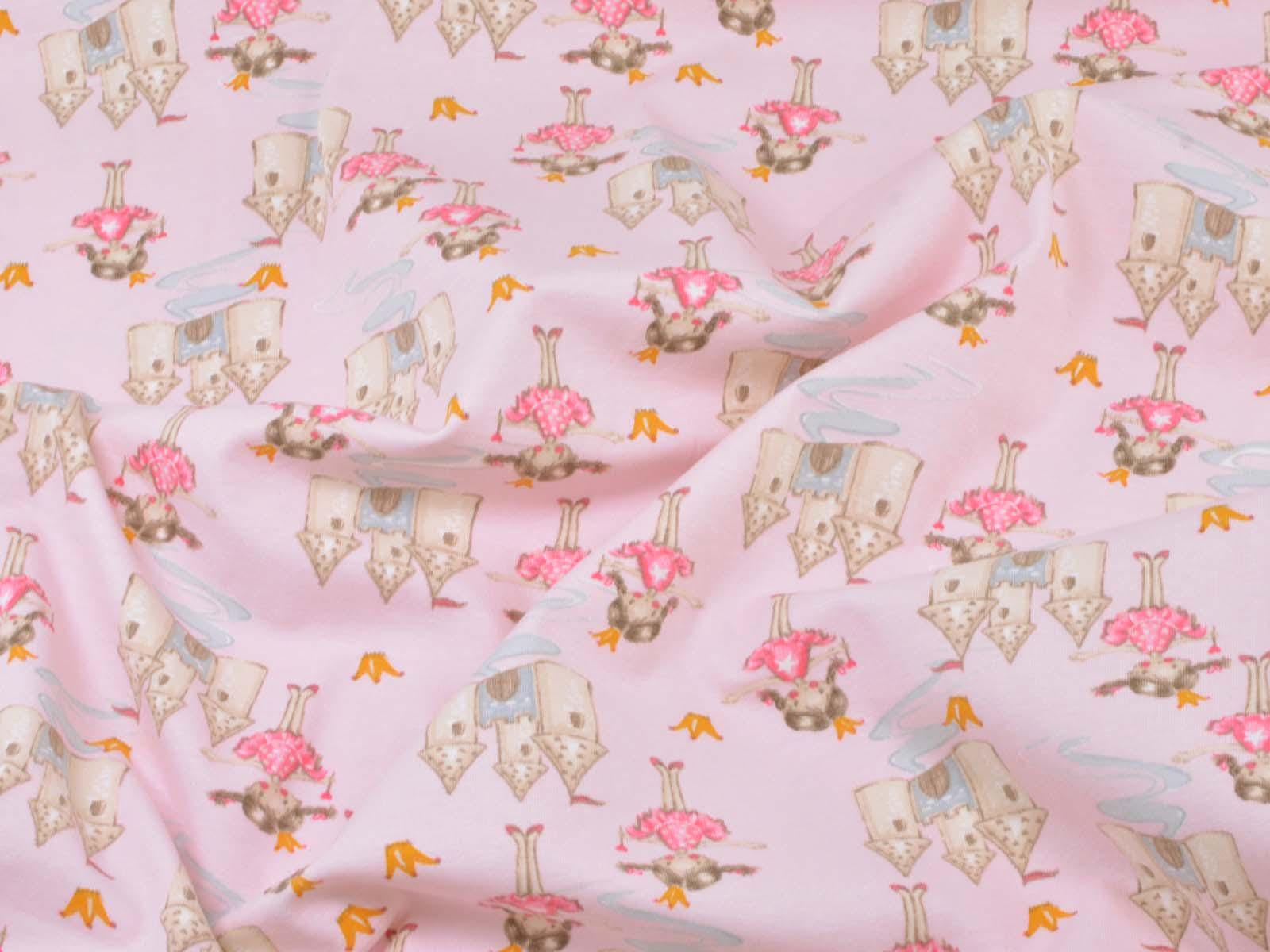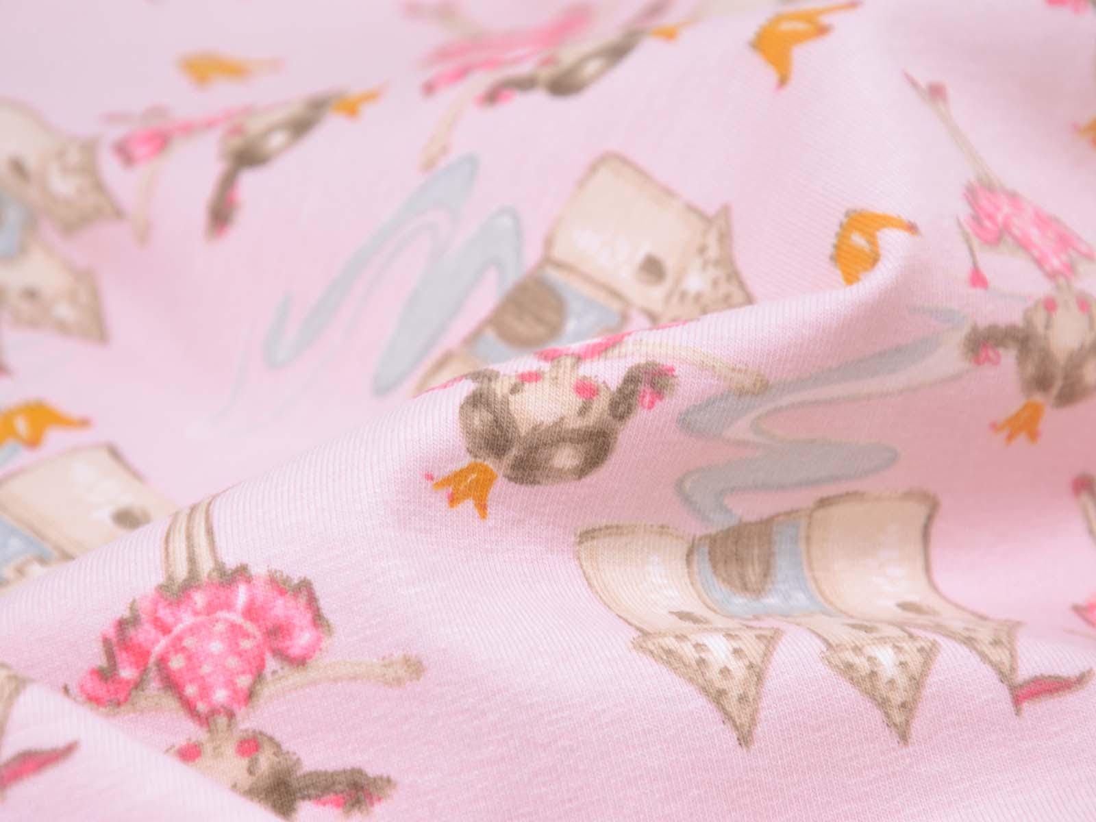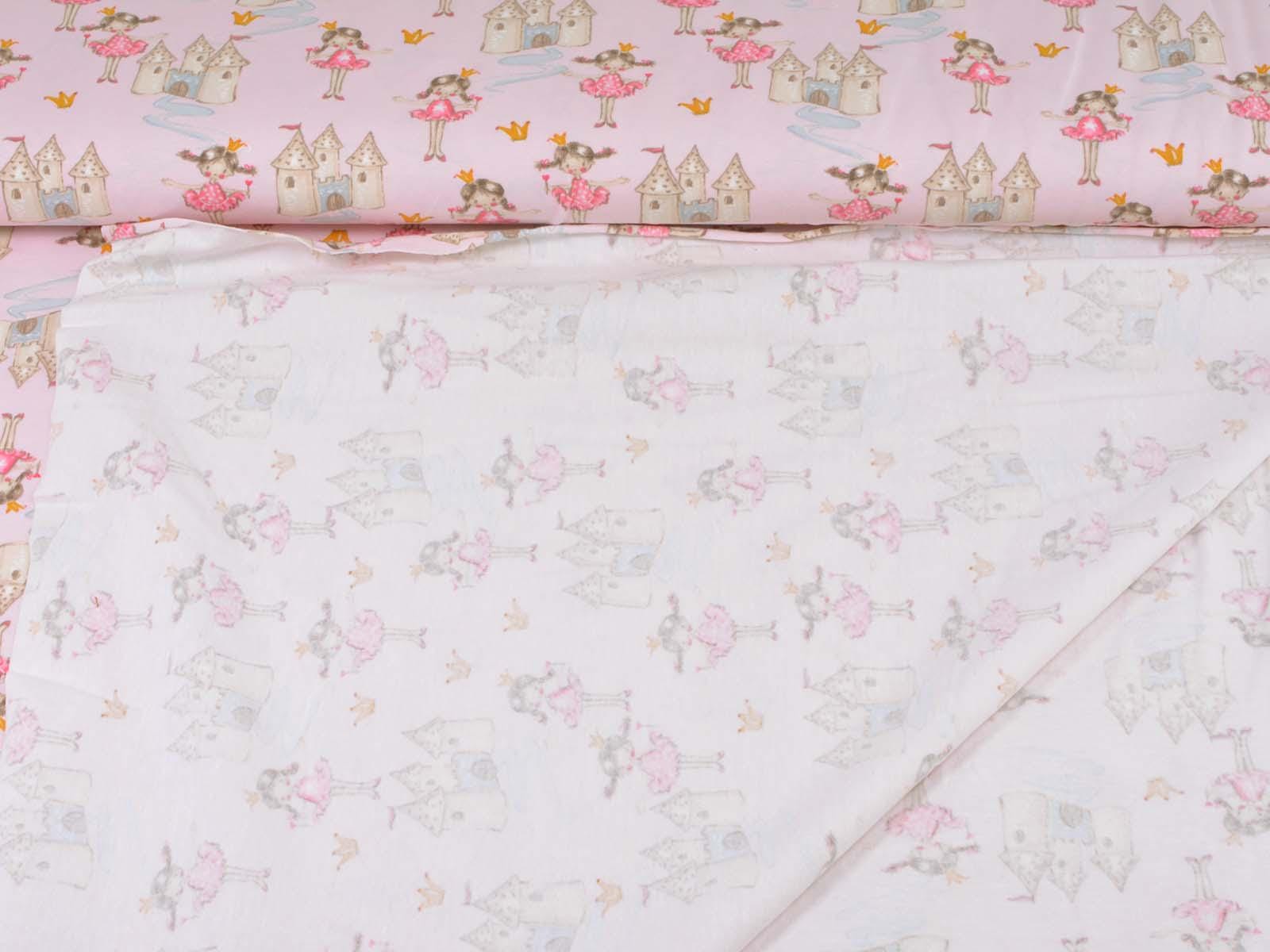 Baumwolljersey in rosa mit Prinzessinnen und Schlössern. Eine Prinzessin ist ca 5 cm groß. Der Stoff ist glatt und dünn. Er eignet sich wunderbar zum Nähen von T-Shirts, Kleidern, Röcken, Shorts und vielem mehr.
