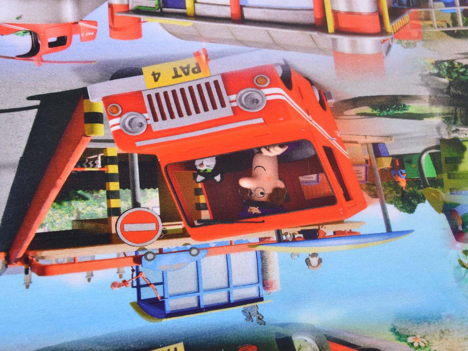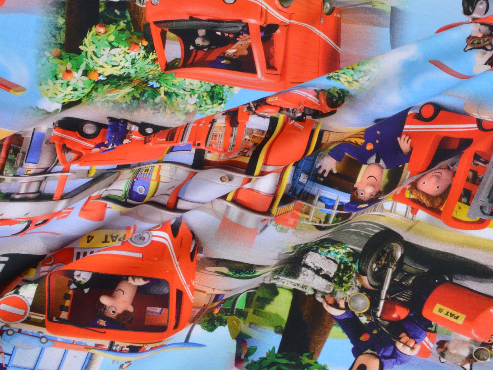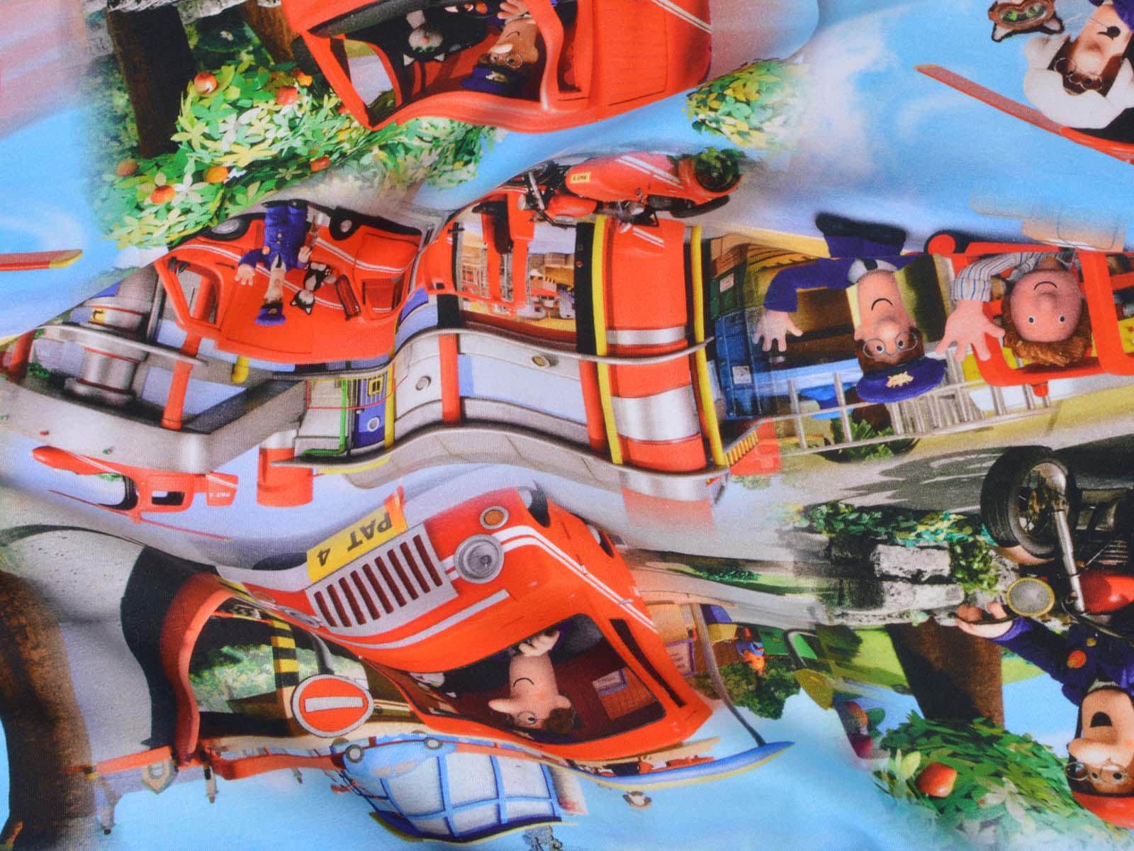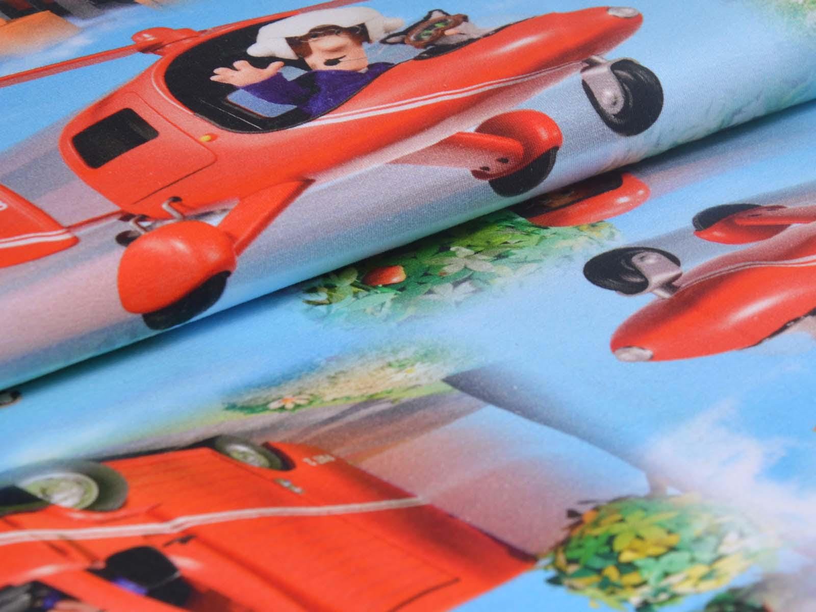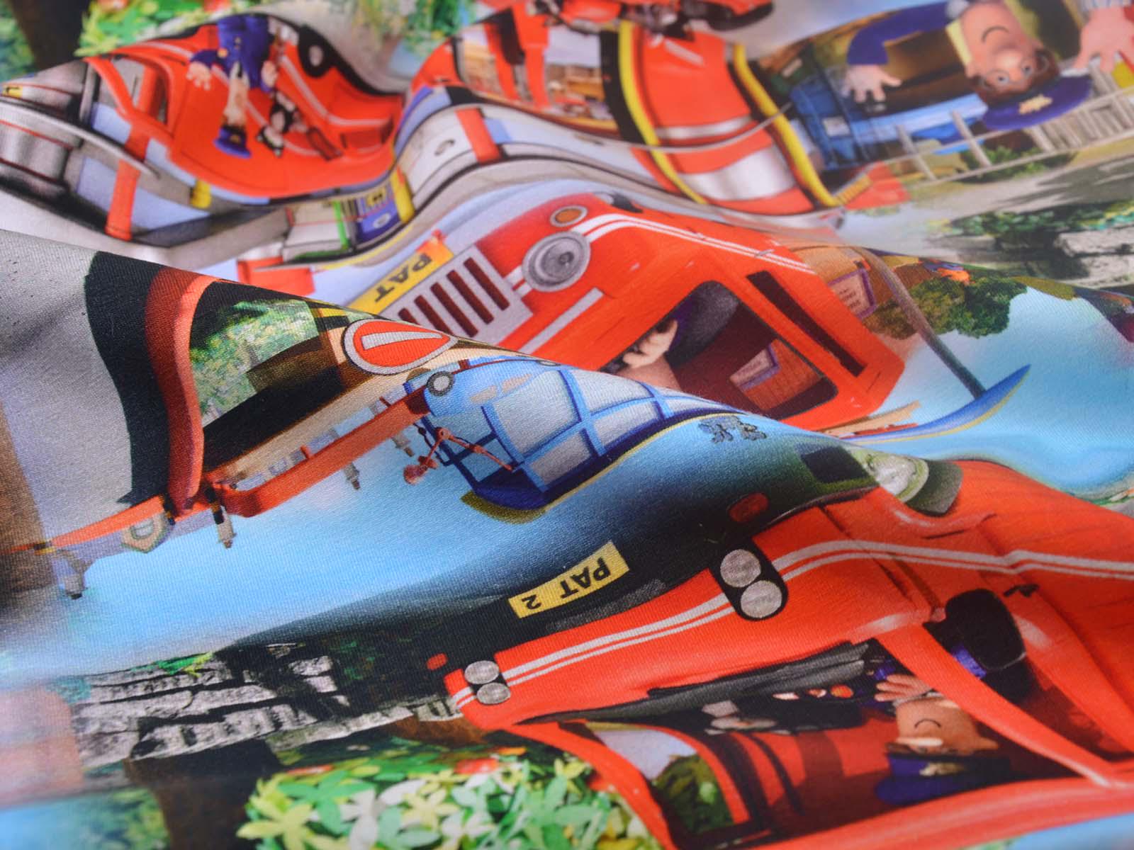 Kinderjersey mit Feuerwehrmann Sam aus Baumwolle. Der Stoff ist rot, blau, gelb und grün. Er ist glatt und dünn und eignet sich wunderbar zum Nähen von dünnen Sweatshirts, Pumphosen, Bodys, T-Shirts und vielem mehr.