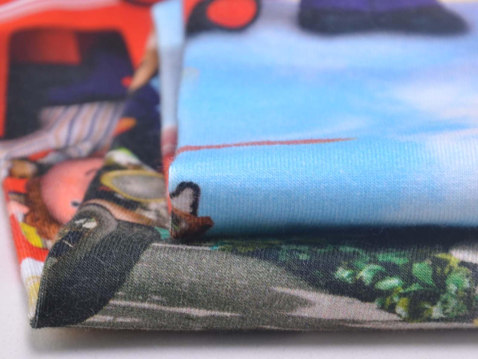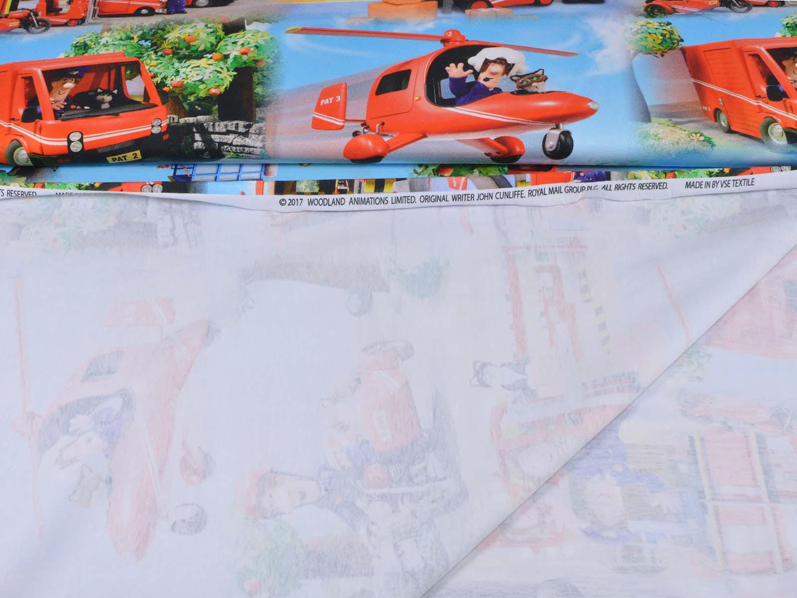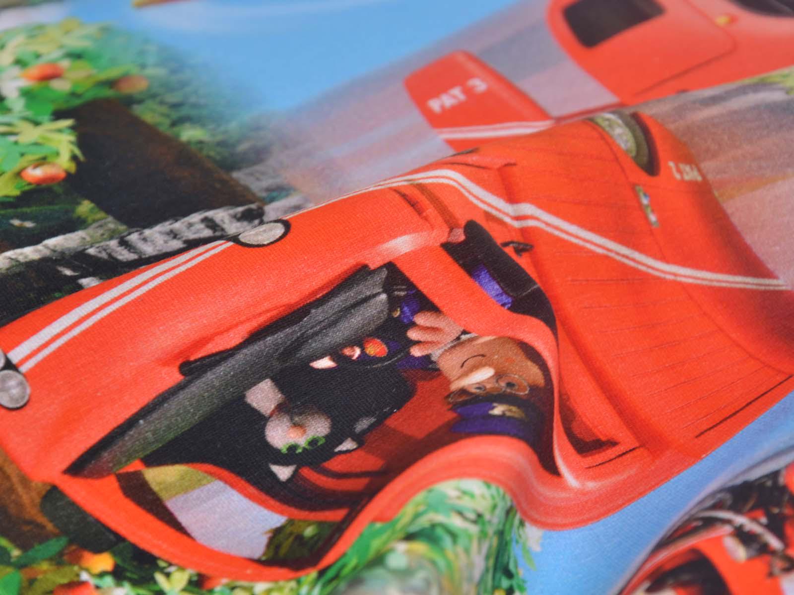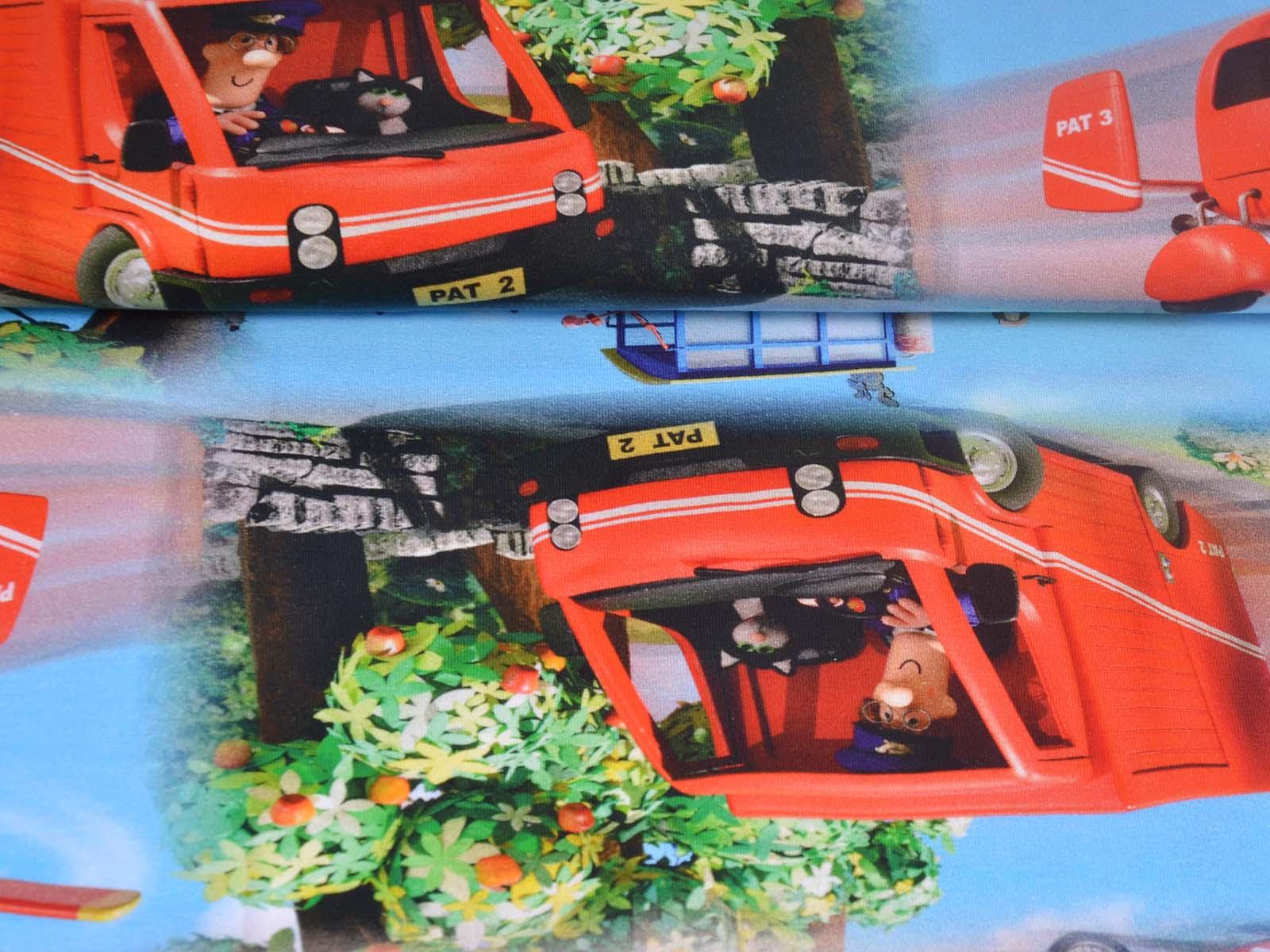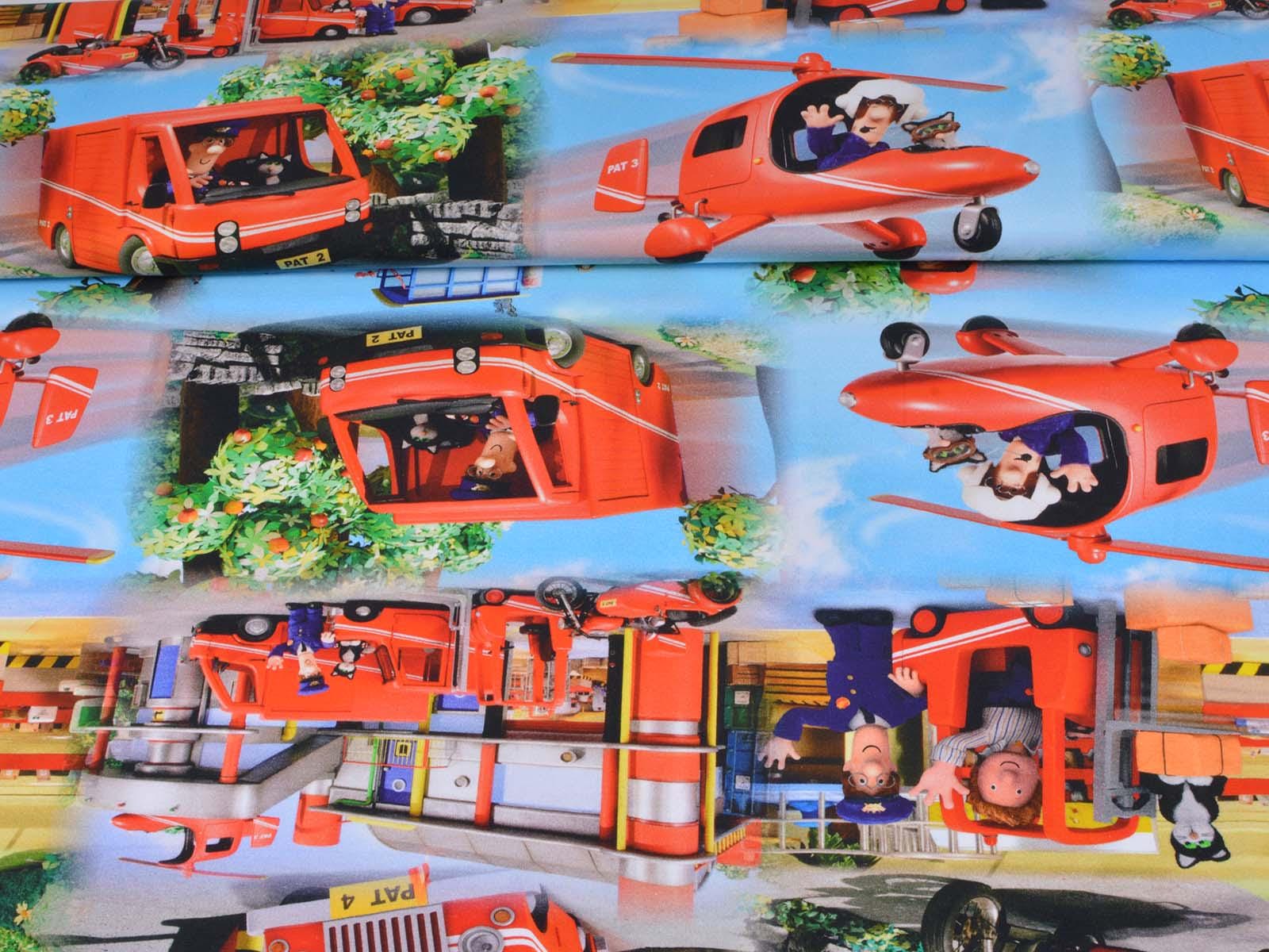Kinderjersey mit Feuerwehrmann Sam aus Baumwolle. Der Stoff ist rot, blau, gelb und grün. Er ist glatt und dünn und eignet sich wunderbar zum Nähen von dünnen Sweatshirts, Pumphosen, Bodys, T-Shirts und vielem mehr.