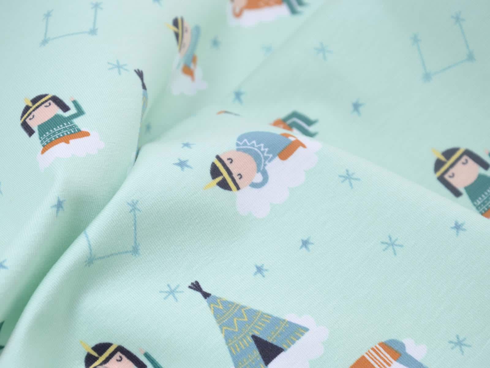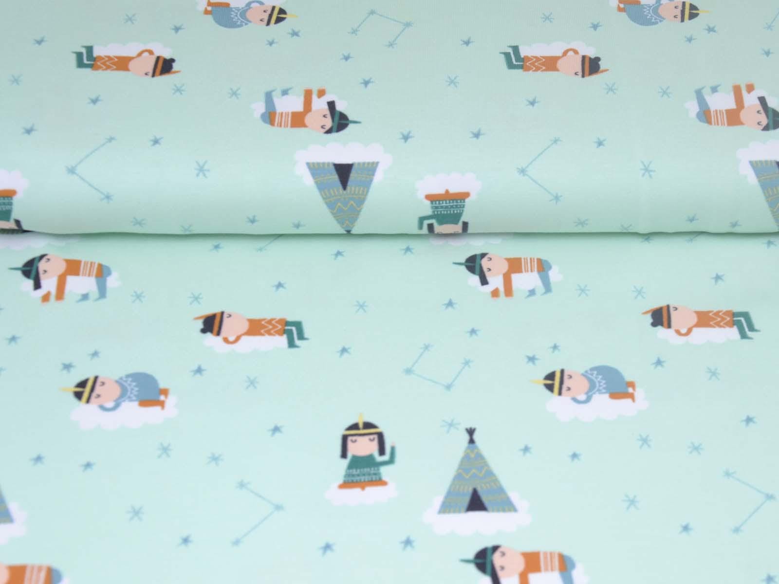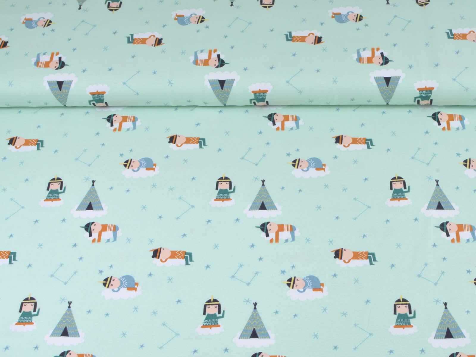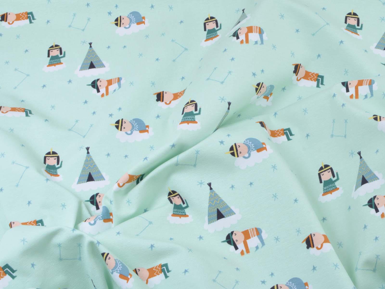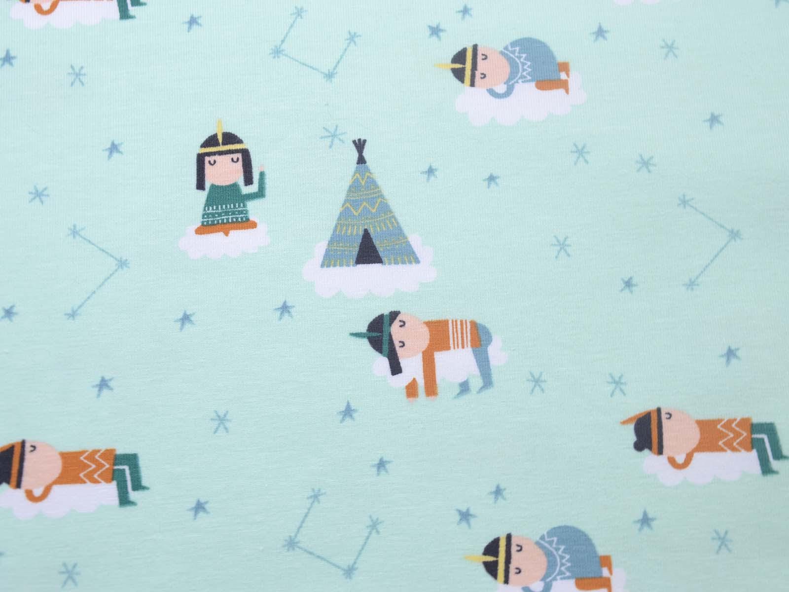Hellblauer Baumwolljersey mit blauen Sternchen, auf Wolken liegenden Indianern und Tipis. Ein Tipizelt auf einer Wolke ist etwa 4,5 cm groß. Der Stoff ist glatt und dünn. Er eignet sich wunderbar zum Nähen von T-Shirts, Kleidern, Röcken, Pumphosen, Bodys und vielem mehr.