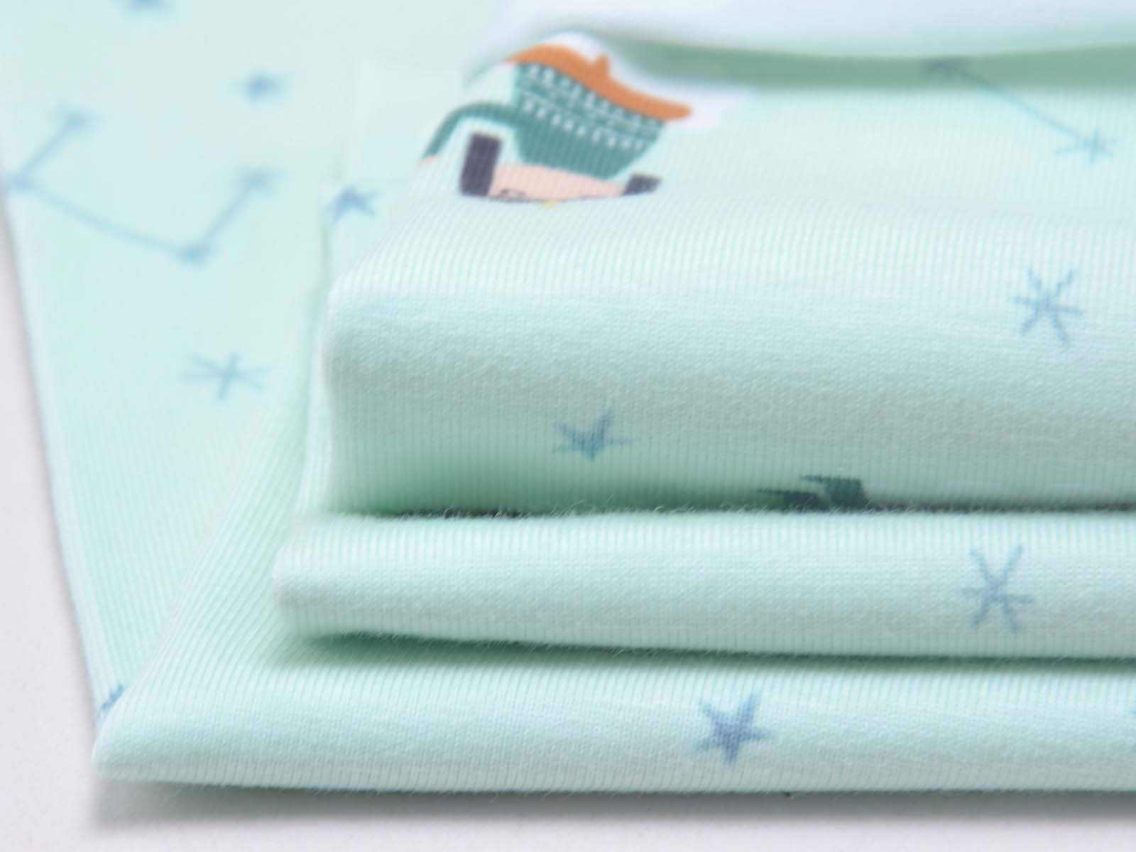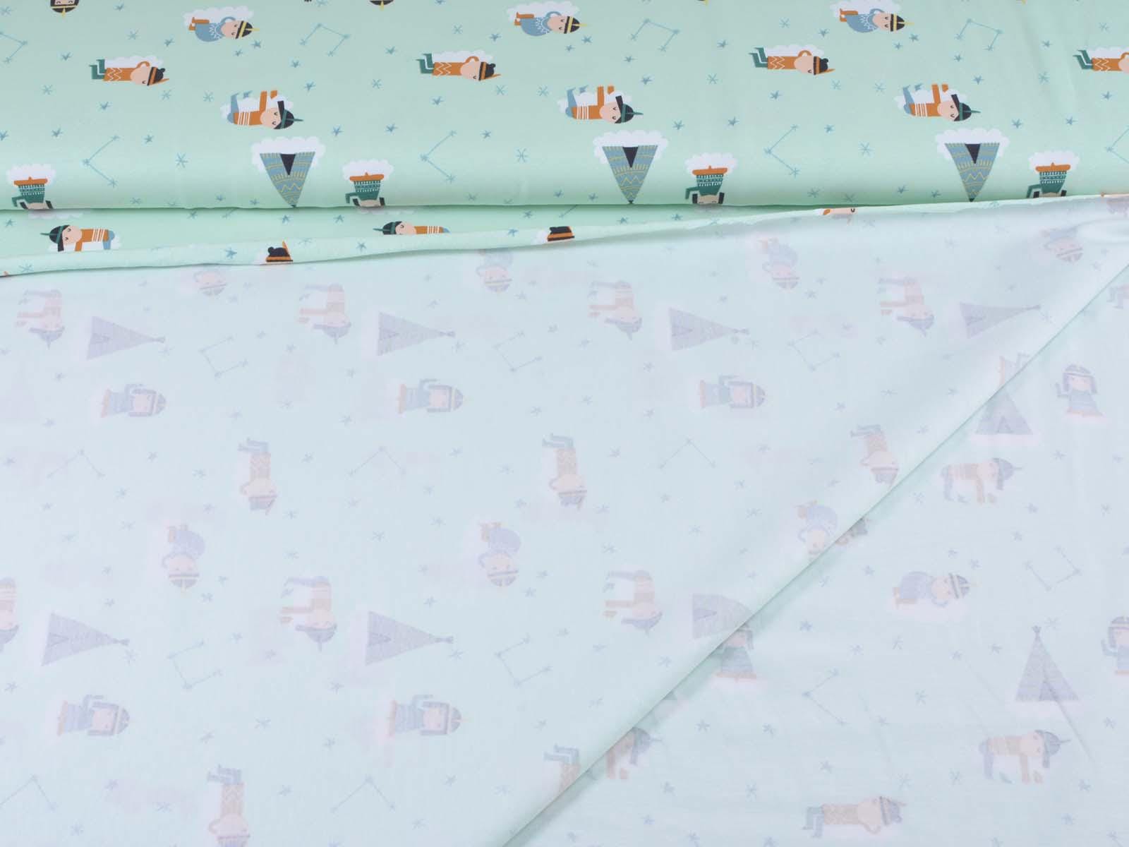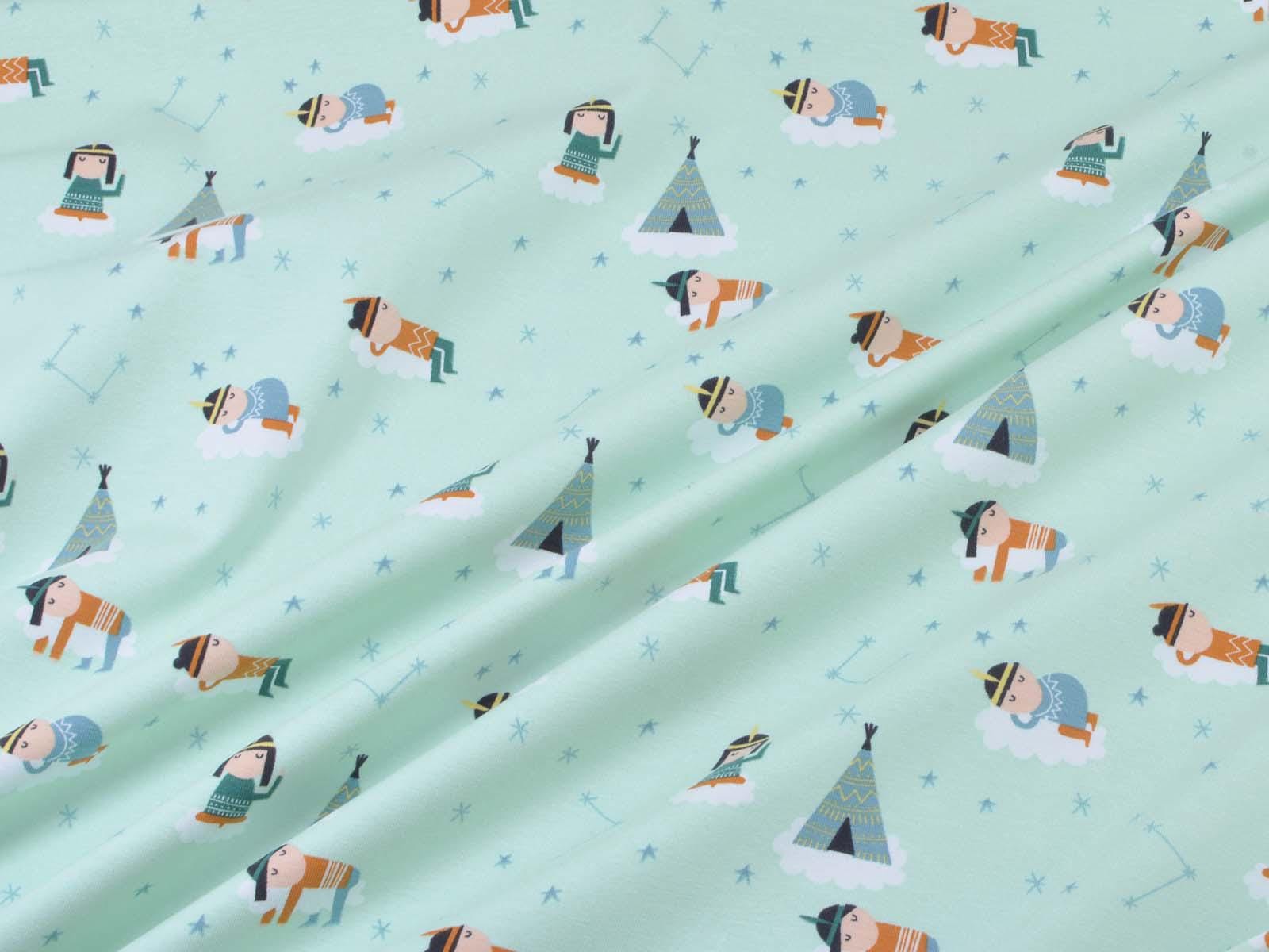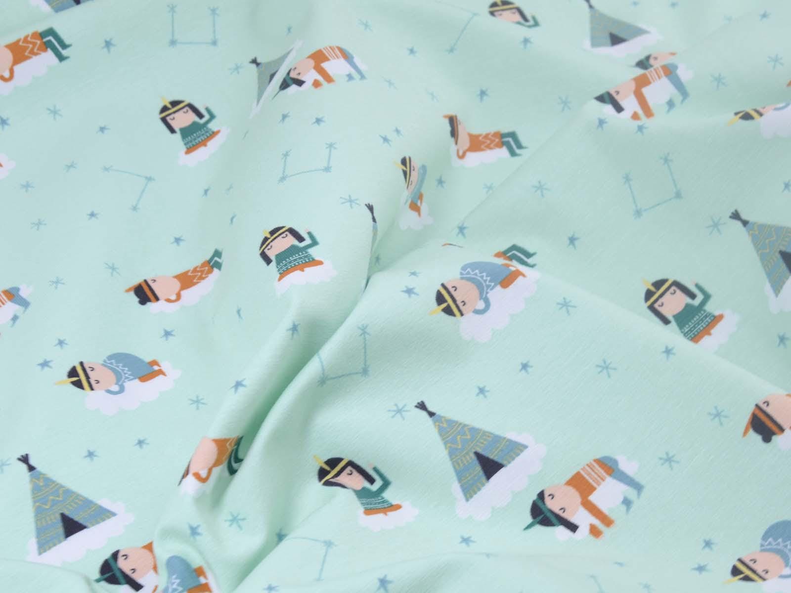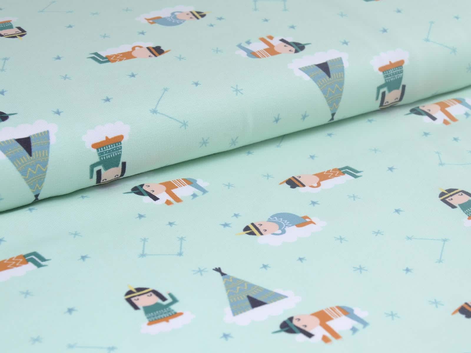 Hellblauer Baumwolljersey mit blauen Sternchen, auf Wolken liegenden Indianern und Tipis. Ein Tipizelt auf einer Wolke ist etwa 4,5 cm groß. Der Stoff ist glatt und dünn. Er eignet sich wunderbar zum Nähen von T-Shirts, Kleidern, Röcken, Pumphosen, Bodys und vielem mehr.