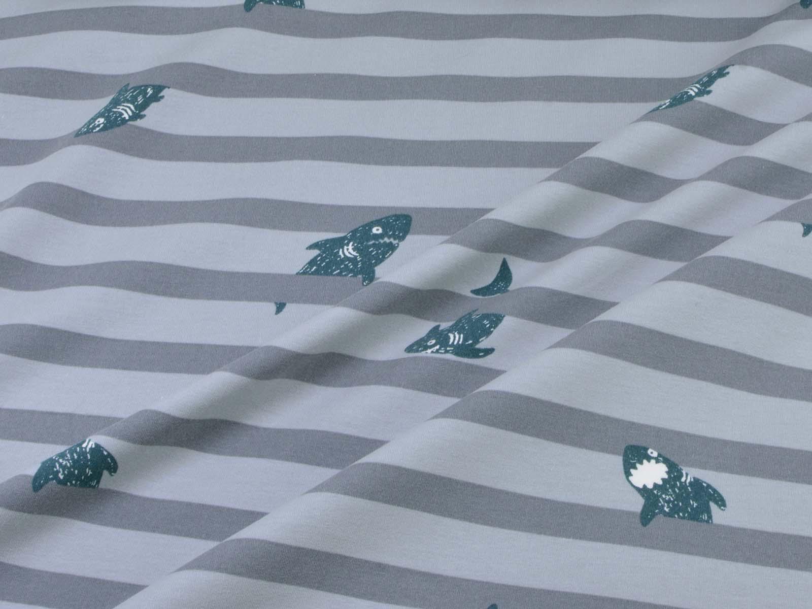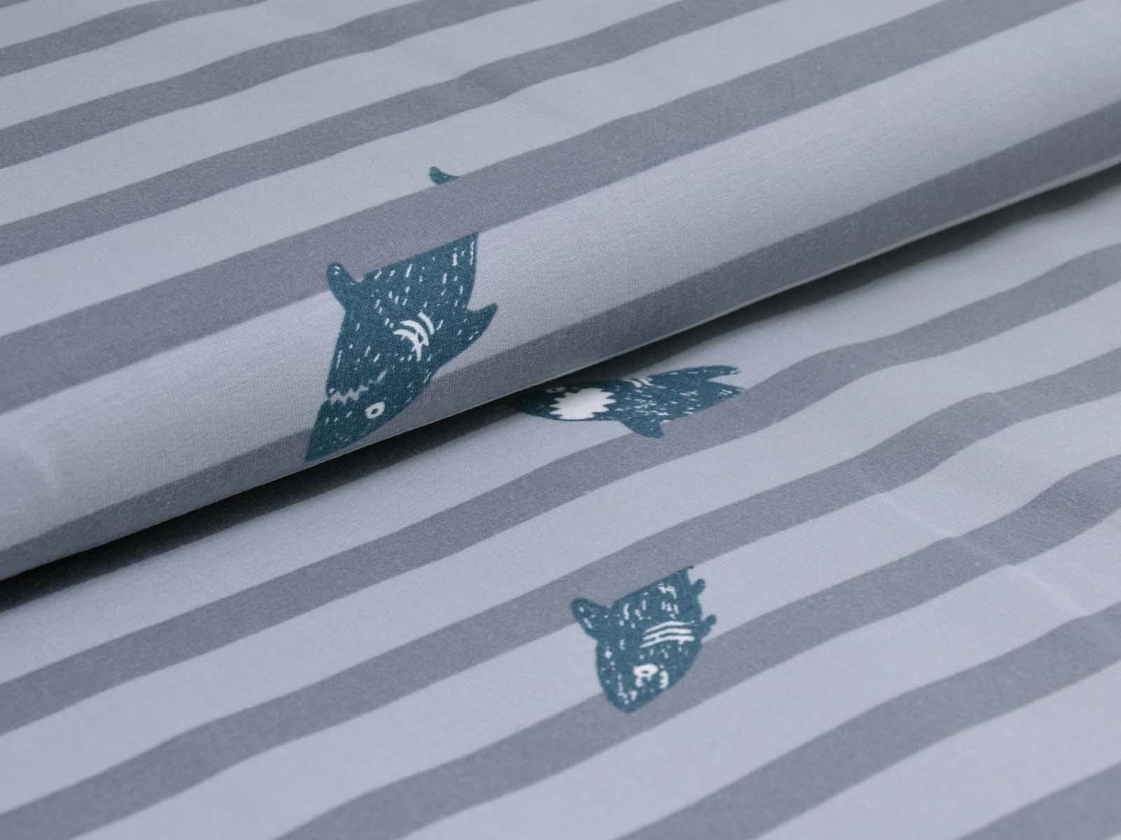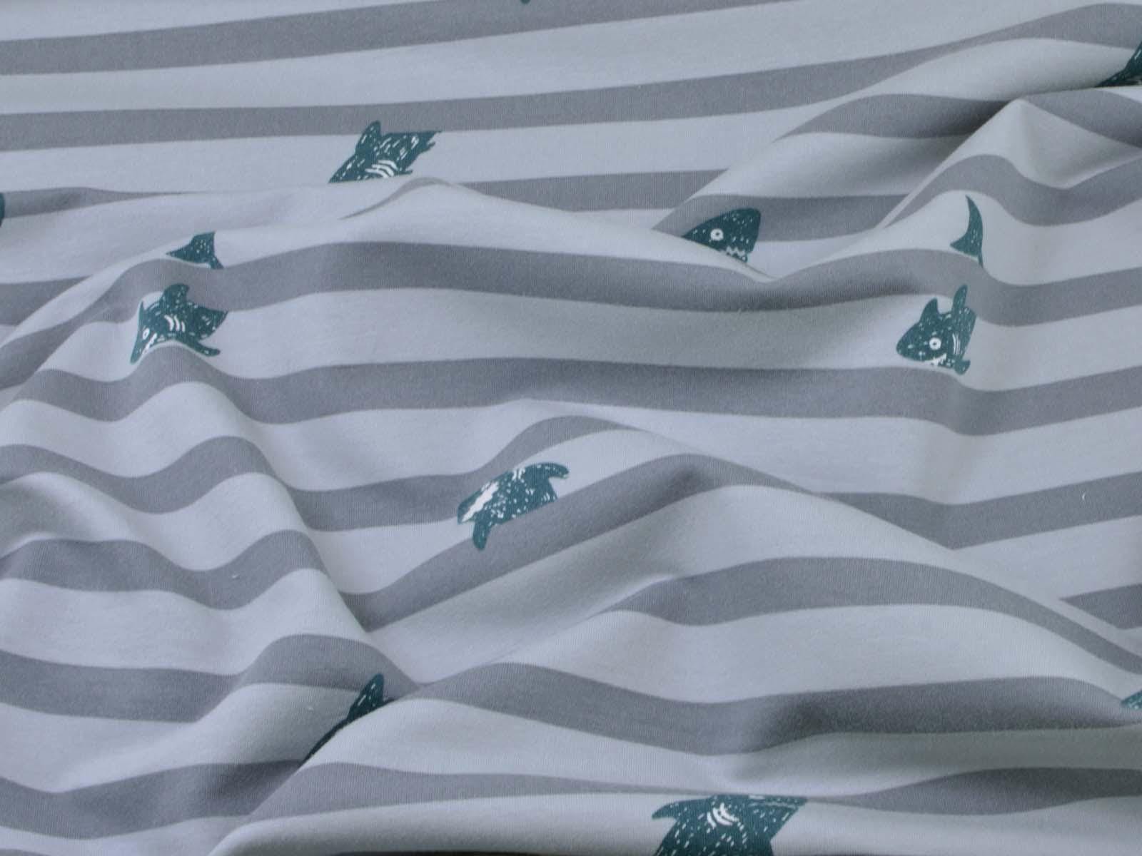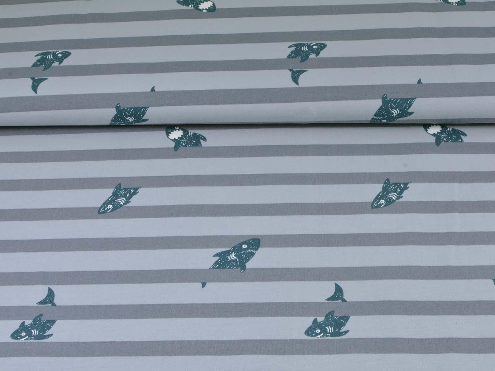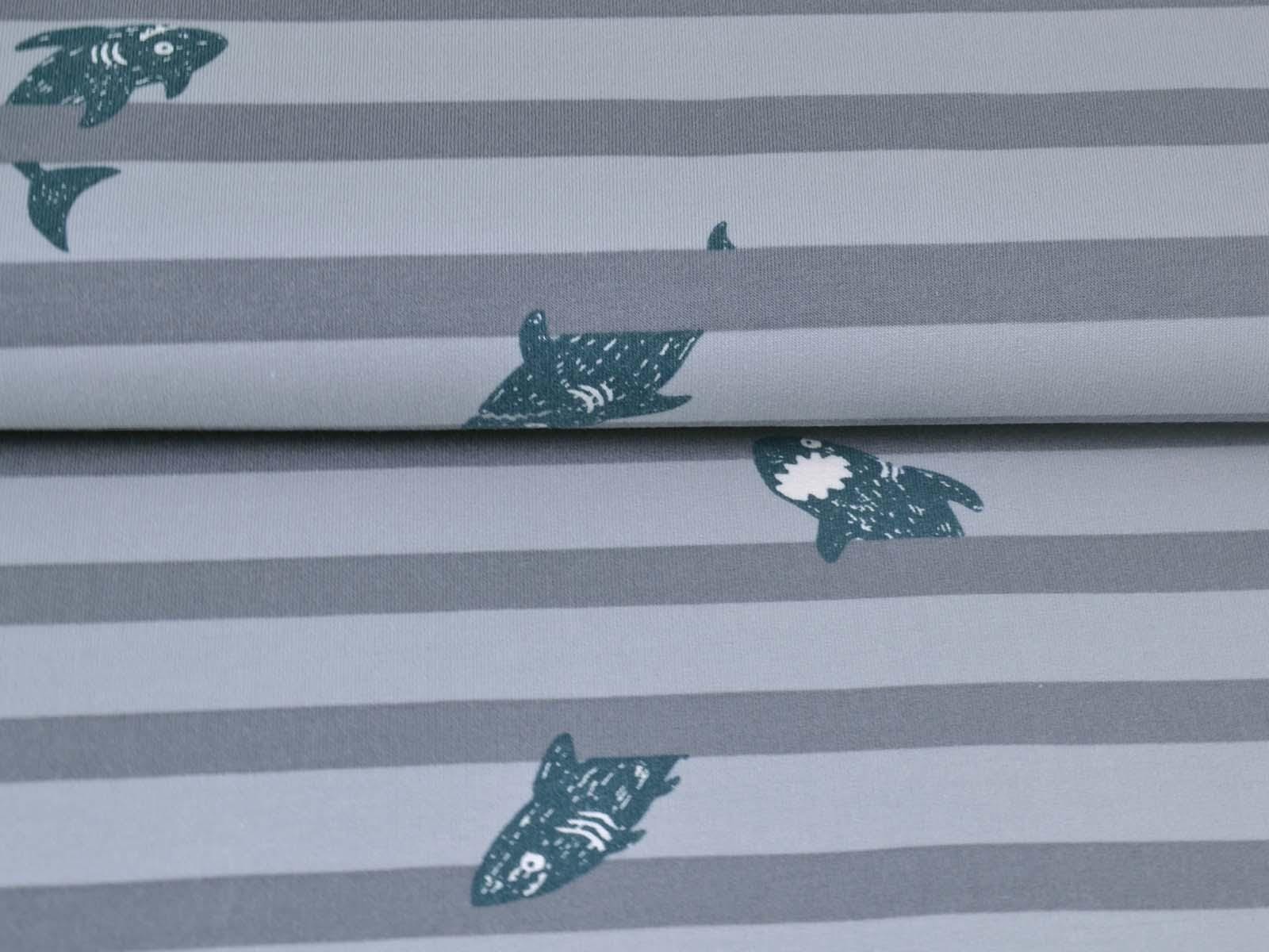 Kindersweat in hellgrau mit grauen Streifen und blauen Haien. Der French Terry ist eher dünn und glatt. Er eignet sich wunderbar zum Nähen von Pumphosen, dünnen Sweatshirts, Shorts, Jogginghosen und vielem mehr.