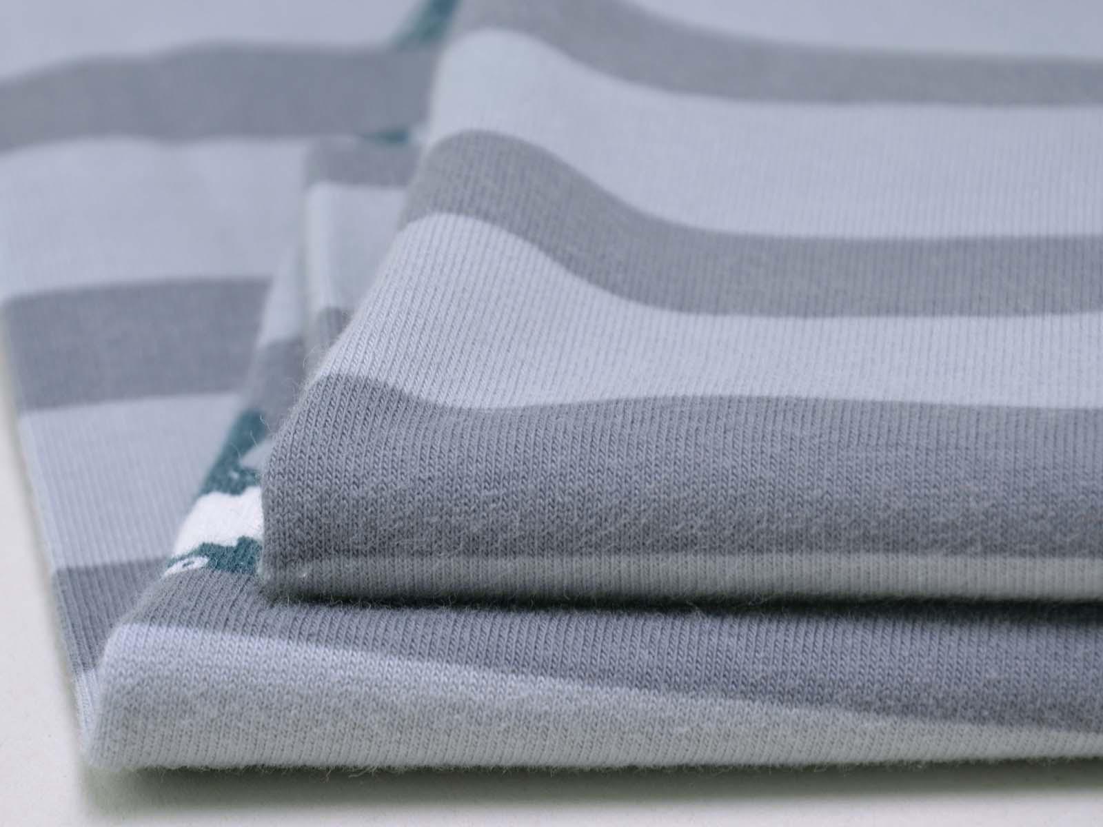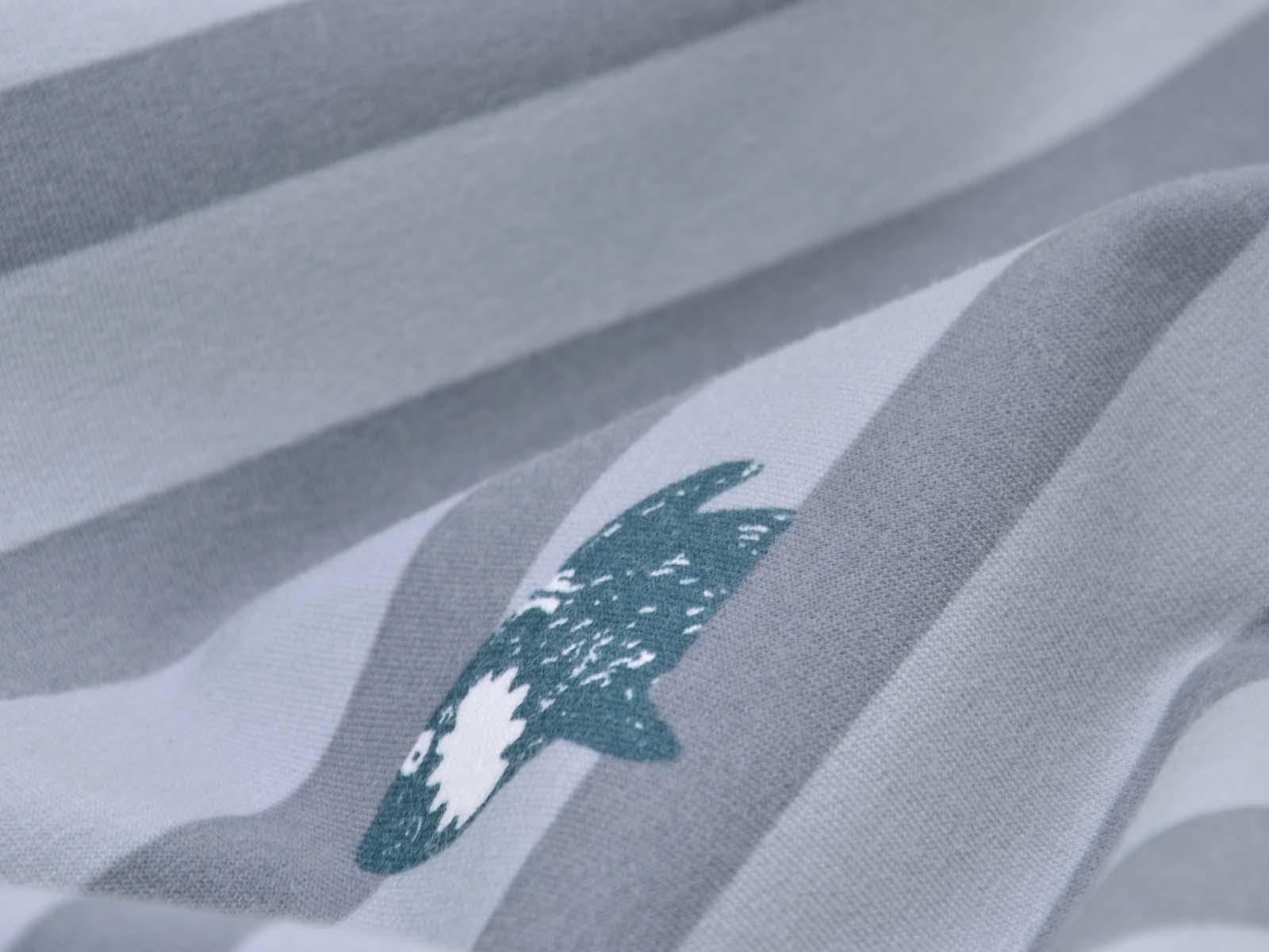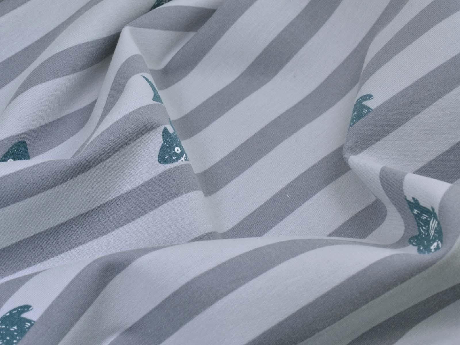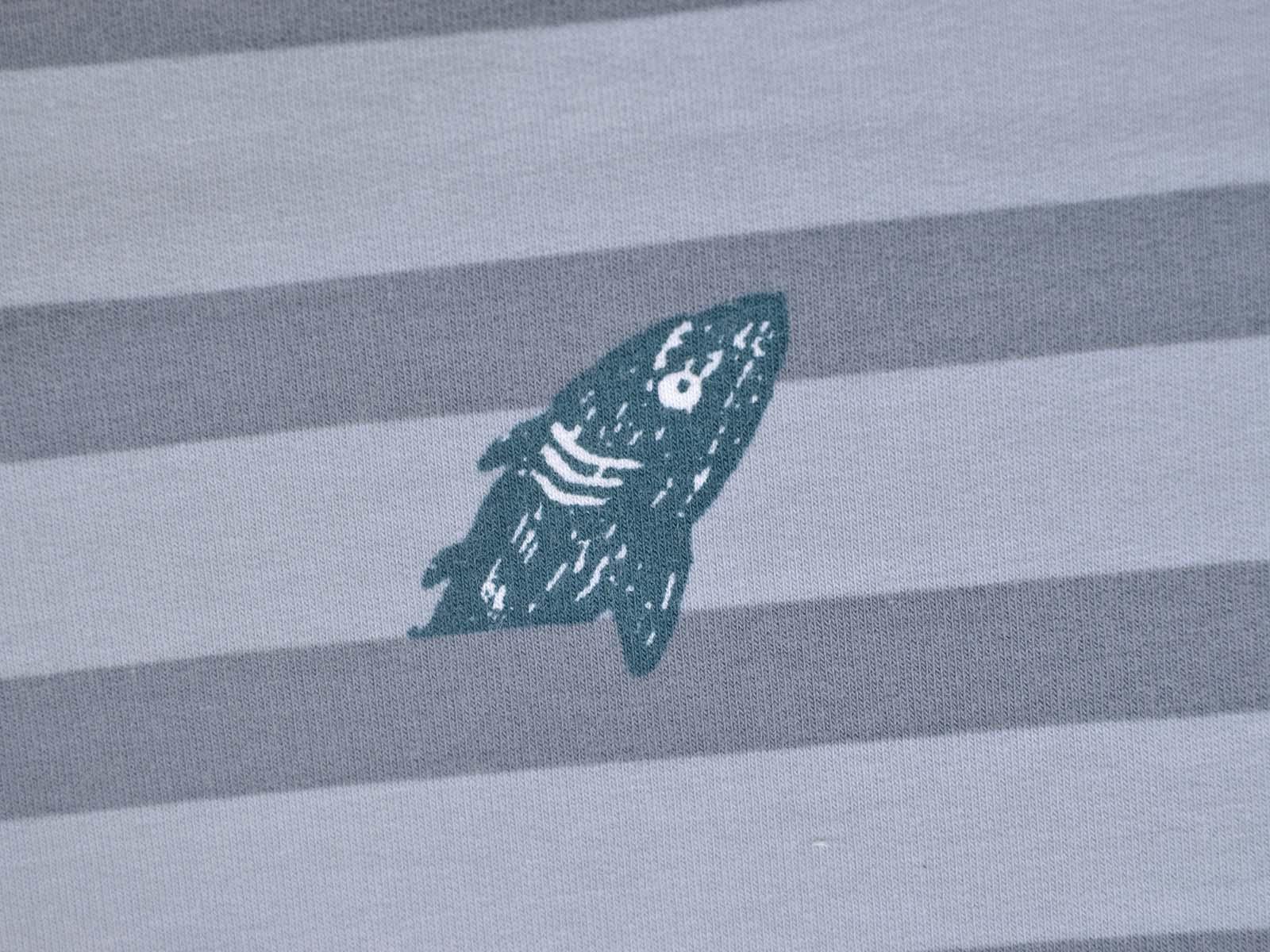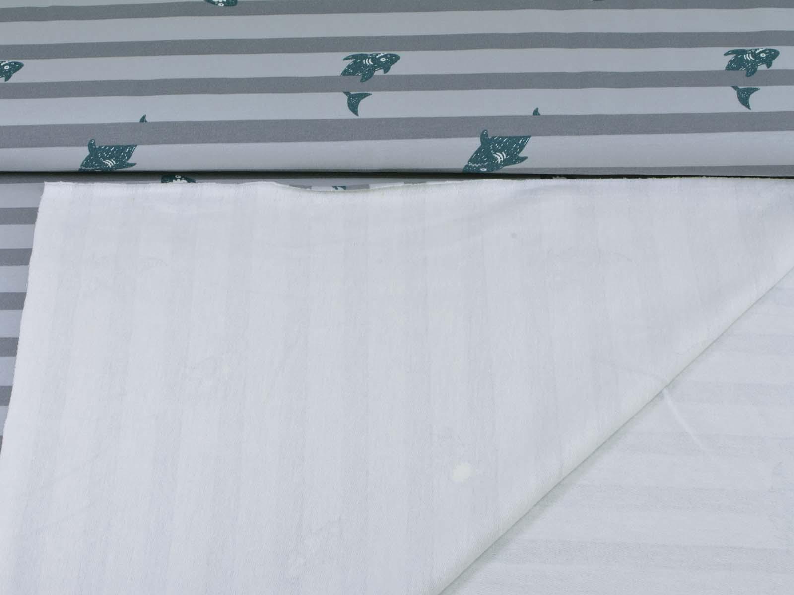 Kindersweat in hellgrau mit grauen Streifen und blauen Haien. Der French Terry ist eher dünn und glatt. Er eignet sich wunderbar zum Nähen von Pumphosen, dünnen Sweatshirts, Shorts, Jogginghosen und vielem mehr.