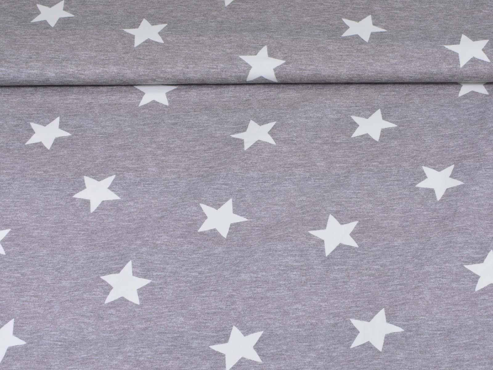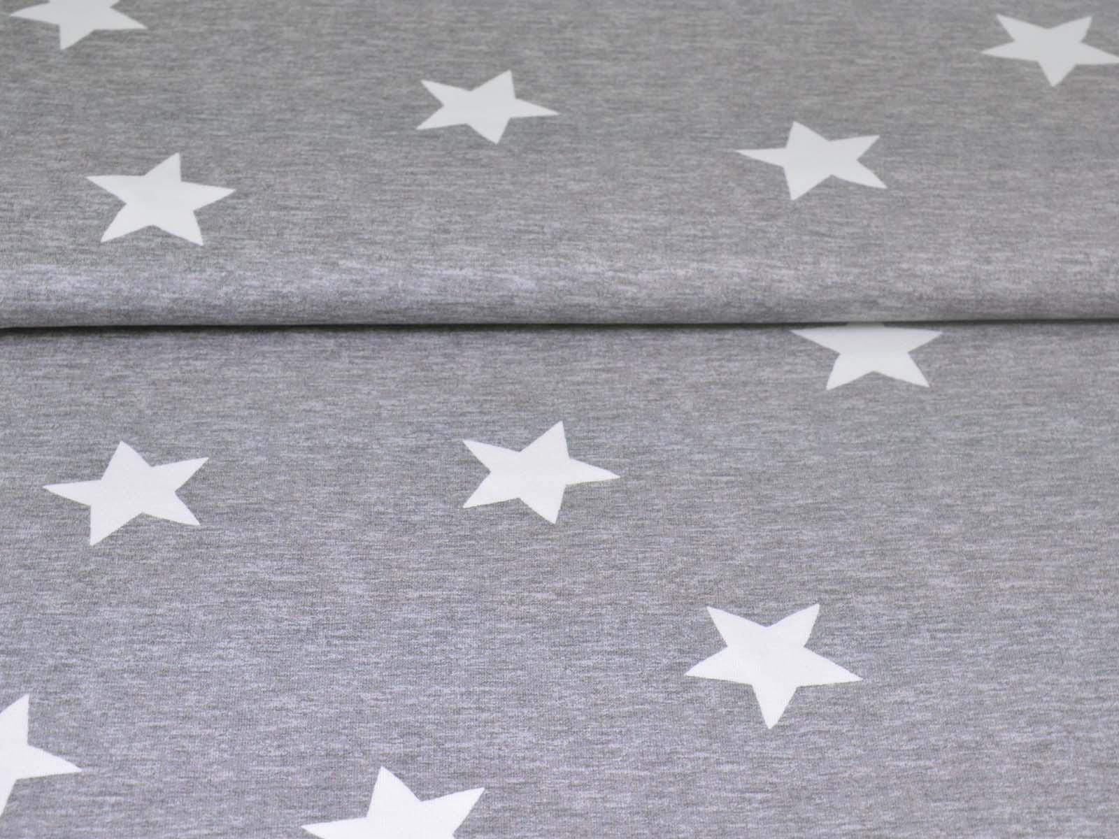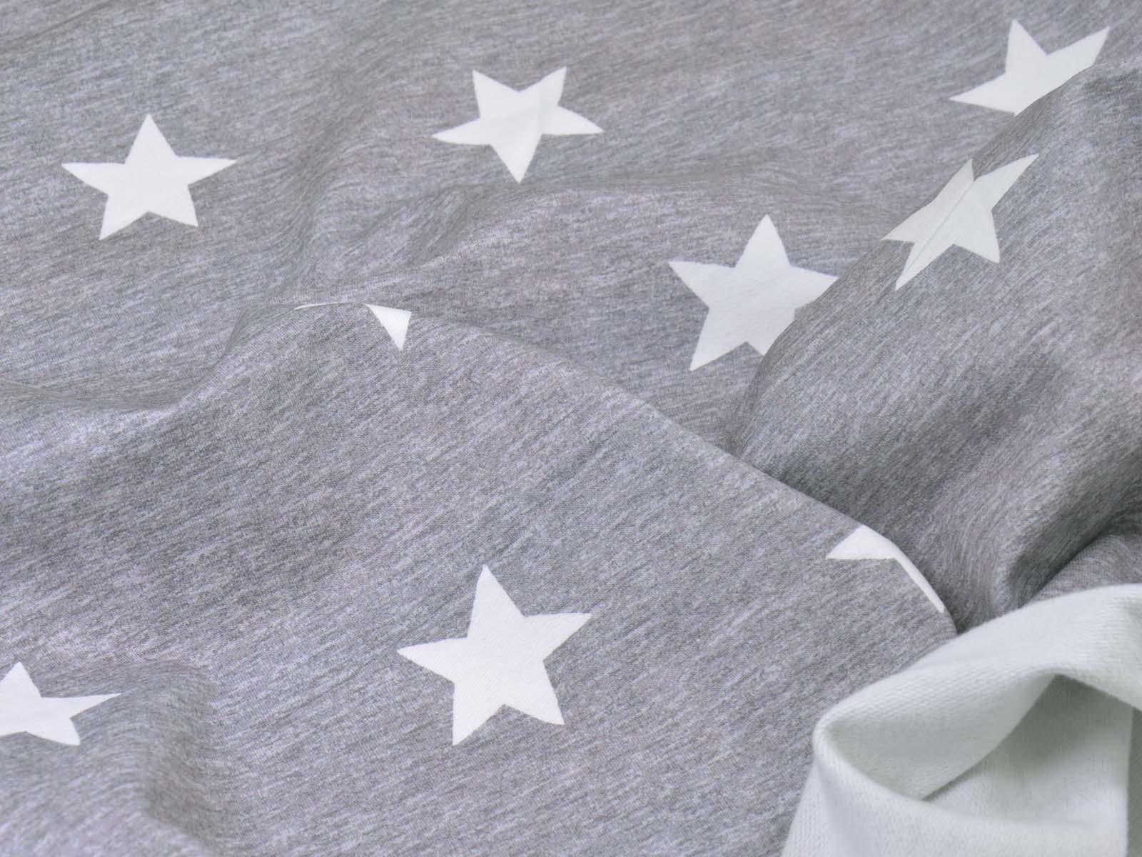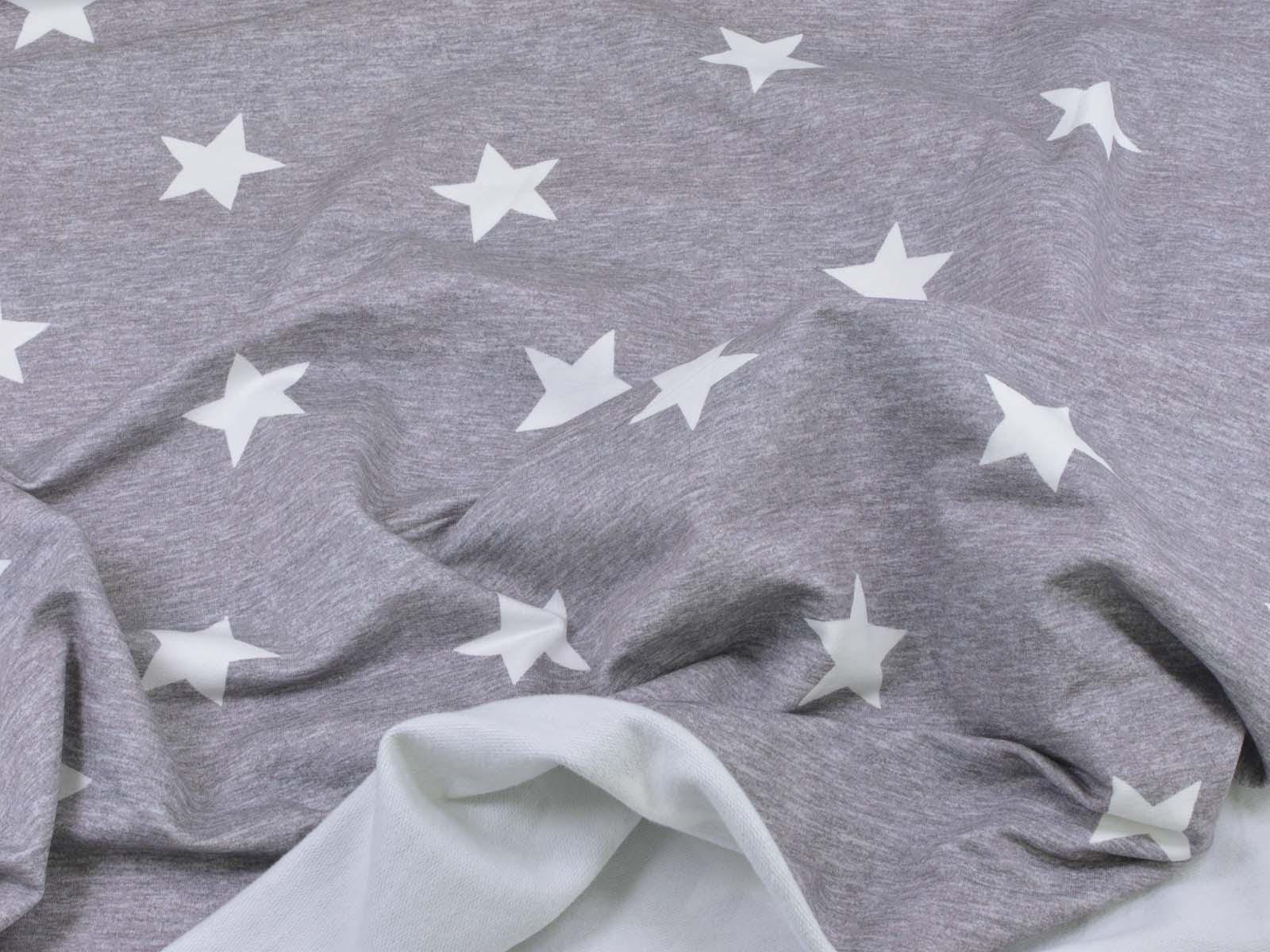 Grauer Sommersweat mit weißen Sternen aus Baumwolle. Ein Stern ist etwa 4,5 cm groß. Der Stoff ist glatt und eher dünn. Er eignet sich wunderbar zum Nähen von dünnen Pullovern, Shorts, Kleidern, Röcken und vielem mehr.