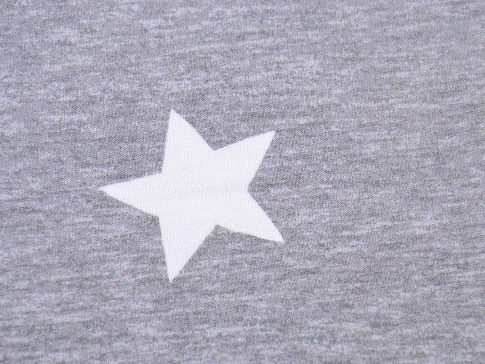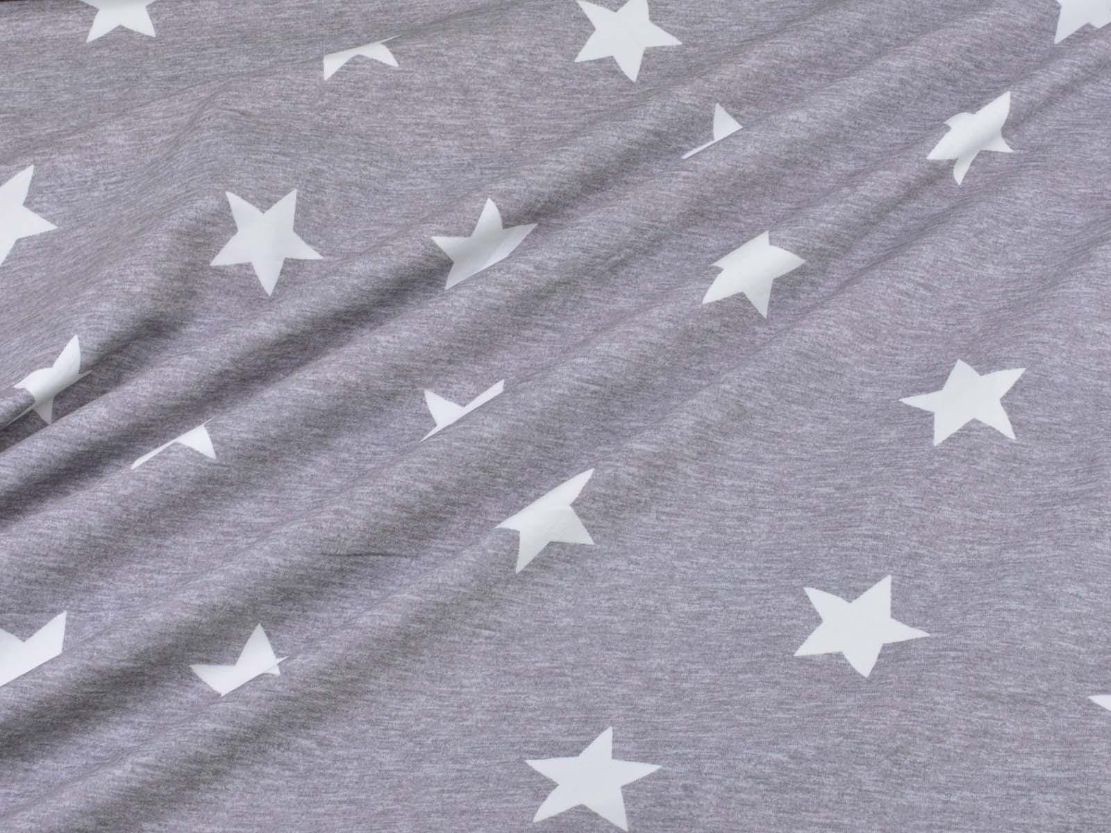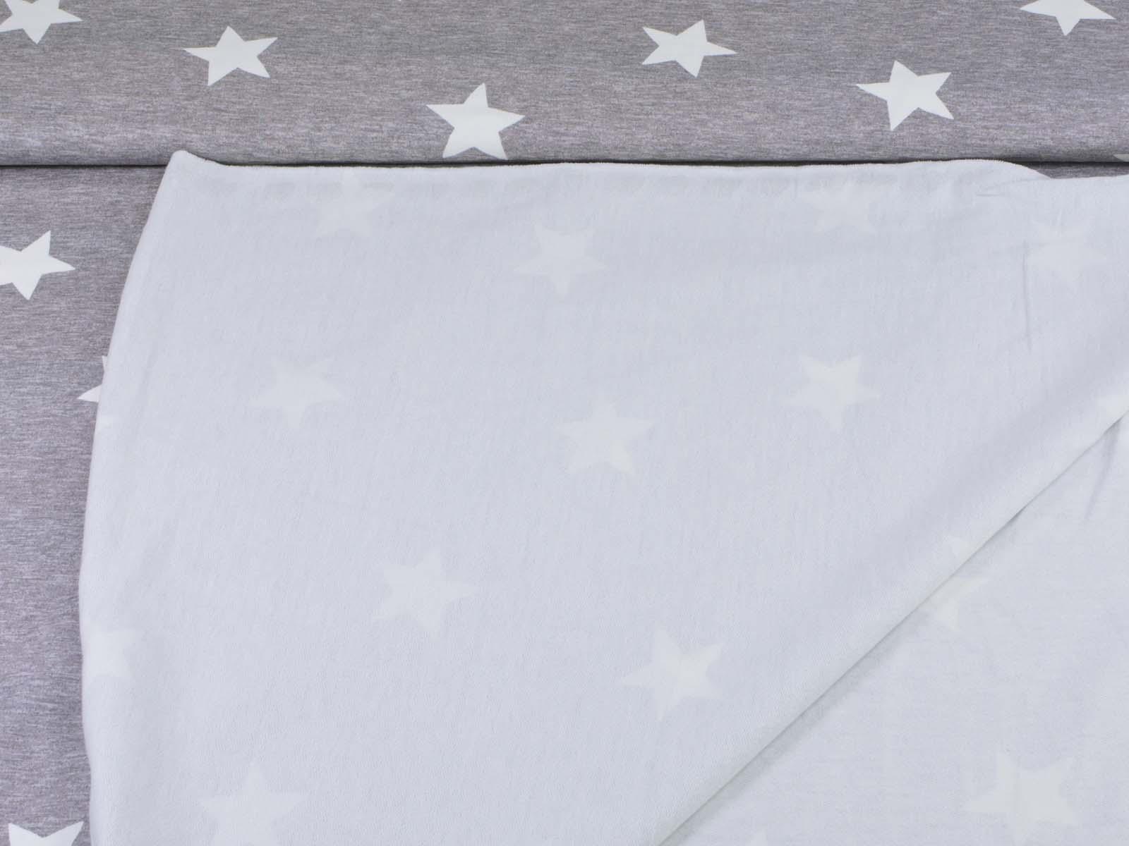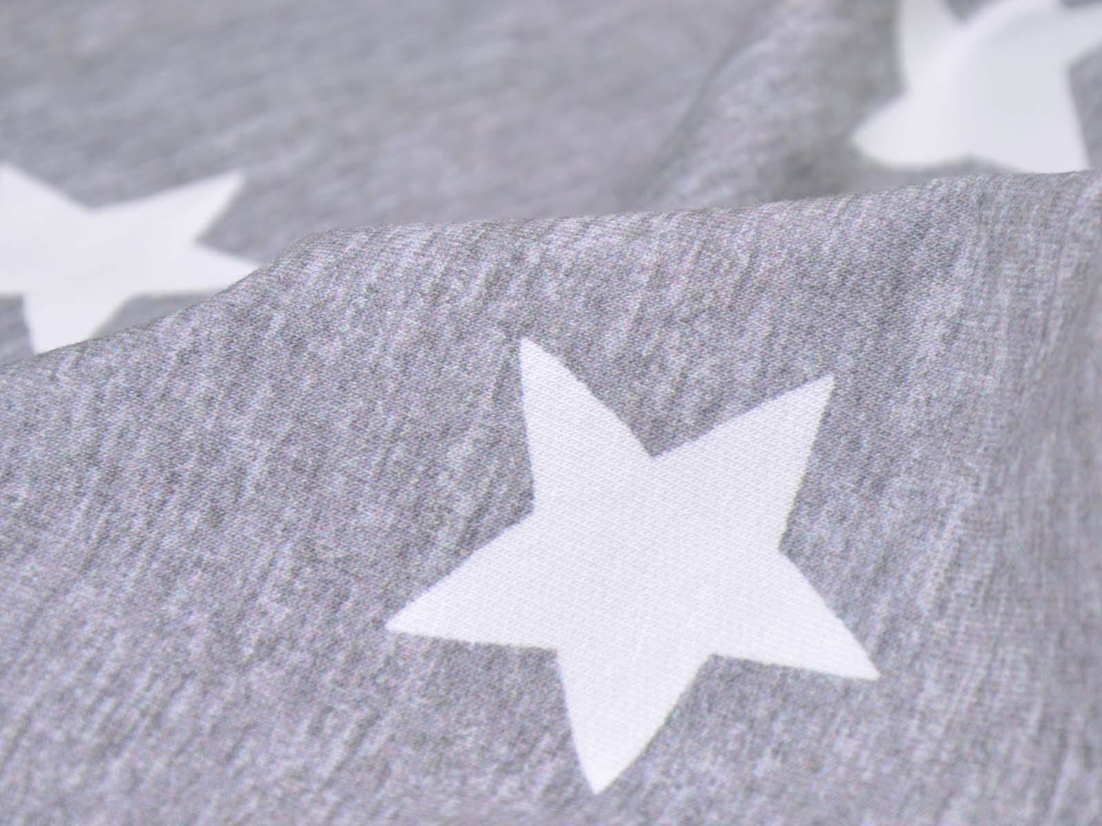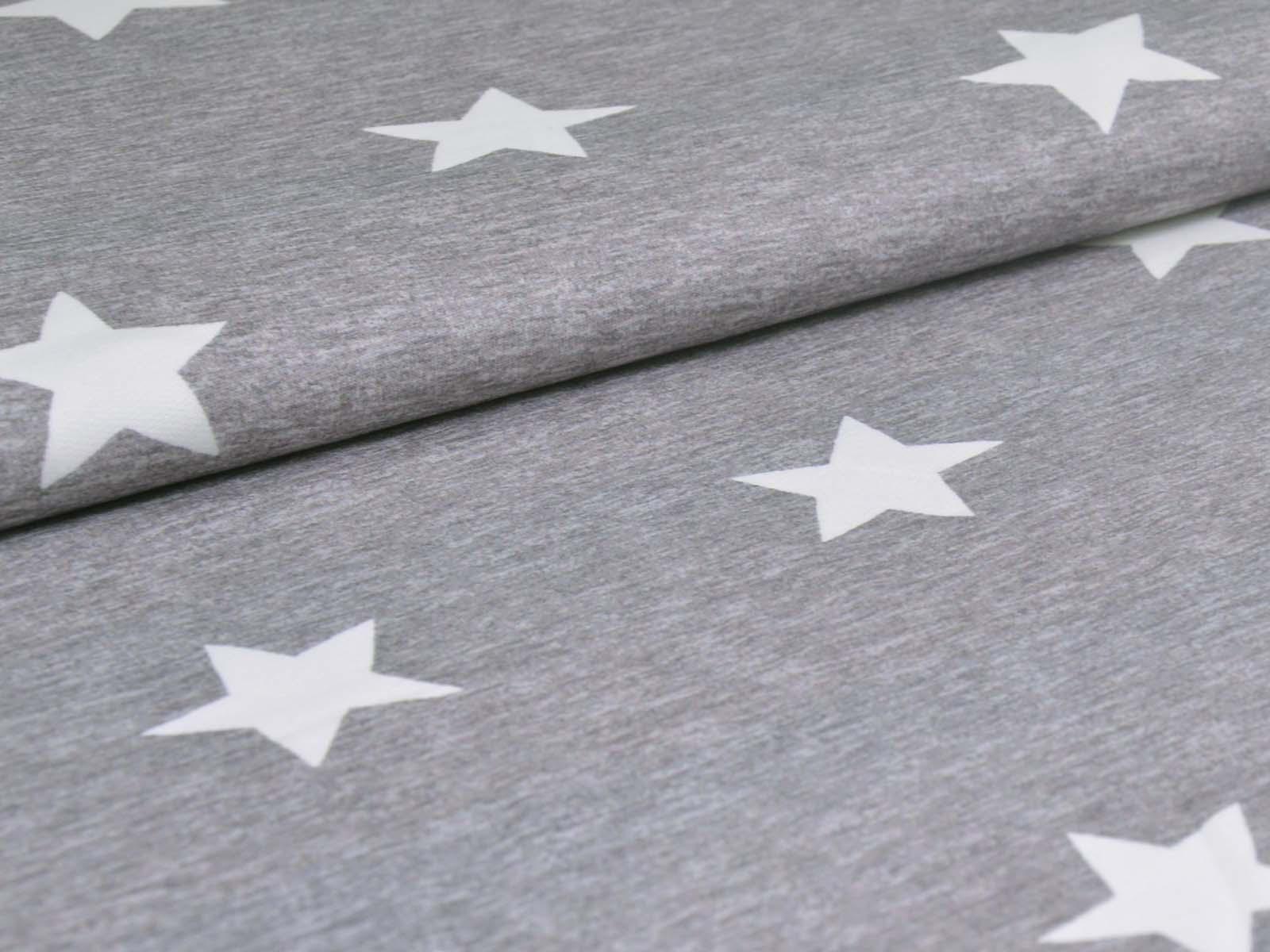 Grauer Sommersweat mit weißen Sternen aus Baumwolle. Ein Stern ist etwa 4,5 cm groß. Der Stoff ist glatt und eher dünn. Er eignet sich wunderbar zum Nähen von dünnen Pullovern, Shorts, Kleidern, Röcken und vielem mehr.