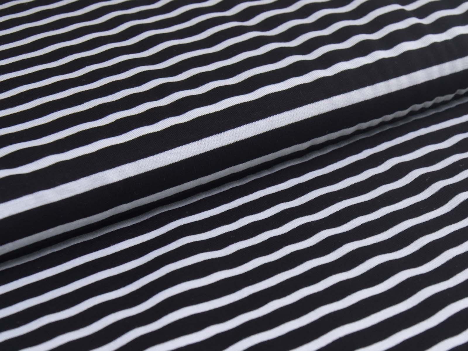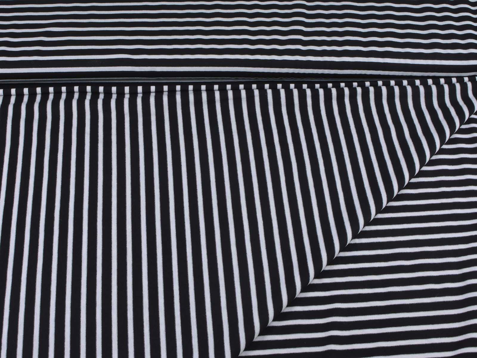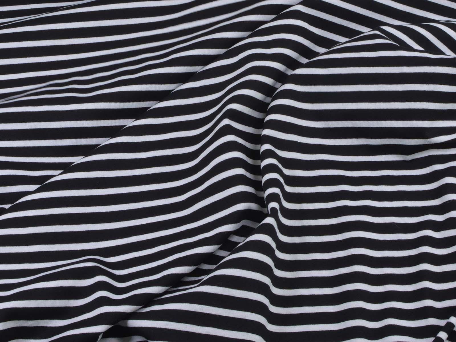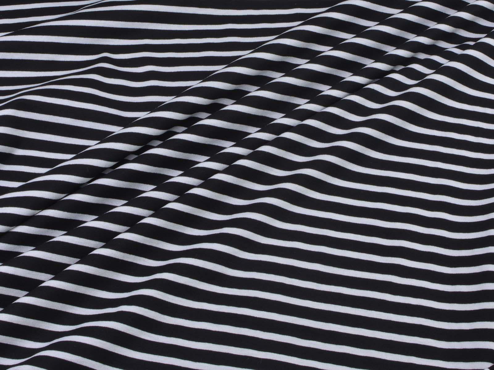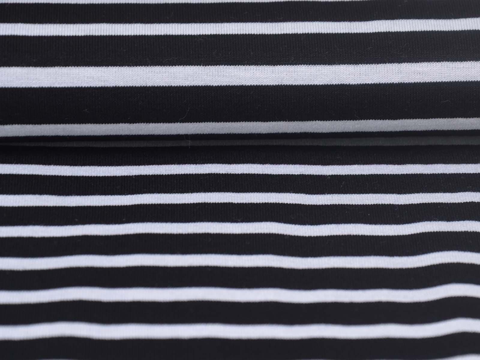 Schöner Jersey mit weißen und schwarzen Streifen aus Baumwolle. Ein weißer Streifen ist ca. 5 mm breit. Der Stoff ist glatt und dünn. Nähe dir aus ihm T-Shirts, Langarmshirts, Bodys, Pumphosen und vieles mehr oder kombiniere ihn mit anderen Stoffen.