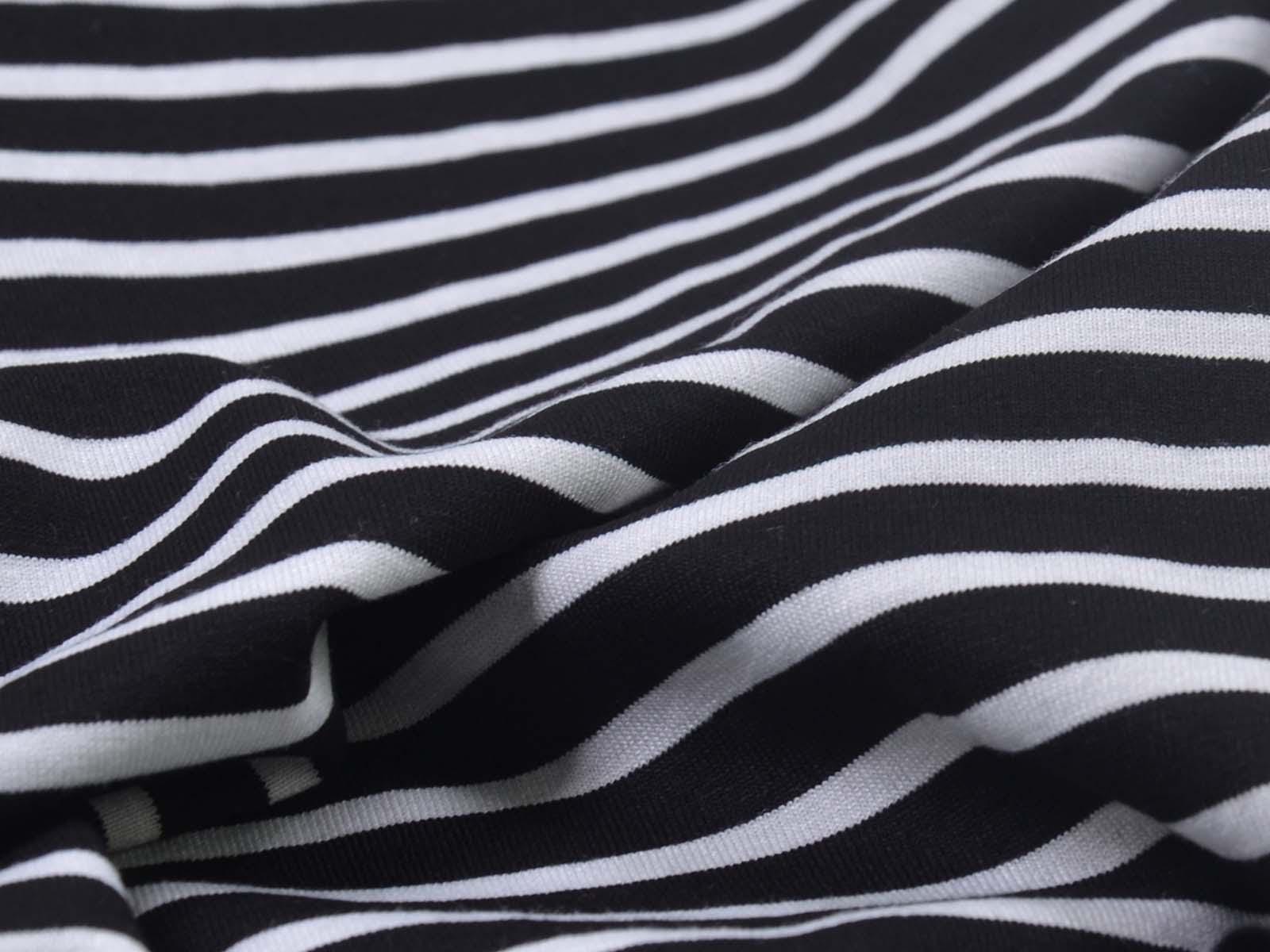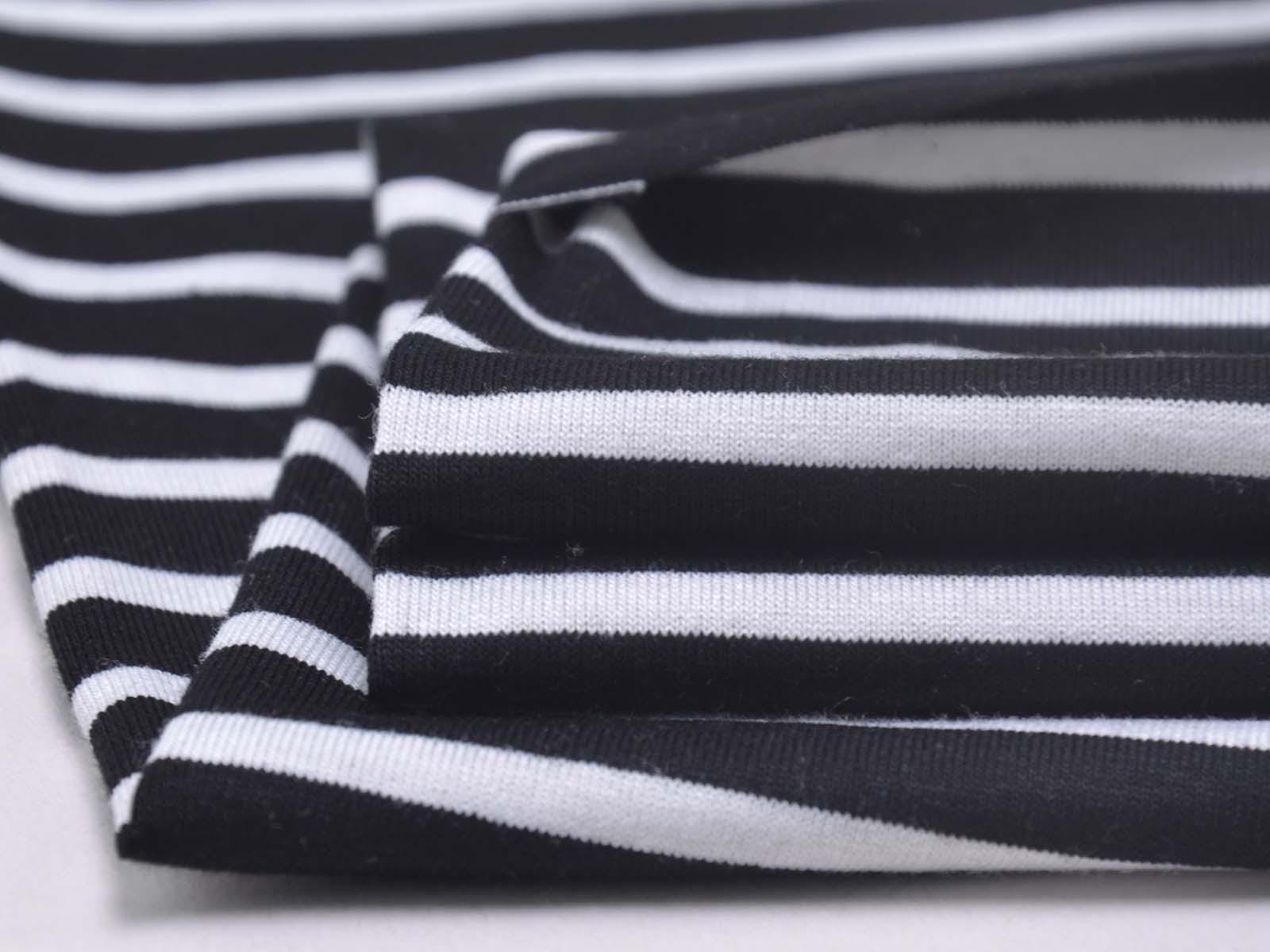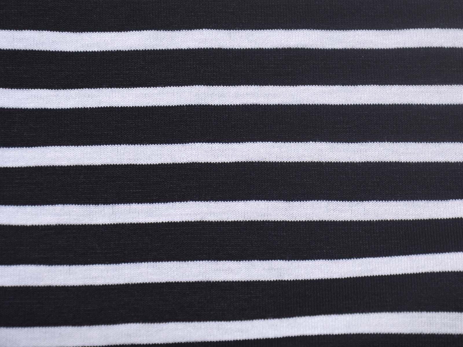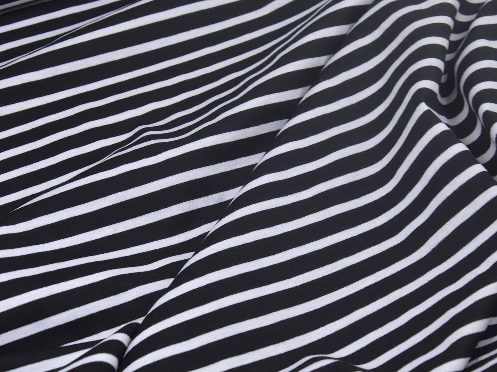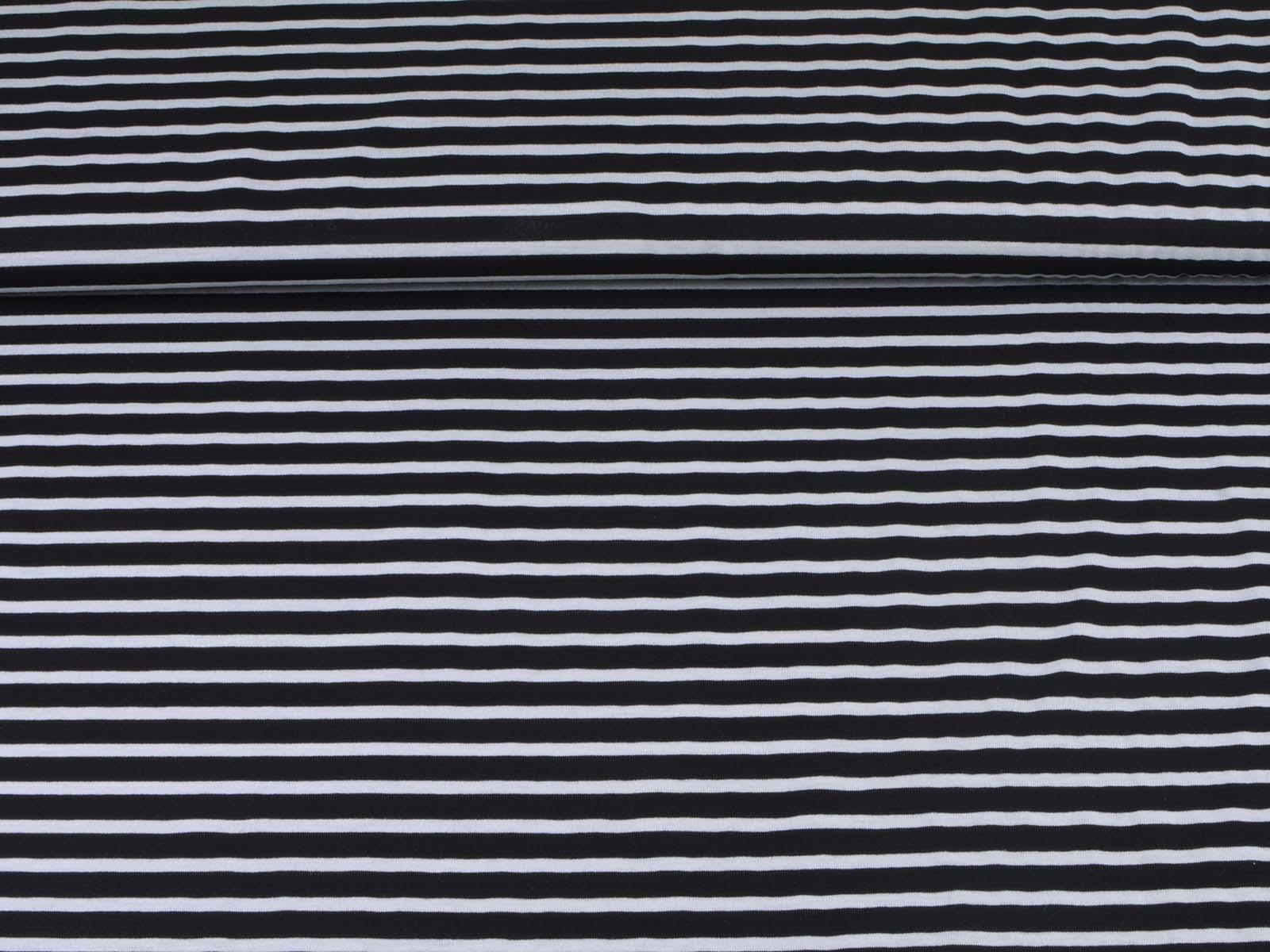 Schöner Jersey mit weißen und schwarzen Streifen aus Baumwolle. Ein weißer Streifen ist ca. 5 mm breit. Der Stoff ist glatt und dünn. Nähe dir aus ihm T-Shirts, Langarmshirts, Bodys, Pumphosen und vieles mehr oder kombiniere ihn mit anderen Stoffen.