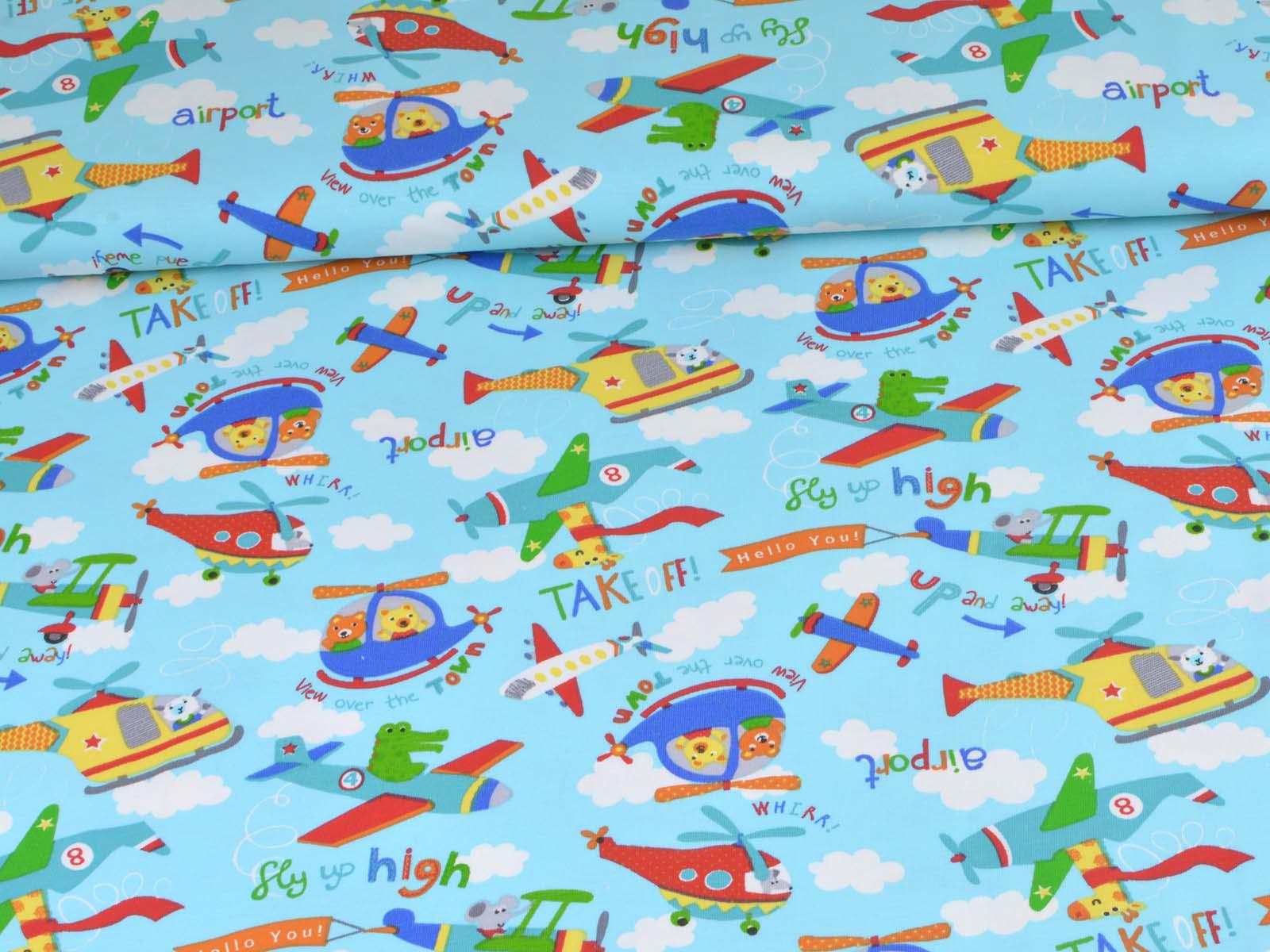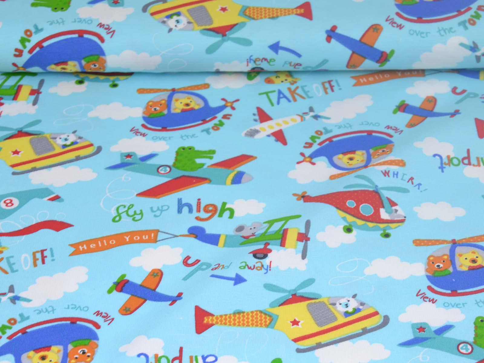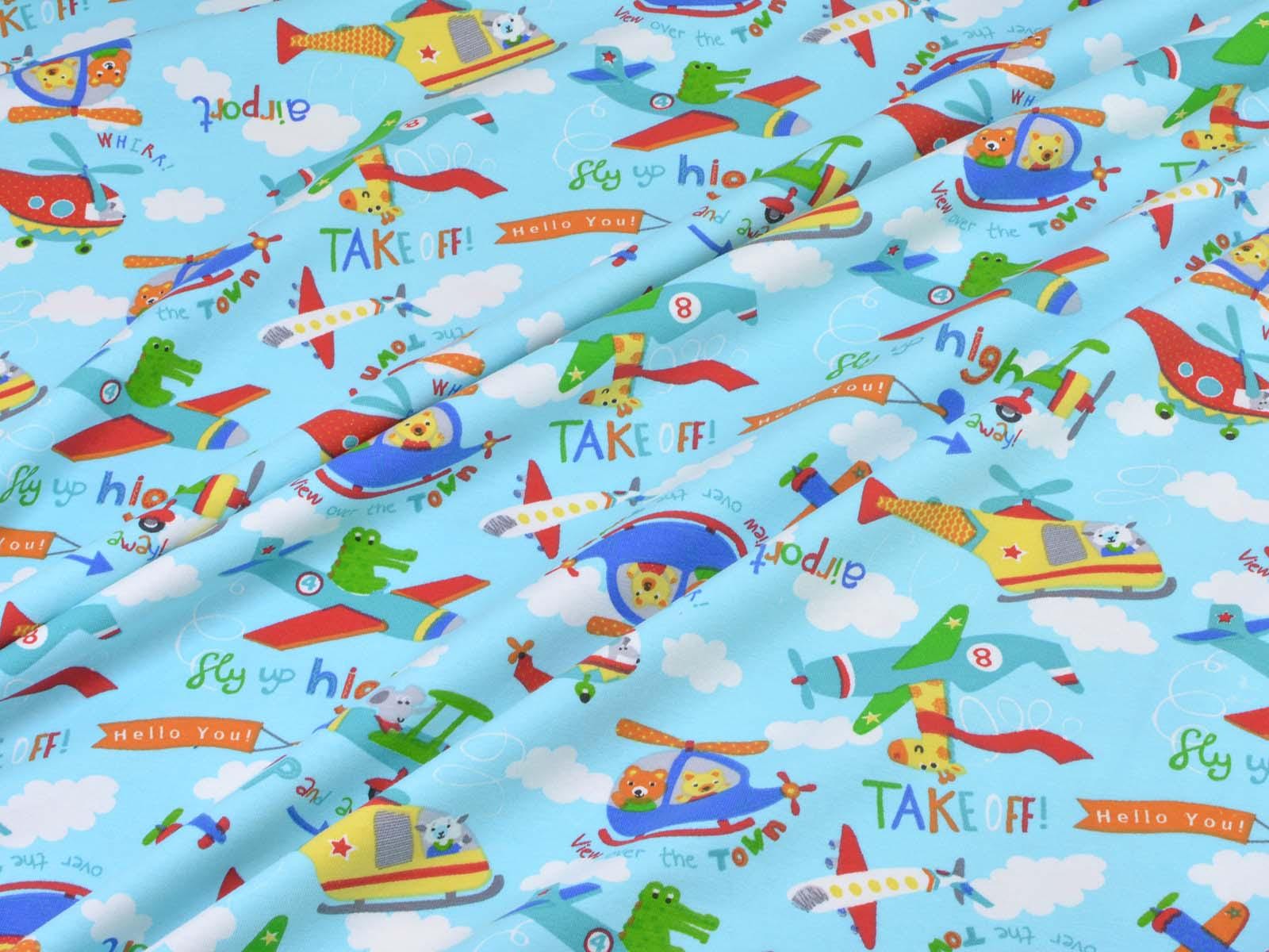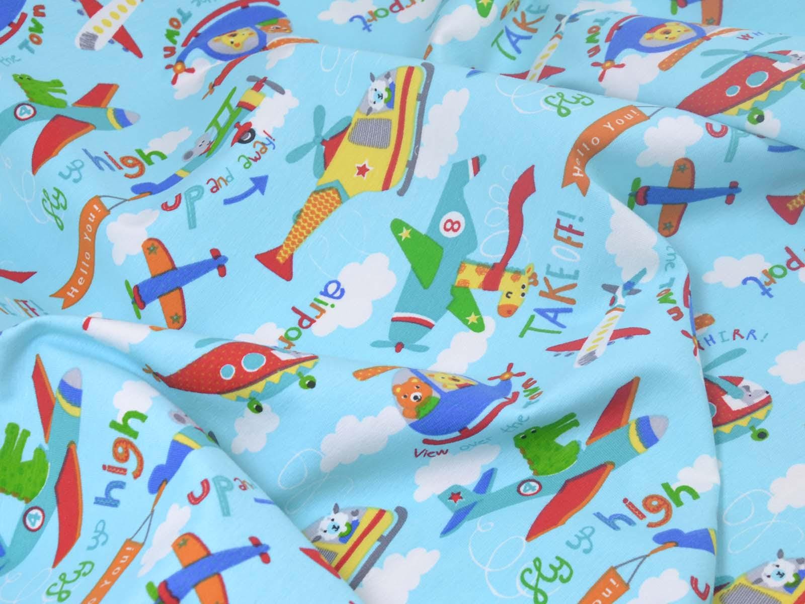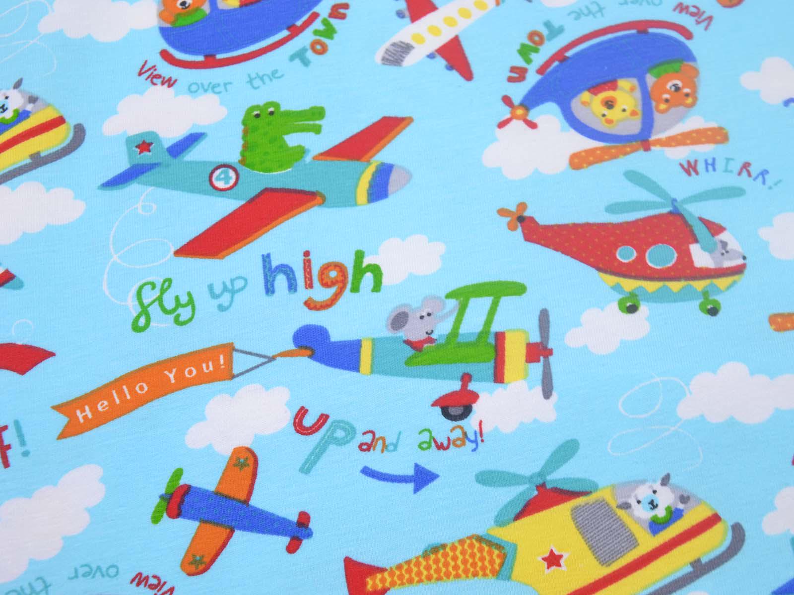 Hellblauer Baumwolljersey mit weißen Wolken, blauen, grünen und roten Flugzeugen und Giraffen, Krokodilen und weiteren Tieren. Ein roter Hubschrauber ist ca 10 cm groß. Der Stoff ist glatt und dünn. Er eignet sich wunderbar zum Nähen von T-Shirts, Kleidern, Röcken, Pumphosen, Bodys und vielem mehr.