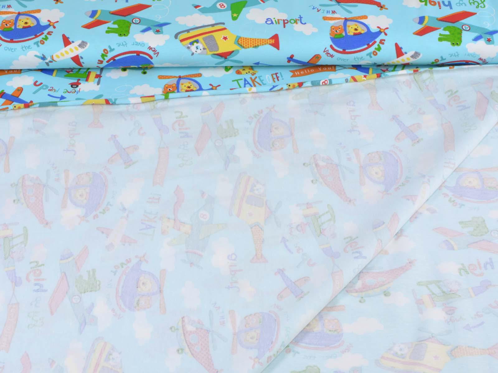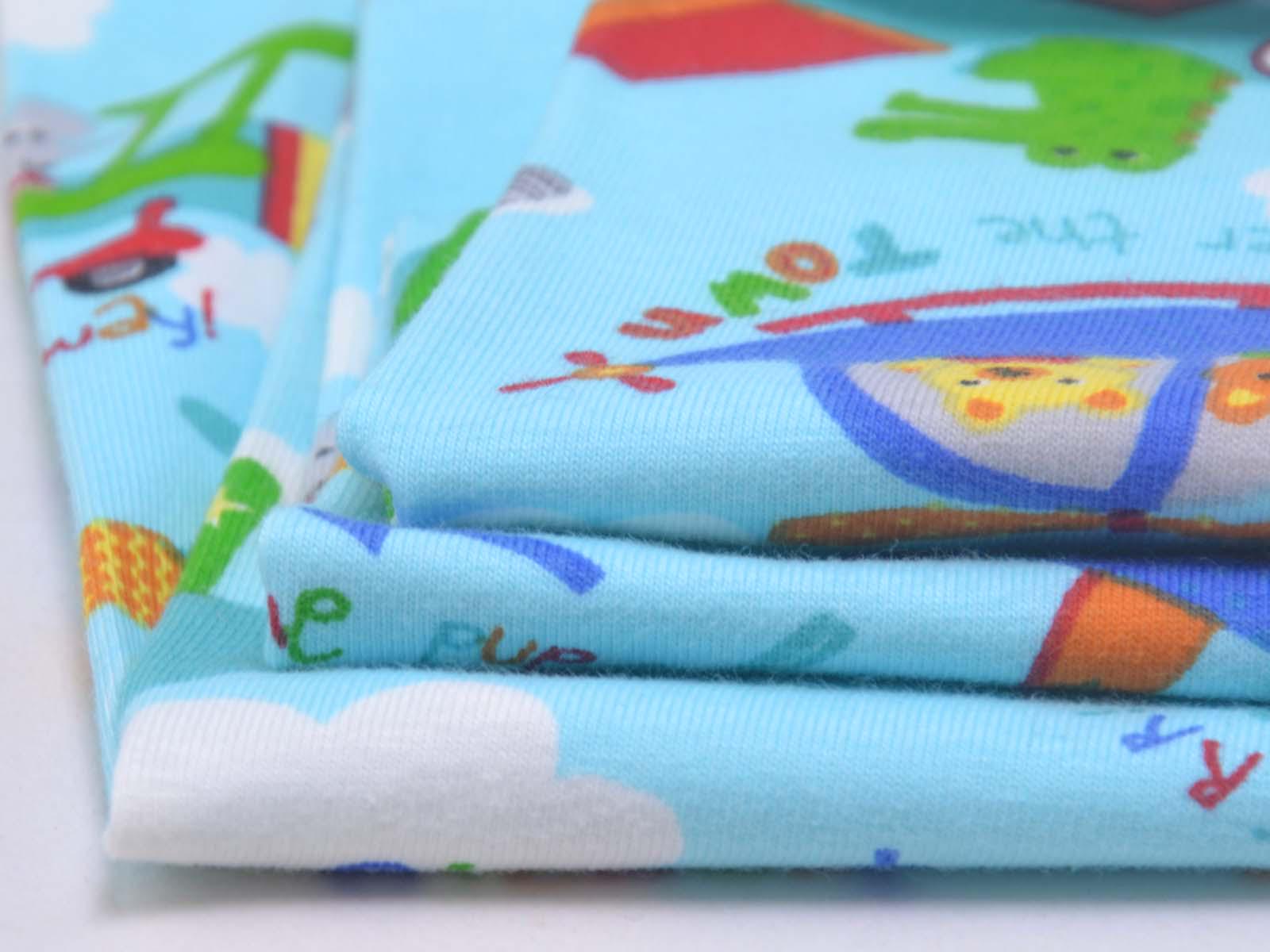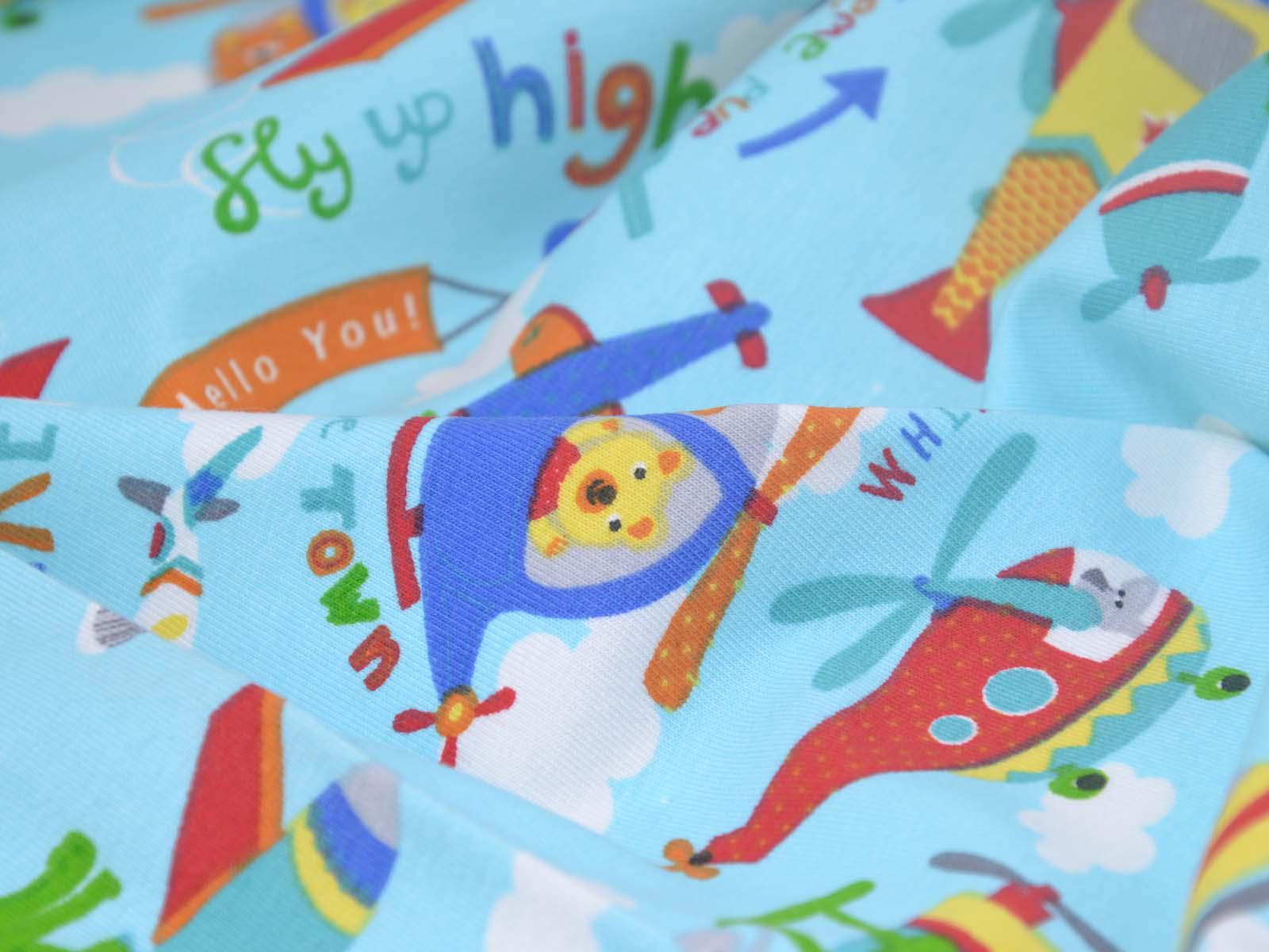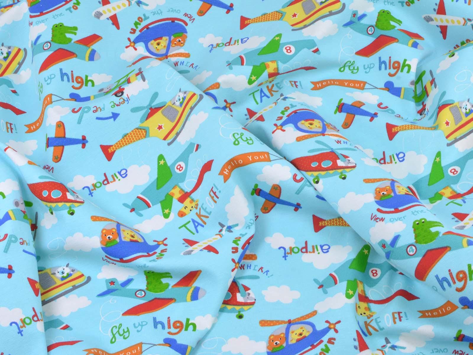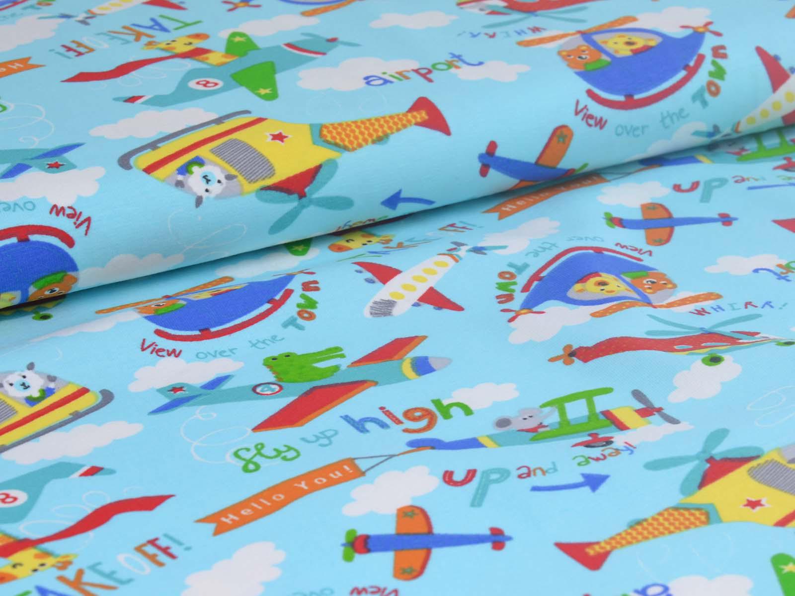 Hellblauer Baumwolljersey mit weißen Wolken, blauen, grünen und roten Flugzeugen und Giraffen, Krokodilen und weiteren Tieren. Ein roter Hubschrauber ist ca 10 cm groß. Der Stoff ist glatt und dünn. Er eignet sich wunderbar zum Nähen von T-Shirts, Kleidern, Röcken, Pumphosen, Bodys und vielem mehr.