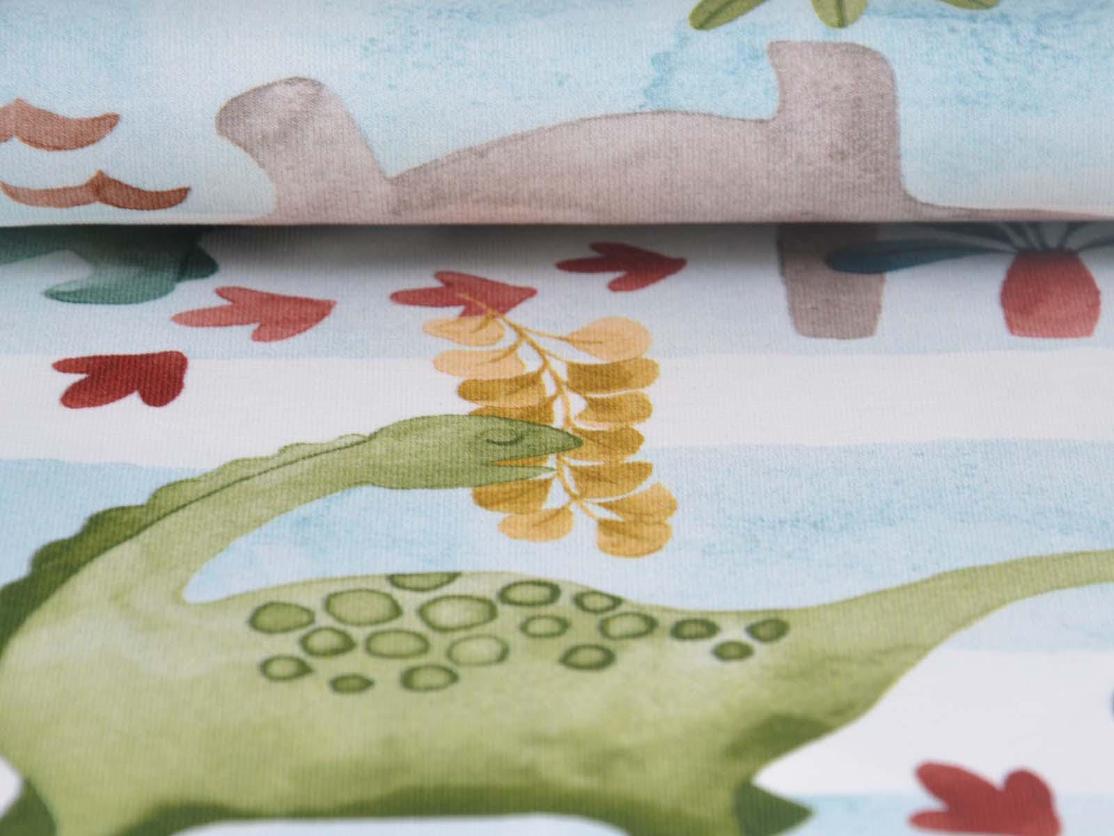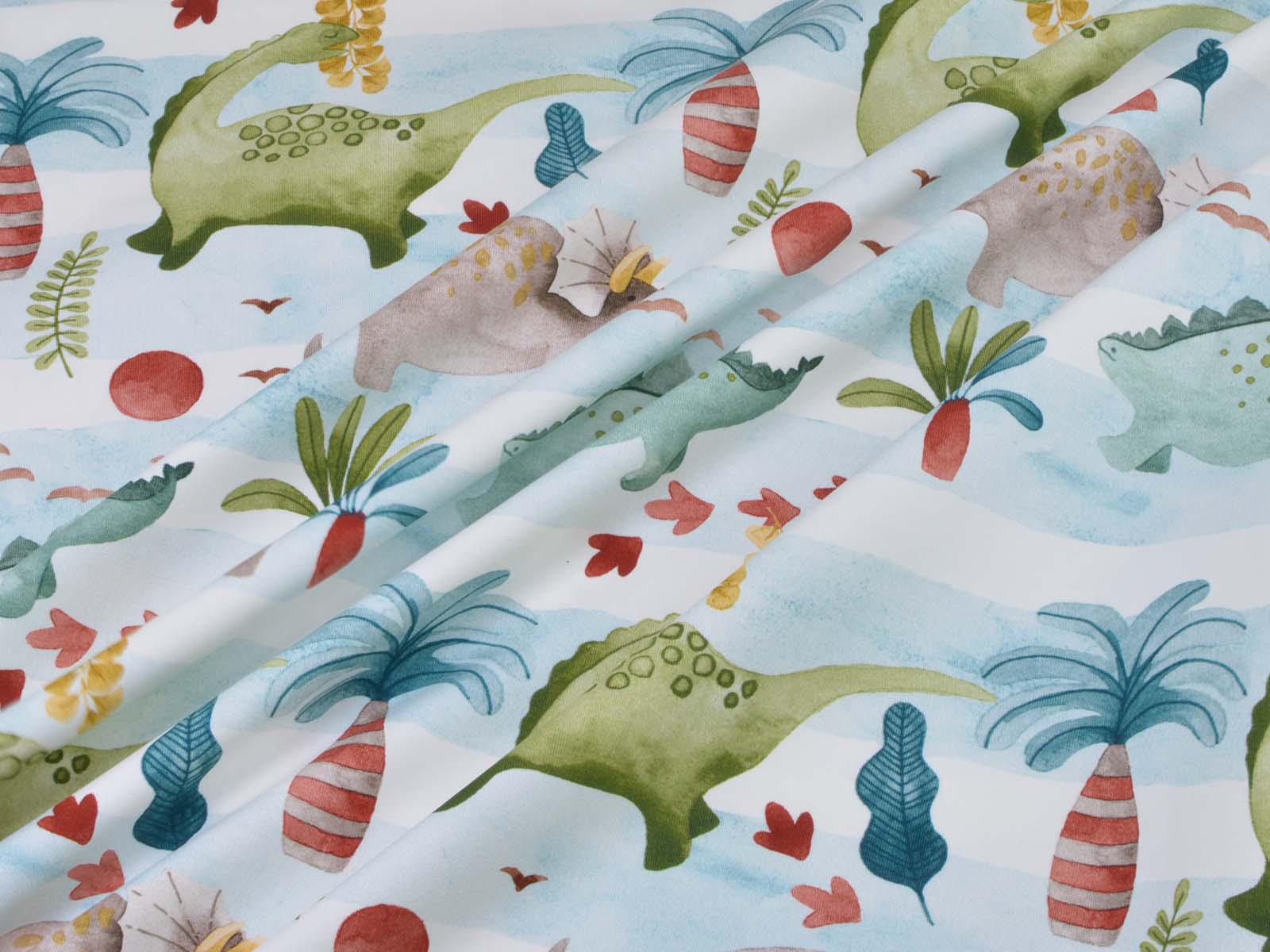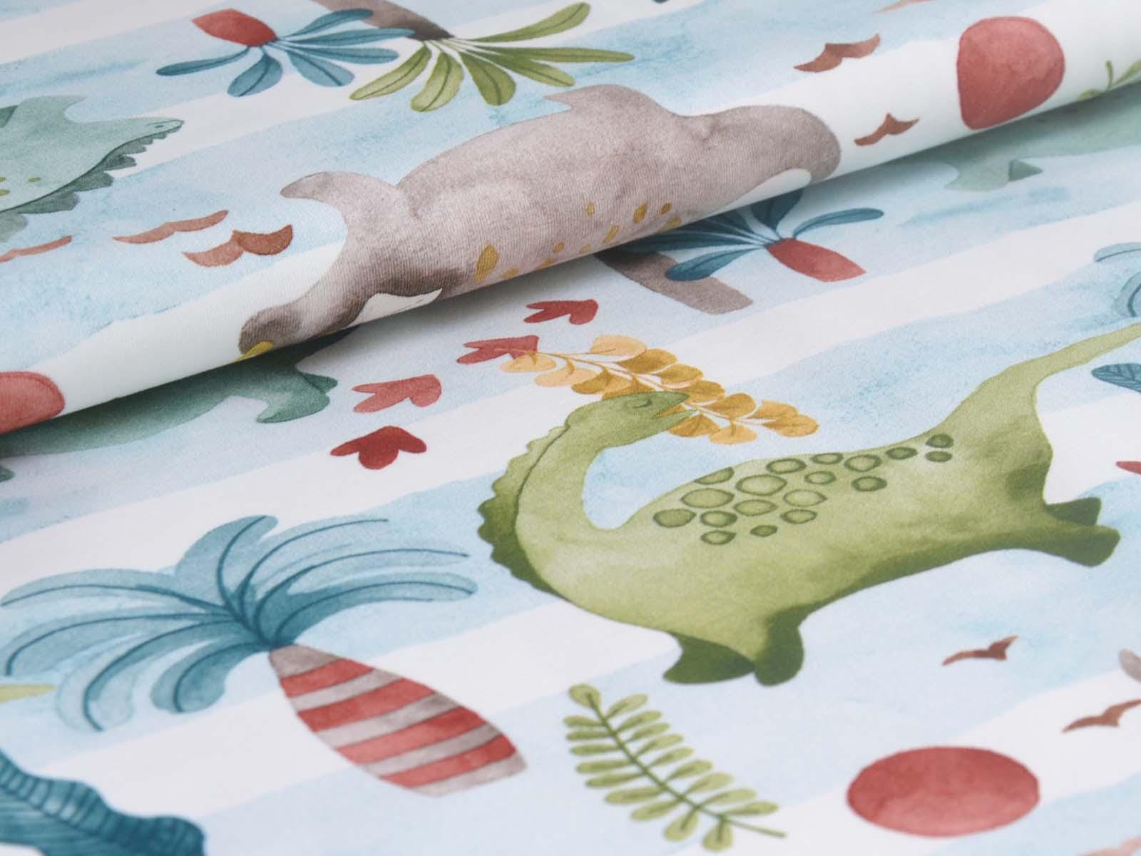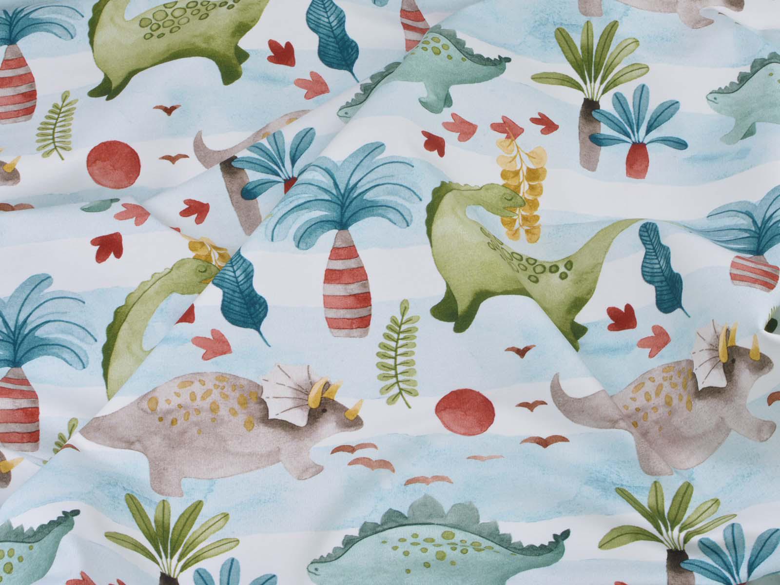 Weißer Baumwolljersey mit grünen, blauen und grauen Dinosauriern und mehrfarbigen Palmen. Ein blauer Dino ist etwa 12 cm lang. Der Stoff ist glatt und dünn. Er eignet sich wunderbar zum Nähen von T-Shirts, Pumphosen, Bodys und vielem mehr.