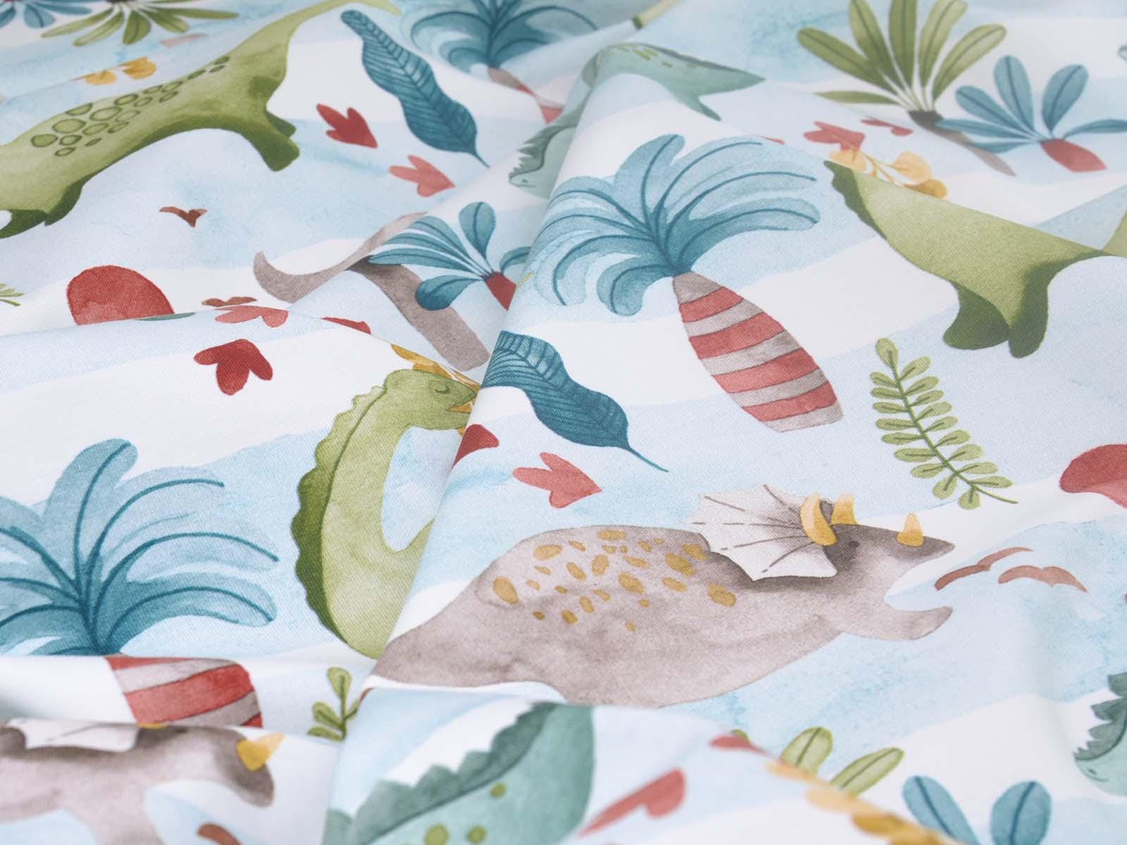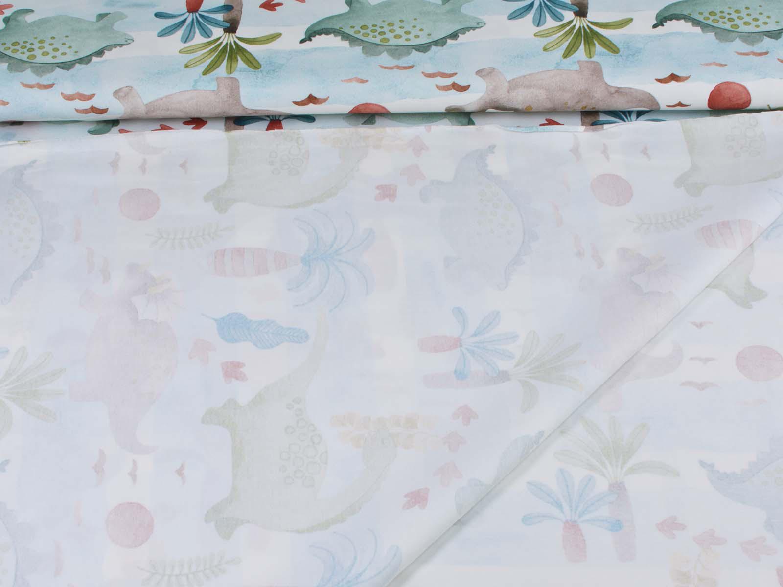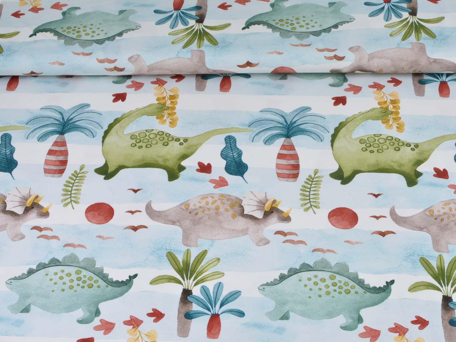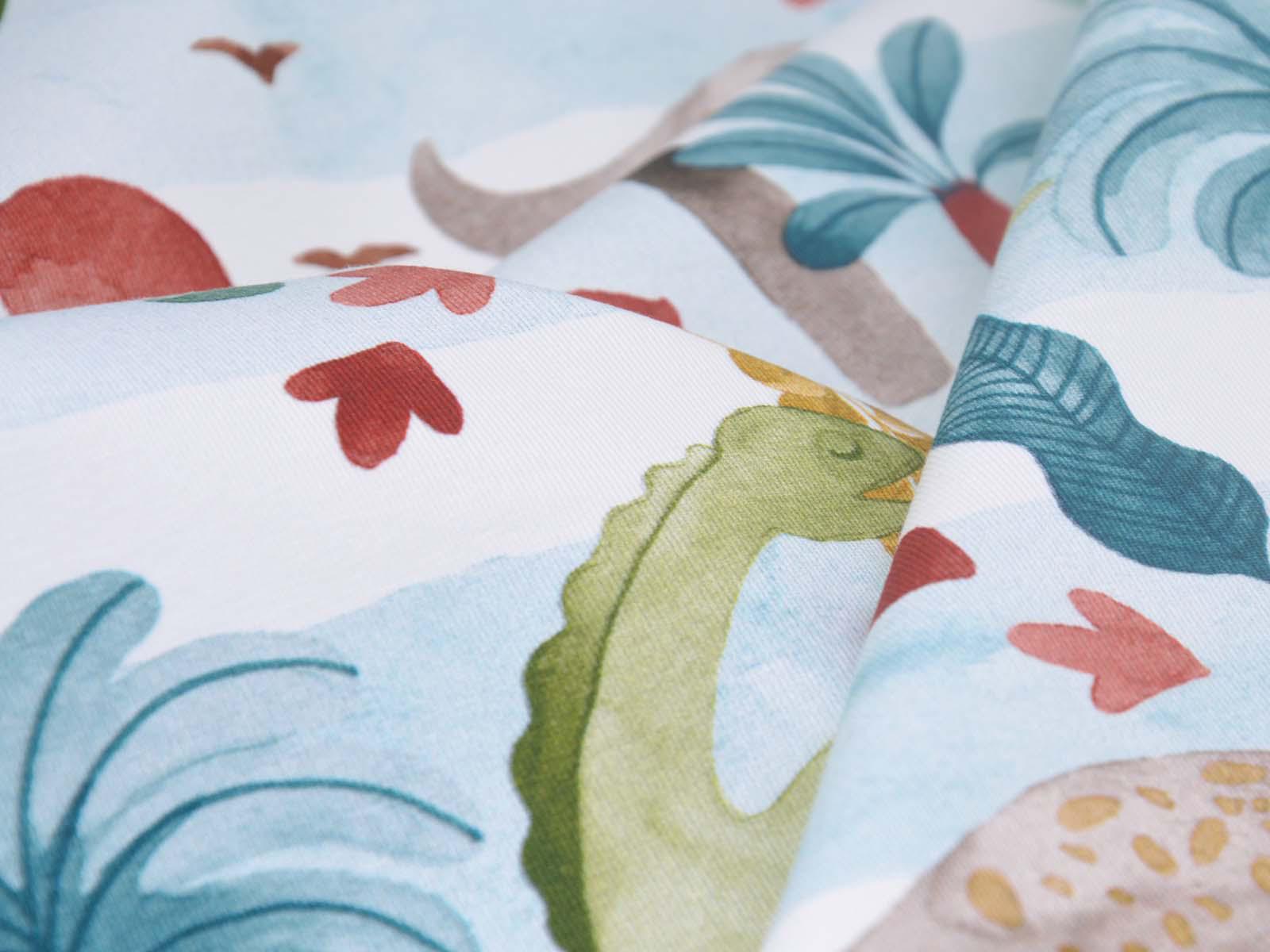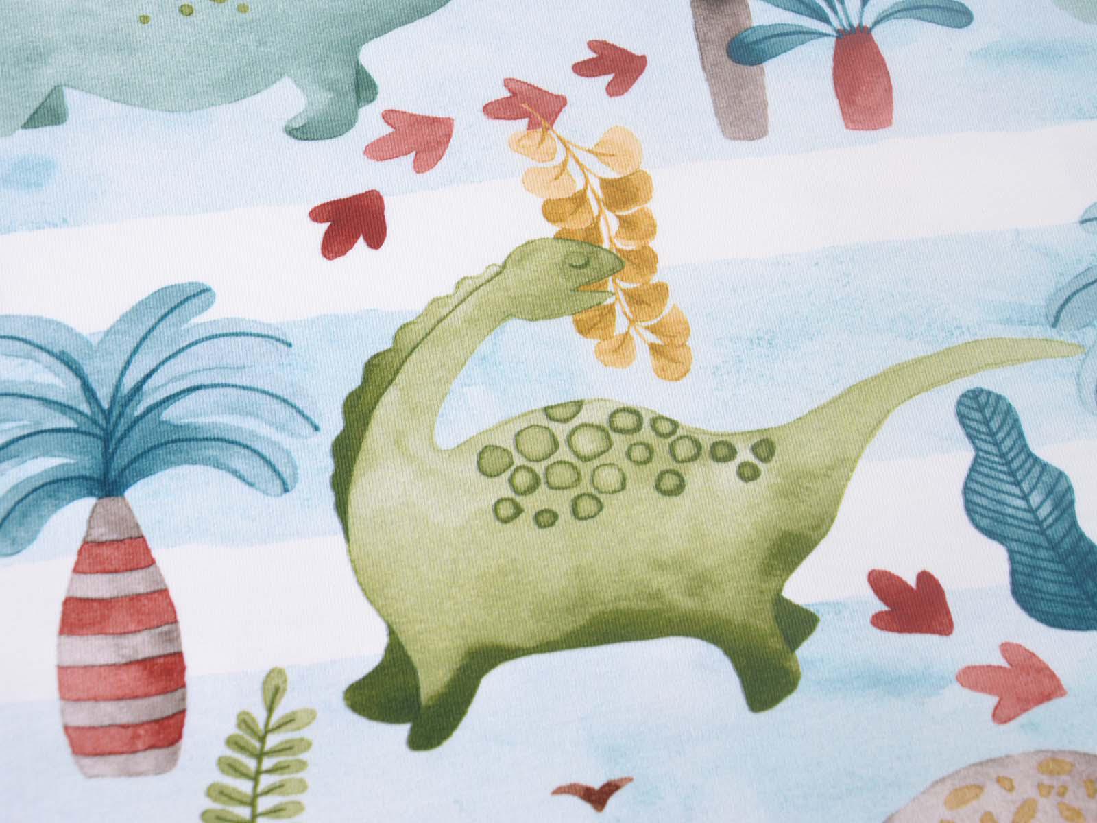 Weißer Baumwolljersey mit grünen, blauen und grauen Dinosauriern und mehrfarbigen Palmen. Ein blauer Dino ist etwa 12 cm lang. Der Stoff ist glatt und dünn. Er eignet sich wunderbar zum Nähen von T-Shirts, Pumphosen, Bodys und vielem mehr.