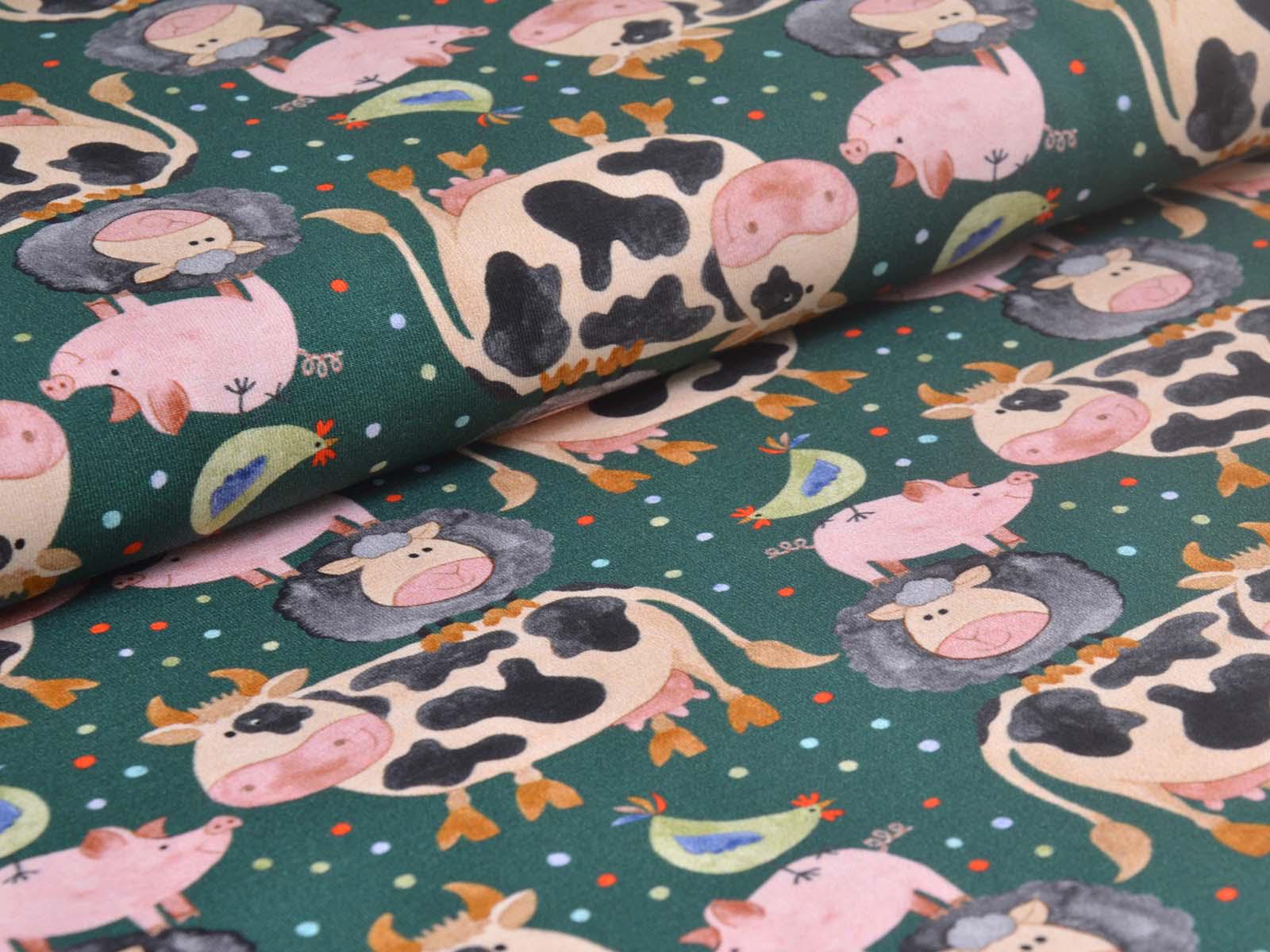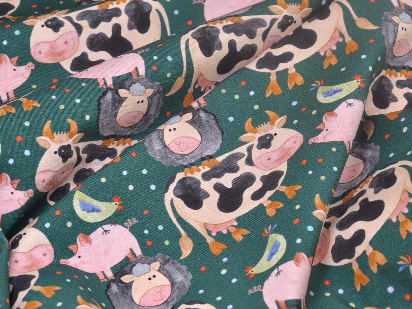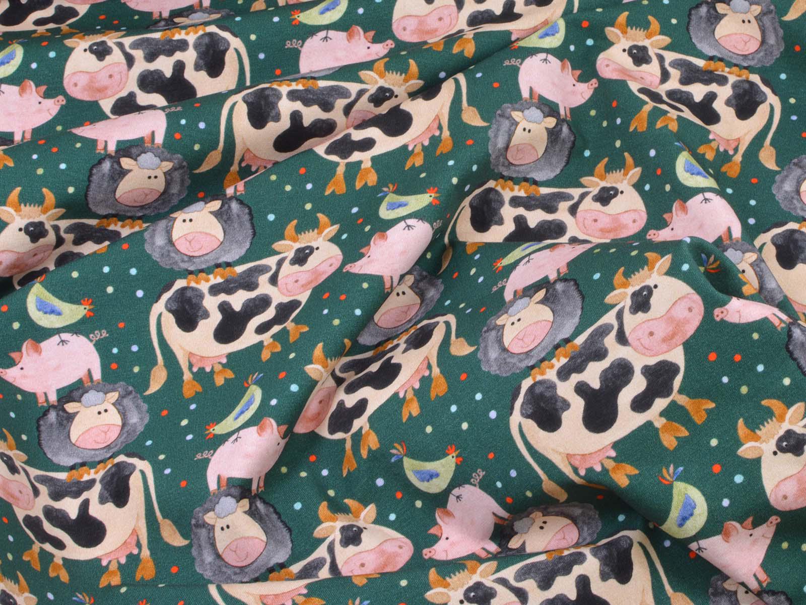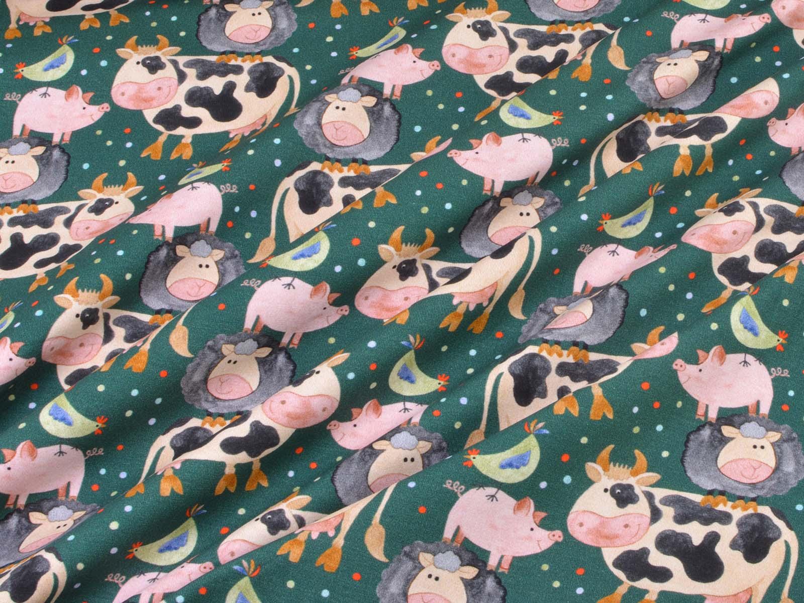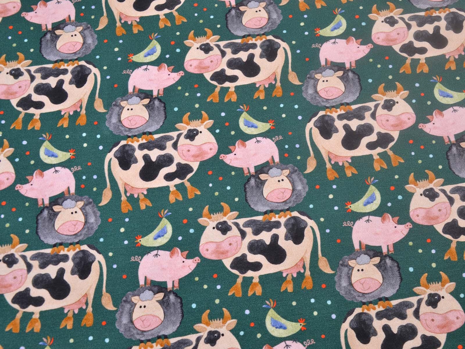 Hochwertiger Jersey aus Baumwolle von Hilco. Der Stoff ist grün mit Kühen, Schweinen, Schafen und Hühnern. Eine Kuh ist ca. 7 cm hoch. Der Stoff ist glatt, mittelschwer und angenehm auf der Haut. Er eignet sich zum Nähen von Kleidern, Röcken, T-Shirts, Leggings, Langarmshirts und vielem mehr.
