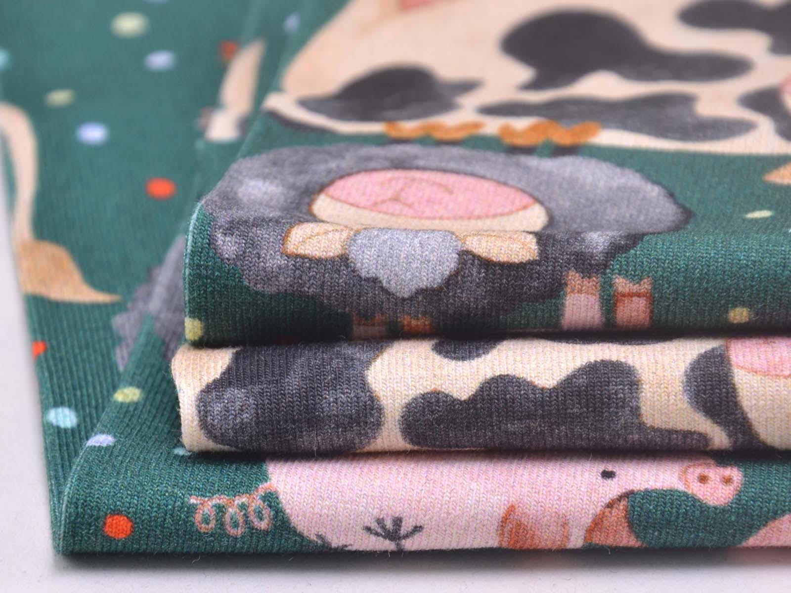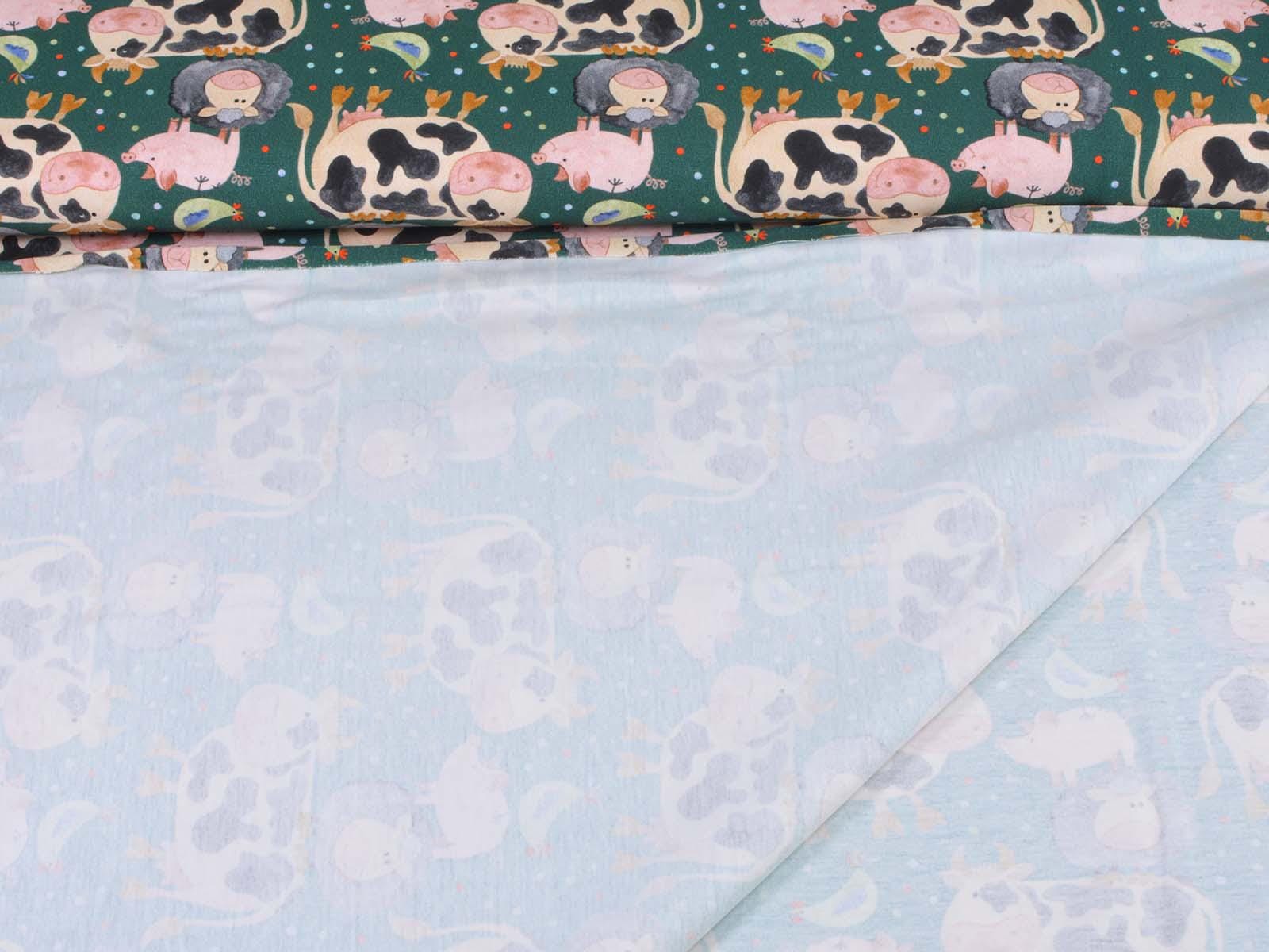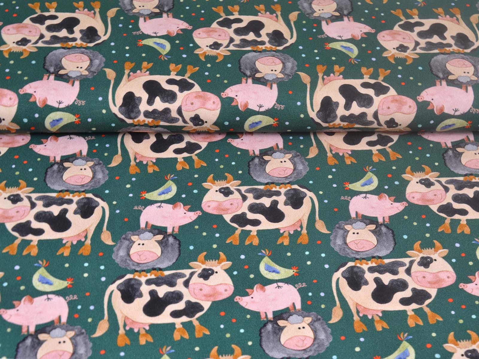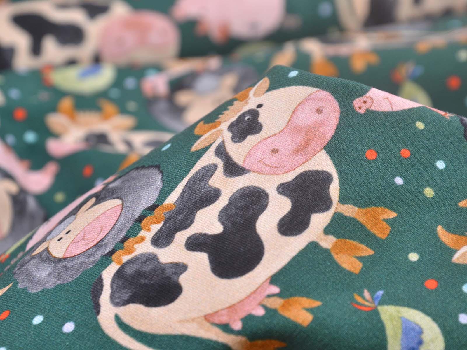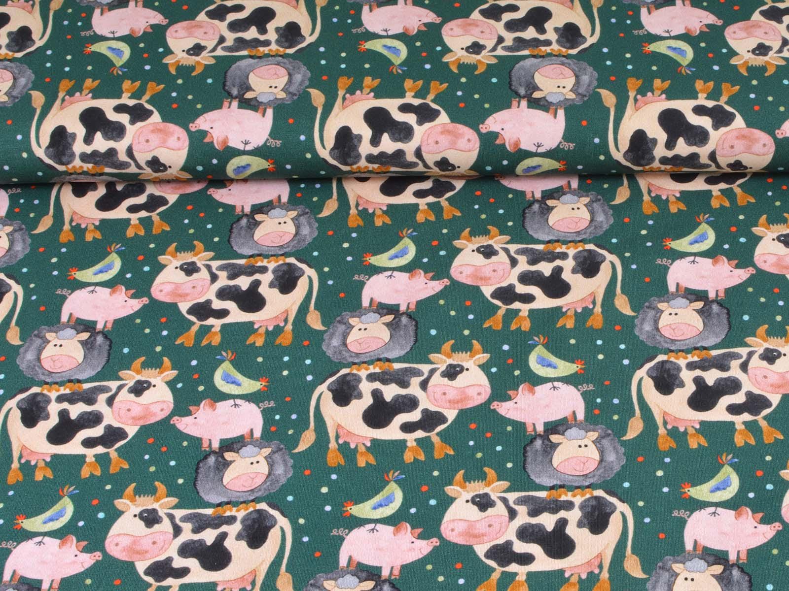 Hochwertiger Jersey aus Baumwolle von Hilco. Der Stoff ist grün mit Kühen, Schweinen, Schafen und Hühnern. Eine Kuh ist ca. 7 cm hoch. Der Stoff ist glatt, mittelschwer und angenehm auf der Haut. Er eignet sich zum Nähen von Kleidern, Röcken, T-Shirts, Leggings, Langarmshirts und vielem mehr.