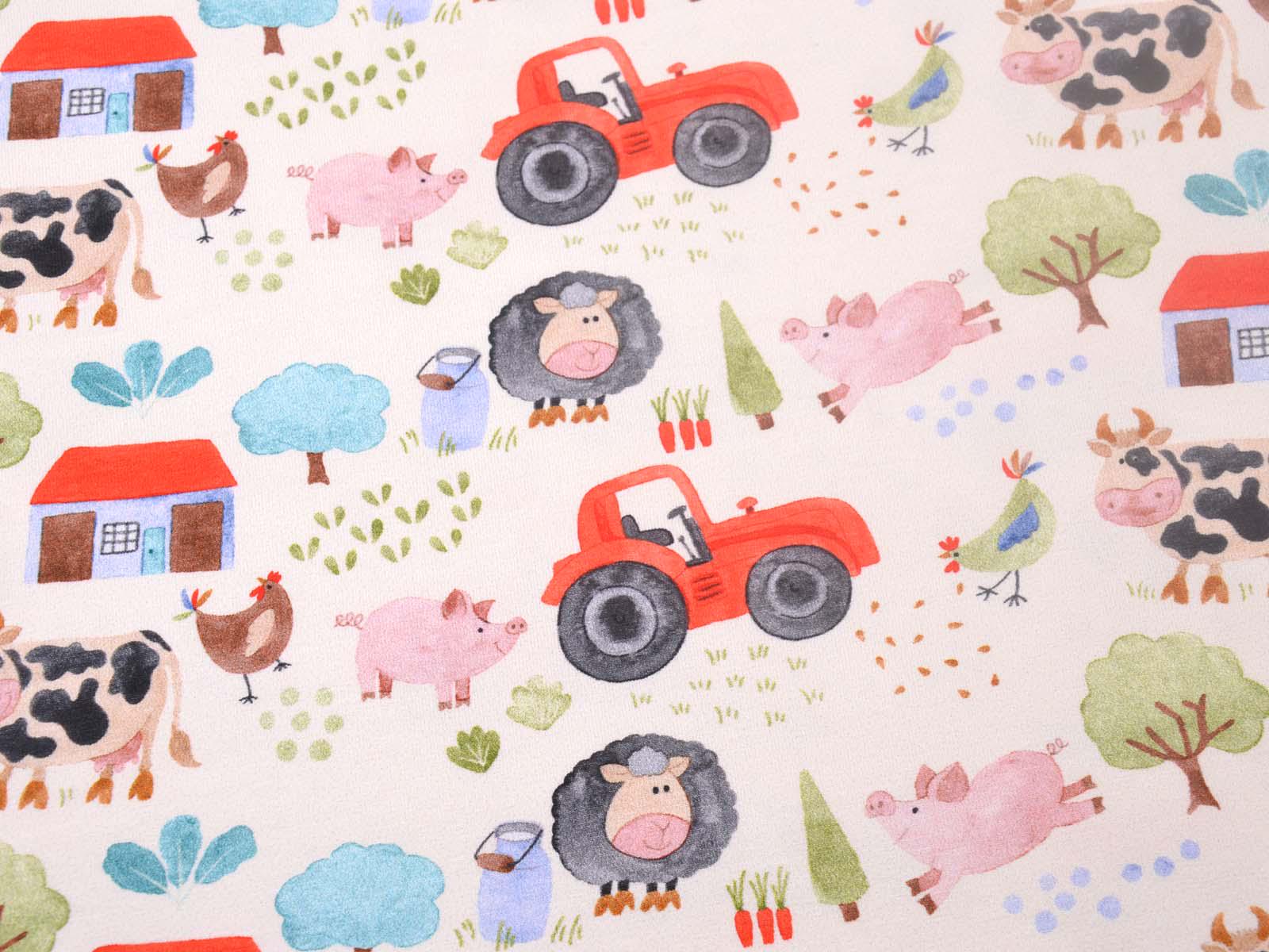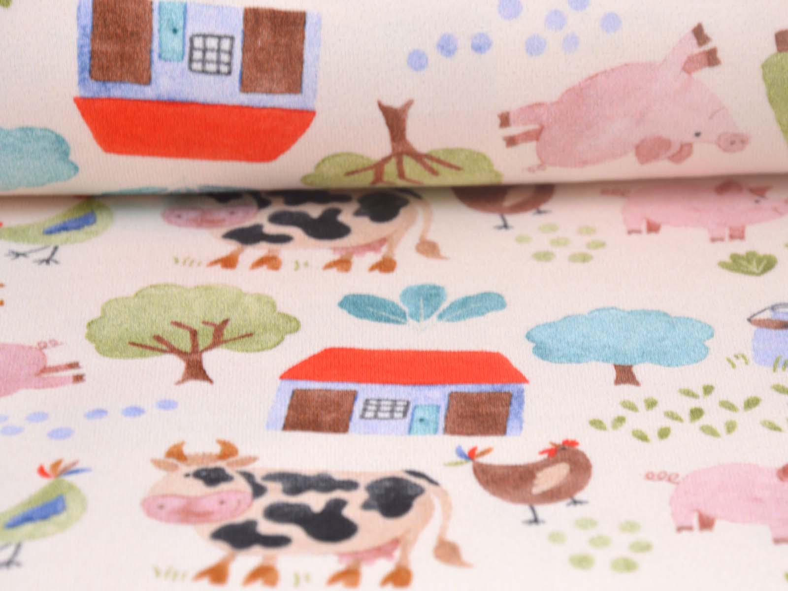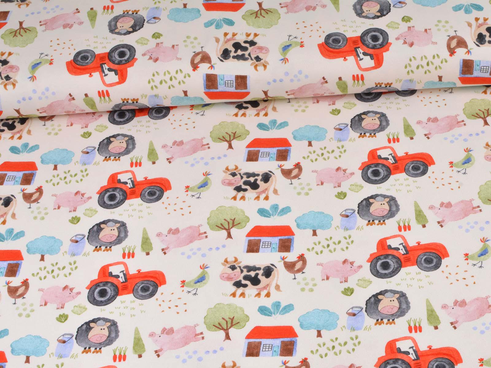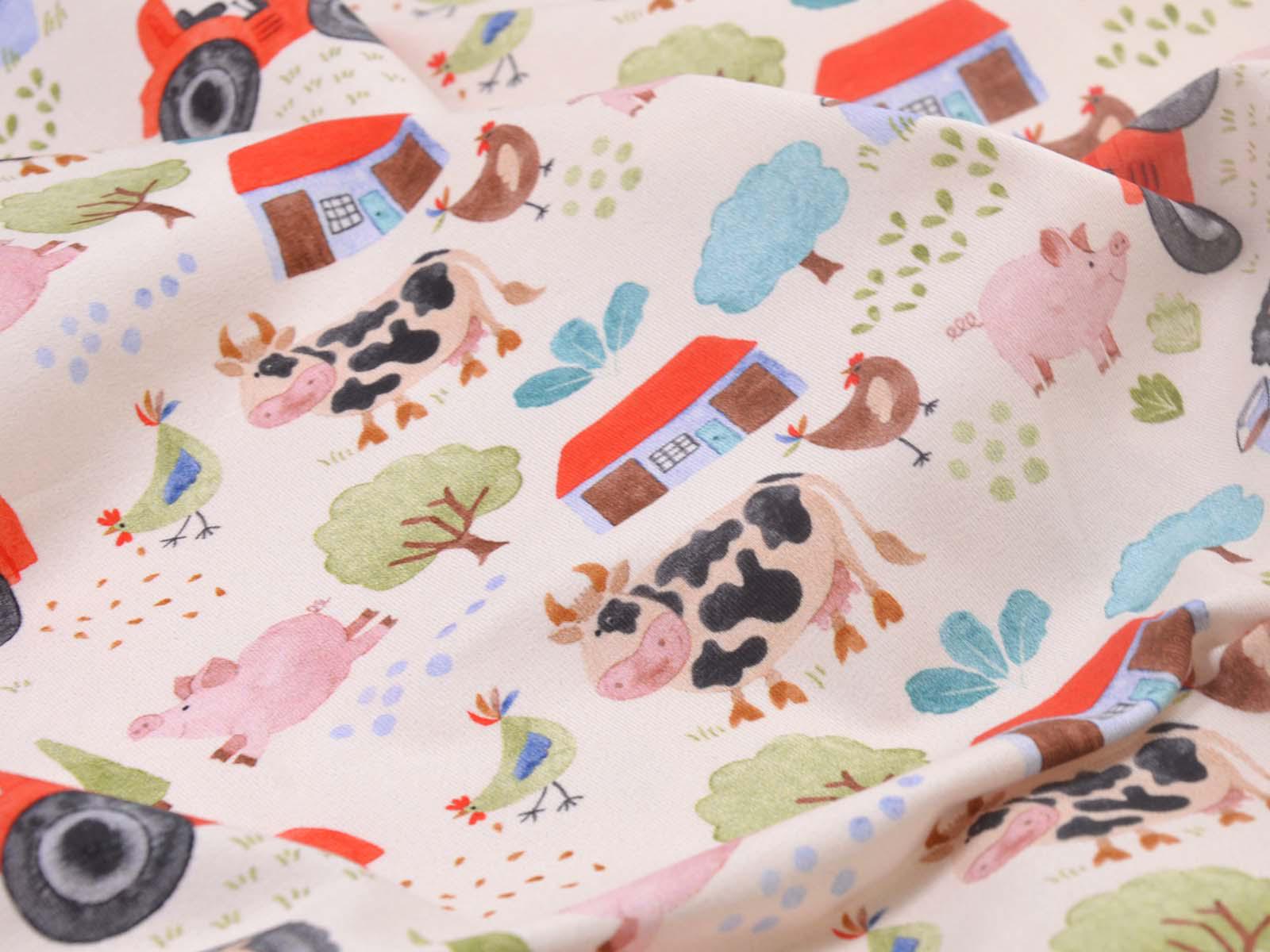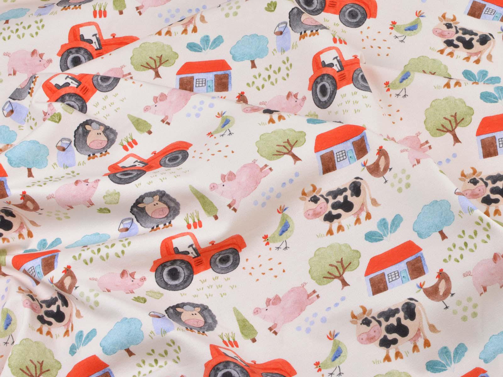 Hochwertiger Jersey aus Baumwolle mit Bauernhof-Motiven von Hilco. Der Stoff ist creme-weiß mit Kühen, Schweinen, Schafen, Hühnern, Traktoren und Häusern. Eine Kuh ist ca. 4 cm hoch. Der Stoff ist glatt, mittelschwer und angenehm auf der Haut. Er eignet sich zum Nähen von Kleidern, Röcken, T-Shirts, Leggings, Langarmshirts und vielem mehr.