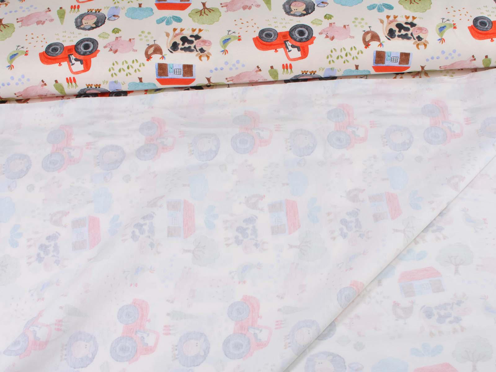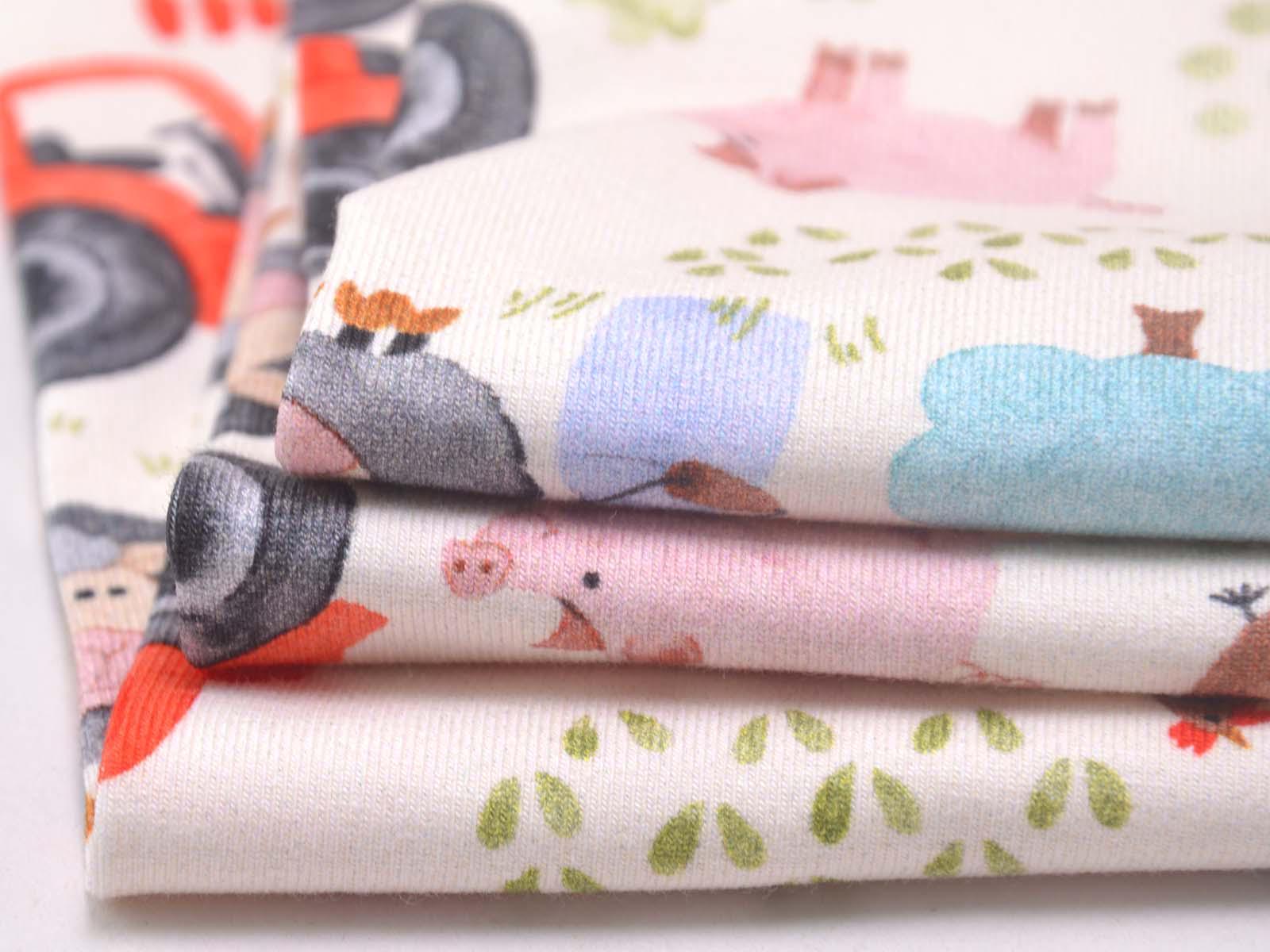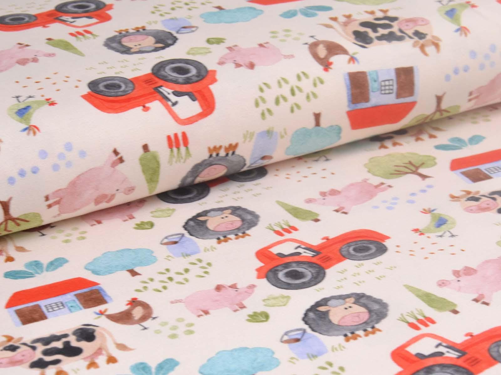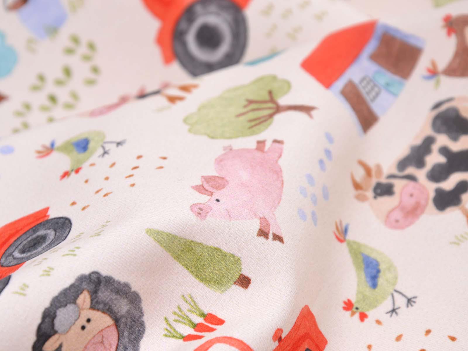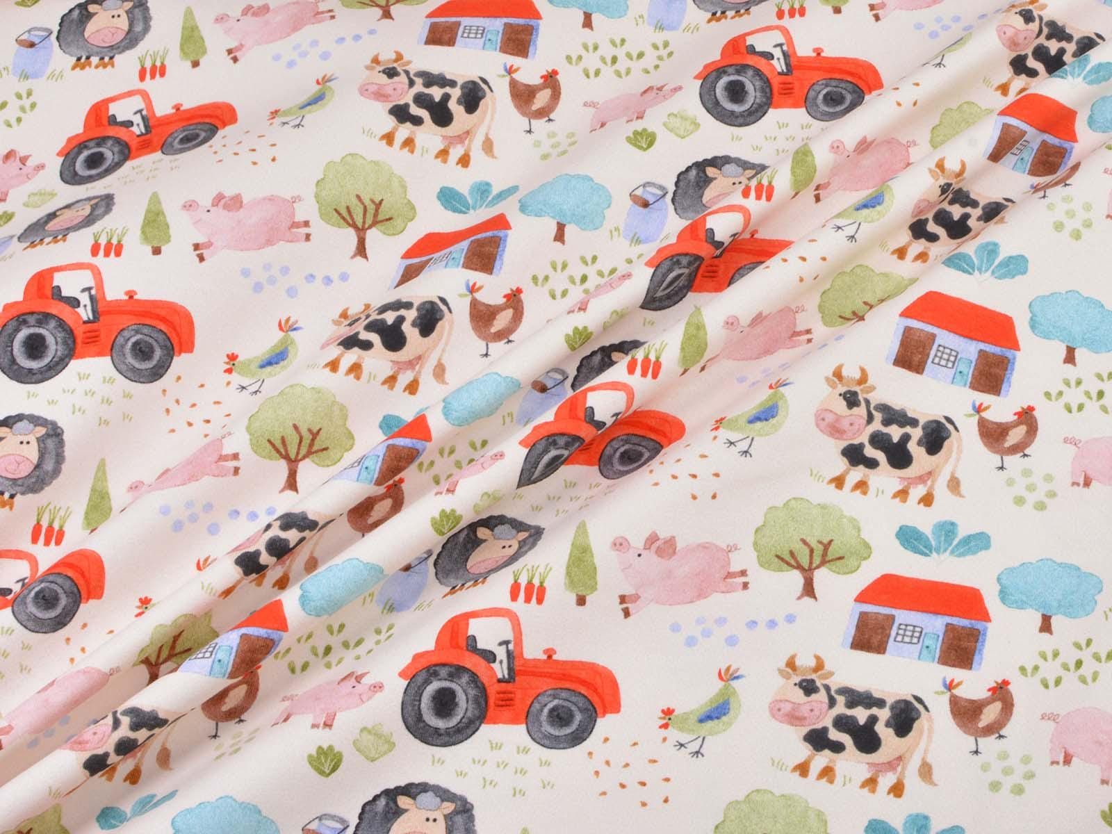 Hochwertiger Jersey aus Baumwolle mit Bauernhof-Motiven von Hilco. Der Stoff ist creme-weiß mit Kühen, Schweinen, Schafen, Hühnern, Traktoren und Häusern. Eine Kuh ist ca. 4 cm hoch. Der Stoff ist glatt, mittelschwer und angenehm auf der Haut. Er eignet sich zum Nähen von Kleidern, Röcken, T-Shirts, Leggings, Langarmshirts und vielem mehr.