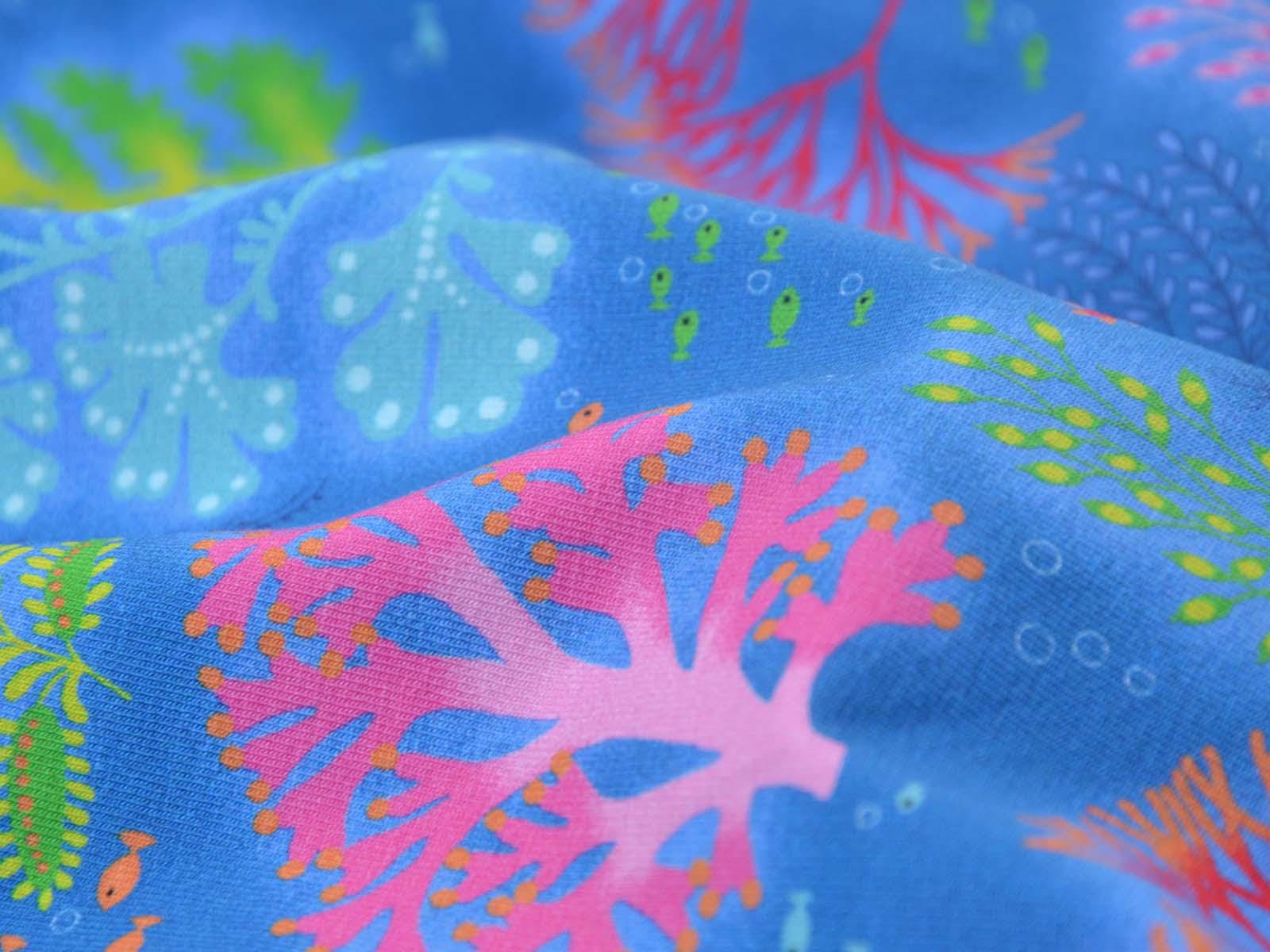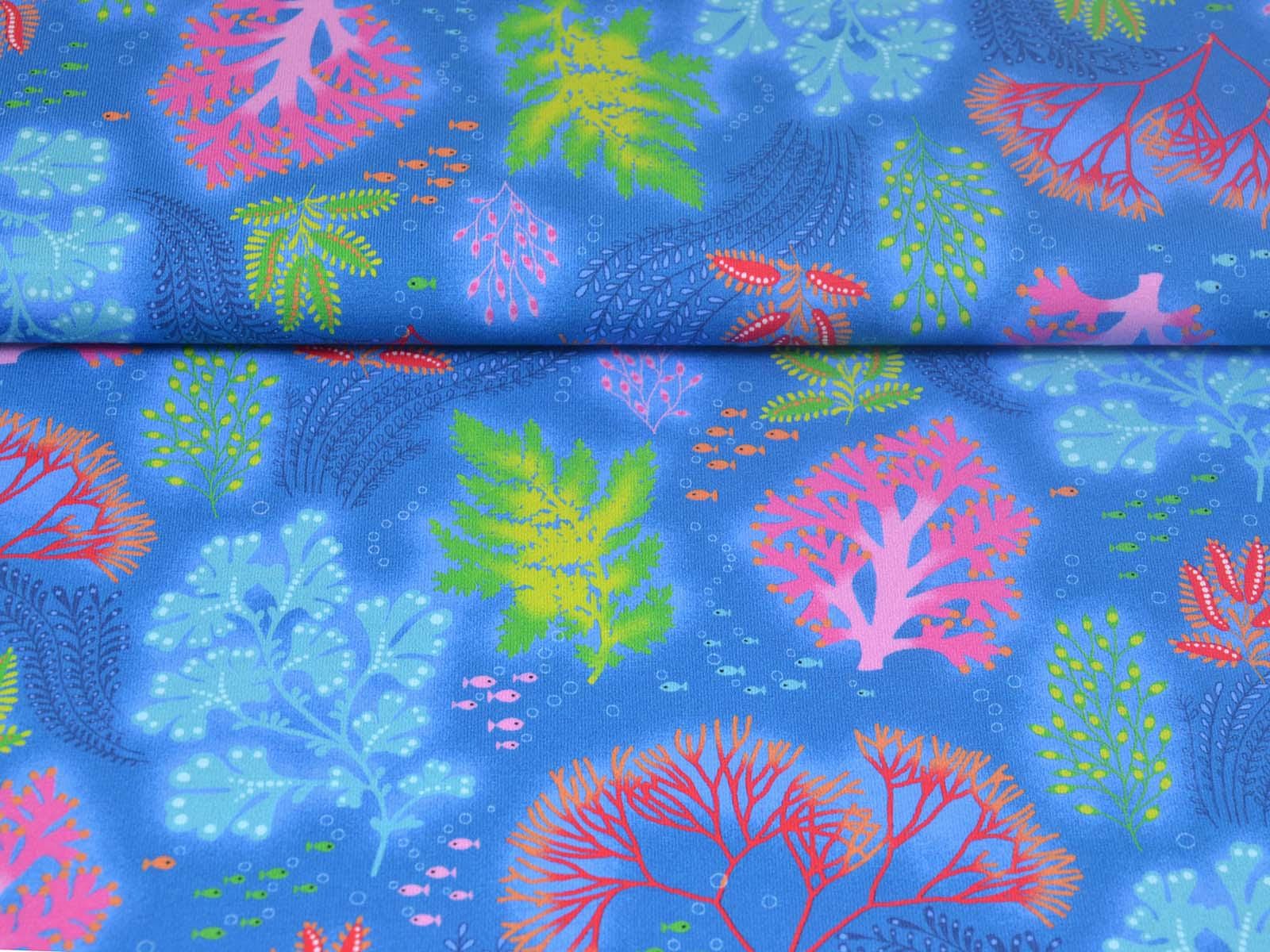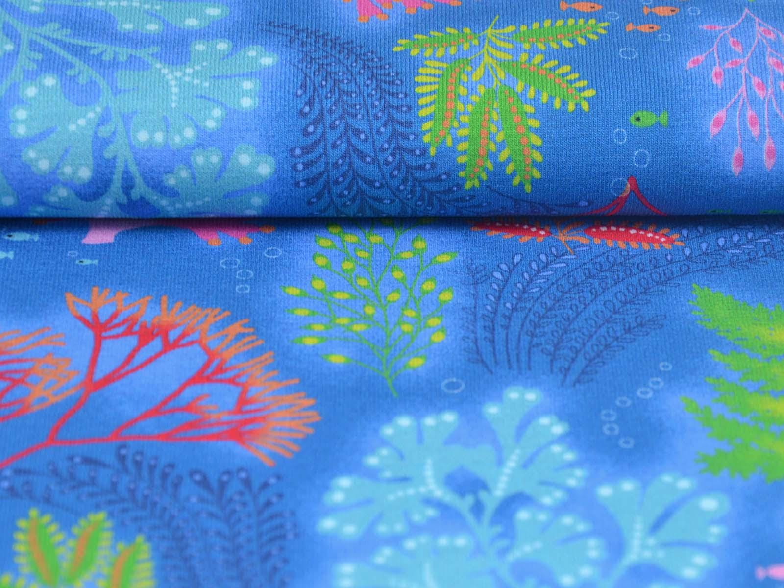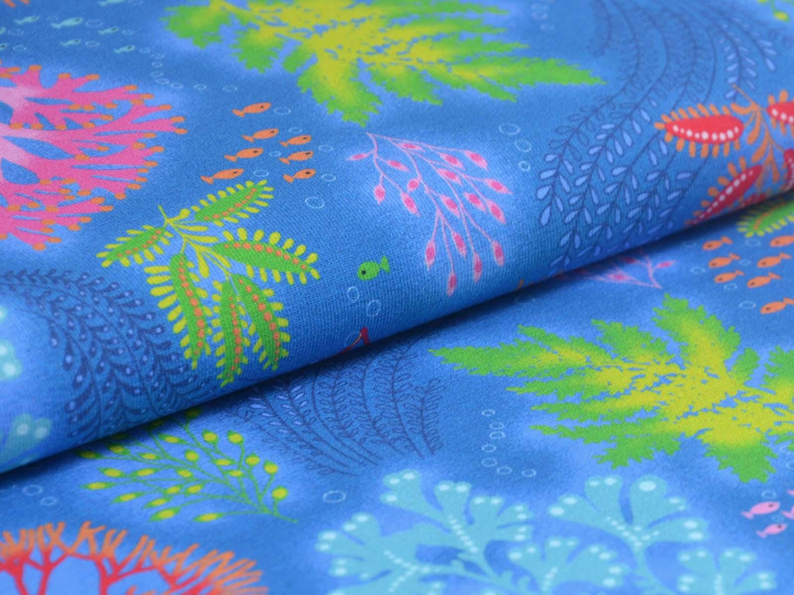 Baumwolljersey in blau mit grünen, blauen und rosanen Meerespflanzen. Der Stoff ist glatt und dünn. Er eignet sich wunderbar zum Nähen von Pumphosen, Bodys, T-Shirts, Shorts und vielem mehr.