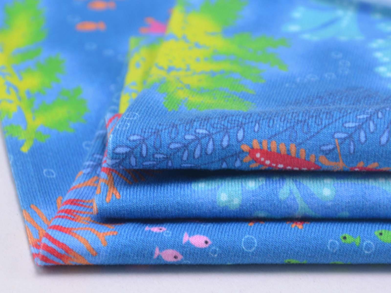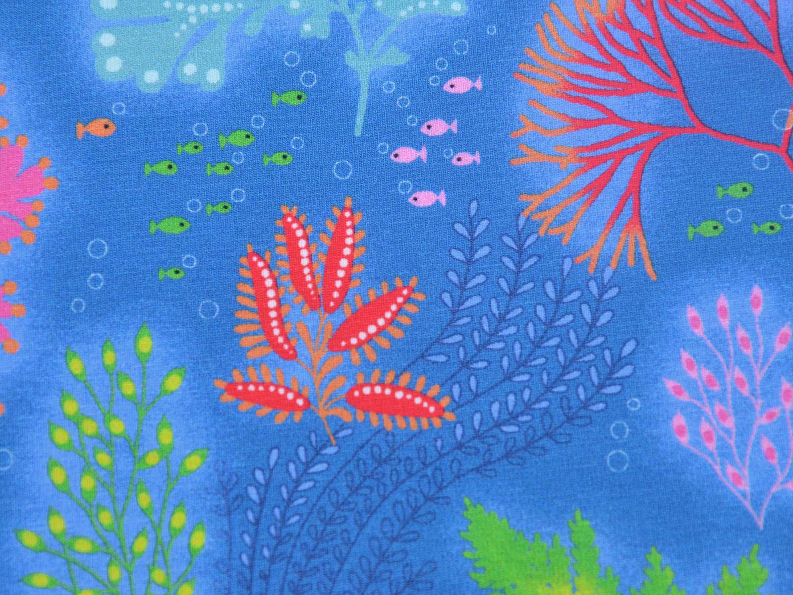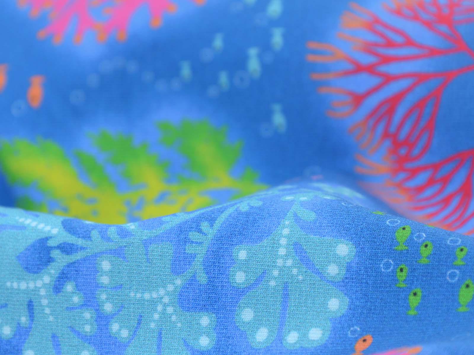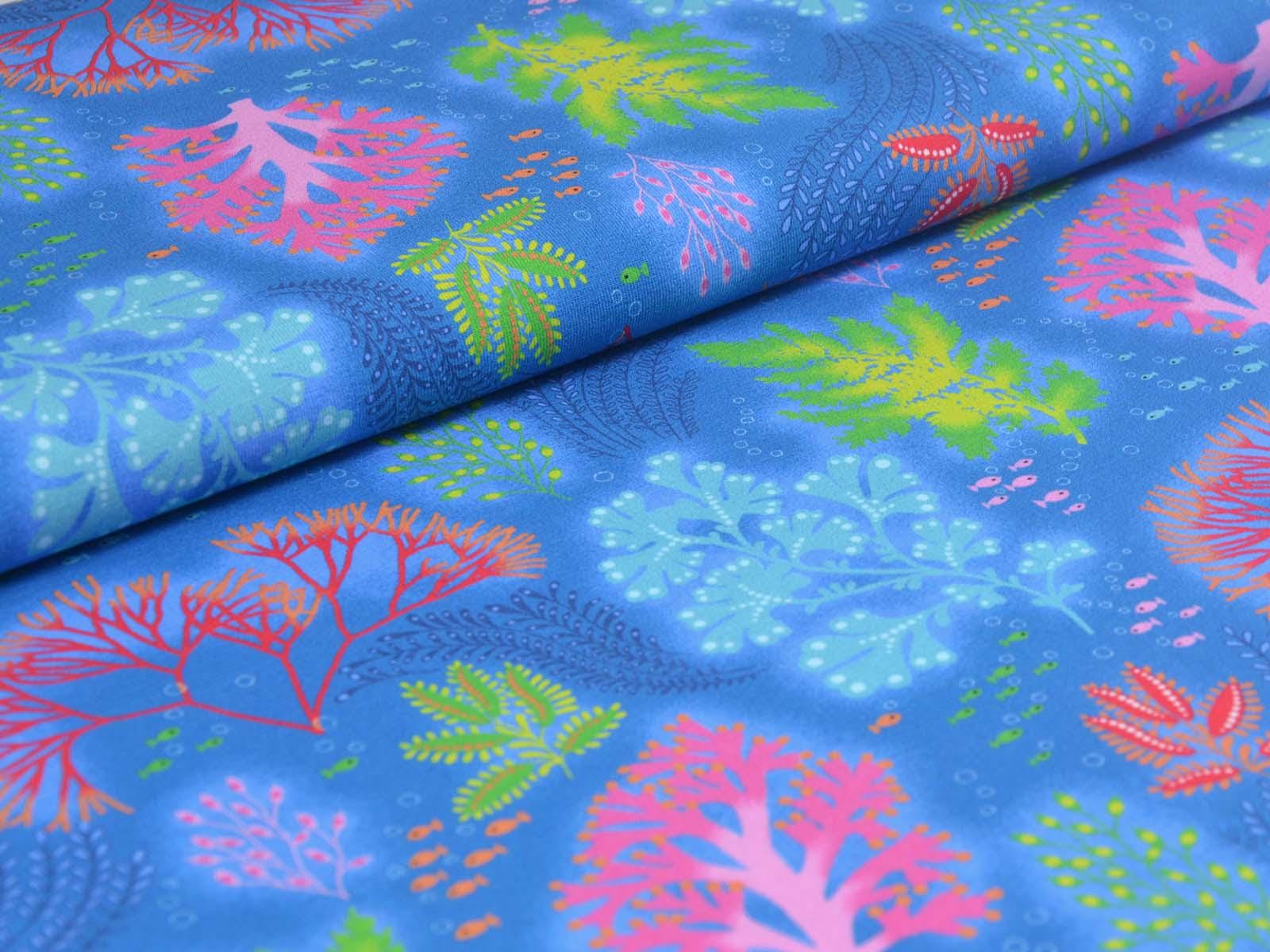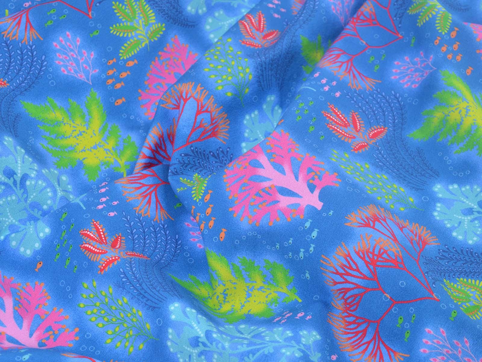 Baumwolljersey in blau mit grünen, blauen und rosanen Meerespflanzen. Der Stoff ist glatt und dünn. Er eignet sich wunderbar zum Nähen von Pumphosen, Bodys, T-Shirts, Shorts und vielem mehr.