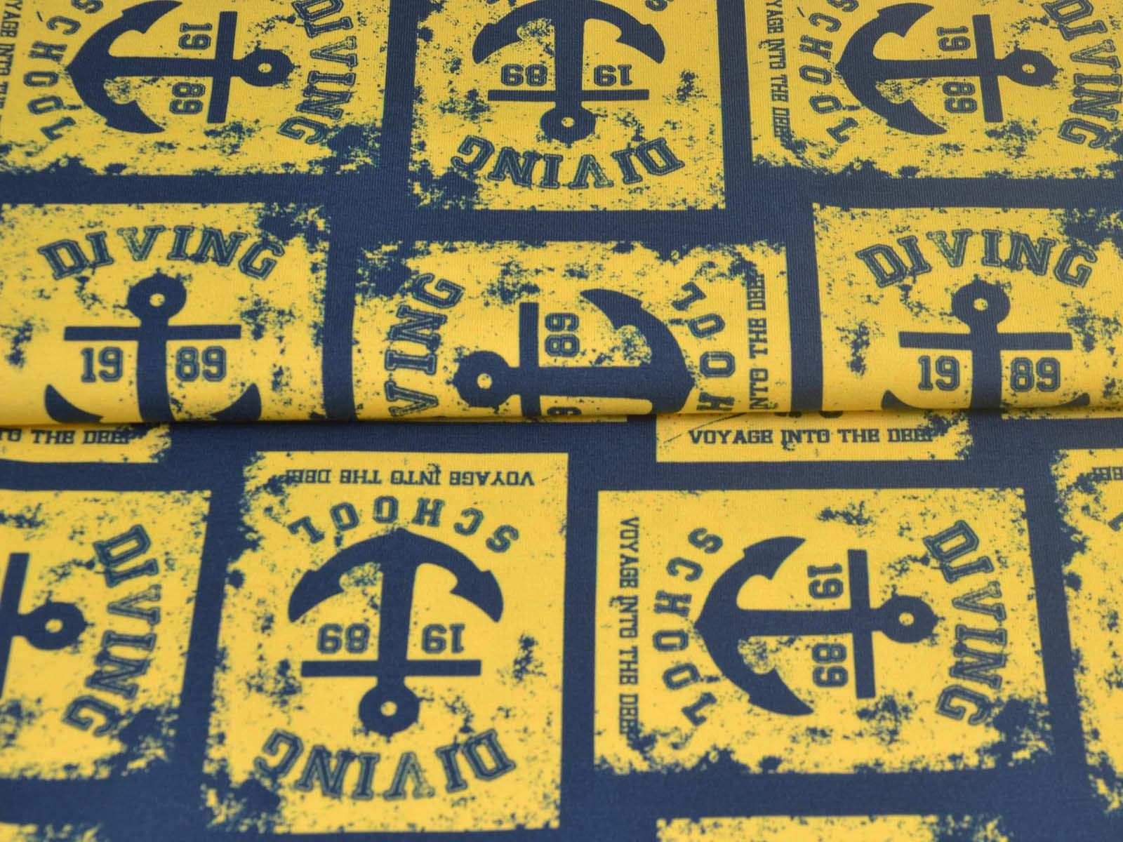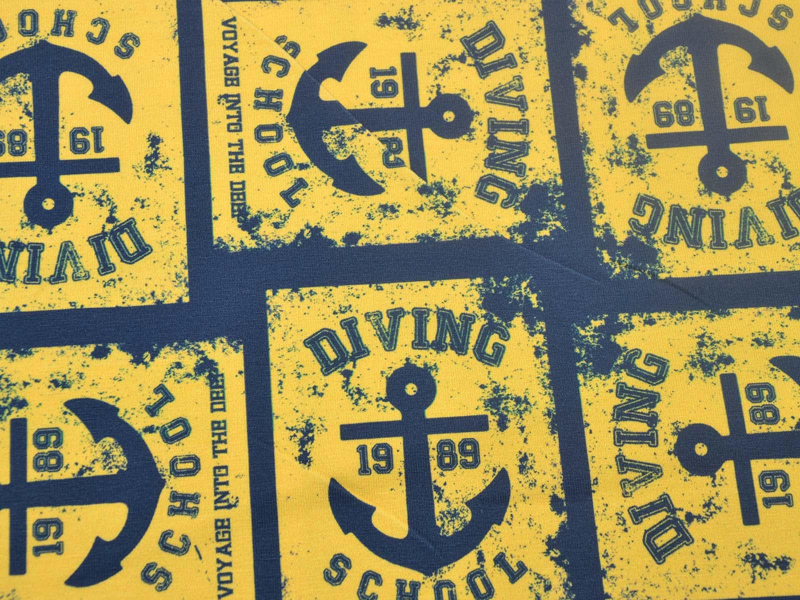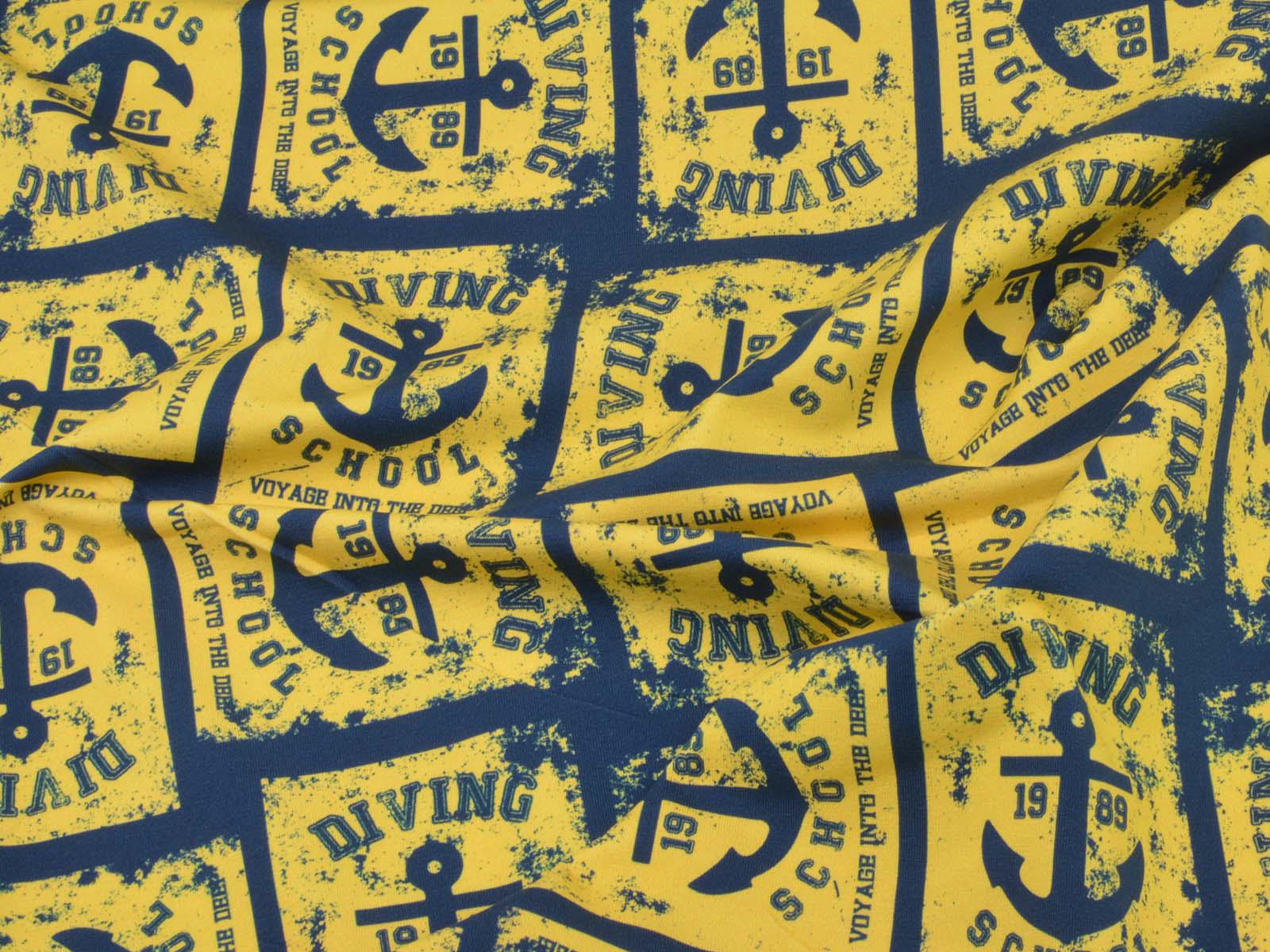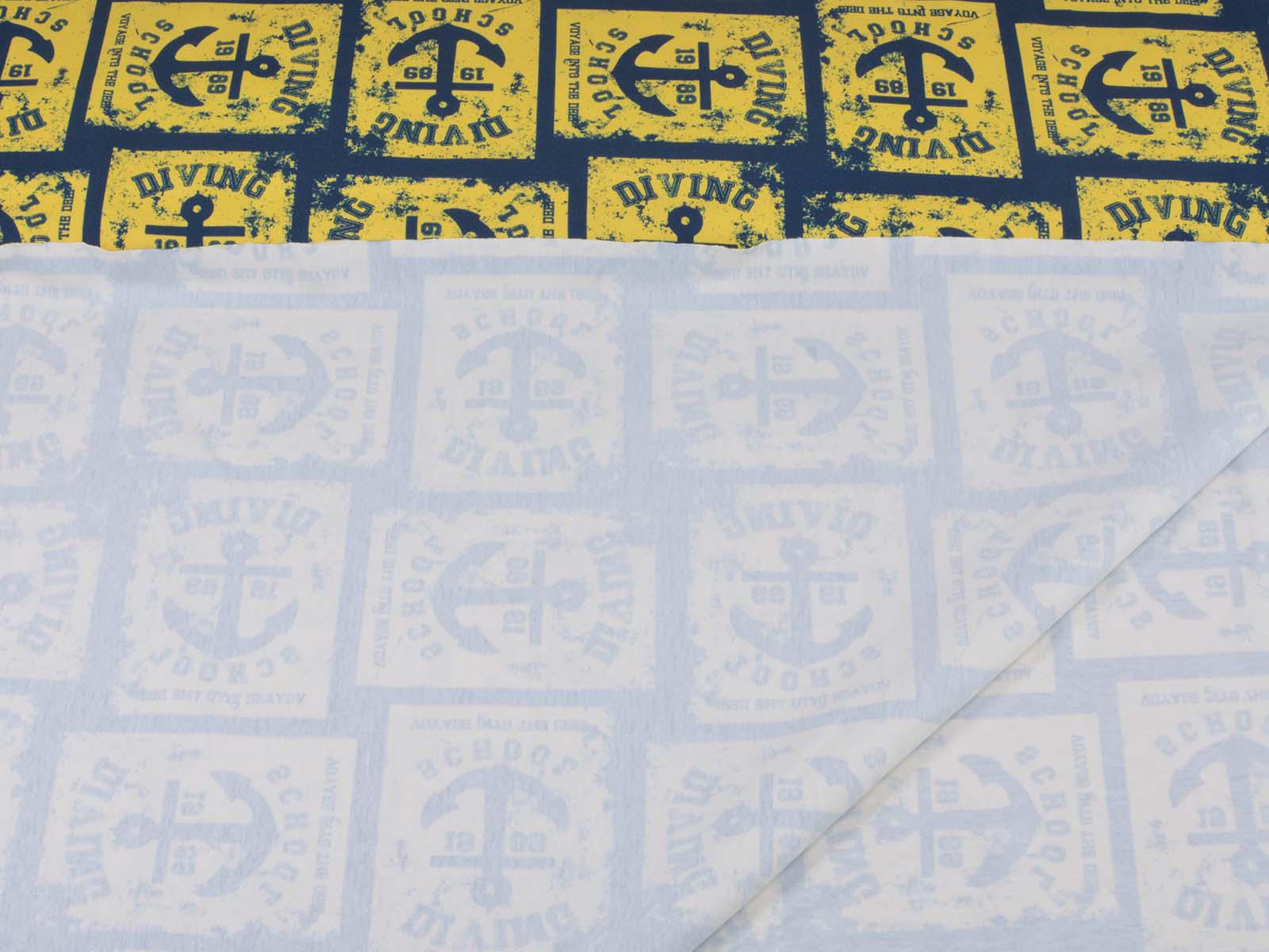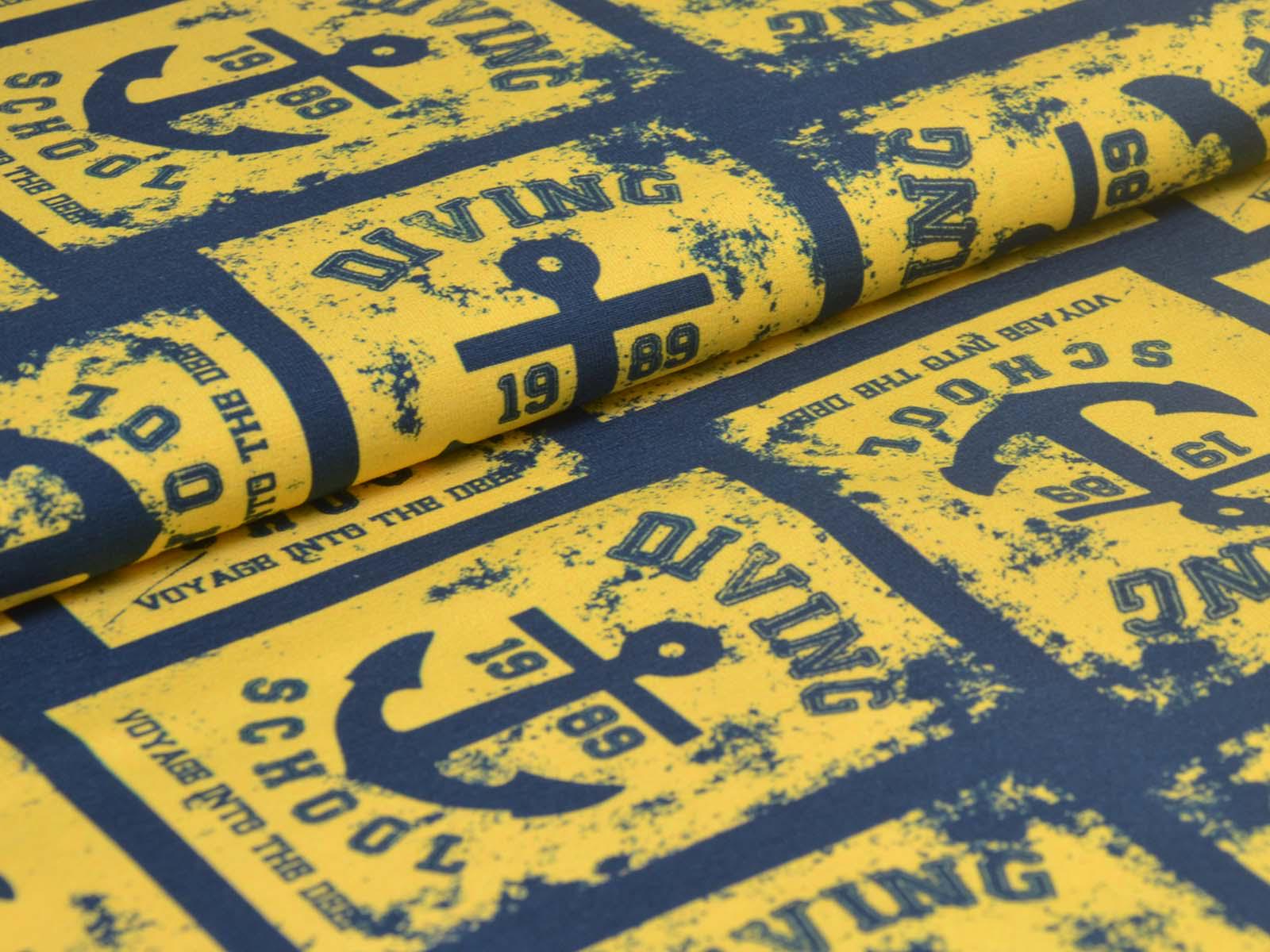 Baumwolljersey in gelb mit maritimen Muster und dunkelblauen Ankern. Der Stoff ist glatt und dünn. Er eignet sich wunderbar zum Nähen von Pumphosen, Bodys, T-Shirts, Shorts und vielem mehr.