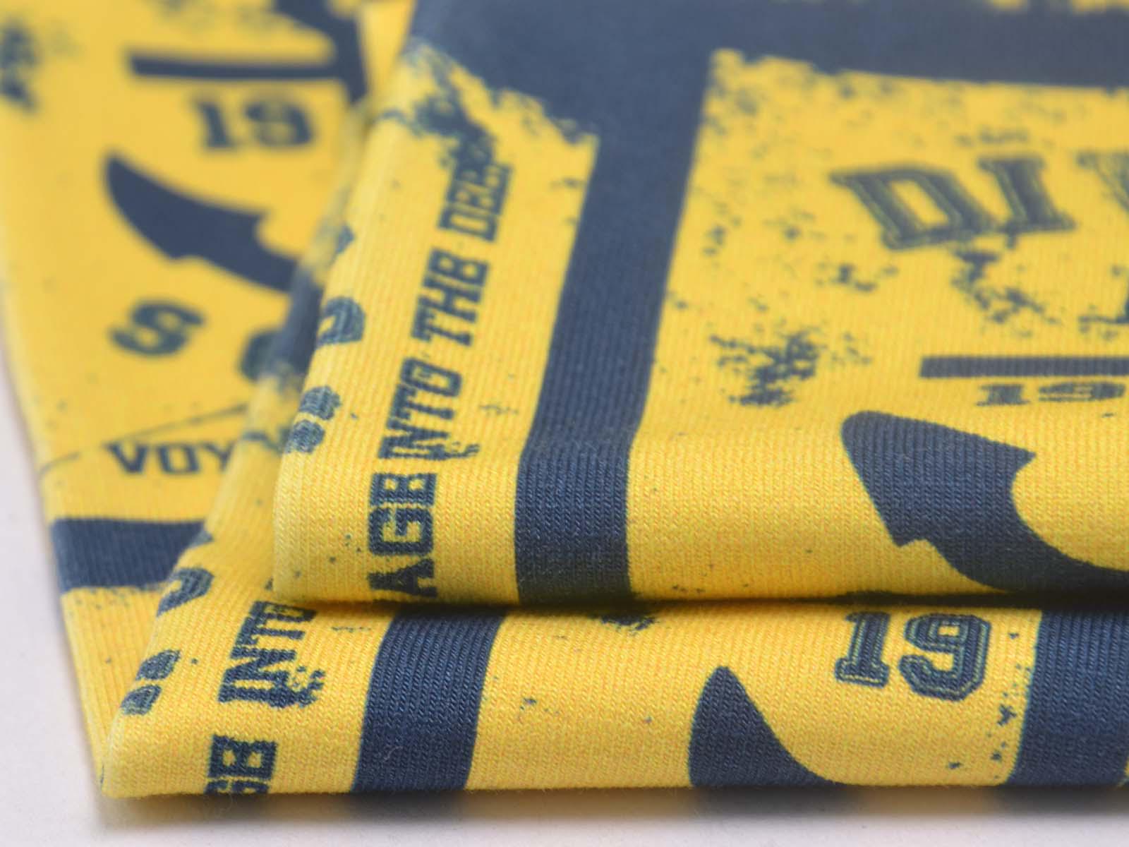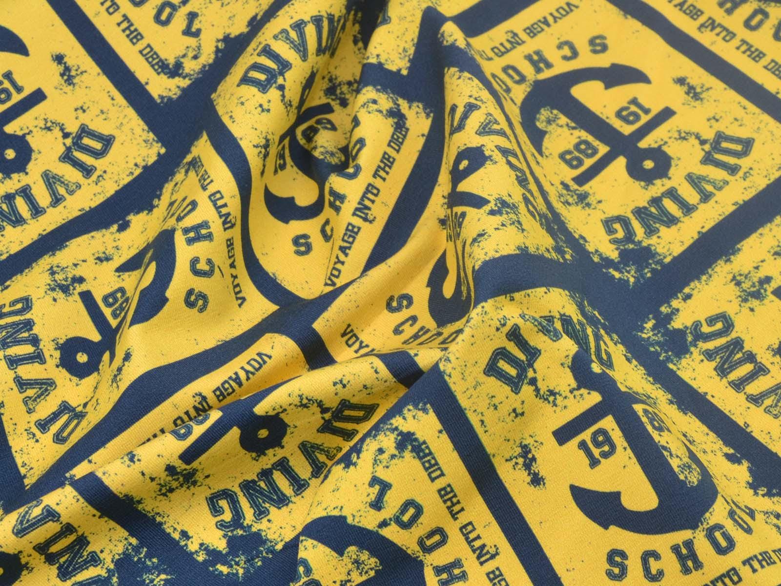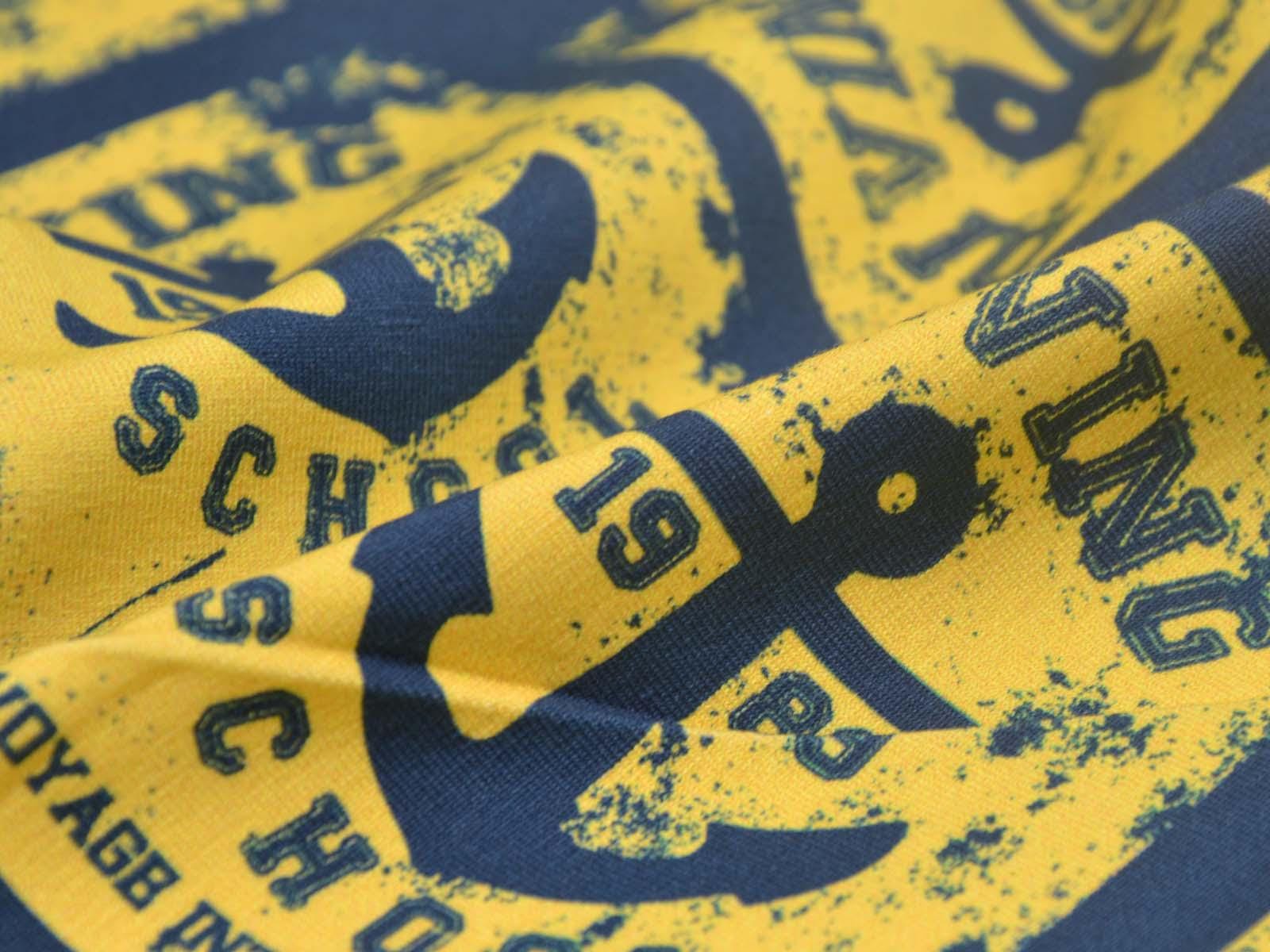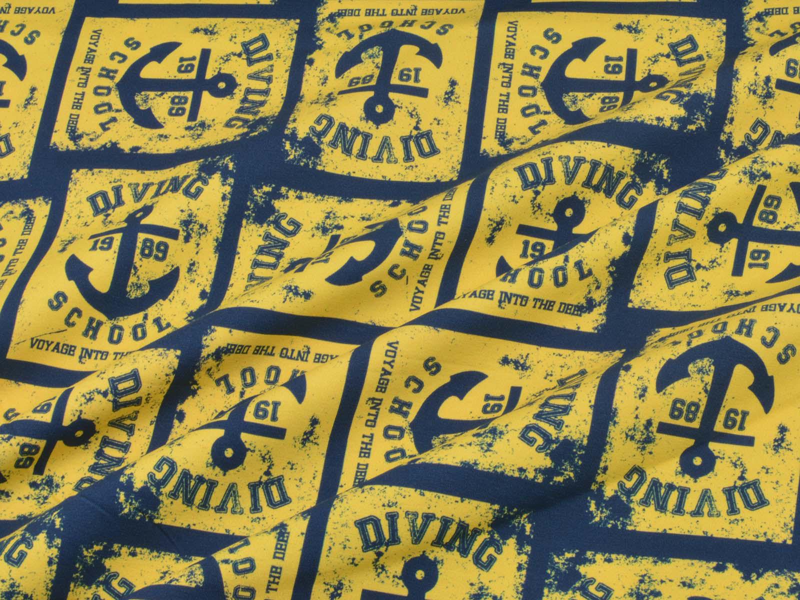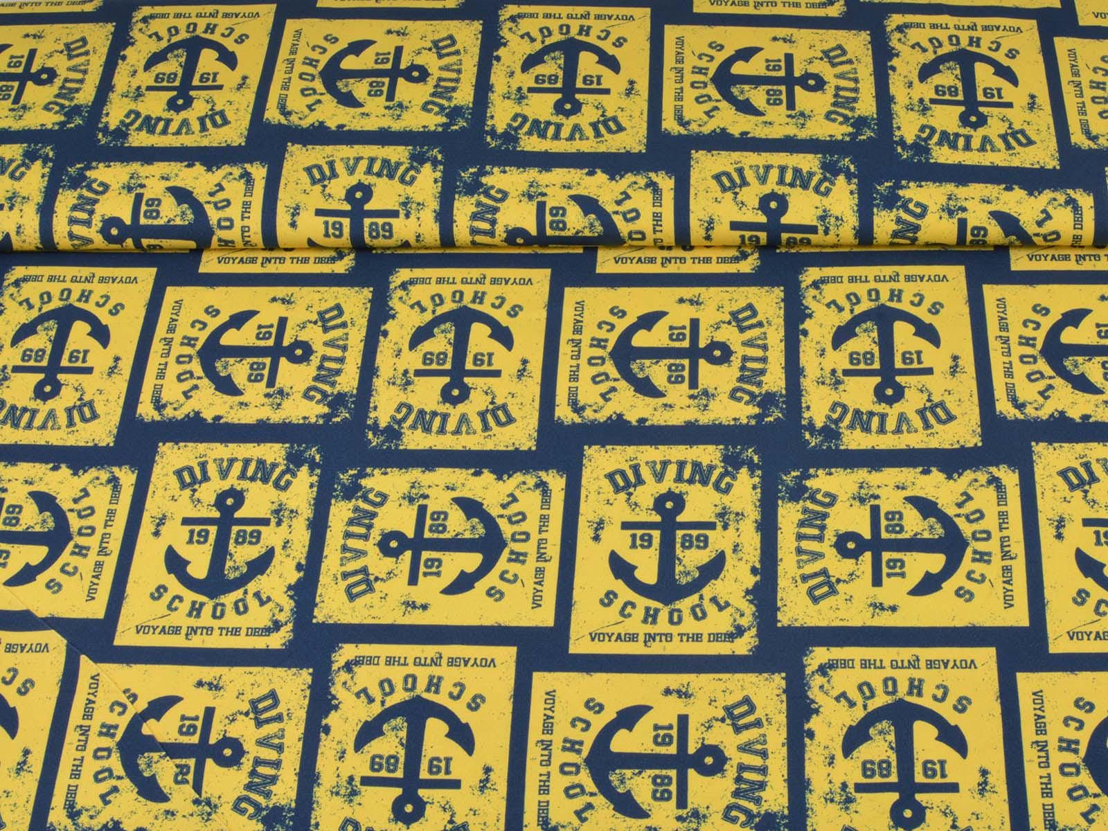 Baumwolljersey in gelb mit maritimen Muster und dunkelblauen Ankern. Der Stoff ist glatt und dünn. Er eignet sich wunderbar zum Nähen von Pumphosen, Bodys, T-Shirts, Shorts und vielem mehr.