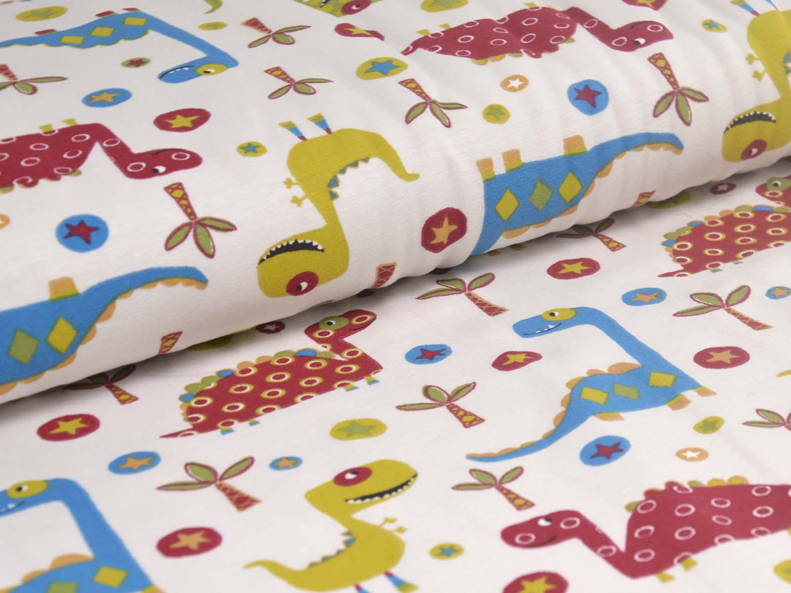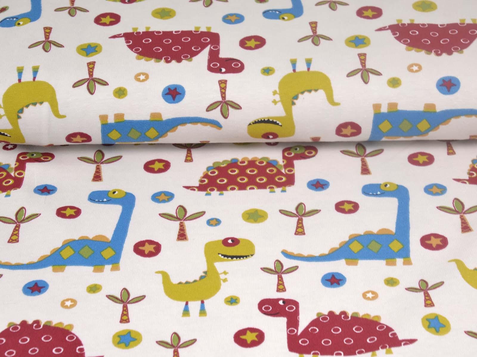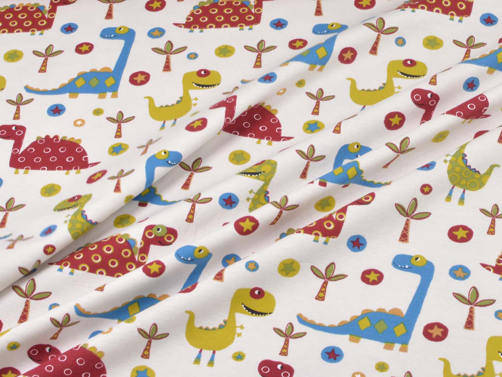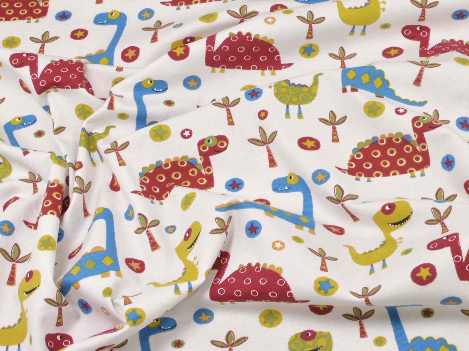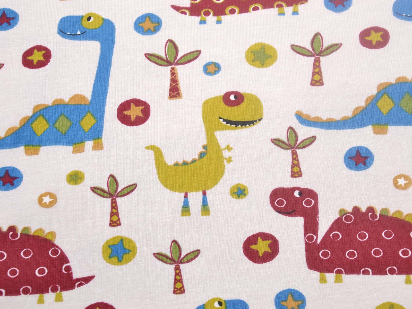 White cotton sweatshirt fabric with green, red, and blue dinosaurs and small palm trees. Each dinosaur is approximately 7 cm tall. The fabric is smooth and thin. It's perfect for sewing T-shirts, dresses, shorts, and much more.