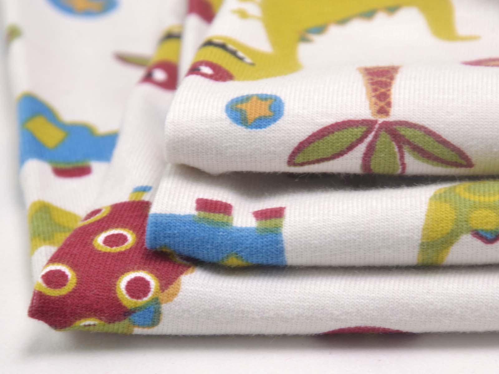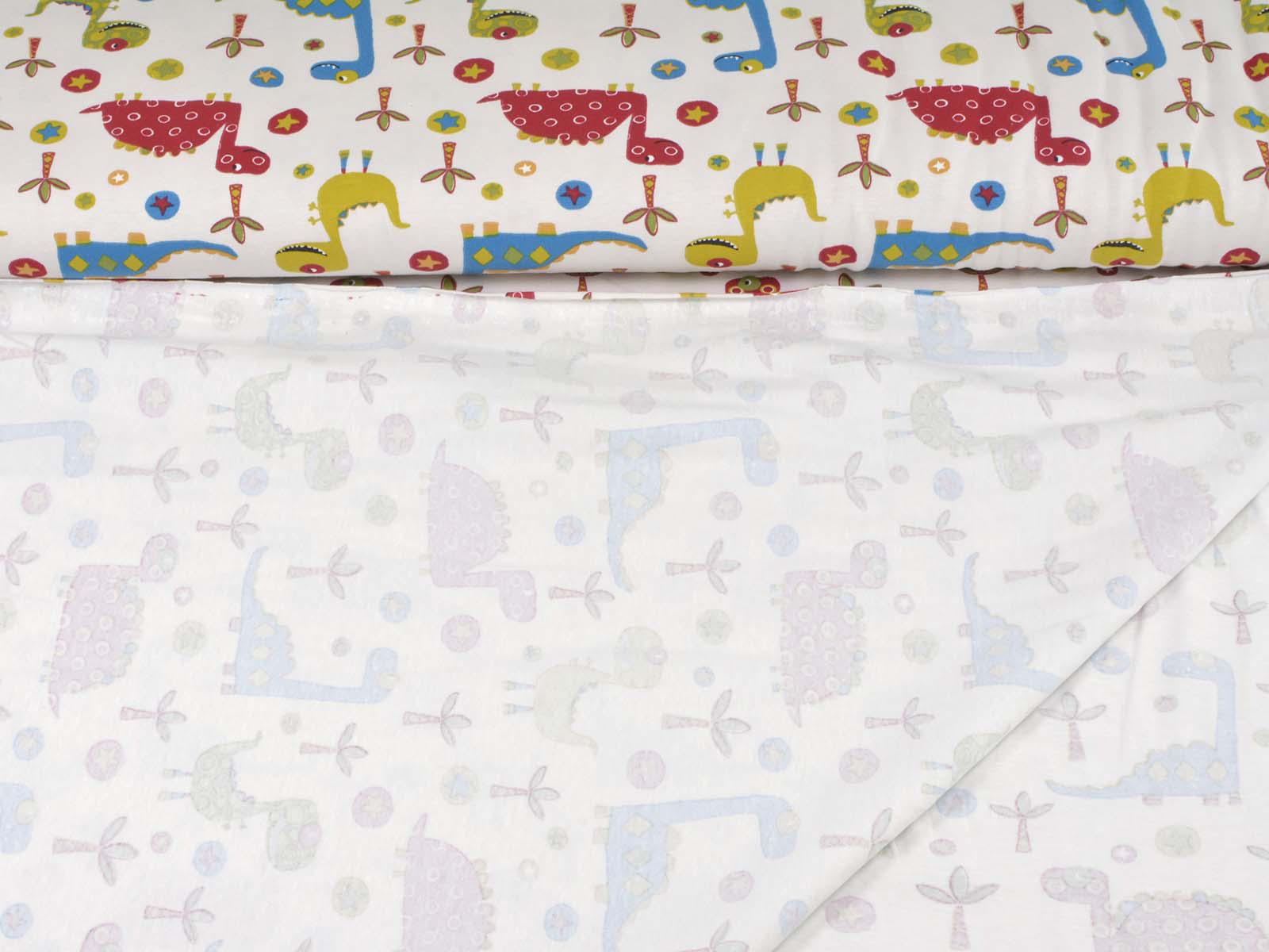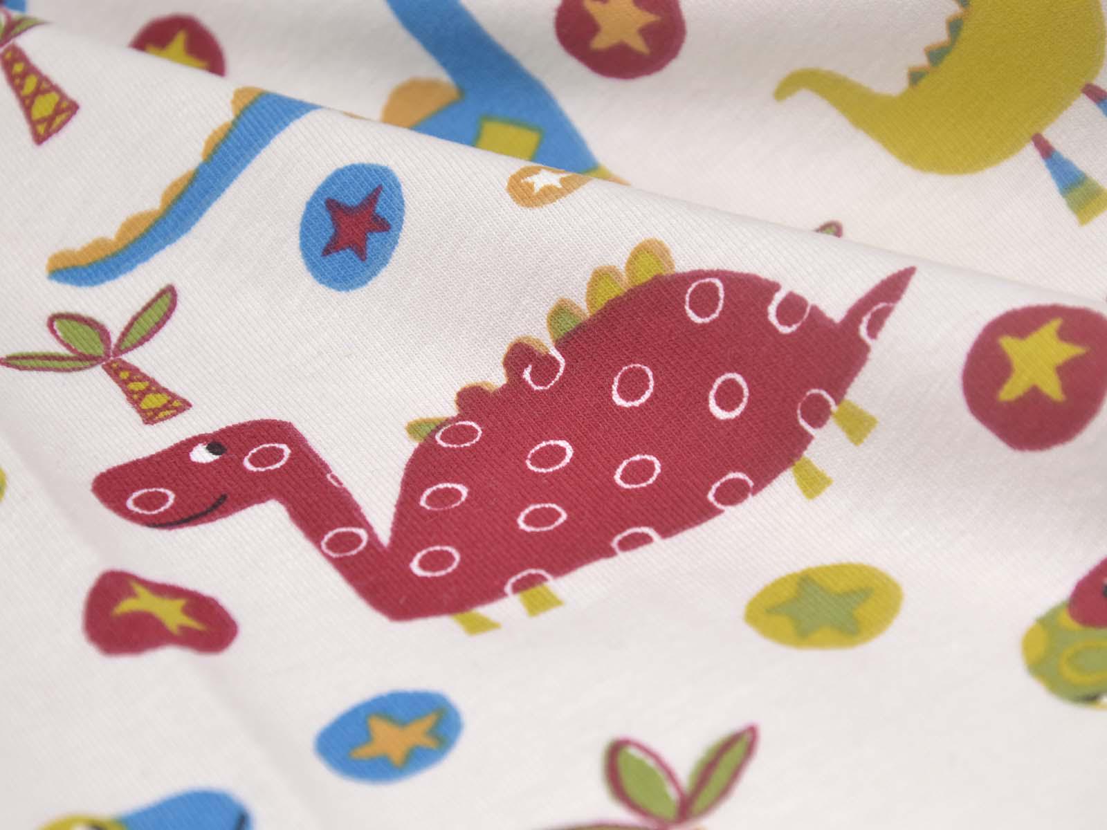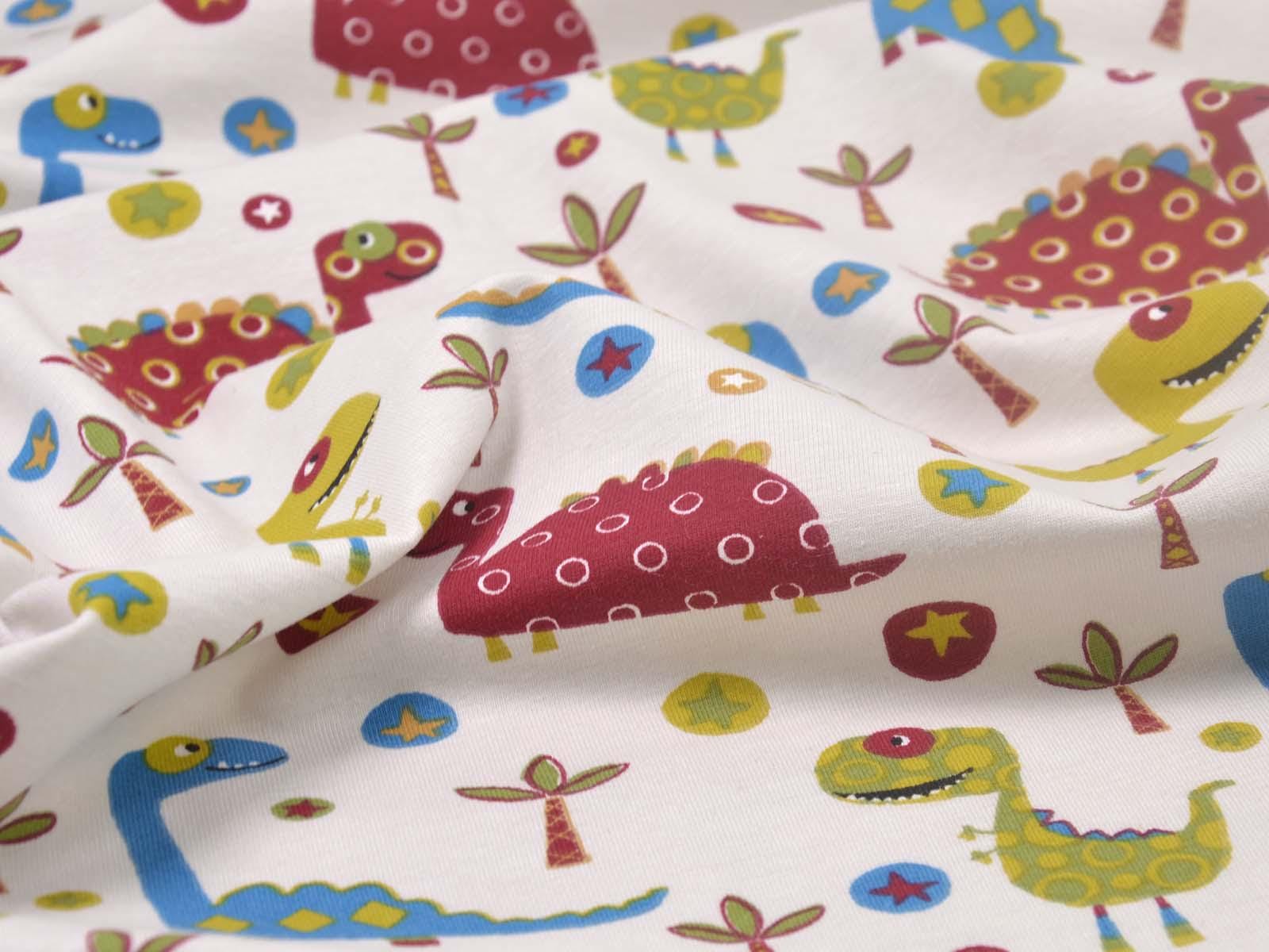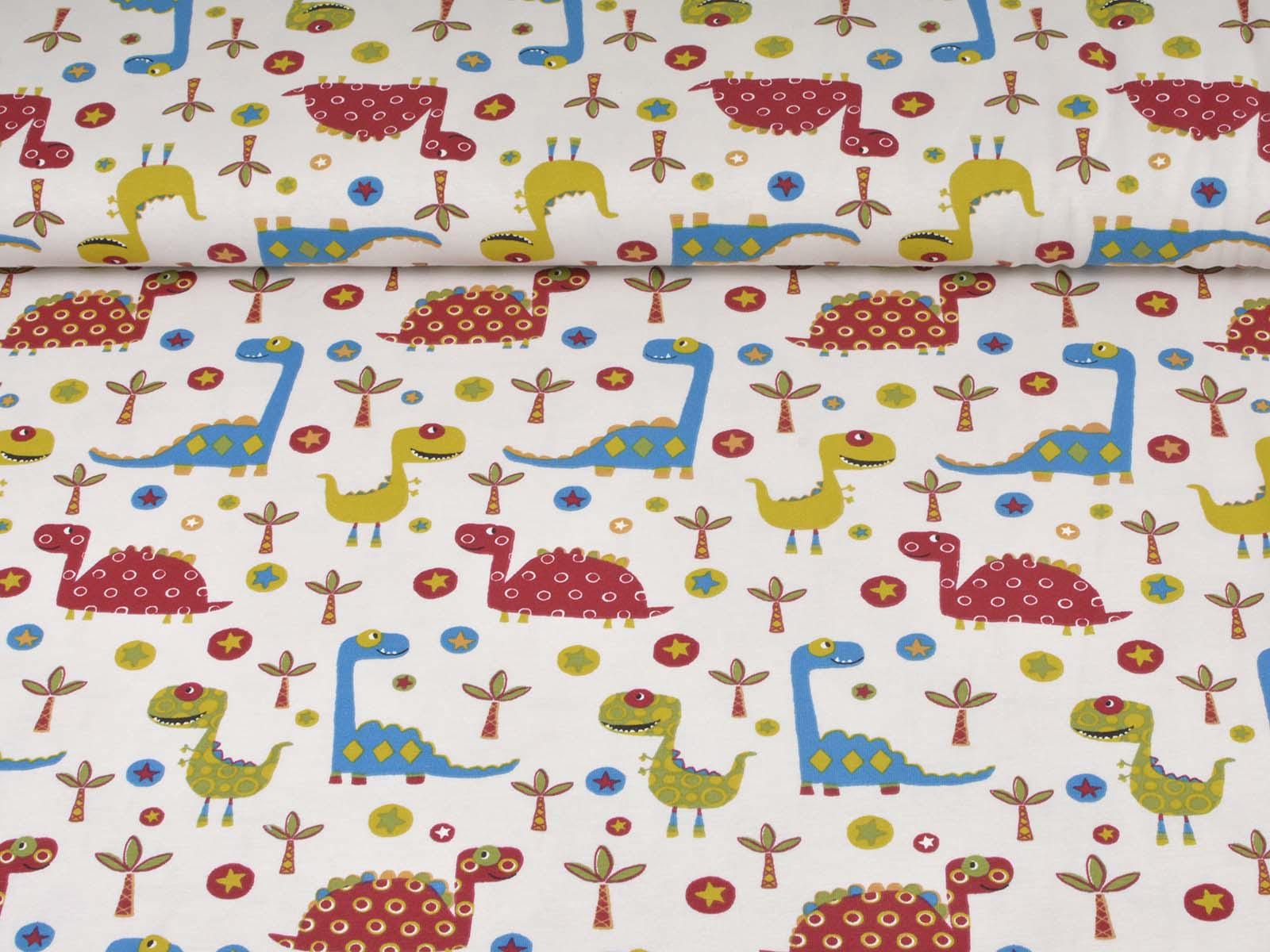 White cotton sweatshirt fabric with green, red, and blue dinosaurs and small palm trees. Each dinosaur is approximately 7 cm tall. The fabric is smooth and thin. It's perfect for sewing T-shirts, dresses, shorts, and much more.