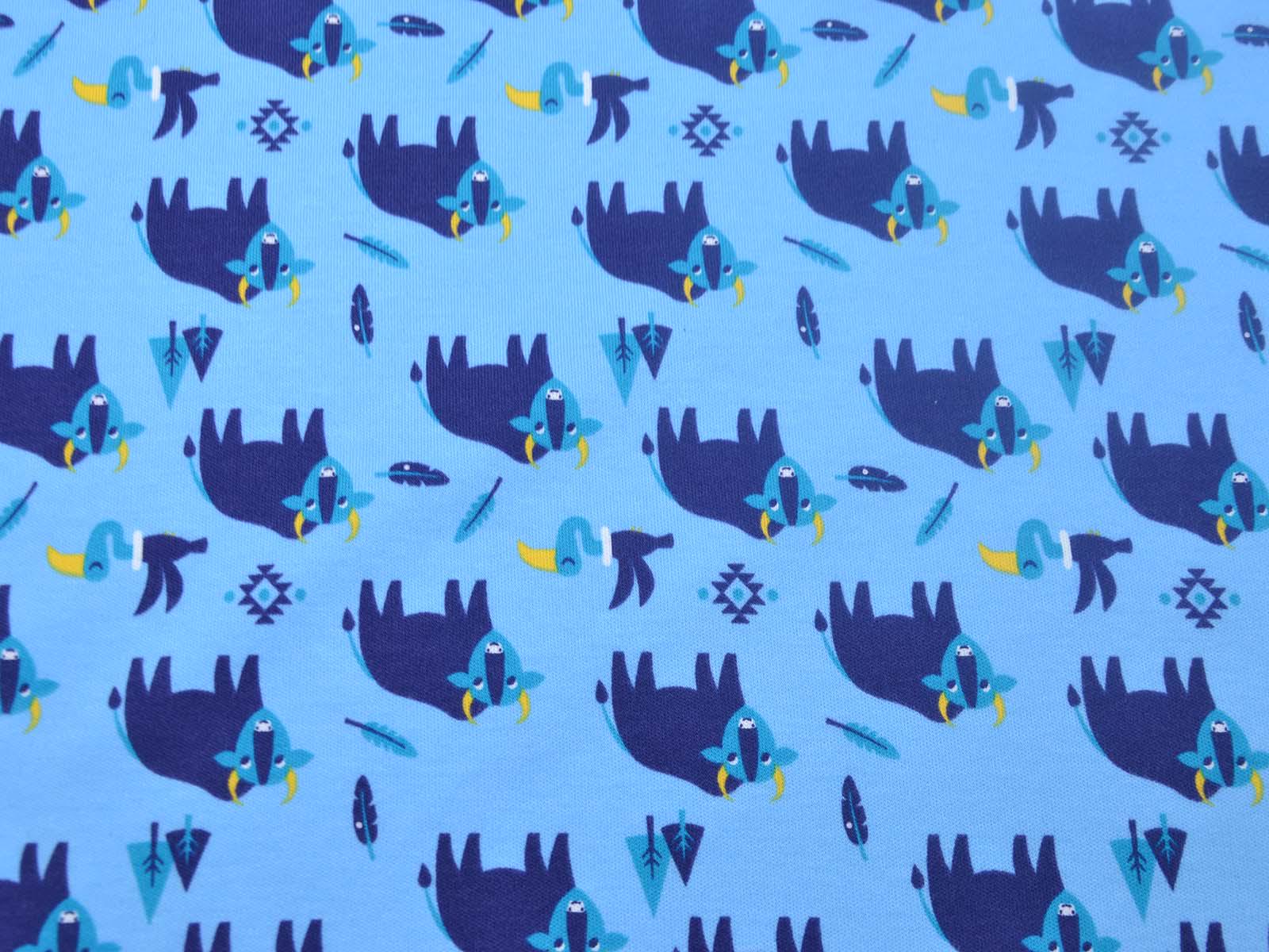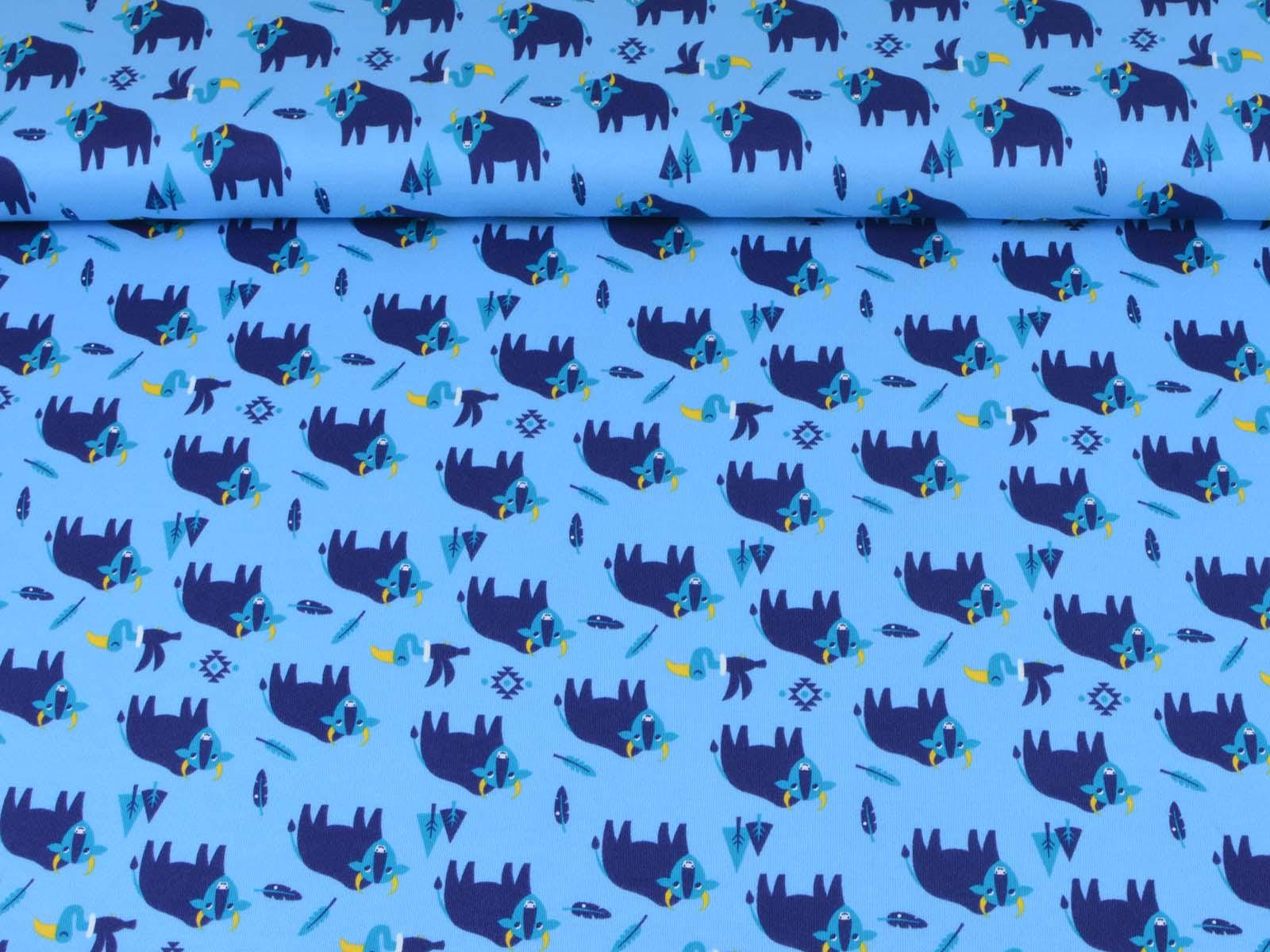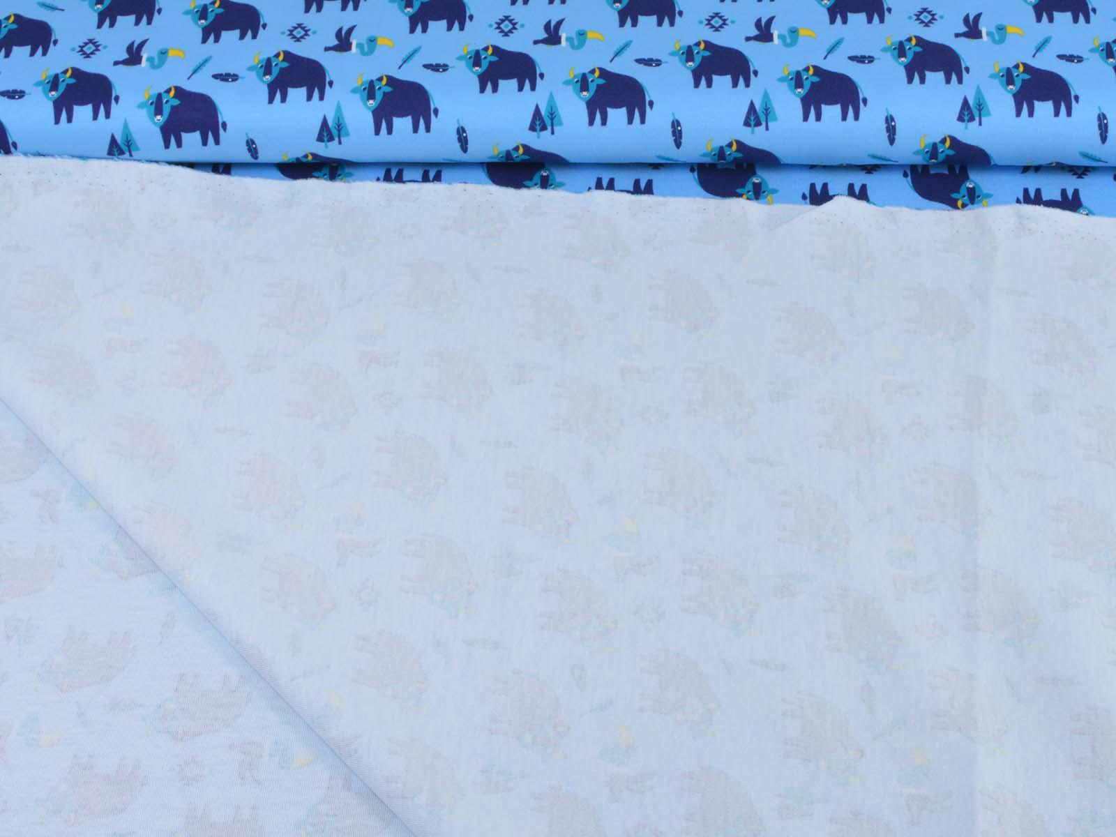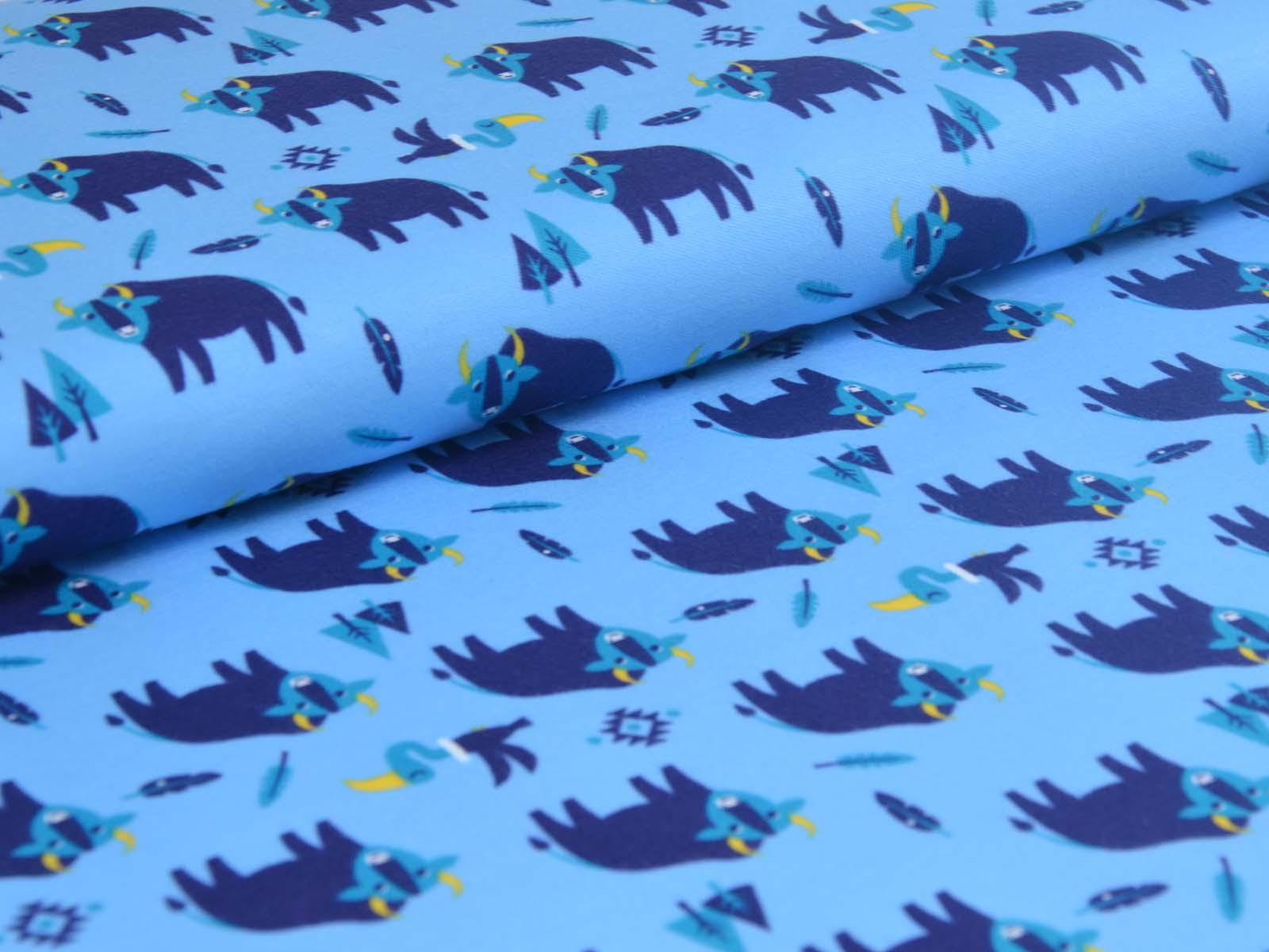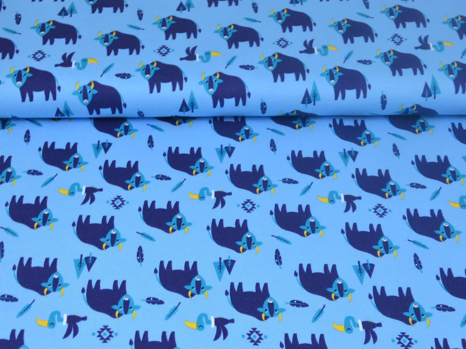 Light blue interlock jersey from Westfalenstoffe featuring bison, small feathers, and birds. Each bison is approximately 4.5 cm tall. This fabric is perfect for sewing T-shirts, shorts, dresses, leggings, and much more.