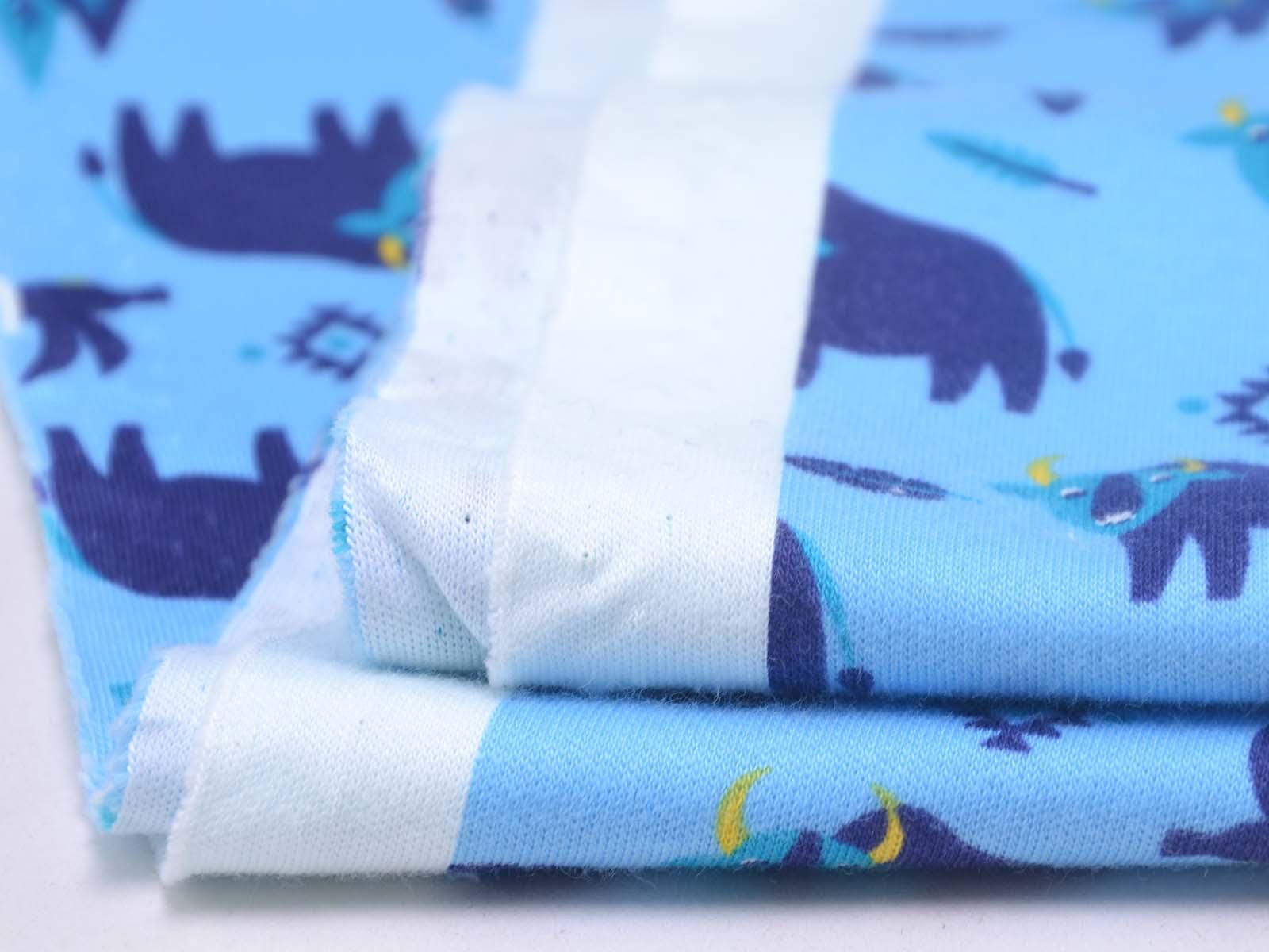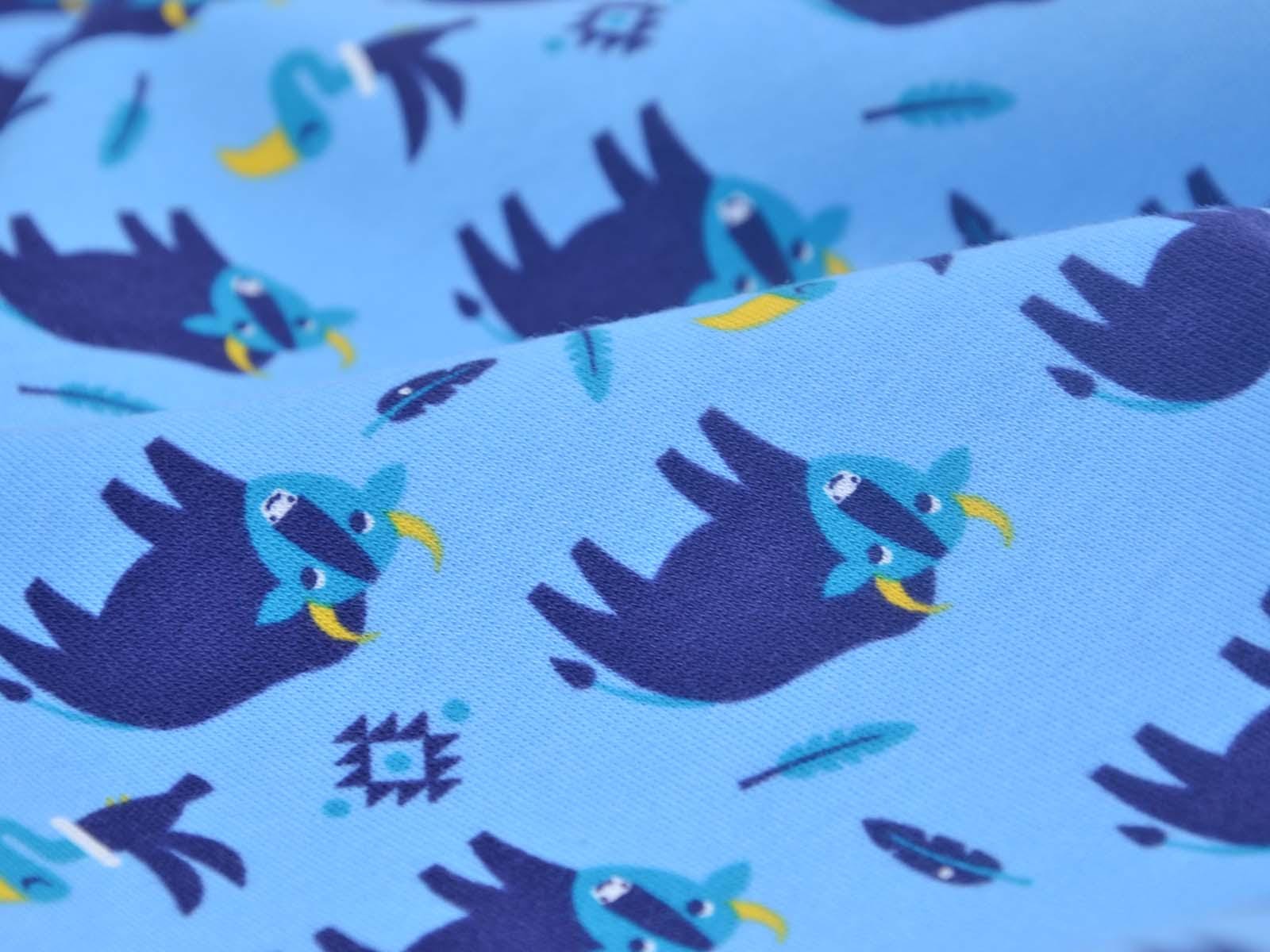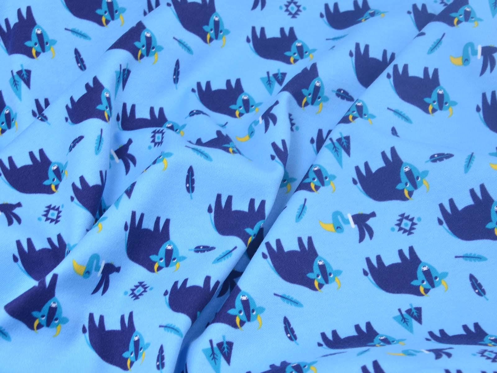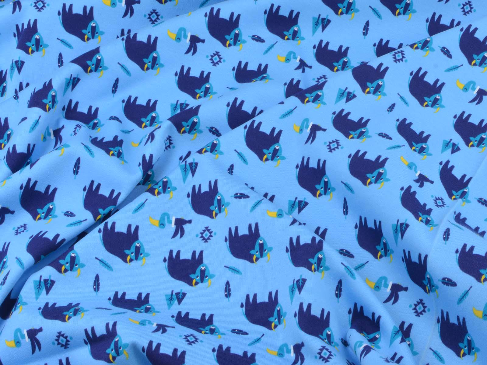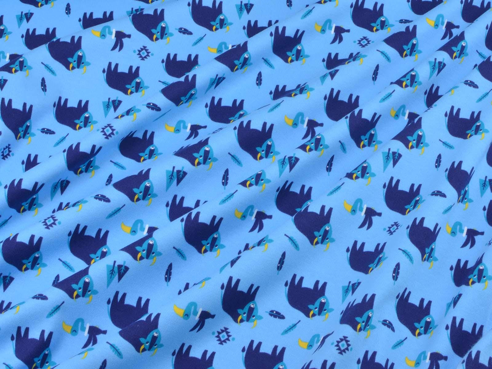 Light blue interlock jersey from Westfalenstoffe featuring bison, small feathers, and birds. Each bison is approximately 4.5 cm tall. This fabric is perfect for sewing T-shirts, shorts, dresses, leggings, and much more.