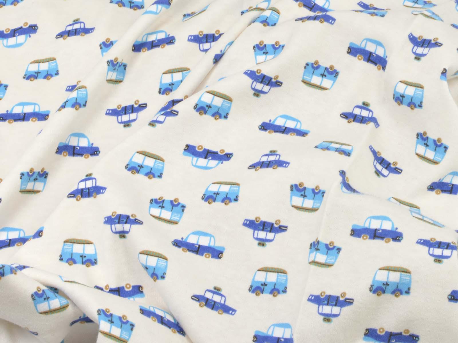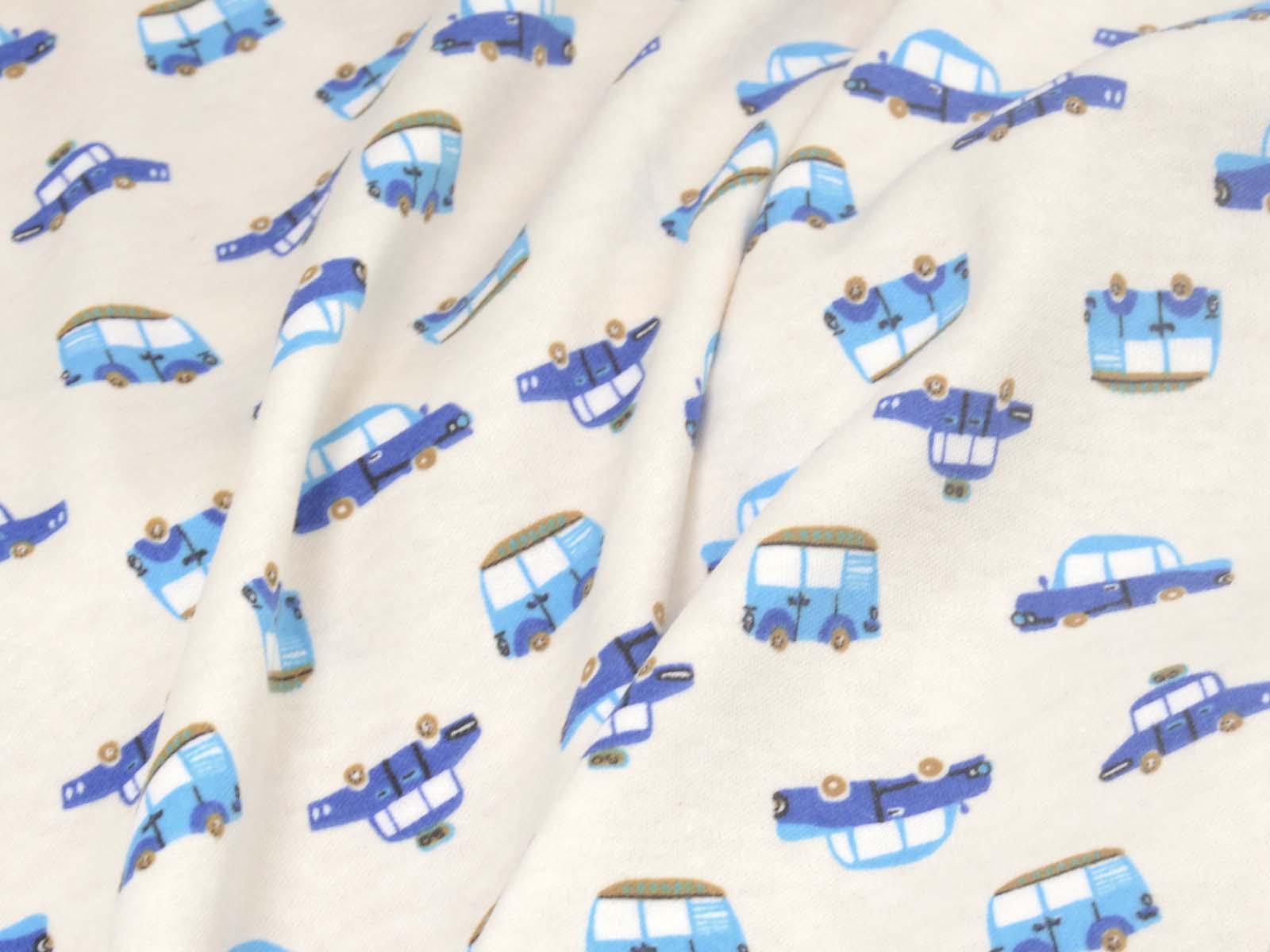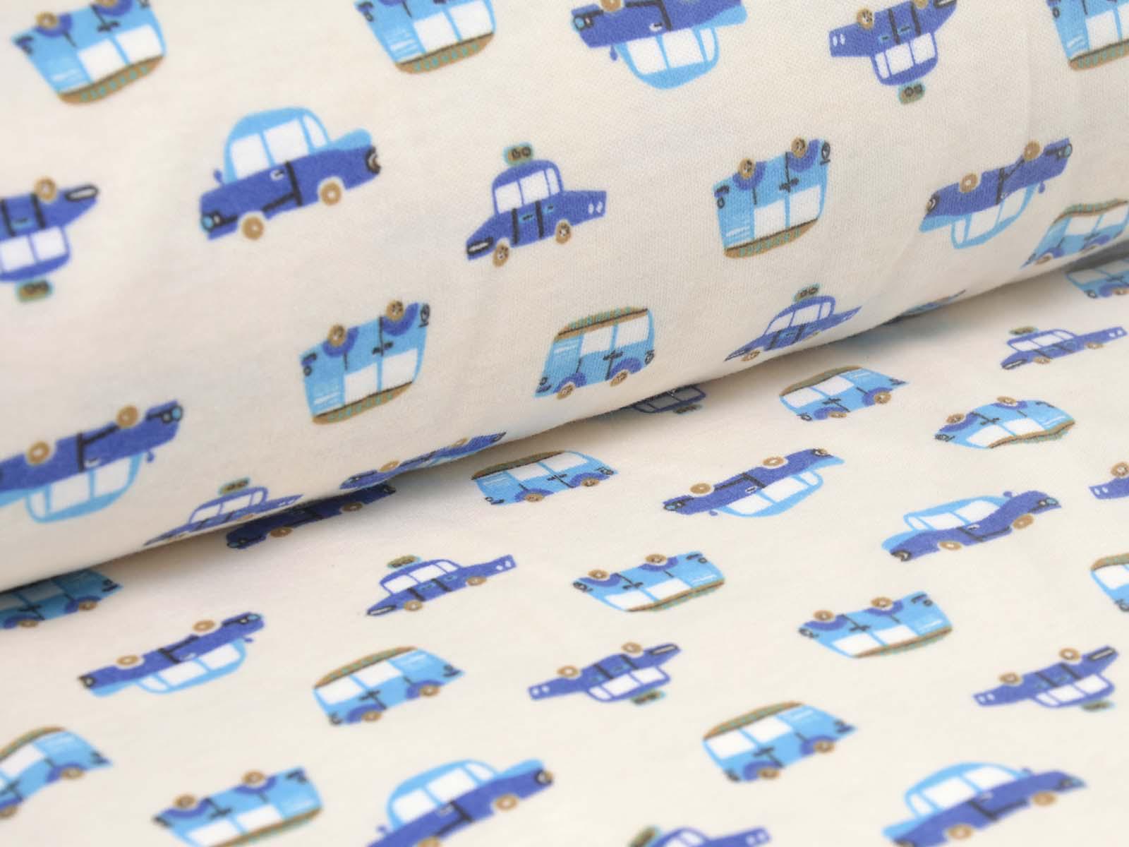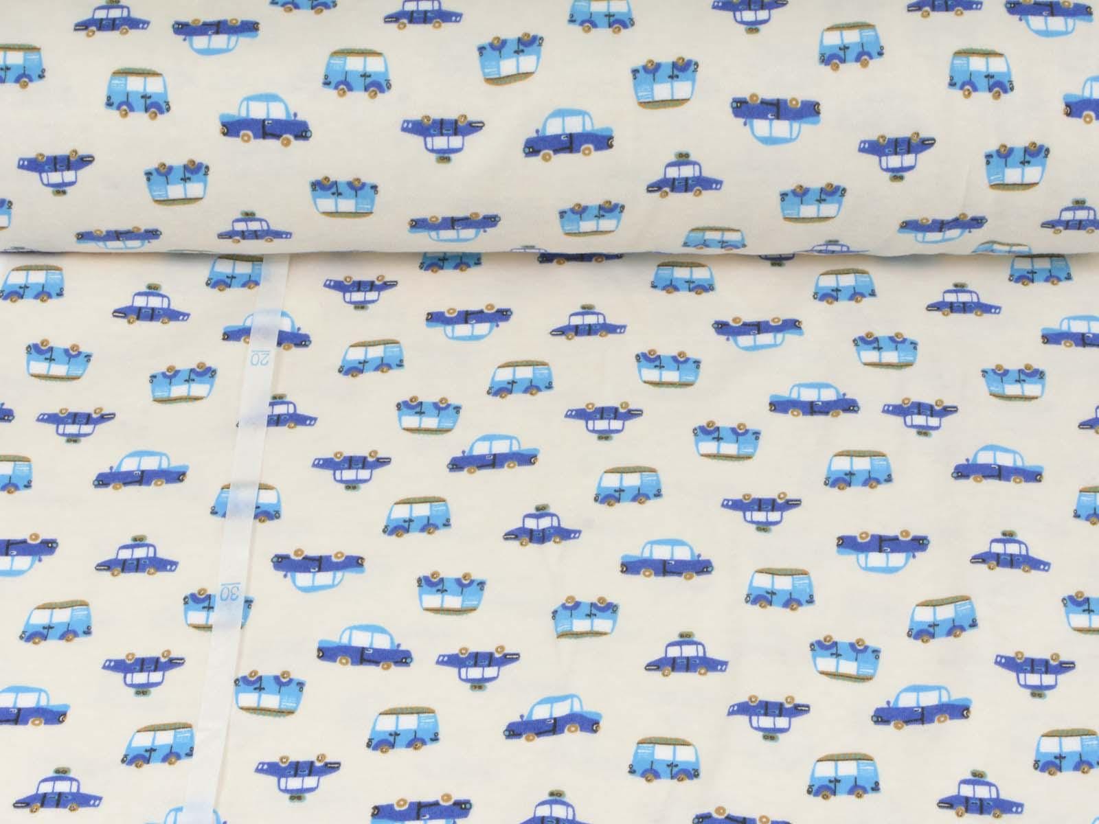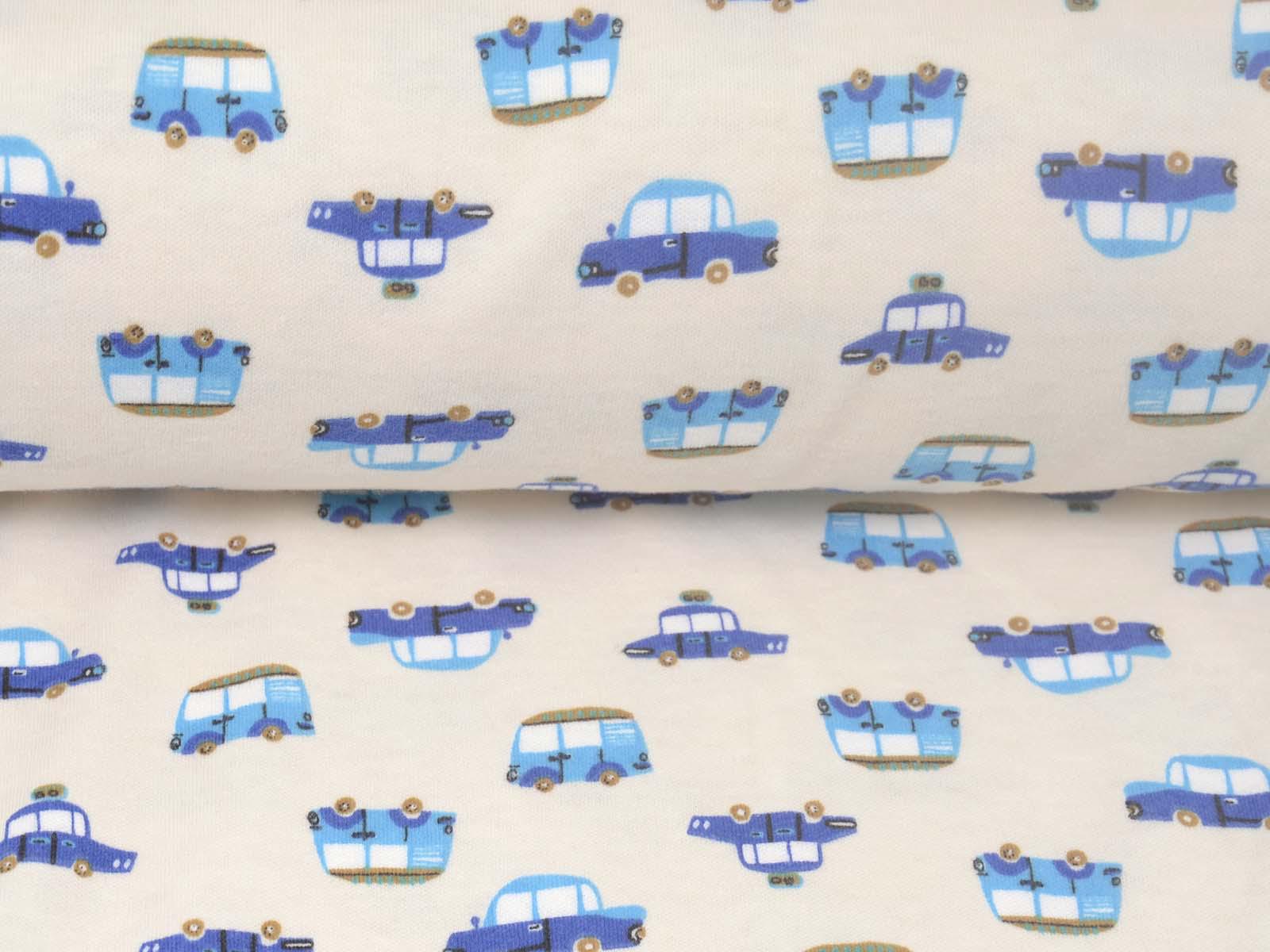 Cream-colored cotton jersey with blue-green cars. Each car is approximately 3 cm tall. The fabric is thin and feels rather soft. It's perfect for sewing T-shirts, skirts, dresses, shorts, bloomers, and much more.