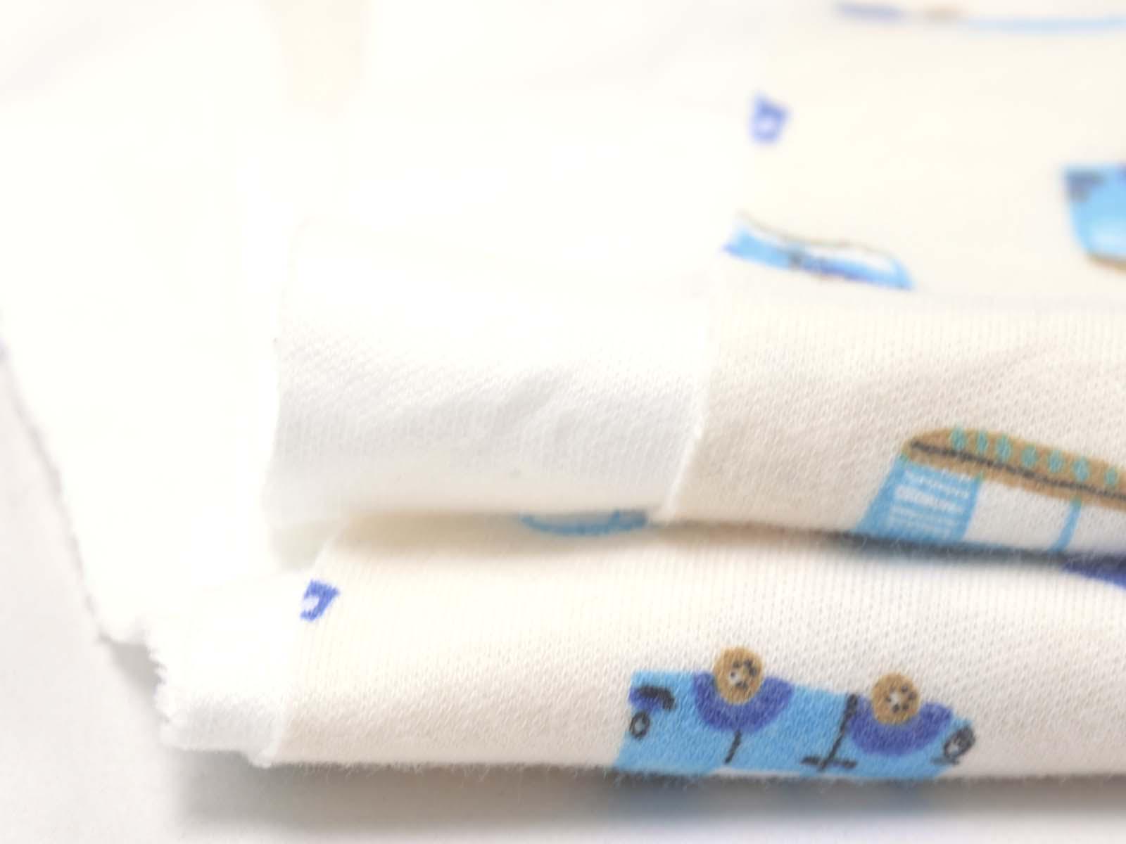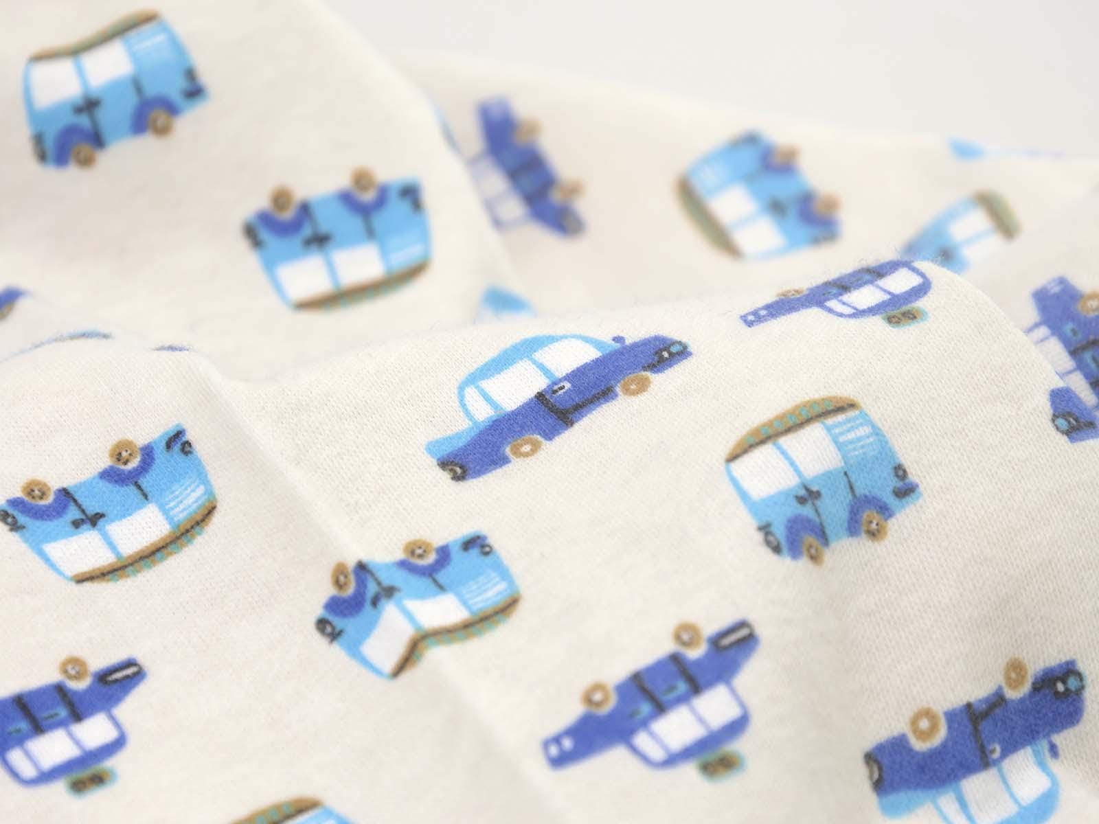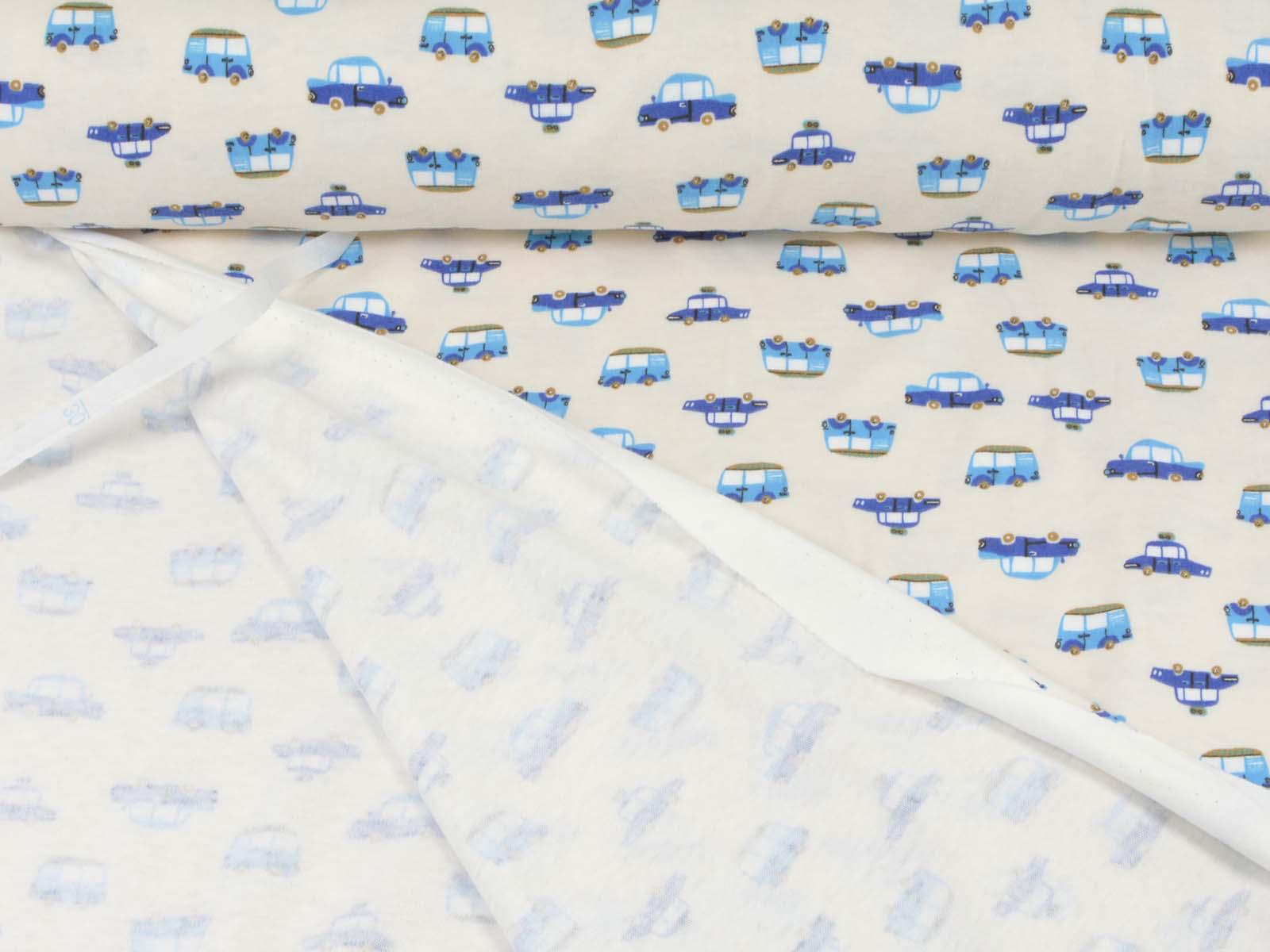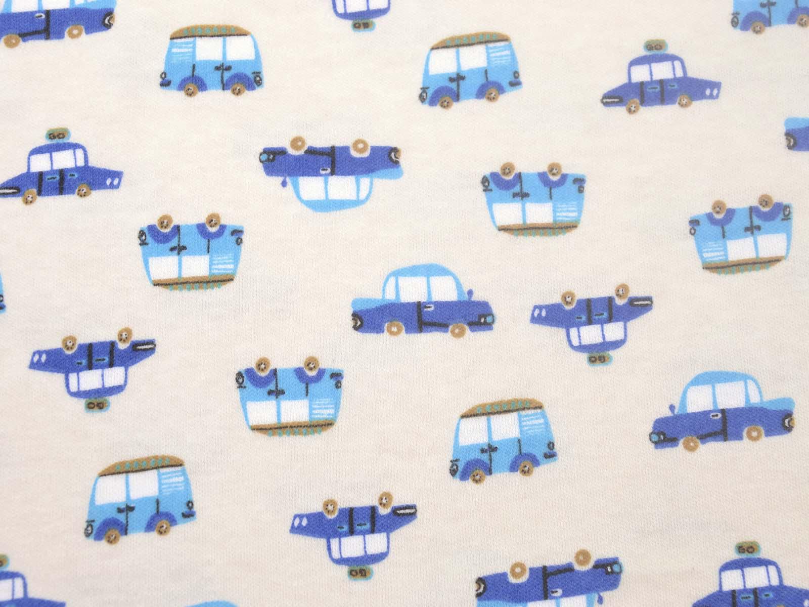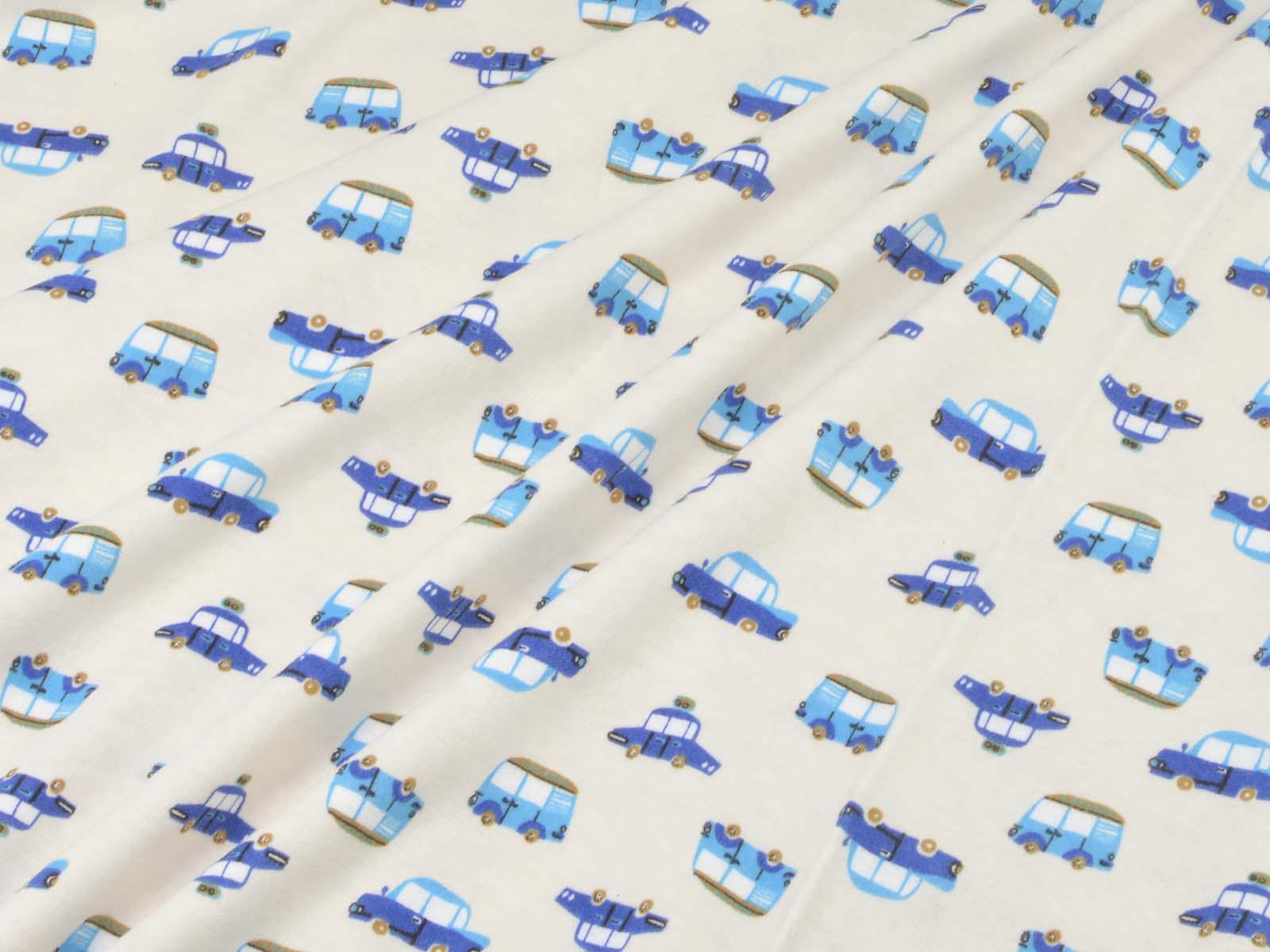 Cream-colored cotton jersey with blue-green cars. Each car is approximately 3 cm tall. The fabric is thin and feels rather soft. It's perfect for sewing T-shirts, skirts, dresses, shorts, bloomers, and much more.