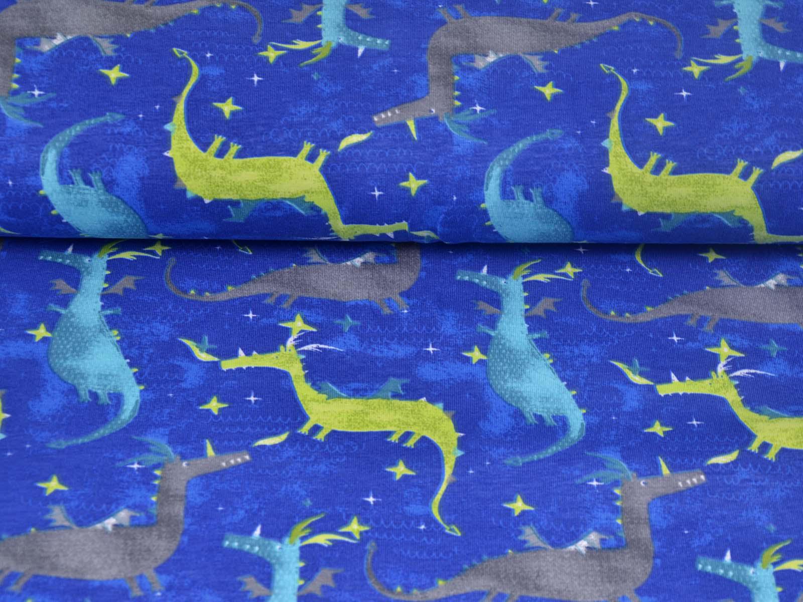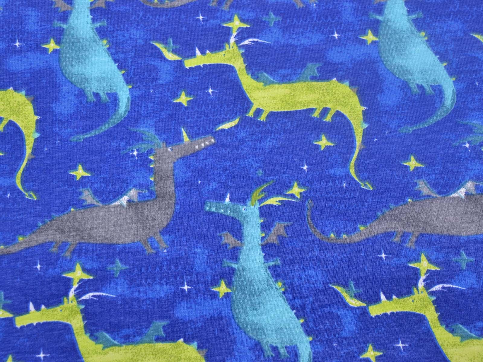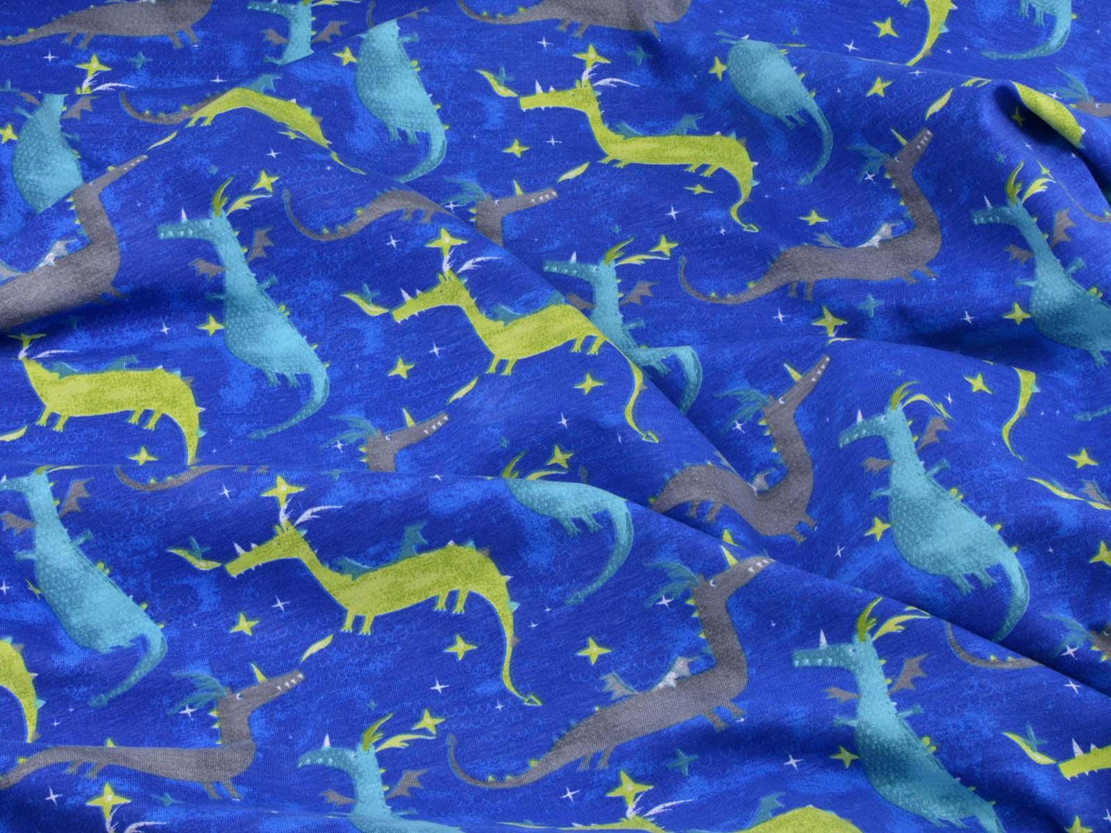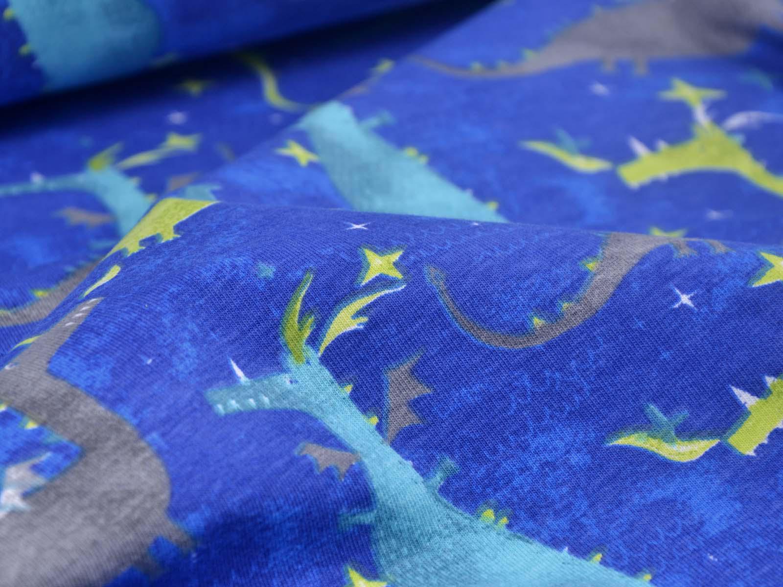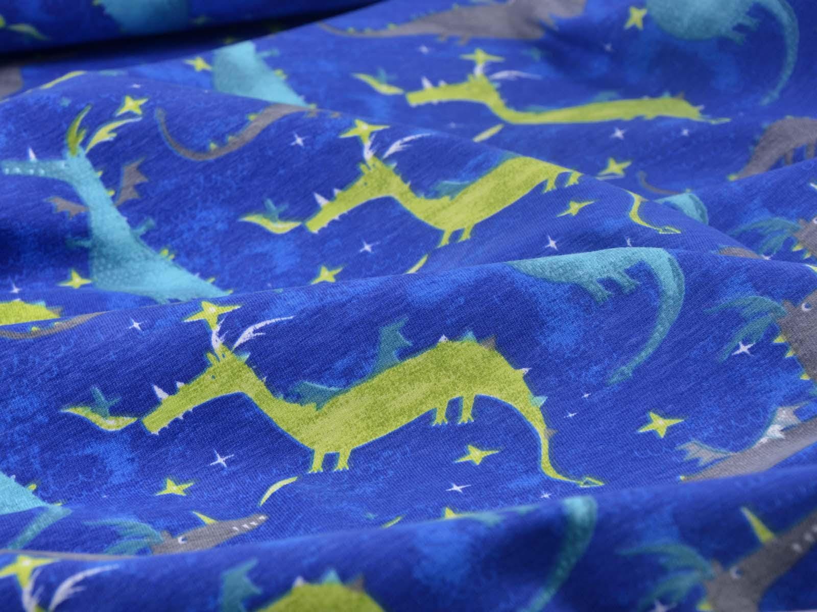 Blauer Baumwolljersey mit grauen, grünen und hellblauen Drachen. Ein Drache ist etwa 14 cm groß. Der Stoff ist glatt und dünn. Er eignet sich wunderbar zum Nähen von T-Shirts, Kleidern, Röcken, Shorts, Pumphosen und vielem mehr.