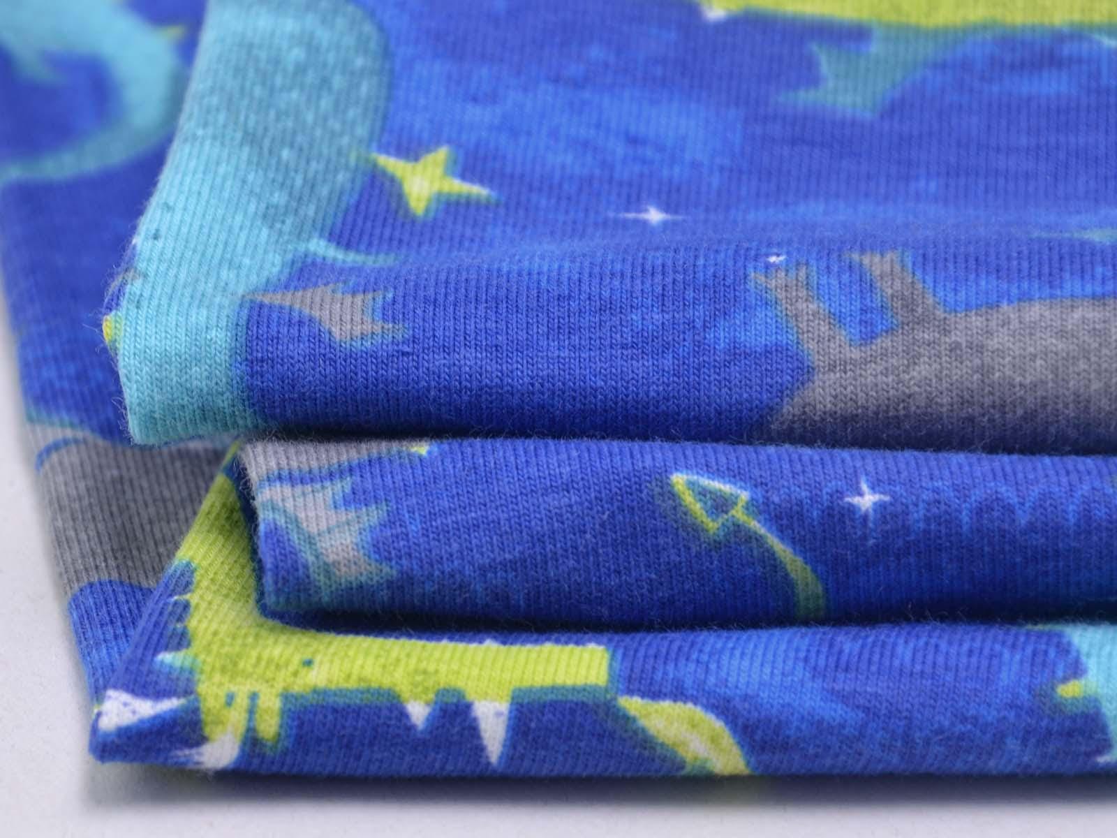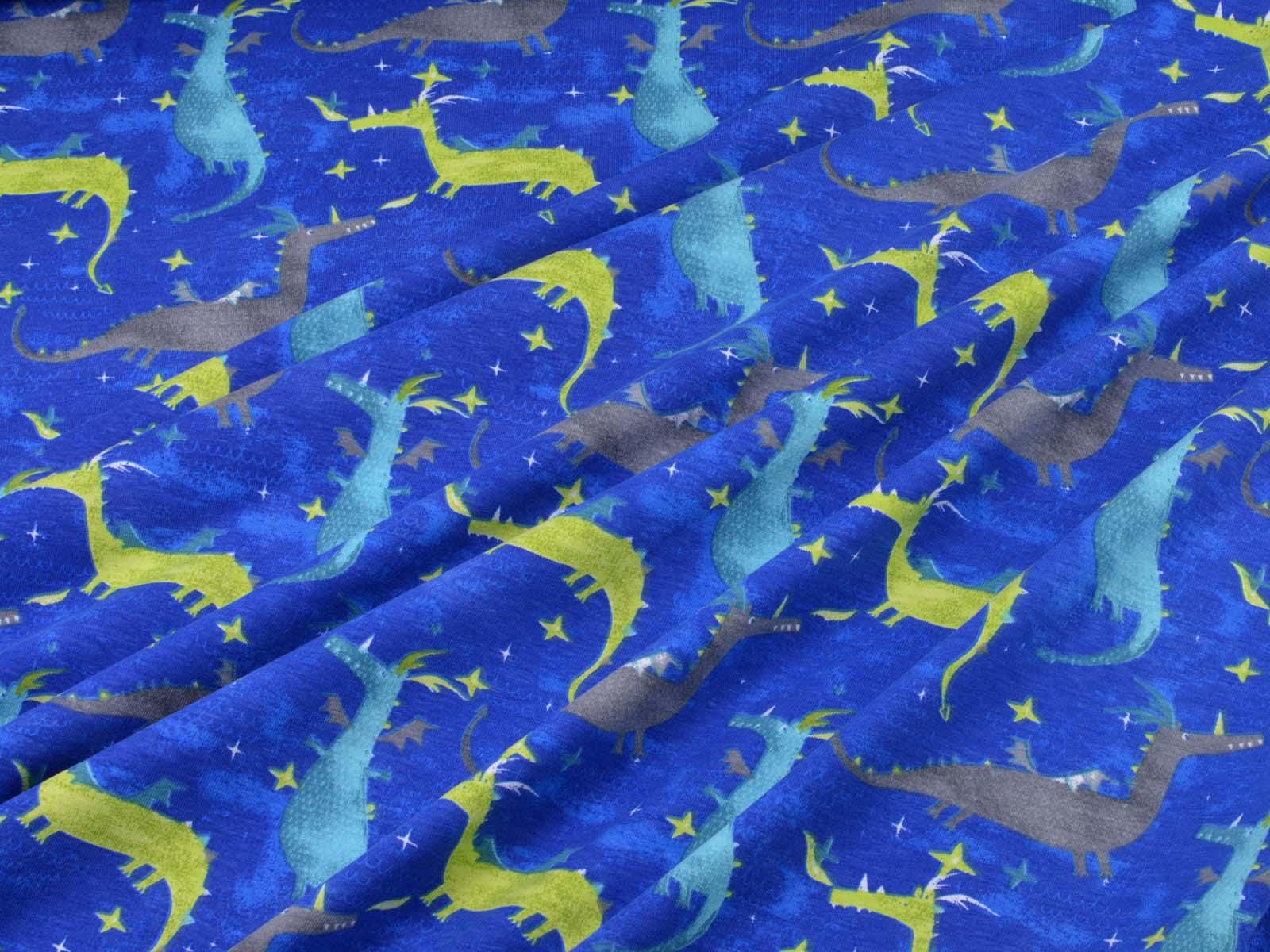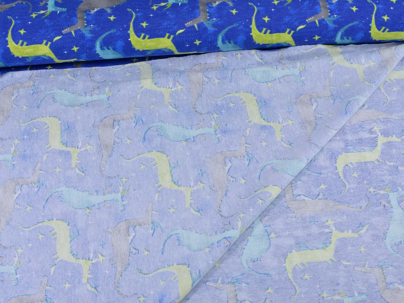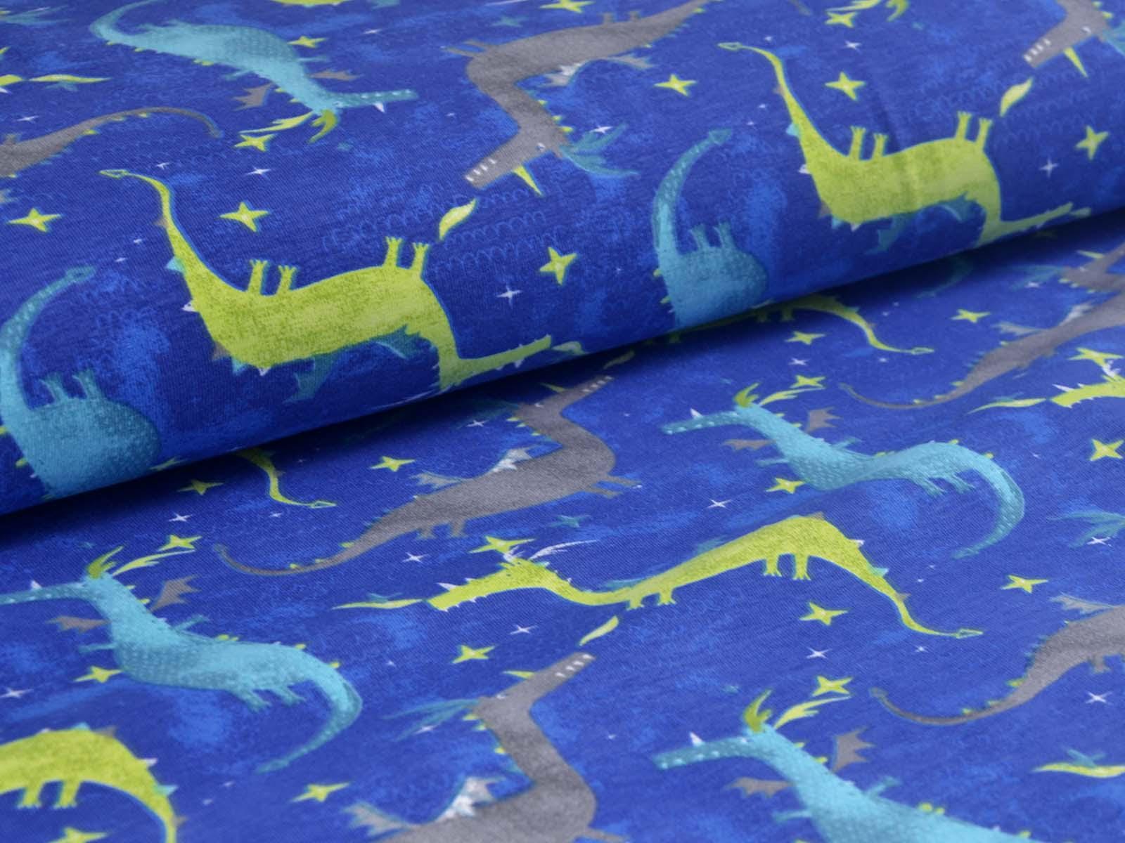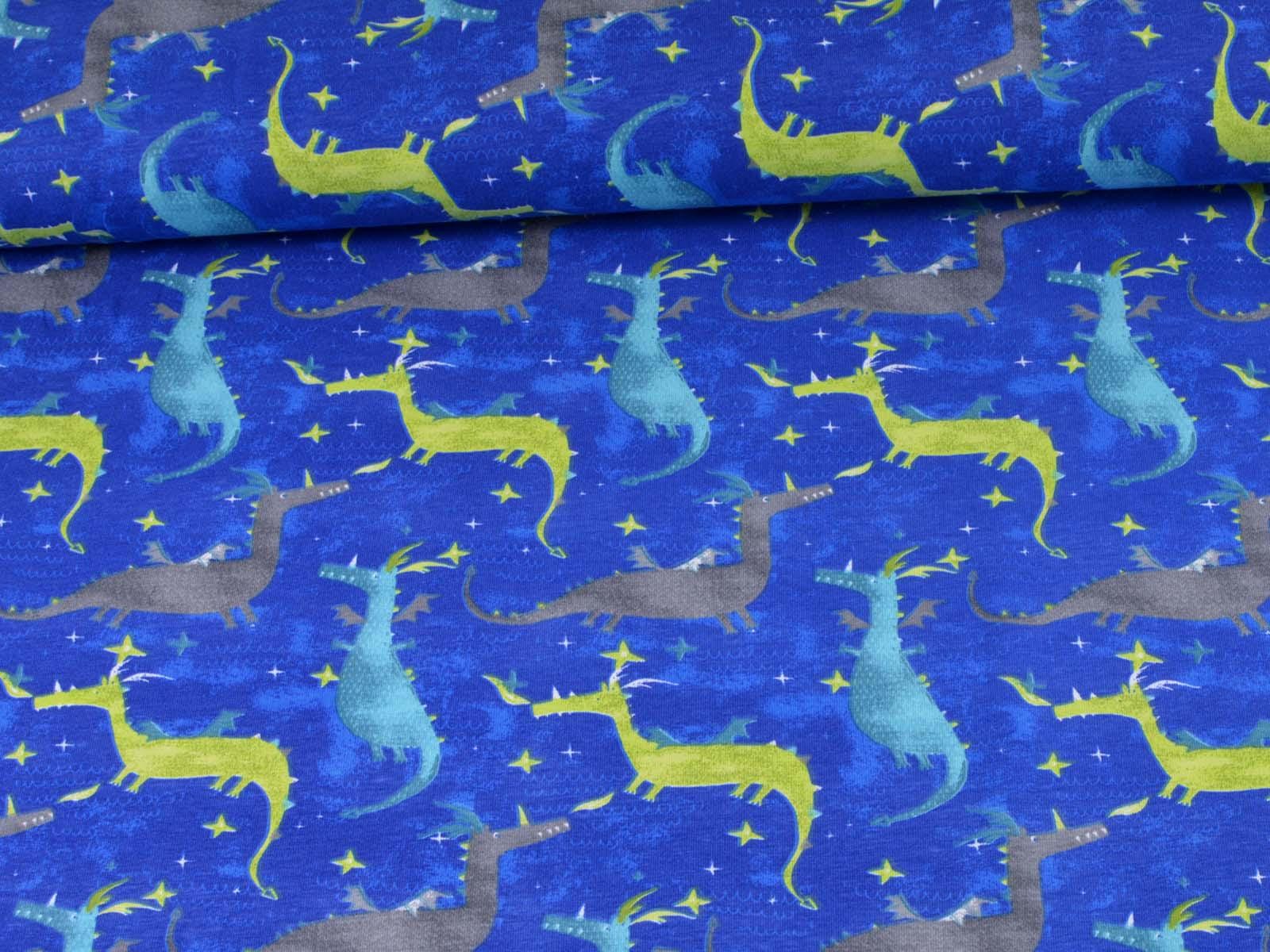 Blauer Baumwolljersey mit grauen, grünen und hellblauen Drachen. Ein Drache ist etwa 14 cm groß. Der Stoff ist glatt und dünn. Er eignet sich wunderbar zum Nähen von T-Shirts, Kleidern, Röcken, Shorts, Pumphosen und vielem mehr.