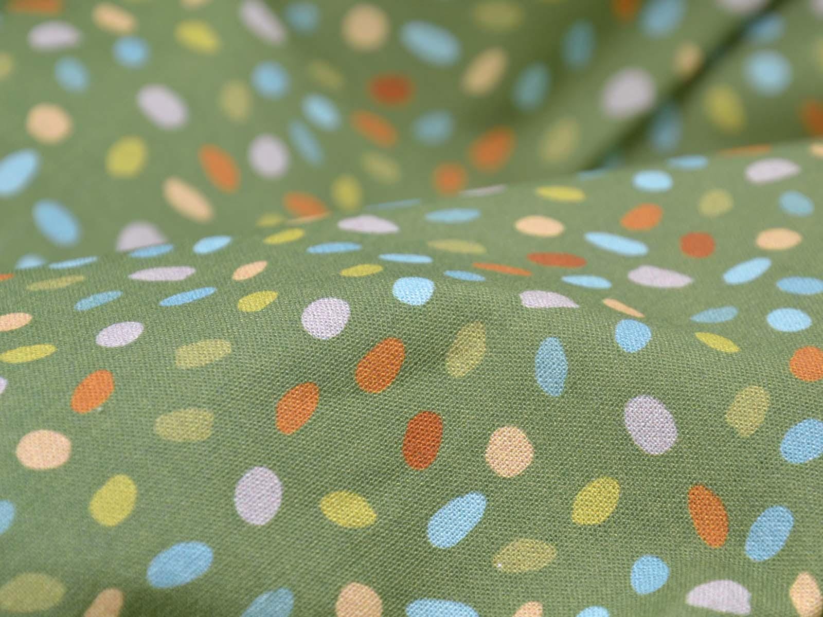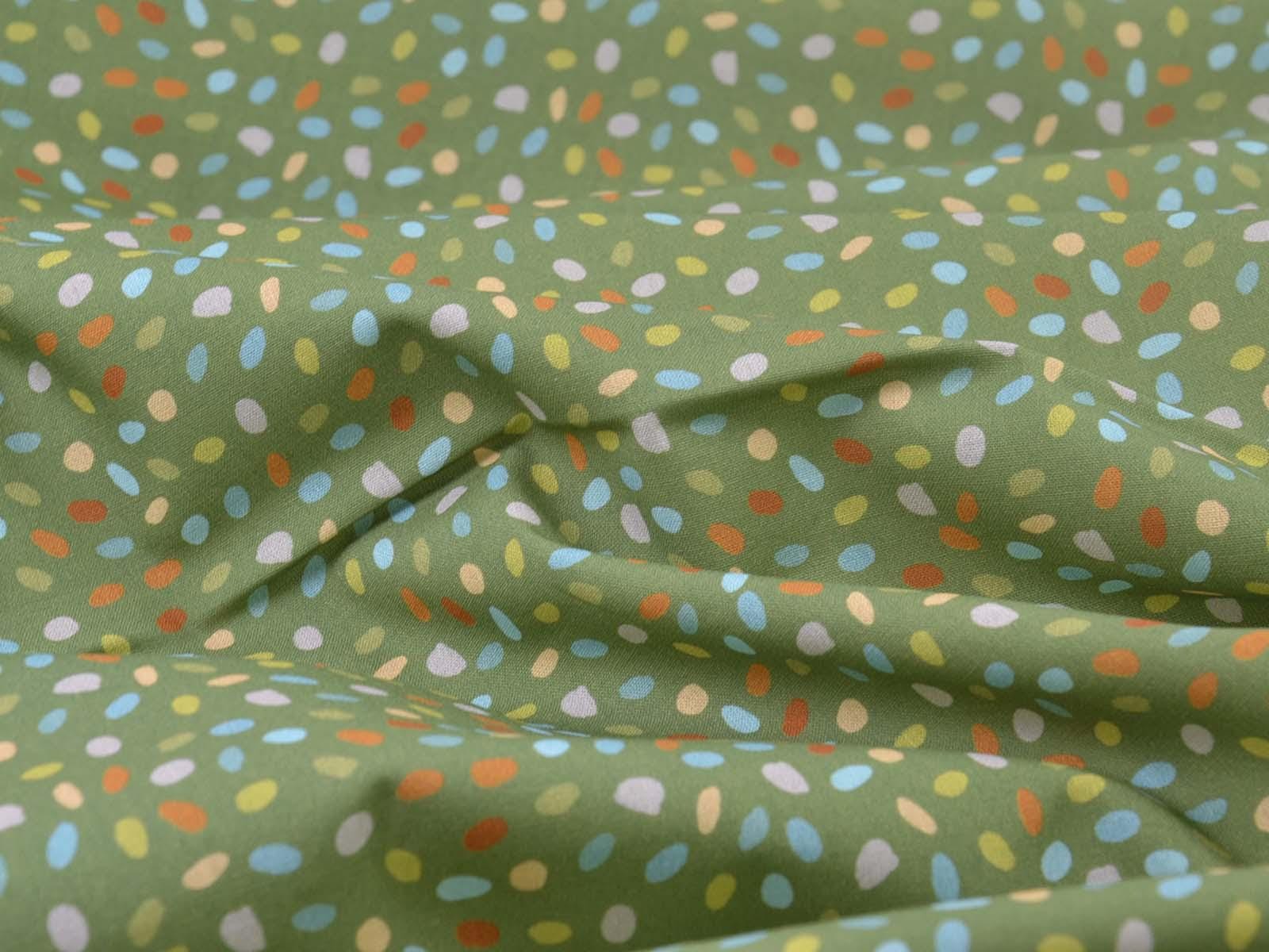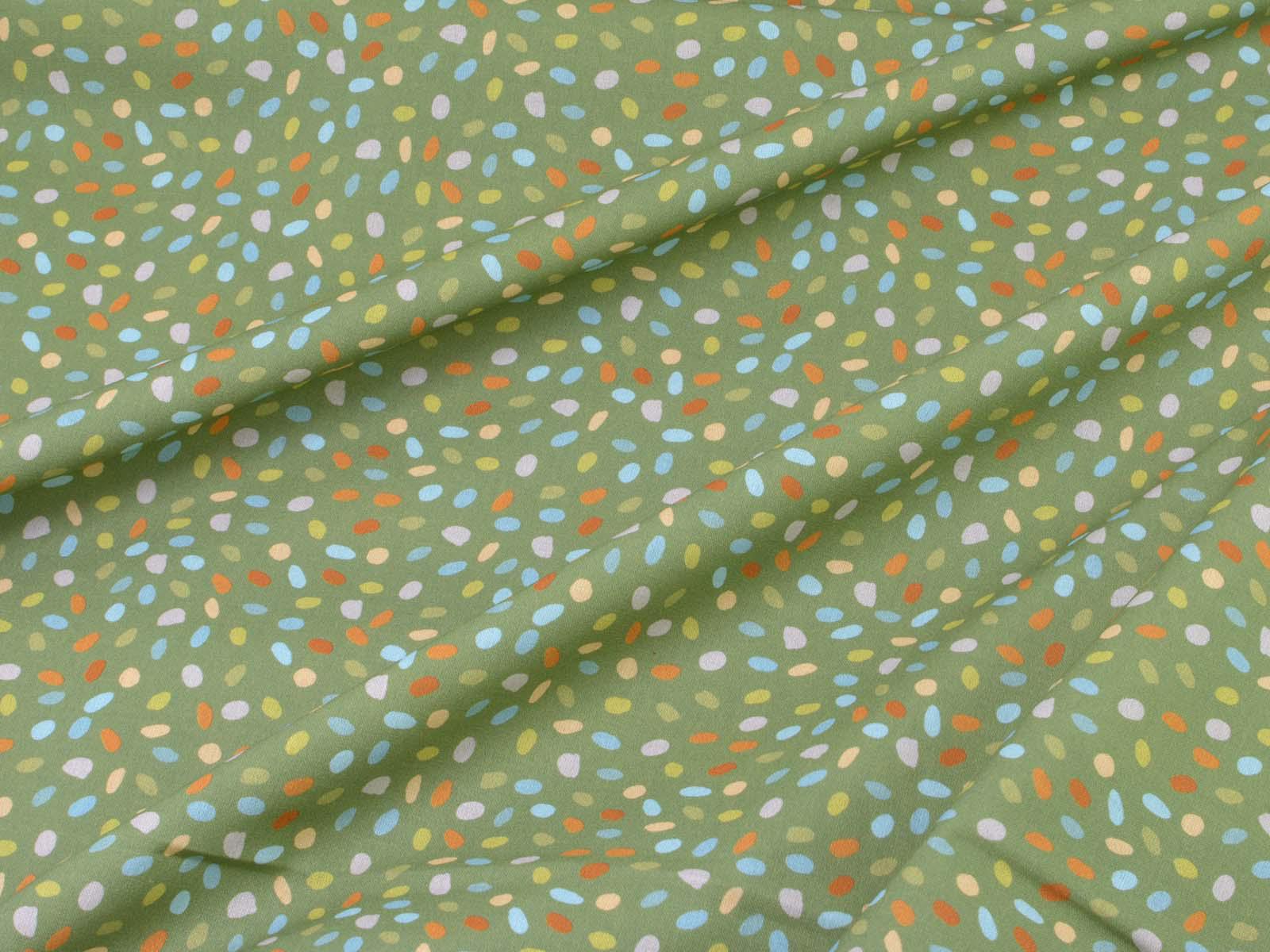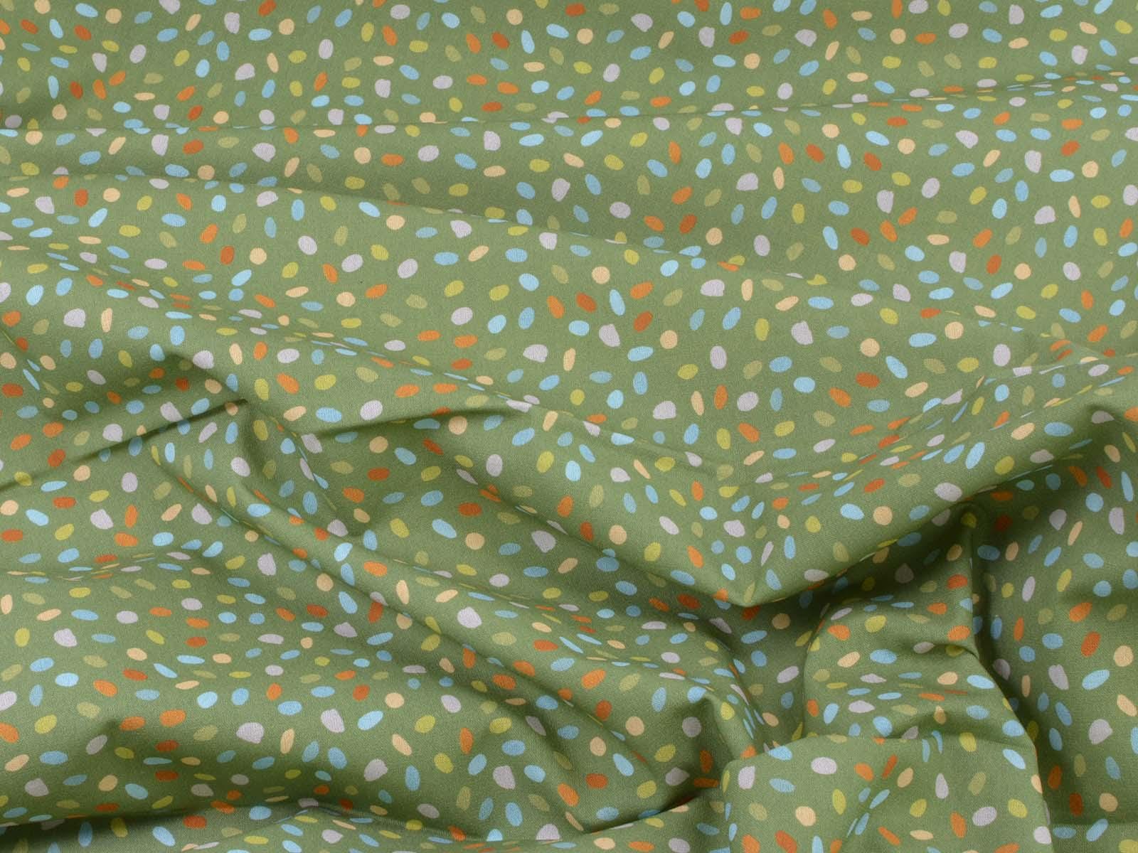 Green cotton fabric with blue, orange, and beige dots. Each dot is approximately 0.6 cm in size. This fabric from Westfalenstoffe is firm and therefore ideal for sewing cushions, bags, patchwork projects, tablecloths, blouses, and much more. It is from the "Göteborg" series. A special feature of Westfalenstoffe's natural fabrics is that they do not fade, even after repeated washing.