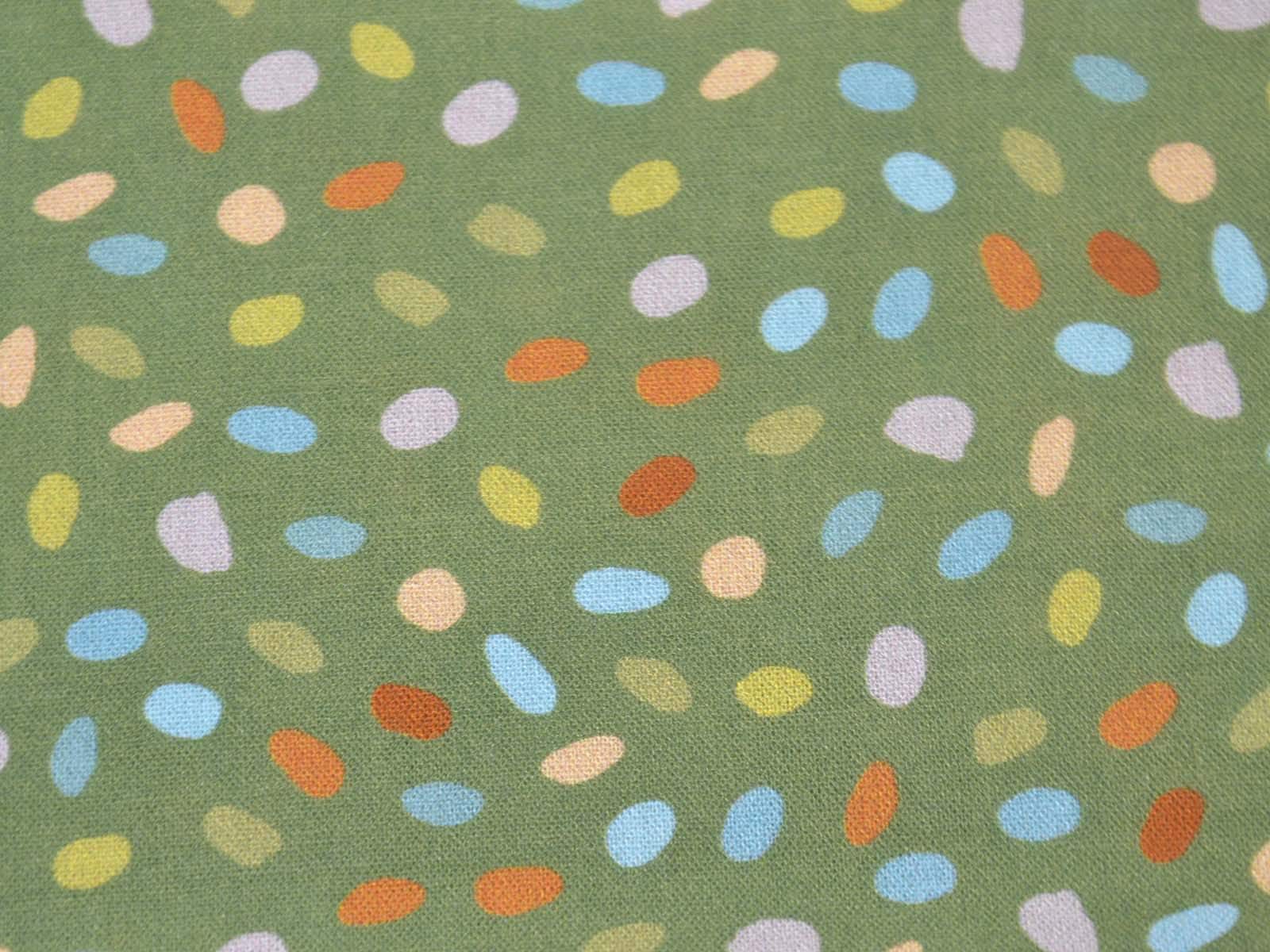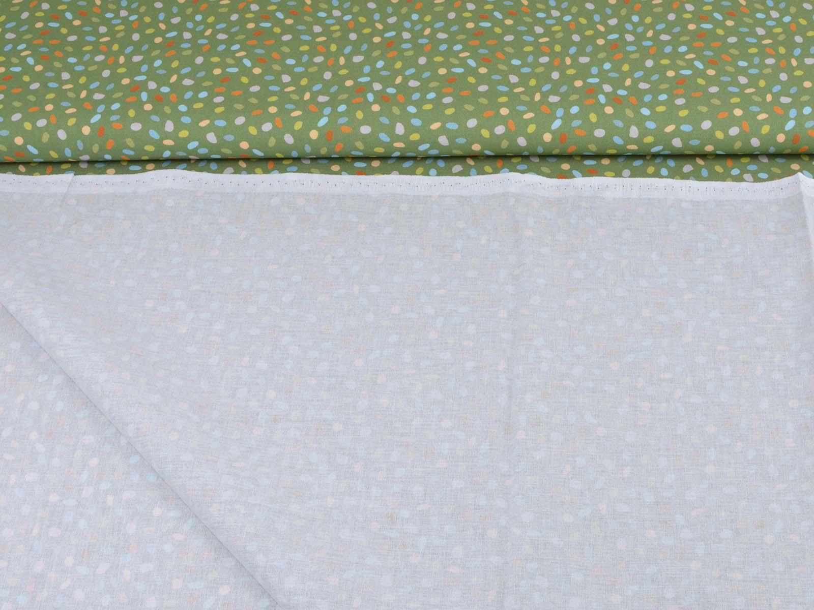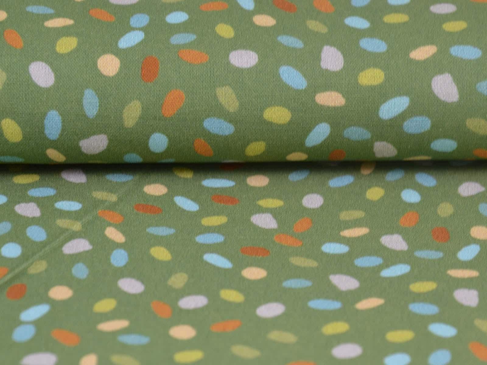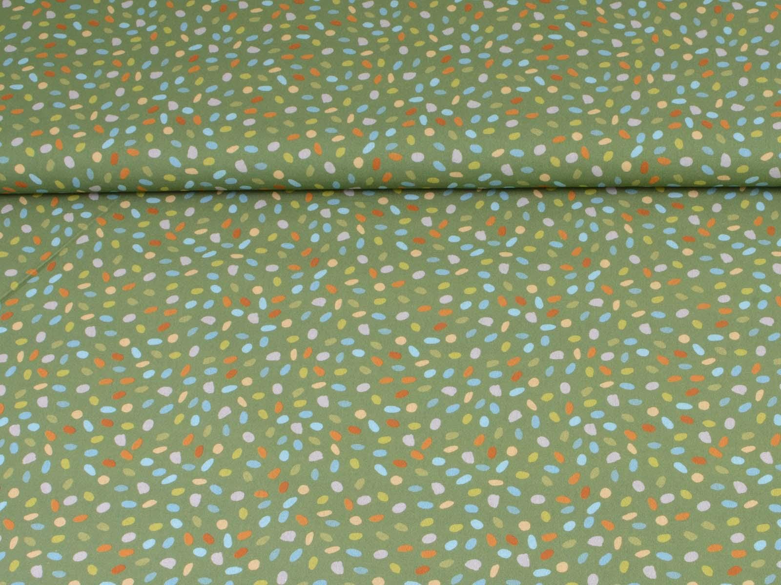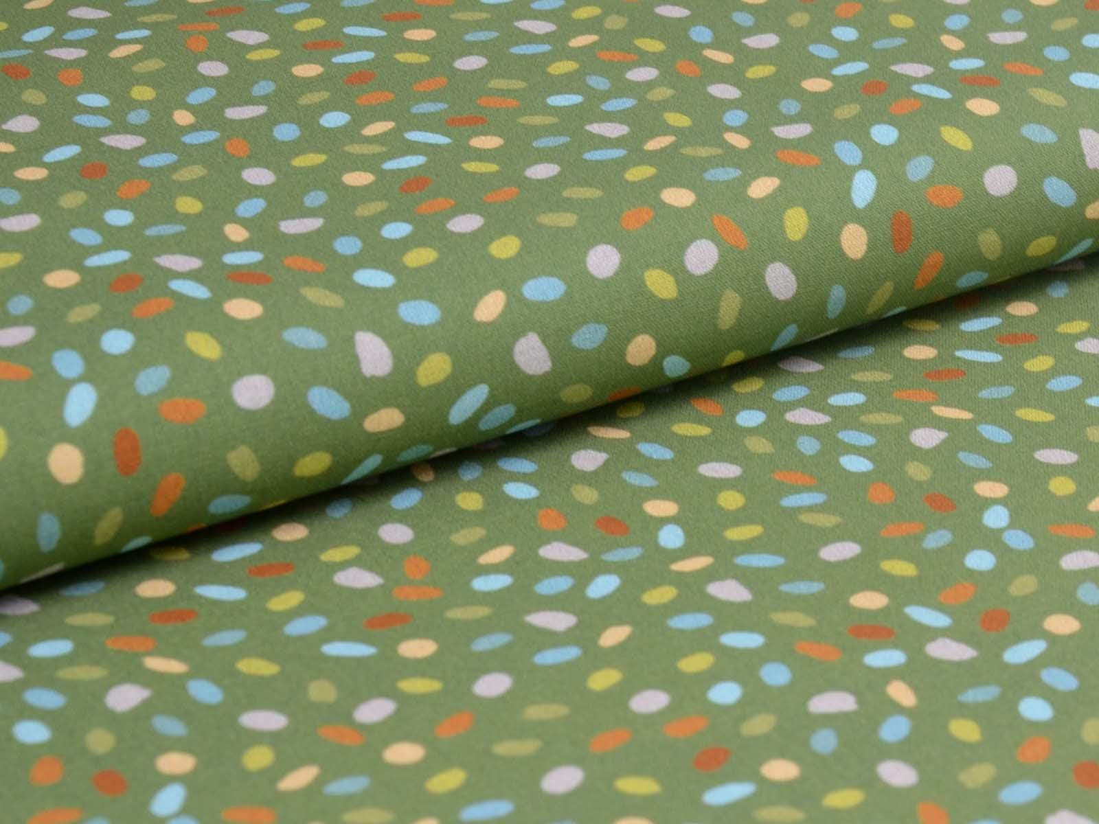 Green cotton fabric with blue, orange, and beige dots. Each dot is approximately 0.6 cm in size. This fabric from Westfalenstoffe is firm and therefore ideal for sewing cushions, bags, patchwork projects, tablecloths, blouses, and much more. It is from the "Göteborg" series. A special feature of Westfalenstoffe's natural fabrics is that they do not fade, even after repeated washing.
