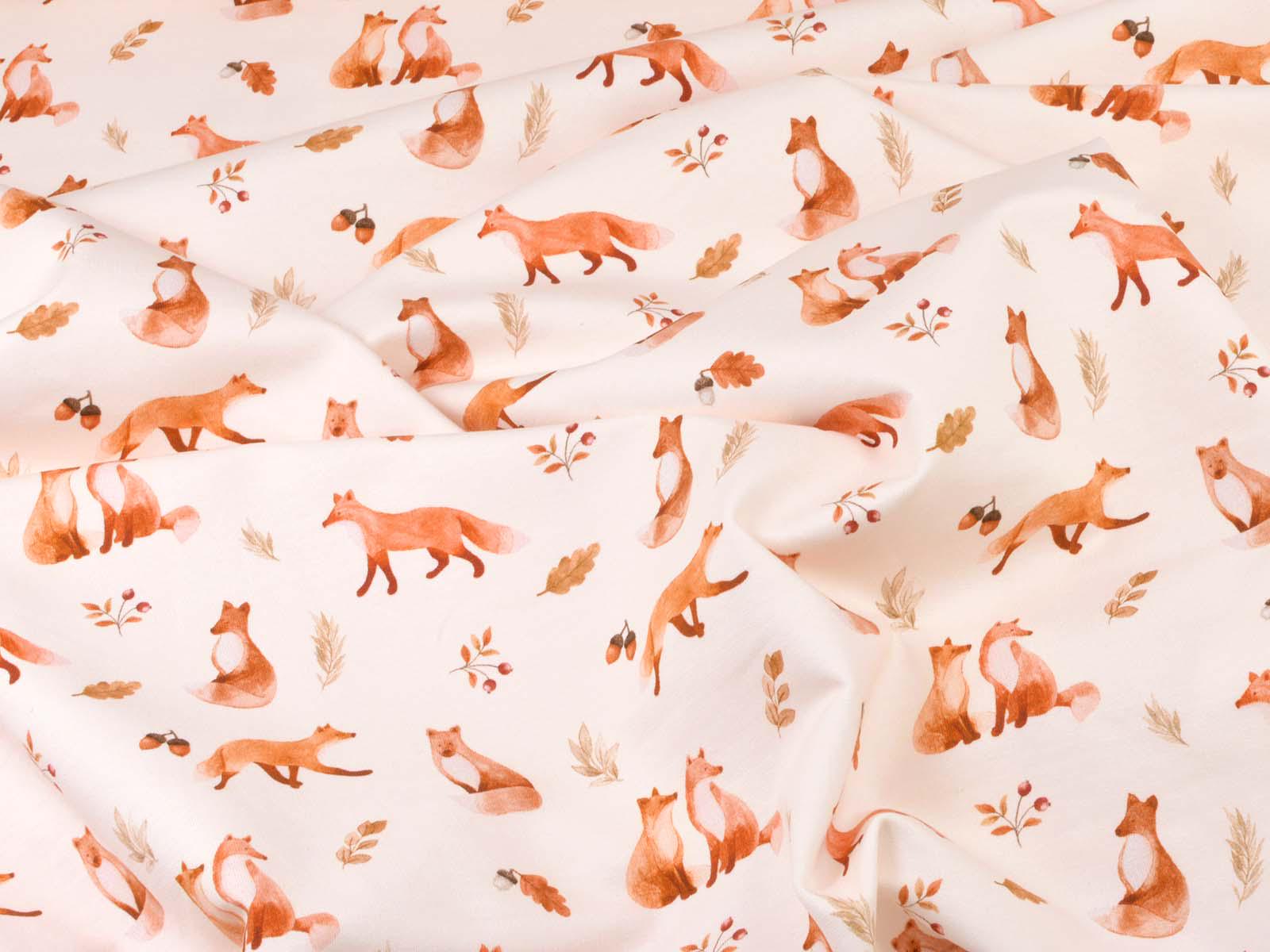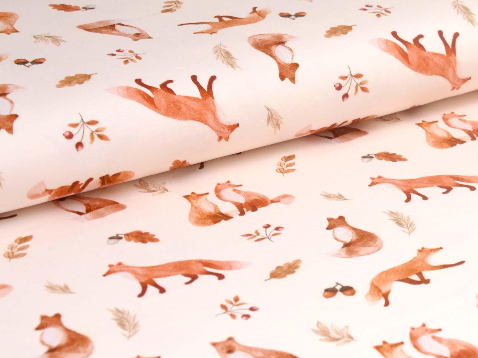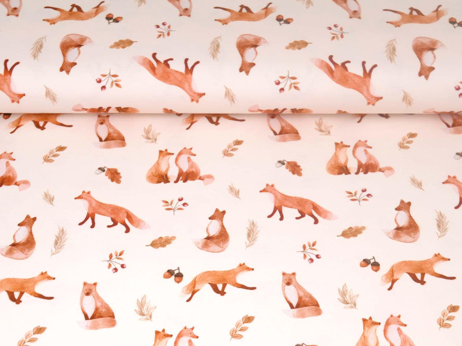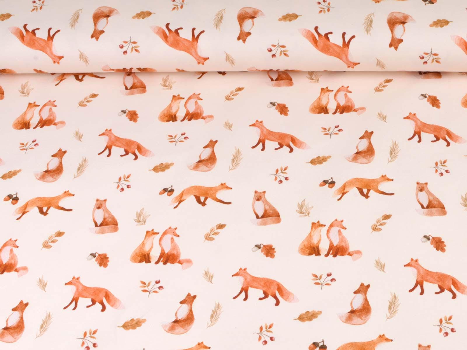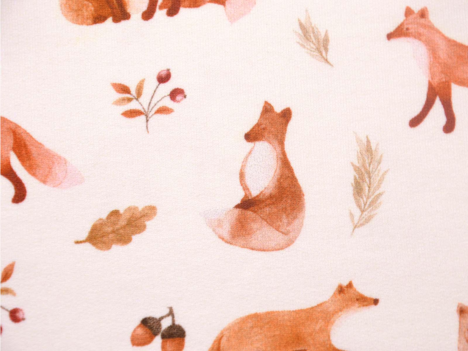 High-quality sweatshirt fabric from Hilco. The fabric is beige with foxes in rust-orange. Each fox is approximately 4 cm tall. The sweatshirt fabric is smooth on the right side and has soft loops on the wrong side. It is suitable for sewing sweaters, comfortable pants, harem pants, sweatshirts, and much more.