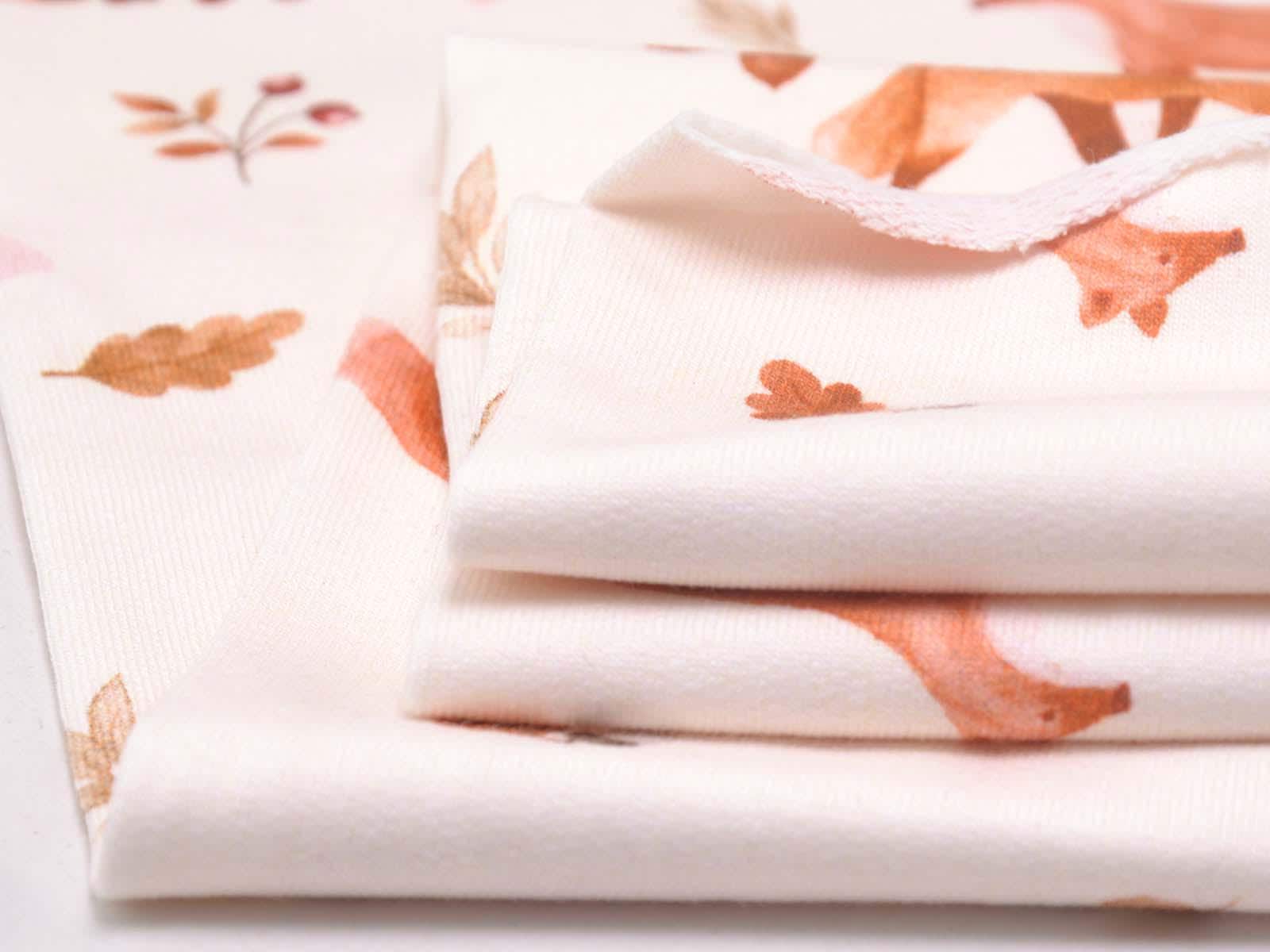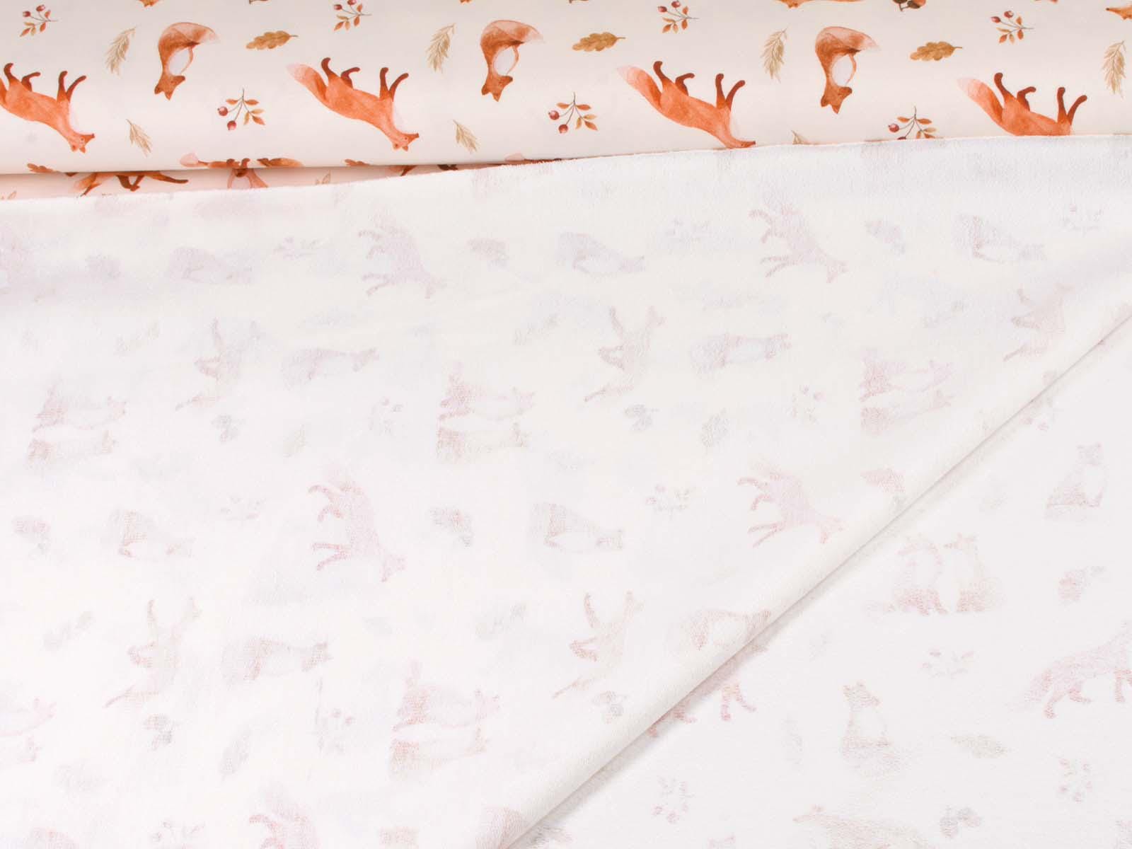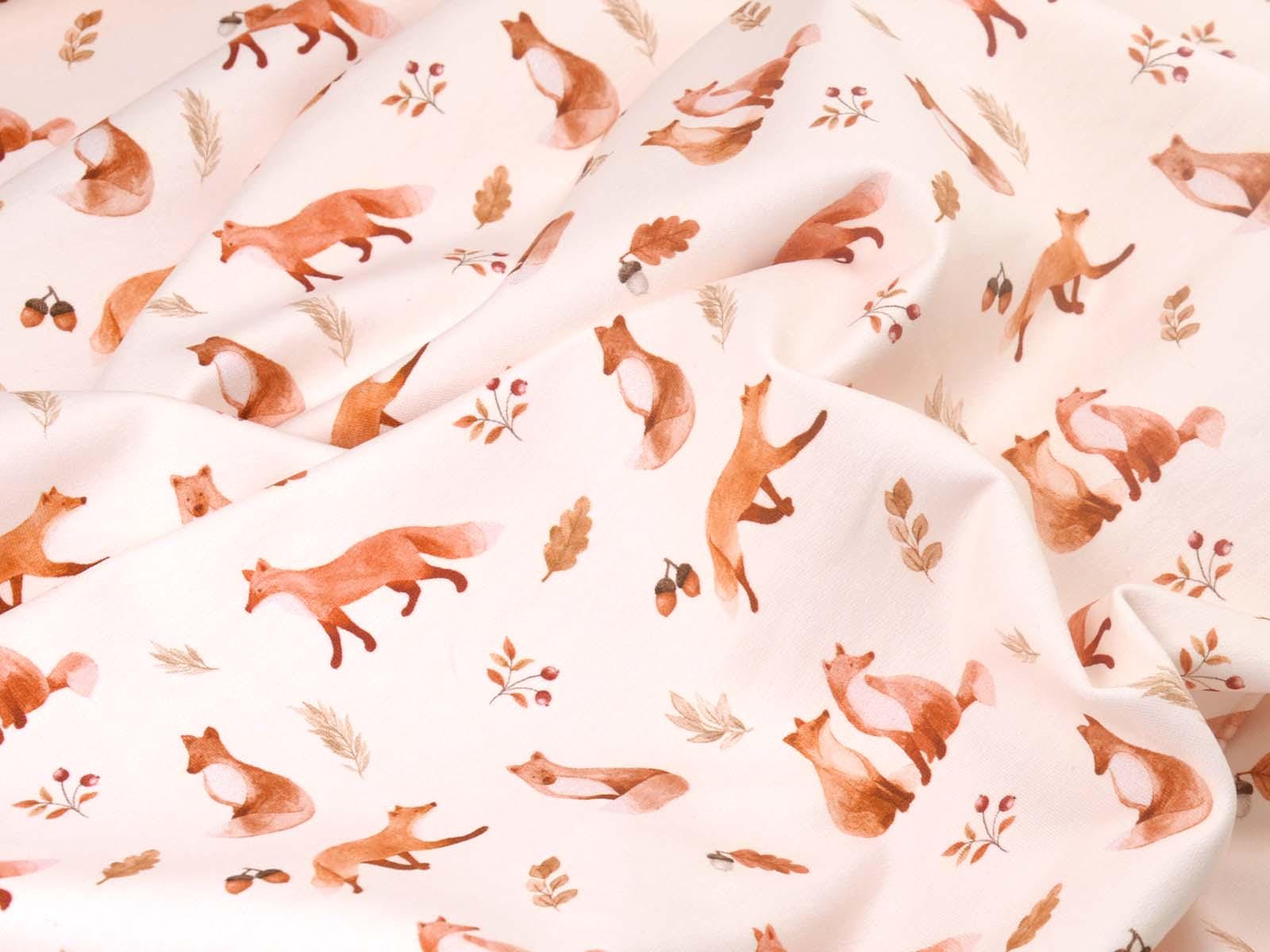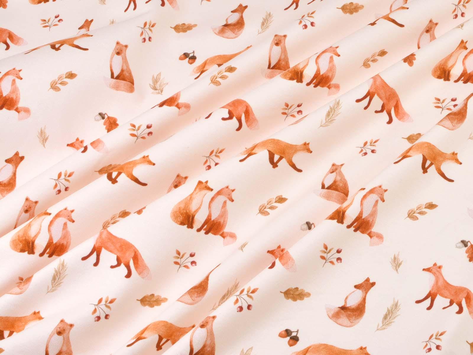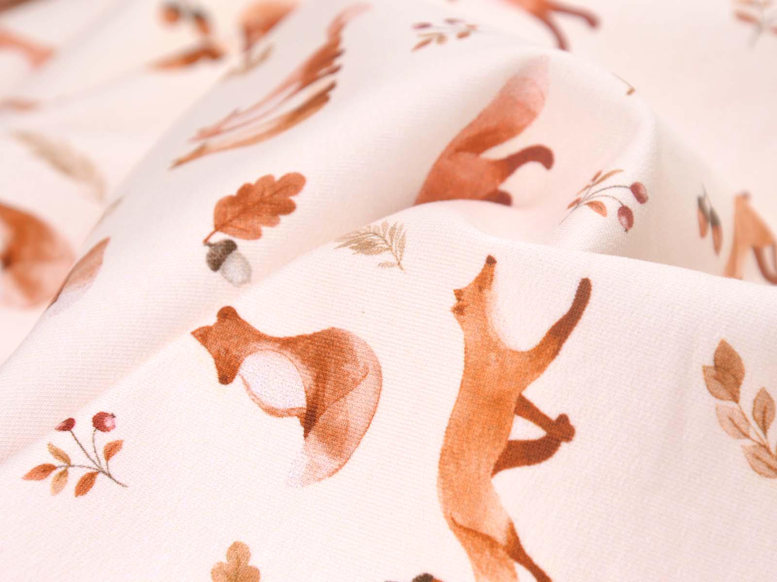 High-quality sweatshirt fabric from Hilco. The fabric is beige with foxes in rust-orange. Each fox is approximately 4 cm tall. The sweatshirt fabric is smooth on the right side and has soft loops on the wrong side. It is suitable for sewing sweaters, comfortable pants, harem pants, sweatshirts, and much more.