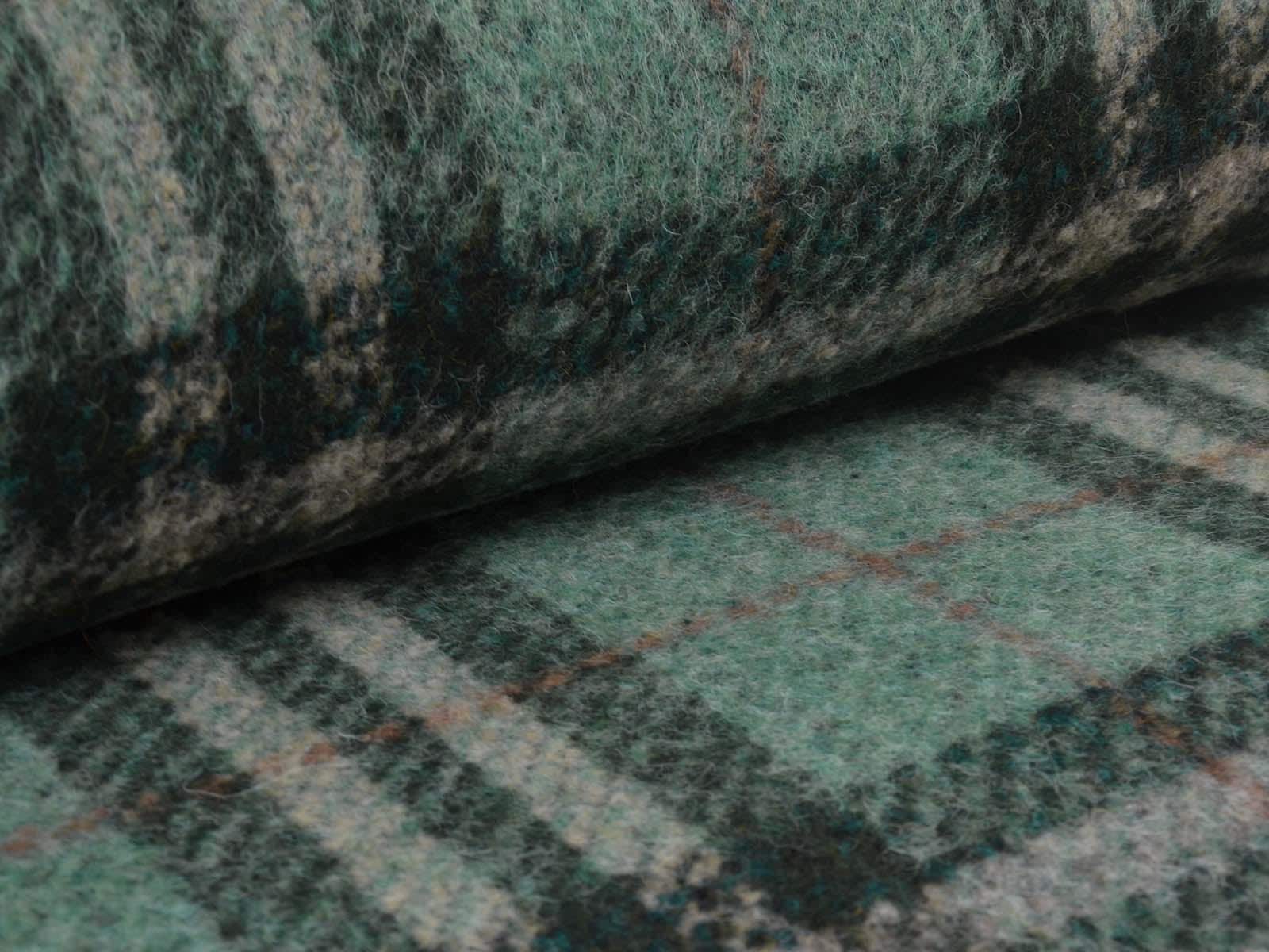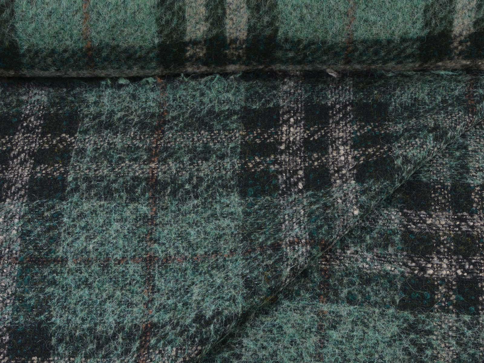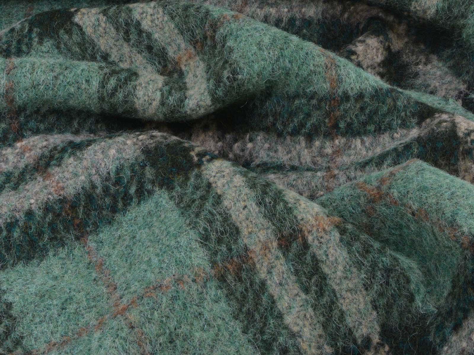 Very high-quality coat fabric made of wool, alpaca, and polyester from Hilco. The felted woven fabric is green with a check pattern. Each check measures approximately 17 cm high and 14 cm wide. The fabric is felted on the right side and woven on the wrong side. It is suitable for sewing skirts, jackets, vests, coats, and much more.