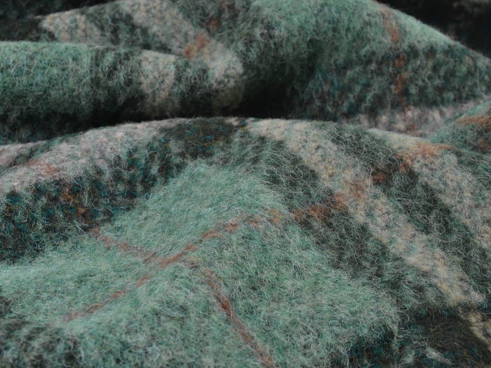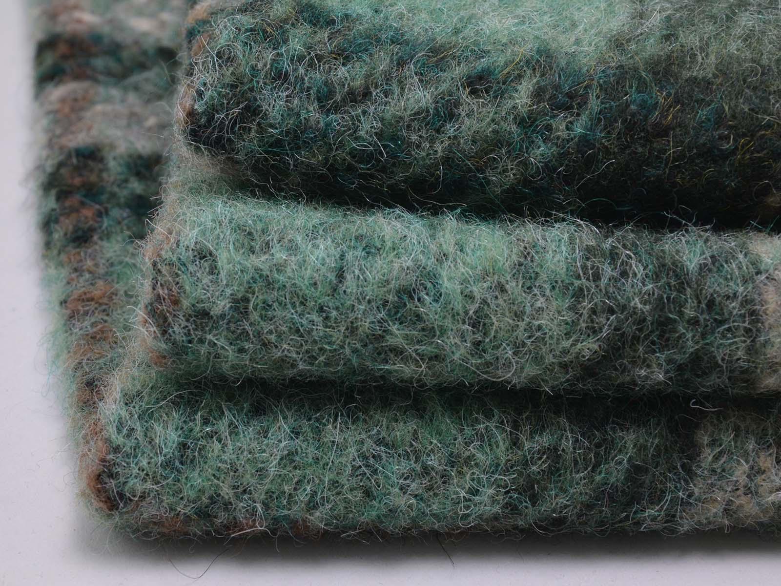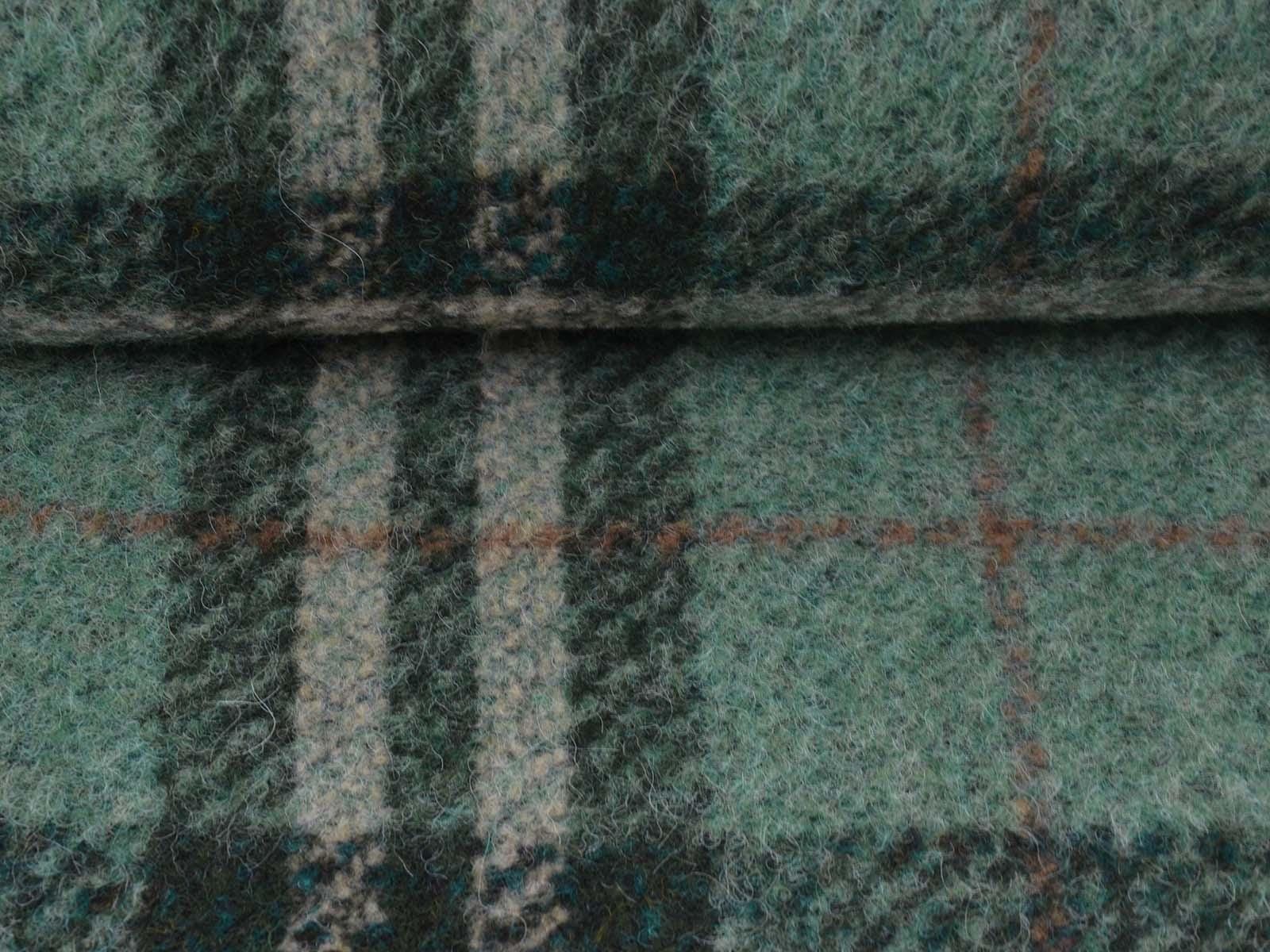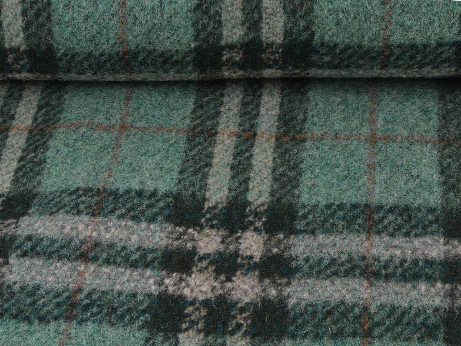 Very high-quality coat fabric made of wool, alpaca, and polyester from Hilco. The felted woven fabric is green with a check pattern. Each check measures approximately 17 cm high and 14 cm wide. The fabric is felted on the right side and woven on the wrong side. It is suitable for sewing skirts, jackets, vests, coats, and much more.