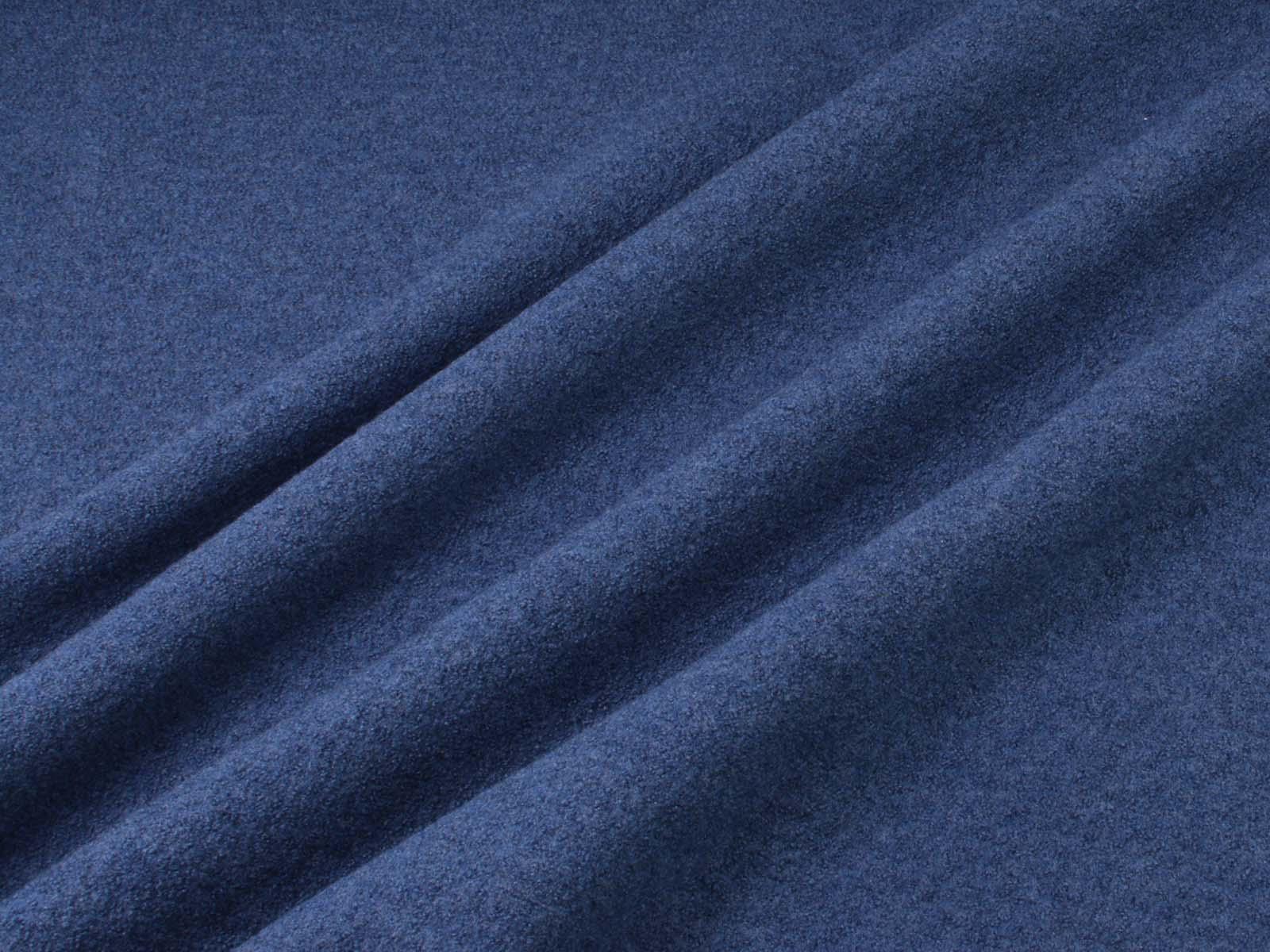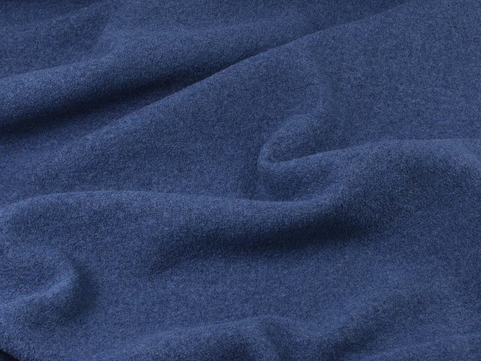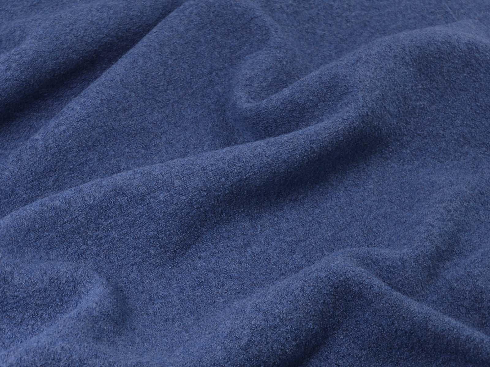 Thin, denim-blue merino wool boiled wool fabric from Hilco. The fabric feels soft and has a slightly grainy texture. You can use it to sew jackets, vests, coats, warm skirts, children's overalls, and so much more.