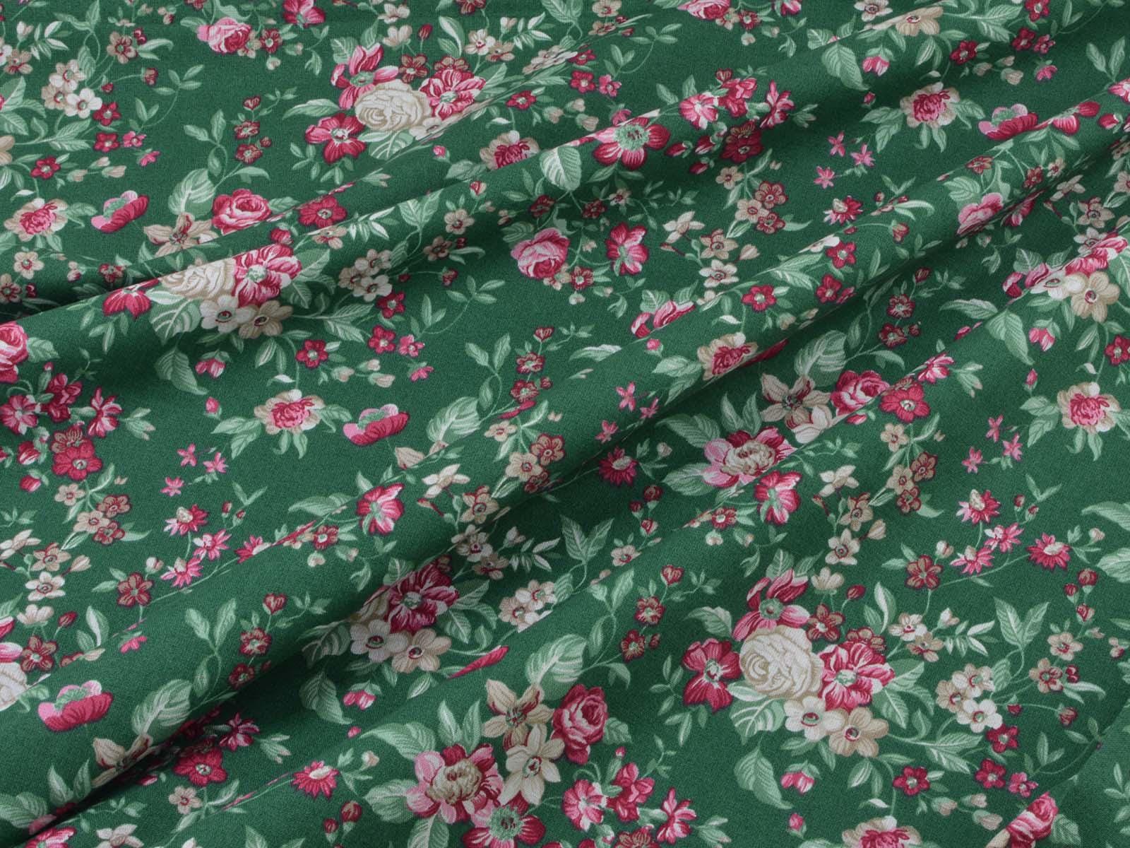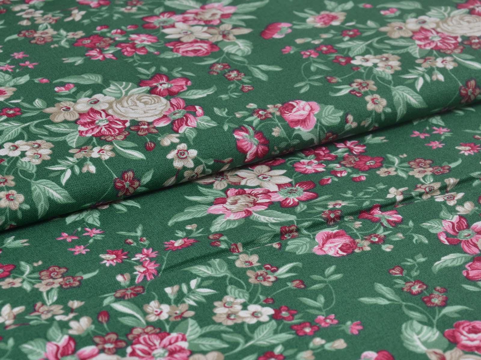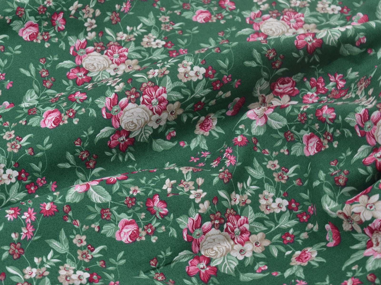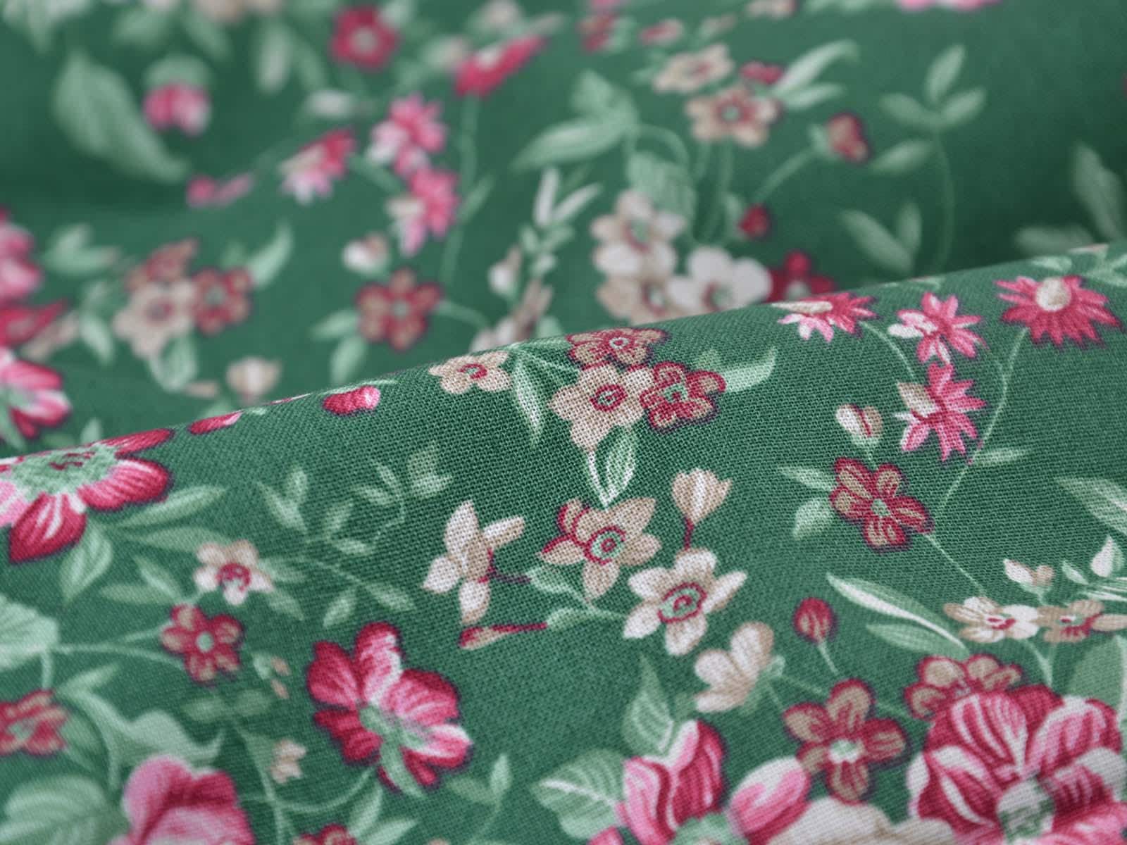 Dark green cotton fabric with roses and flowers in pink and cream-white from Westfalenstoffe. Each large rose is approximately 2.5 cm across. The fabric is from the "Trondheim" collection. It is perfect for sewing tablecloths, bags, patchwork projects, dresses, and much more. A special feature of Westfalenstoffe's natural fabrics is that they do not fade, even after repeated washing.