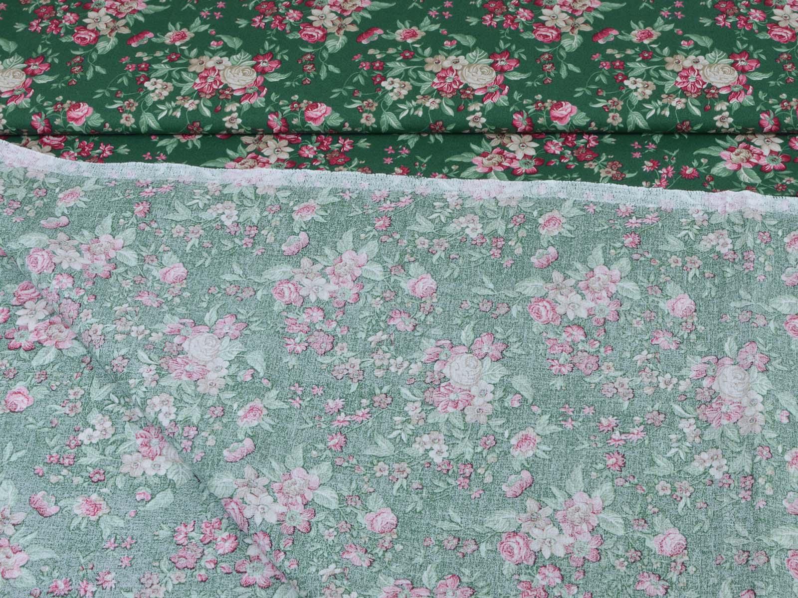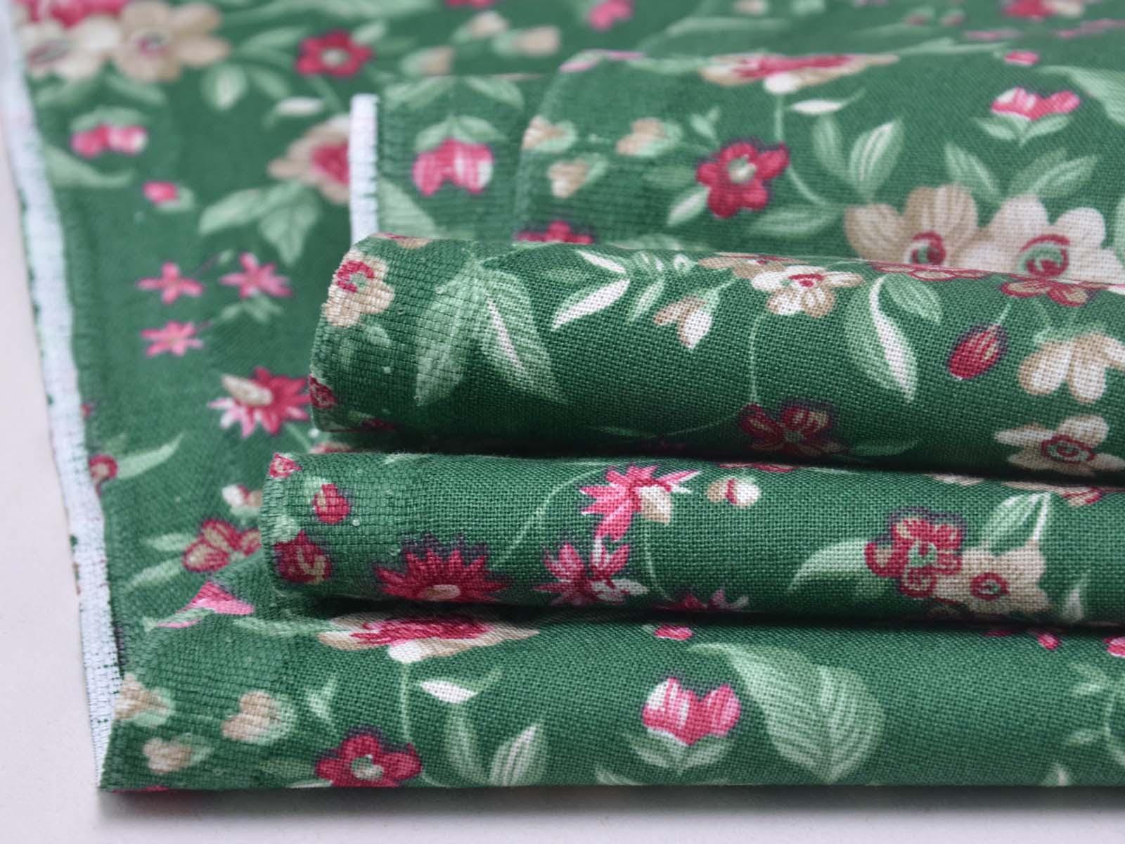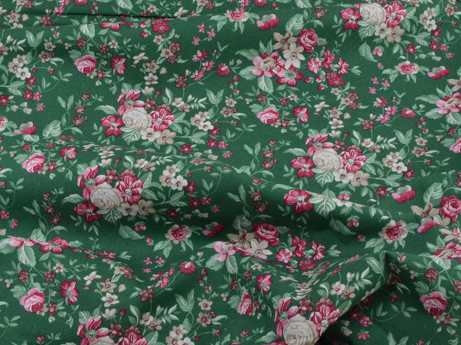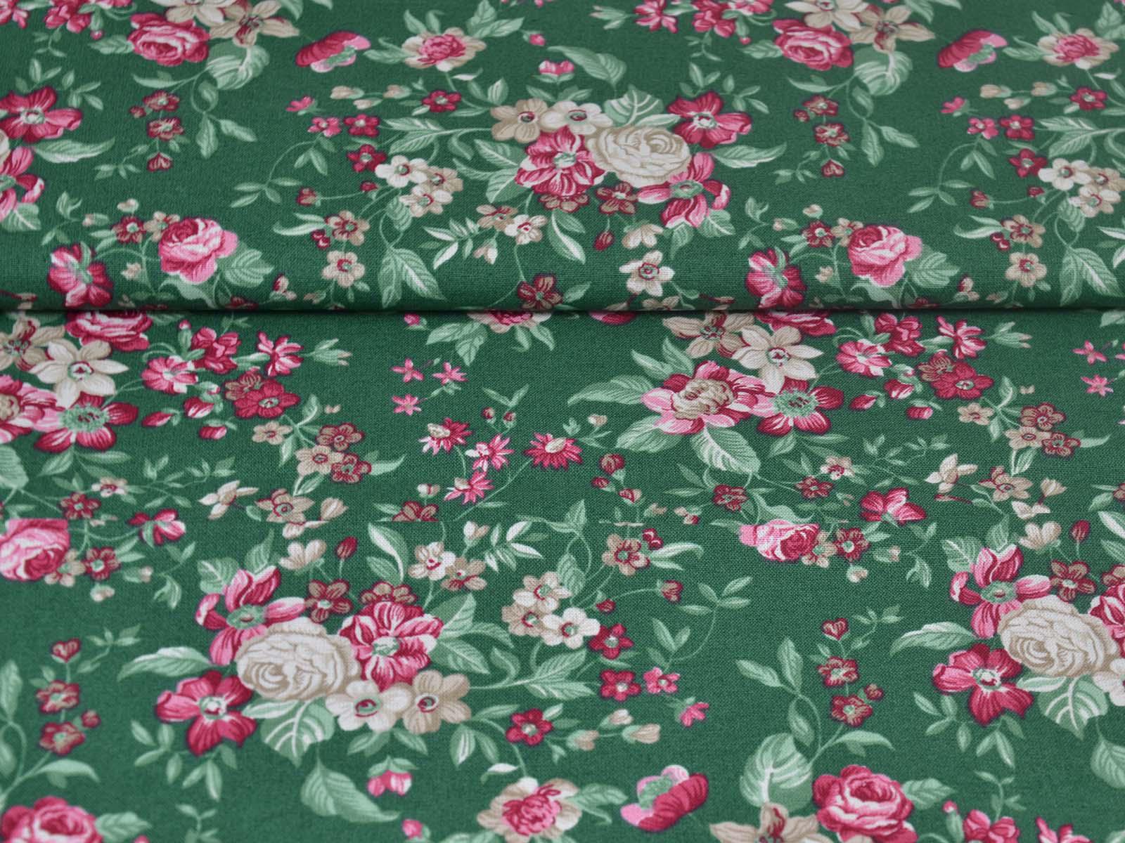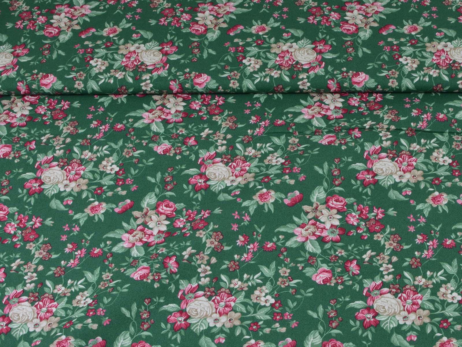Dark green cotton fabric with roses and flowers in pink and cream-white from Westfalenstoffe. Each large rose is approximately 2.5 cm across. The fabric is from the "Trondheim" collection. It is perfect for sewing tablecloths, bags, patchwork projects, dresses, and much more. A special feature of Westfalenstoffe's natural fabrics is that they do not fade, even after repeated washing.