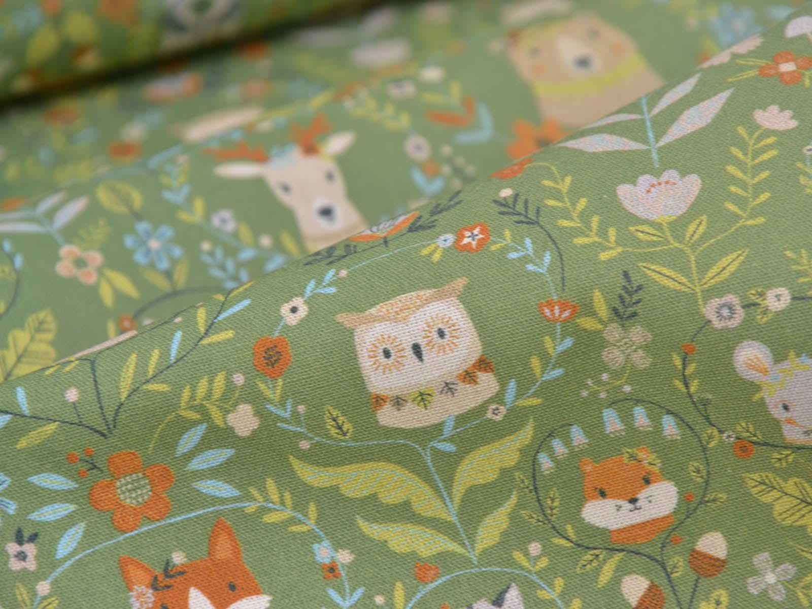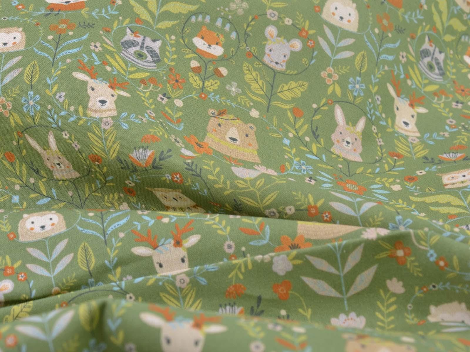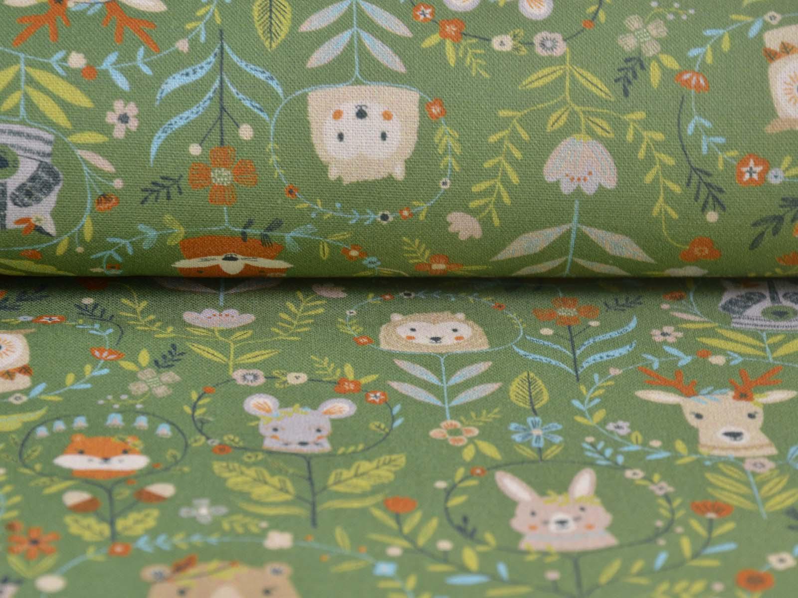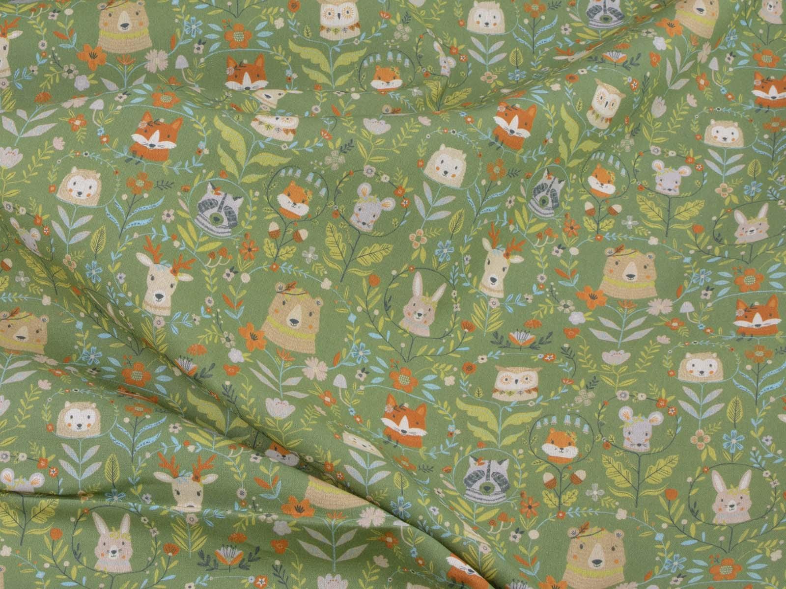 Green cotton fabric featuring various forest animals and flowers. Each fox is approximately 2.5 cm tall. This Westfalenstoffe fabric is sturdy and therefore ideal for sewing cushions, bags, patchwork projects, tablecloths, blouses, and much more. It is from the "Göteborg" series. A special feature of Westfalenstoffe's natural fabrics is that they do not fade, even after repeated washing.