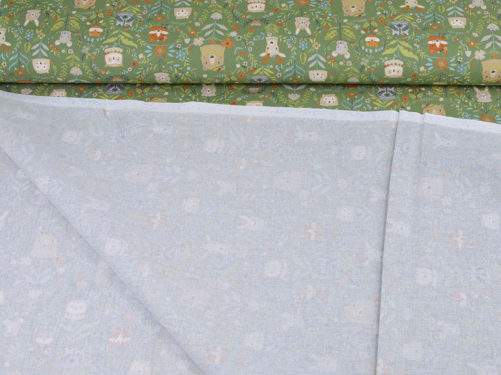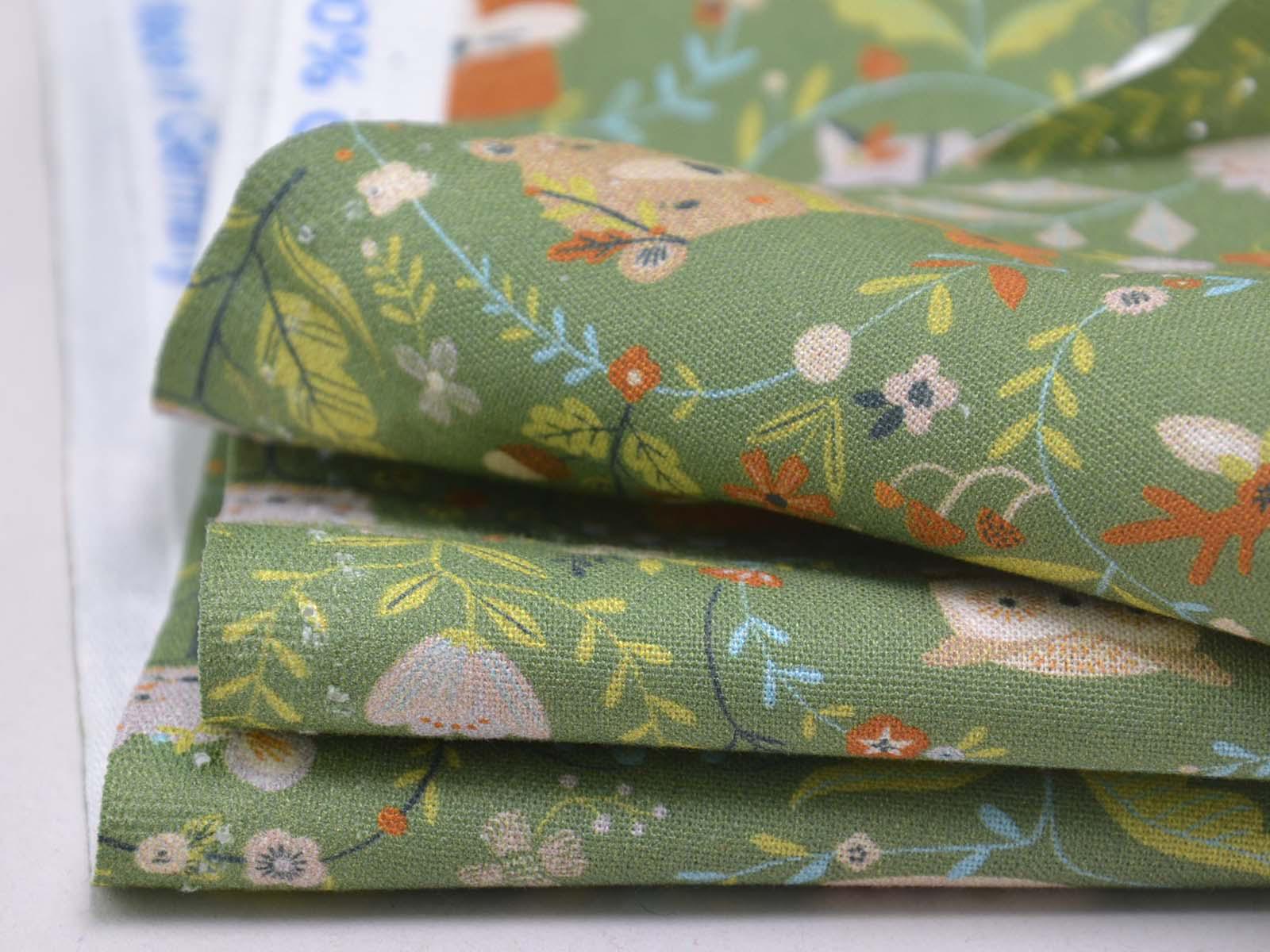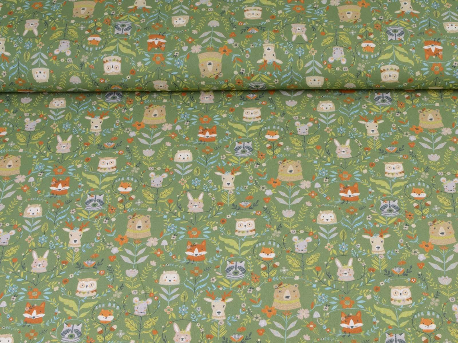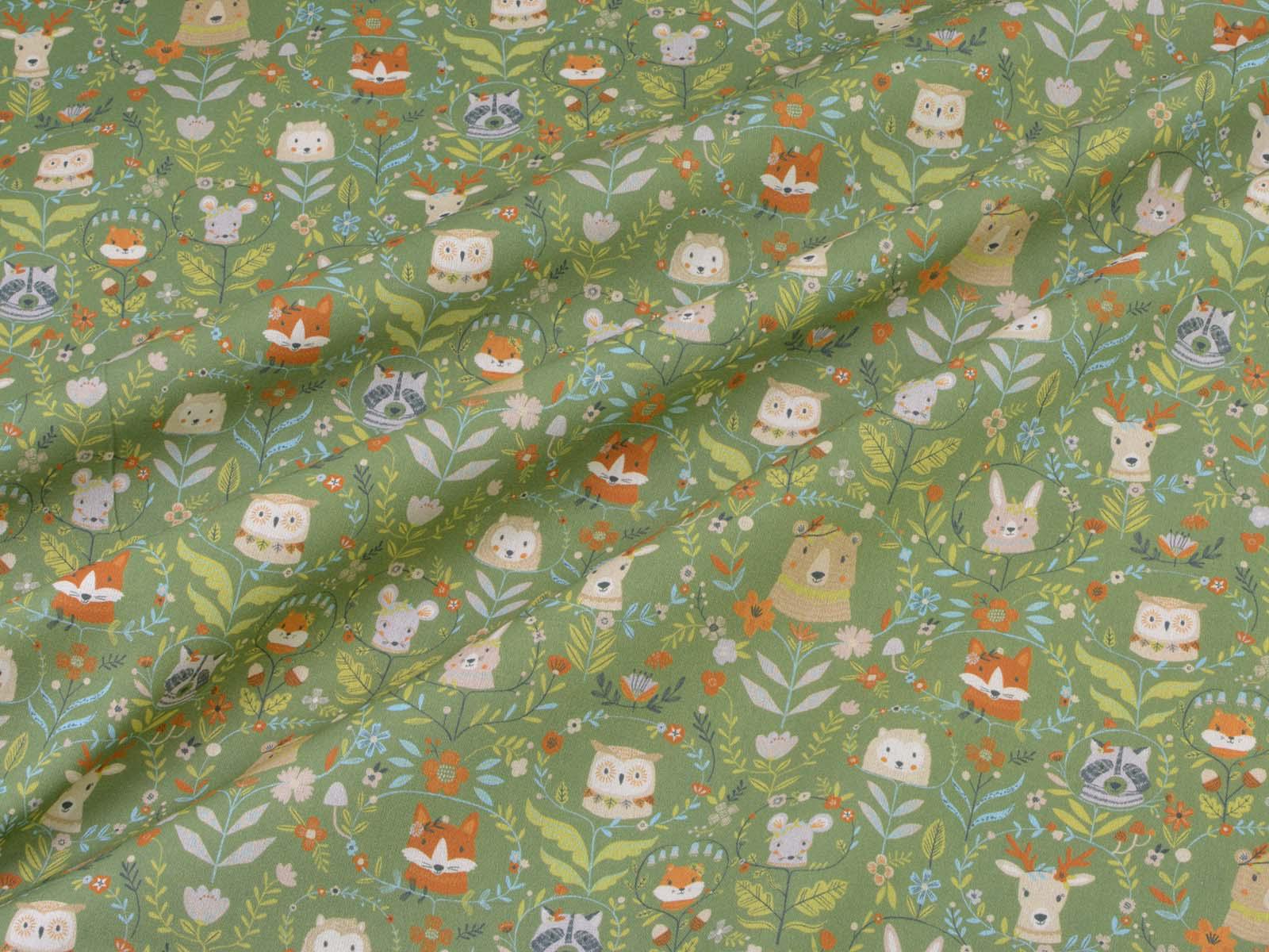 Green cotton fabric featuring various forest animals and flowers. Each fox is approximately 2.5 cm tall. This Westfalenstoffe fabric is sturdy and therefore ideal for sewing cushions, bags, patchwork projects, tablecloths, blouses, and much more. It is from the "Göteborg" series. A special feature of Westfalenstoffe's natural fabrics is that they do not fade, even after repeated washing.