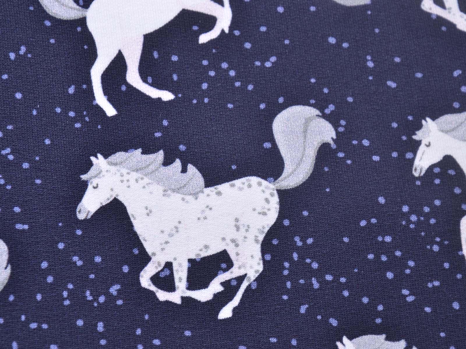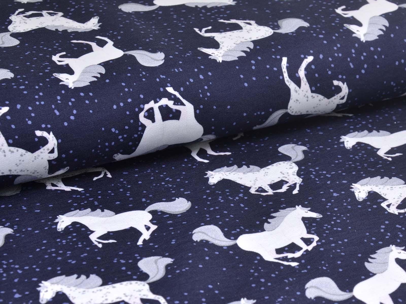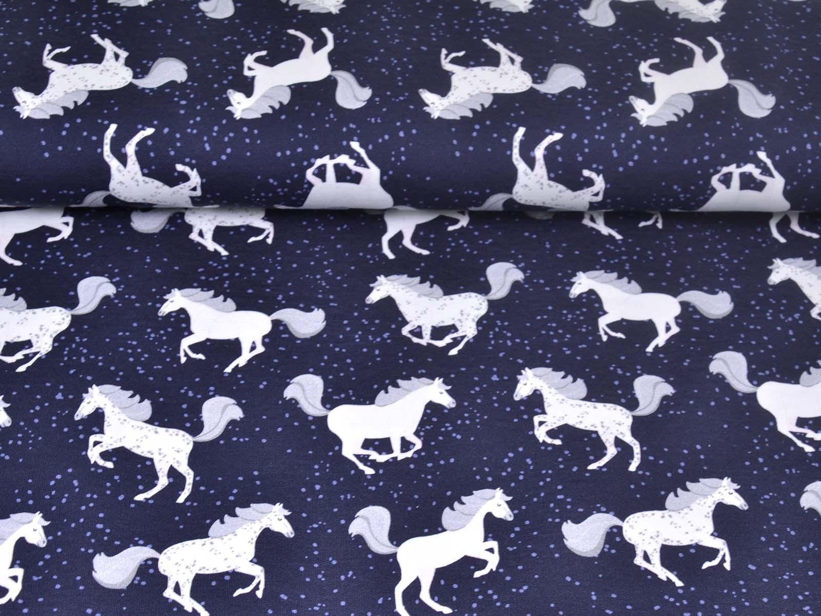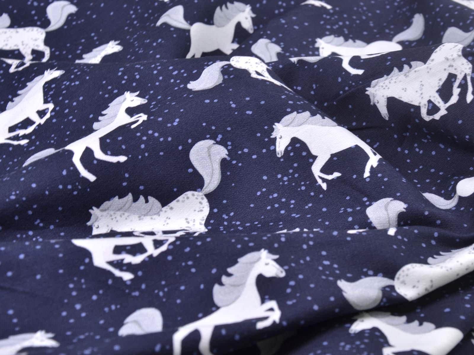 High-quality sweatshirt fabric from Hilco. The fabric is dark blue with white horses and blue speckles. Each horse is approximately 5 cm tall. The fabric is smooth on the right side and has soft loops on the wrong side. It is suitable for sewing sweaters, comfortable pants, harem pants, sweatshirts, and much more.