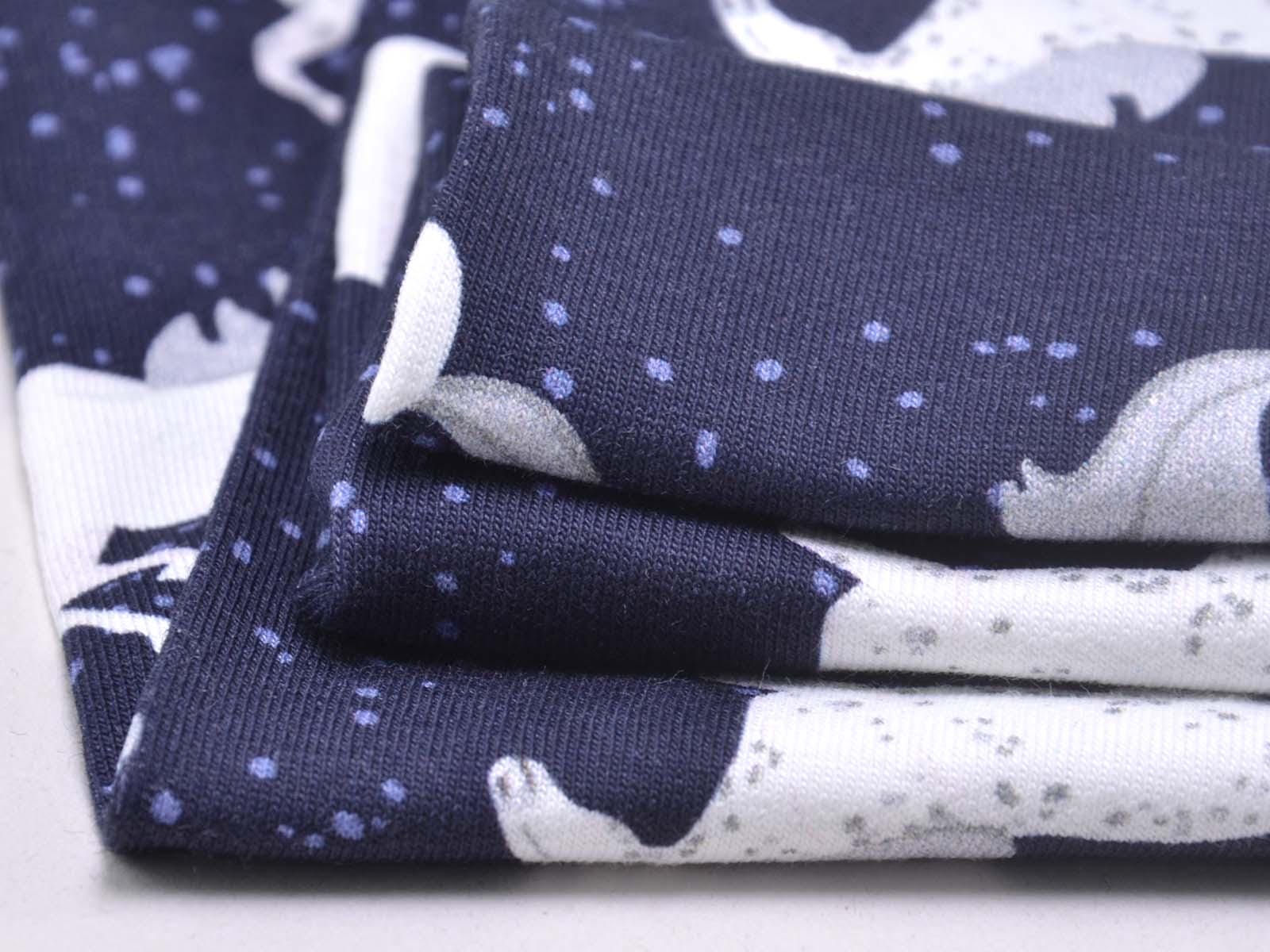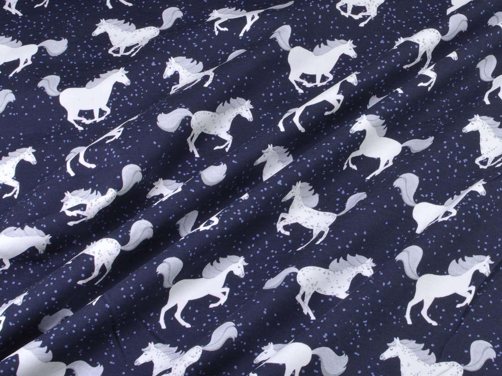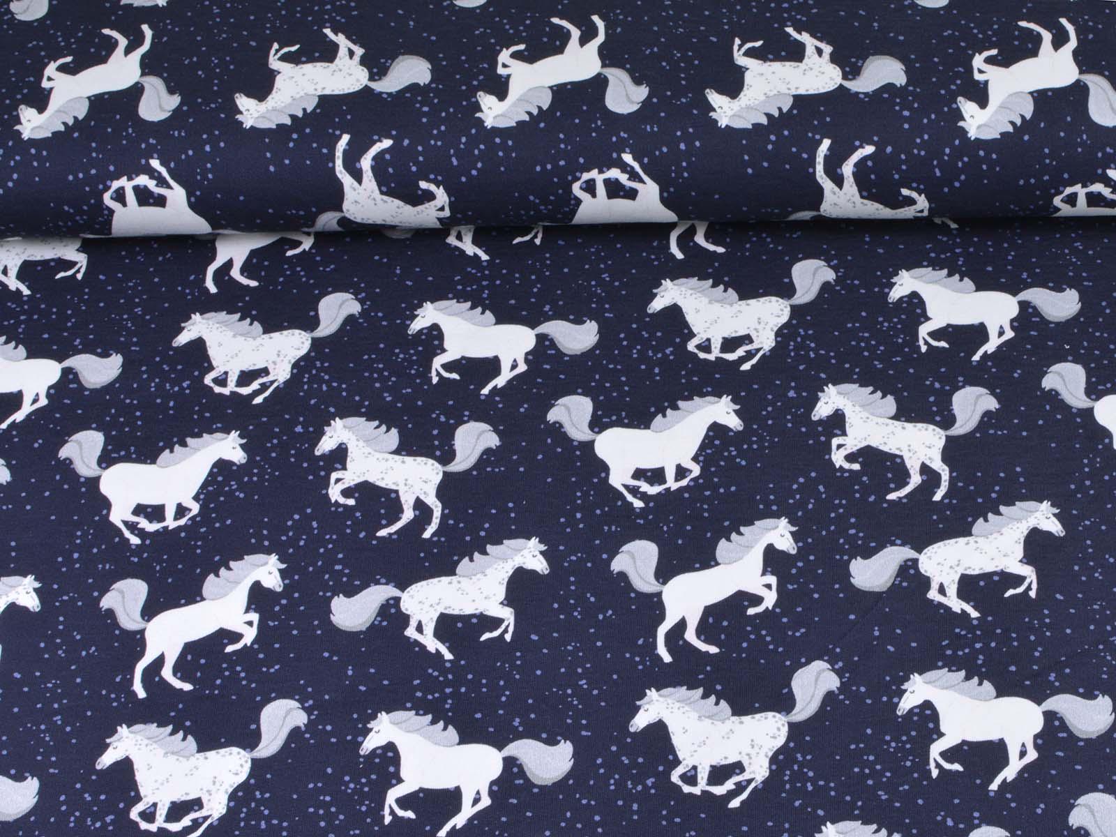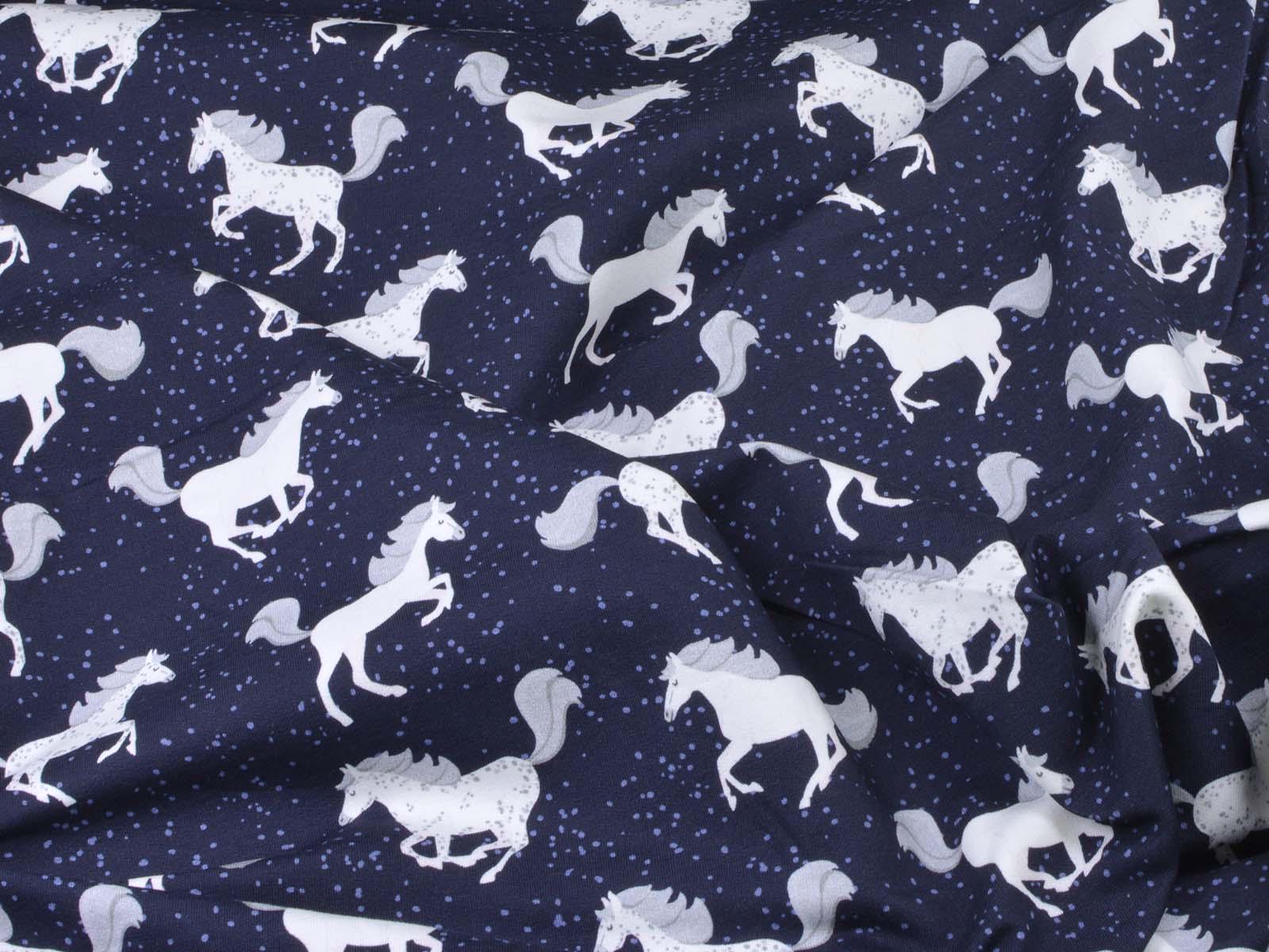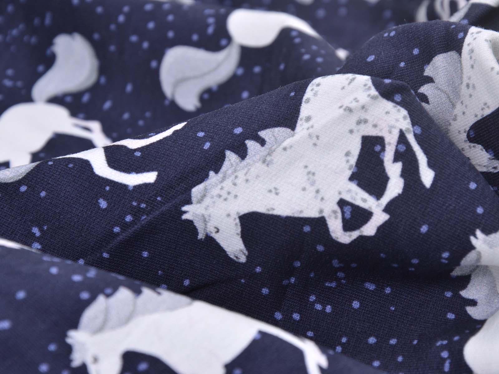 High-quality sweatshirt fabric from Hilco. The fabric is dark blue with white horses and blue speckles. Each horse is approximately 5 cm tall. The fabric is smooth on the right side and has soft loops on the wrong side. It is suitable for sewing sweaters, comfortable pants, harem pants, sweatshirts, and much more.