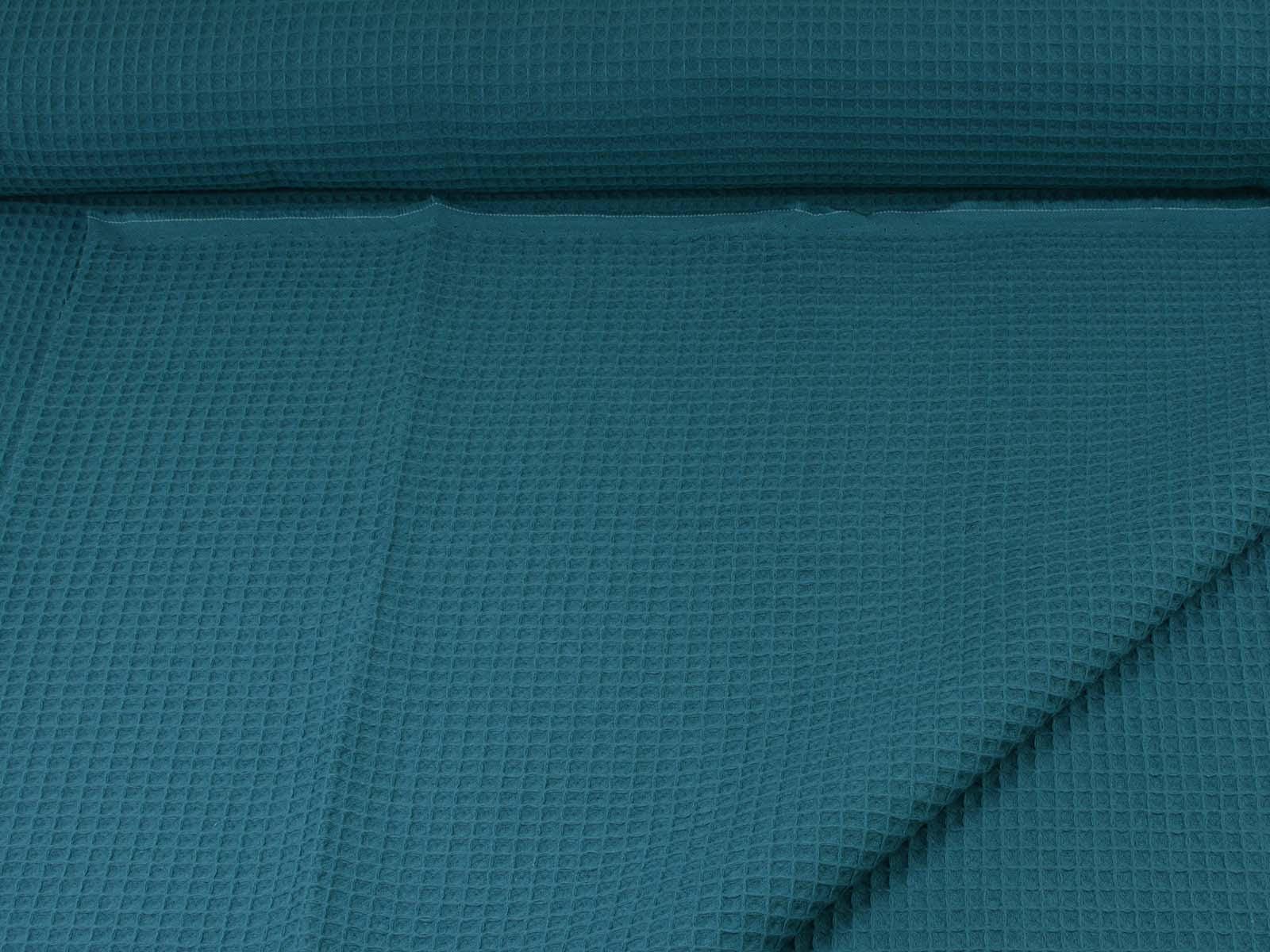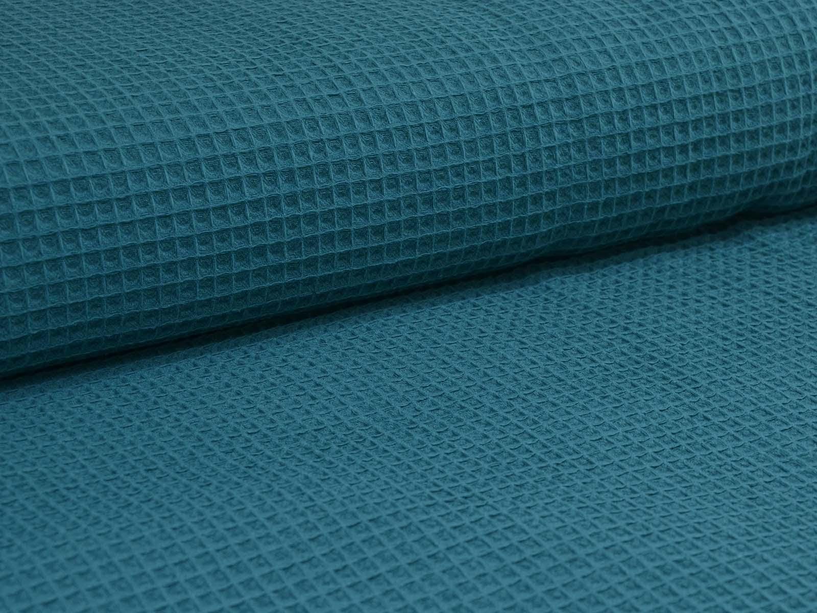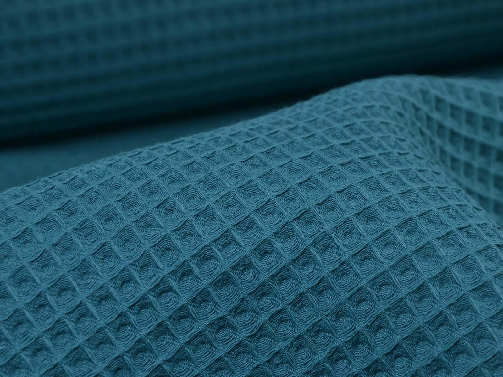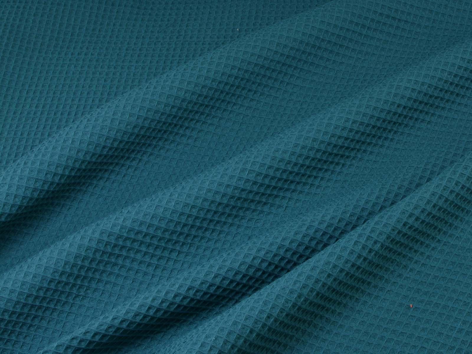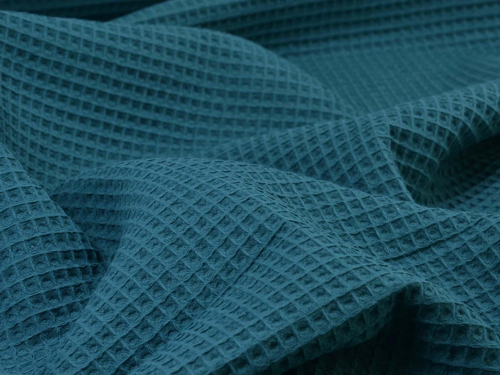 Waffle piqué cotton fabric from Hilco. The fabric is a solid petrol color, features the typical waffle texture, has a pleasant feel, and is woven. This waffle piqué is perfect for sewing towels, bathrobes, changing mats, blankets, storage containers, and so much more.