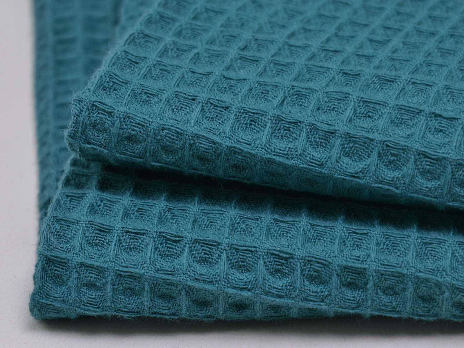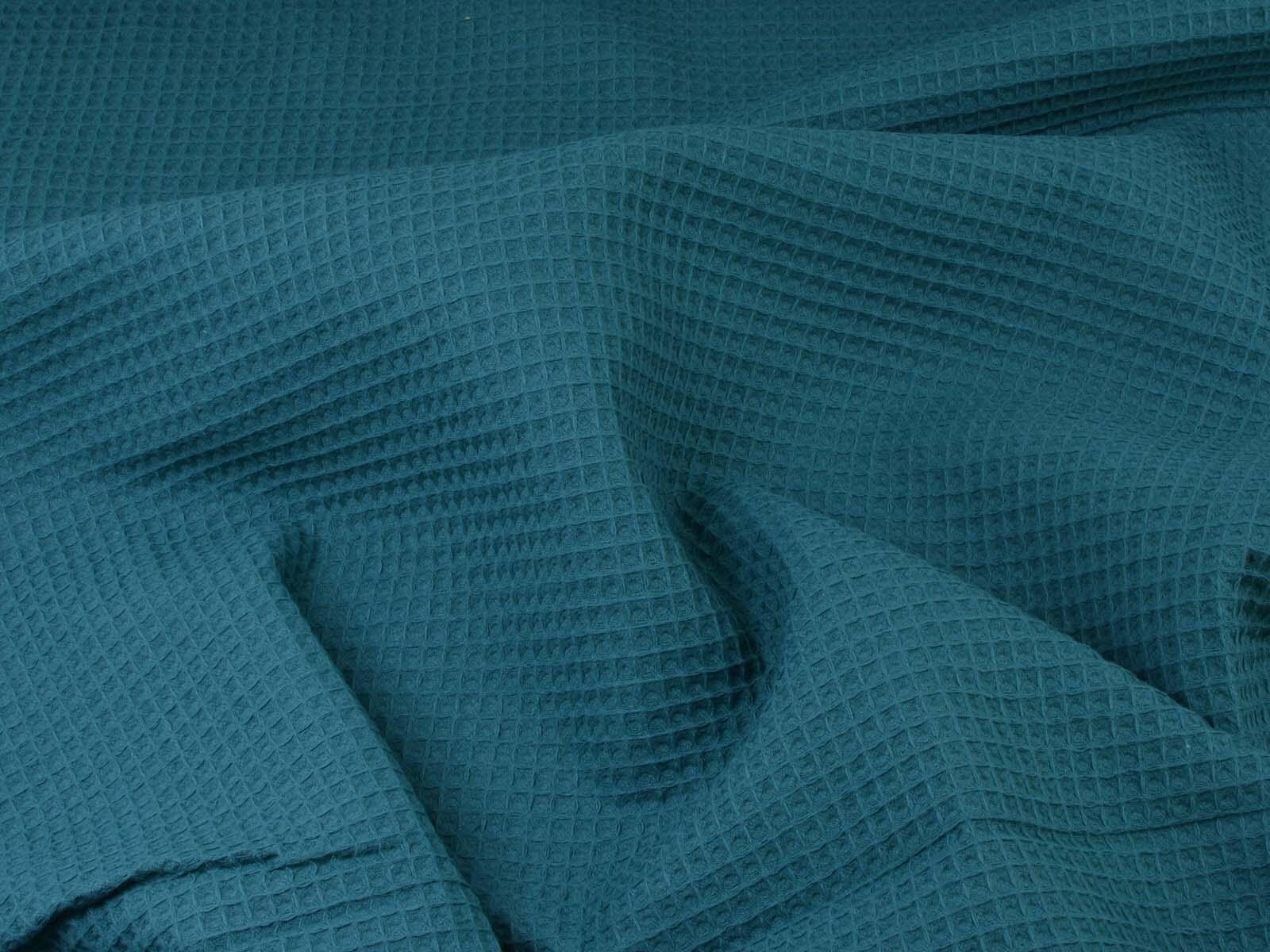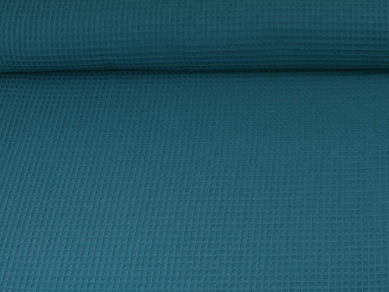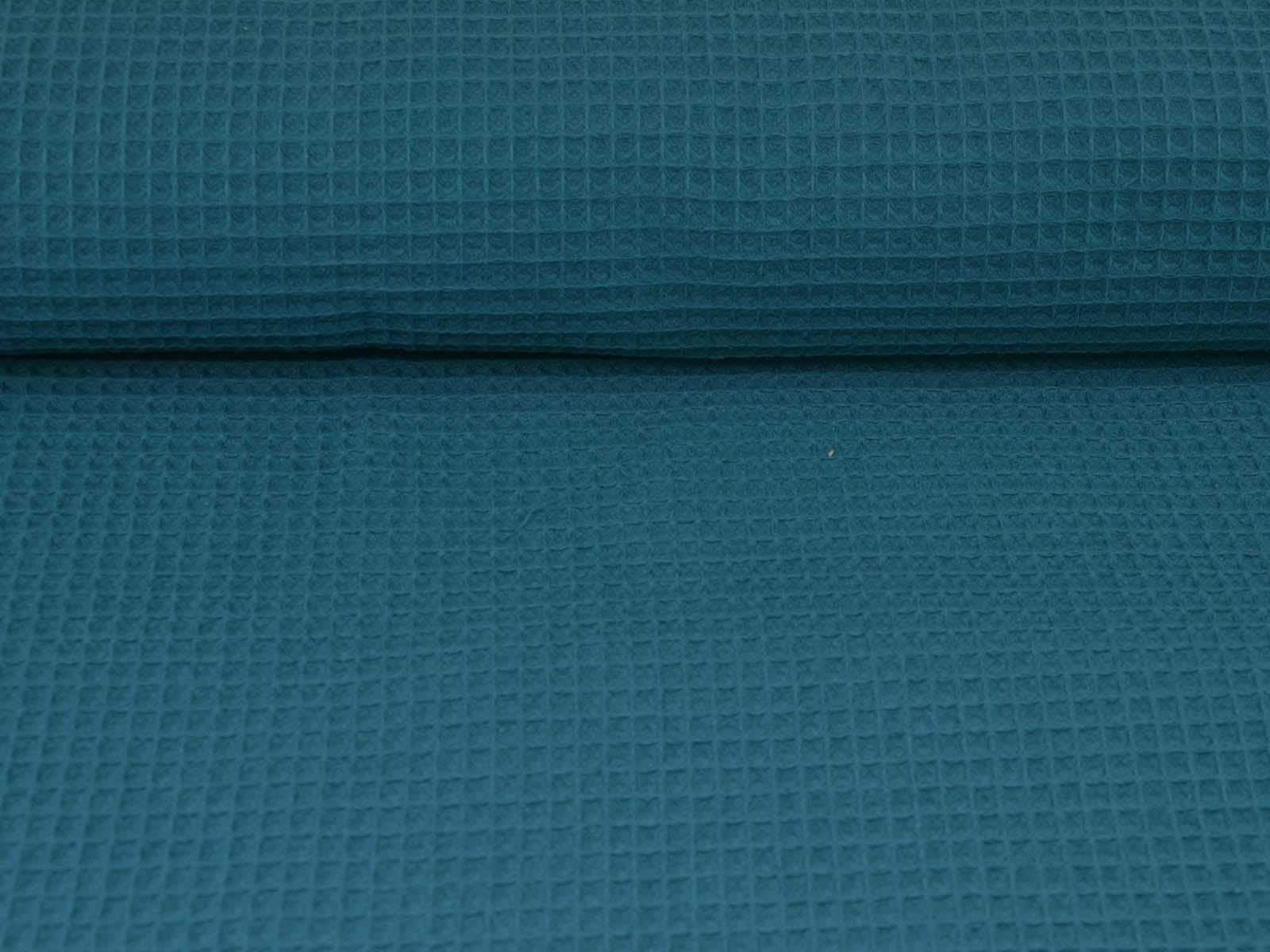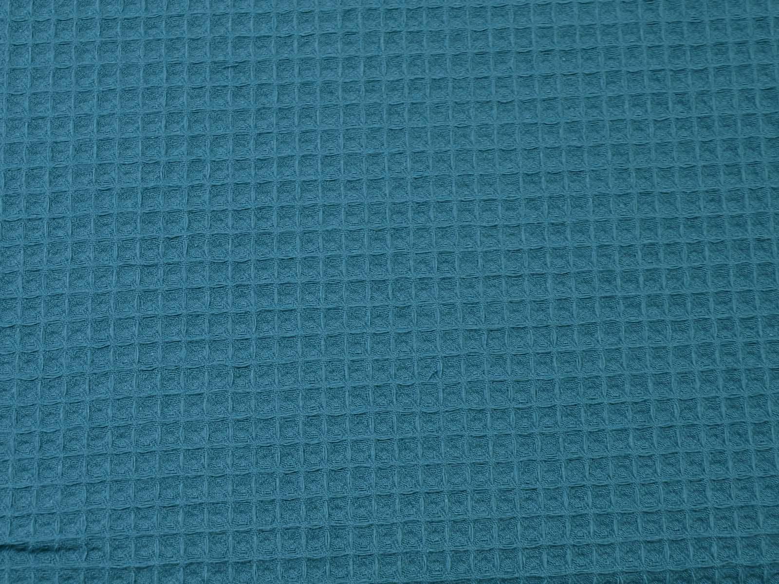 Waffle piqué cotton fabric from Hilco. The fabric is a solid petrol color, features the typical waffle texture, has a pleasant feel, and is woven. This waffle piqué is perfect for sewing towels, bathrobes, changing mats, blankets, storage containers, and so much more.